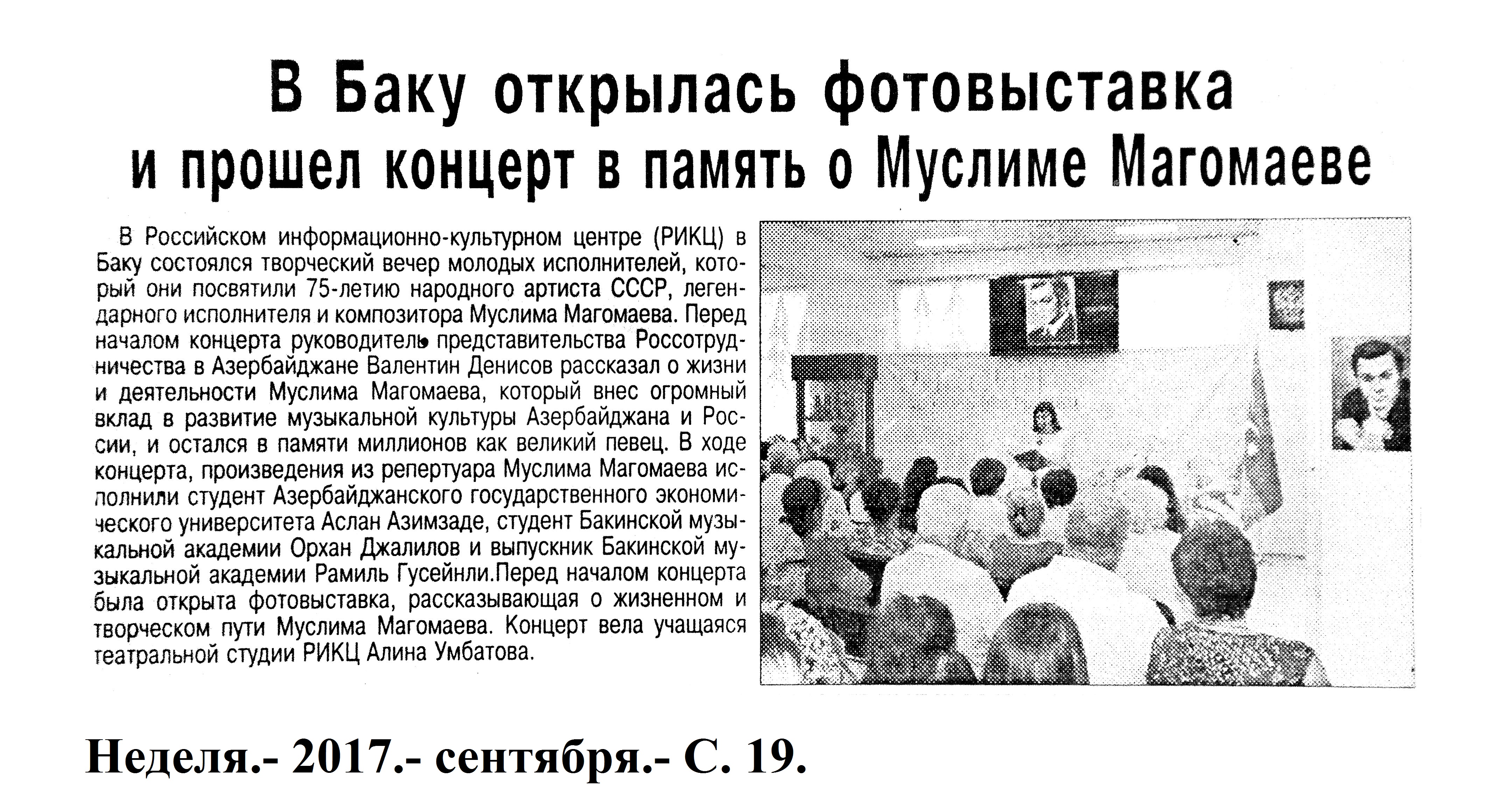 Муслим Магомаев – 75 791. В Баку открылась фотовыставка и прошел концерт в память о Муслиме Магомаеве //Неделя.- 2017.- 15 сентября.- С.19. 792. В Баку прошел творческий вечер, посвященный Муслиму Магомаеву //Бакинский рабочий.- 2017.- 14 сентября.- С.5. 793. Ирада, А. Дюссельдорф поет песни Муслима Магомаева //Эхо.- 2017.- 30 сентября.- С.10. 794. Манафов, Р.Творческий вечер, посвященный памяти Муслима Магомаева, состоялся в Российском информационно-культурном центре в Баку //Эхо.- 2017.- 14 сентября.- С.8. 795. Плешакова, А. Памятную доску Муслиму Магомаеву установили под окнами его квартиры //Комсомольская правда.- 2017.- 15 сентября.- С.11.
