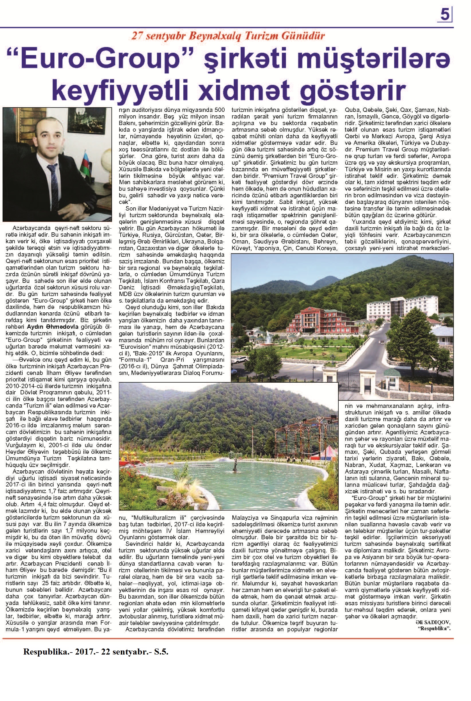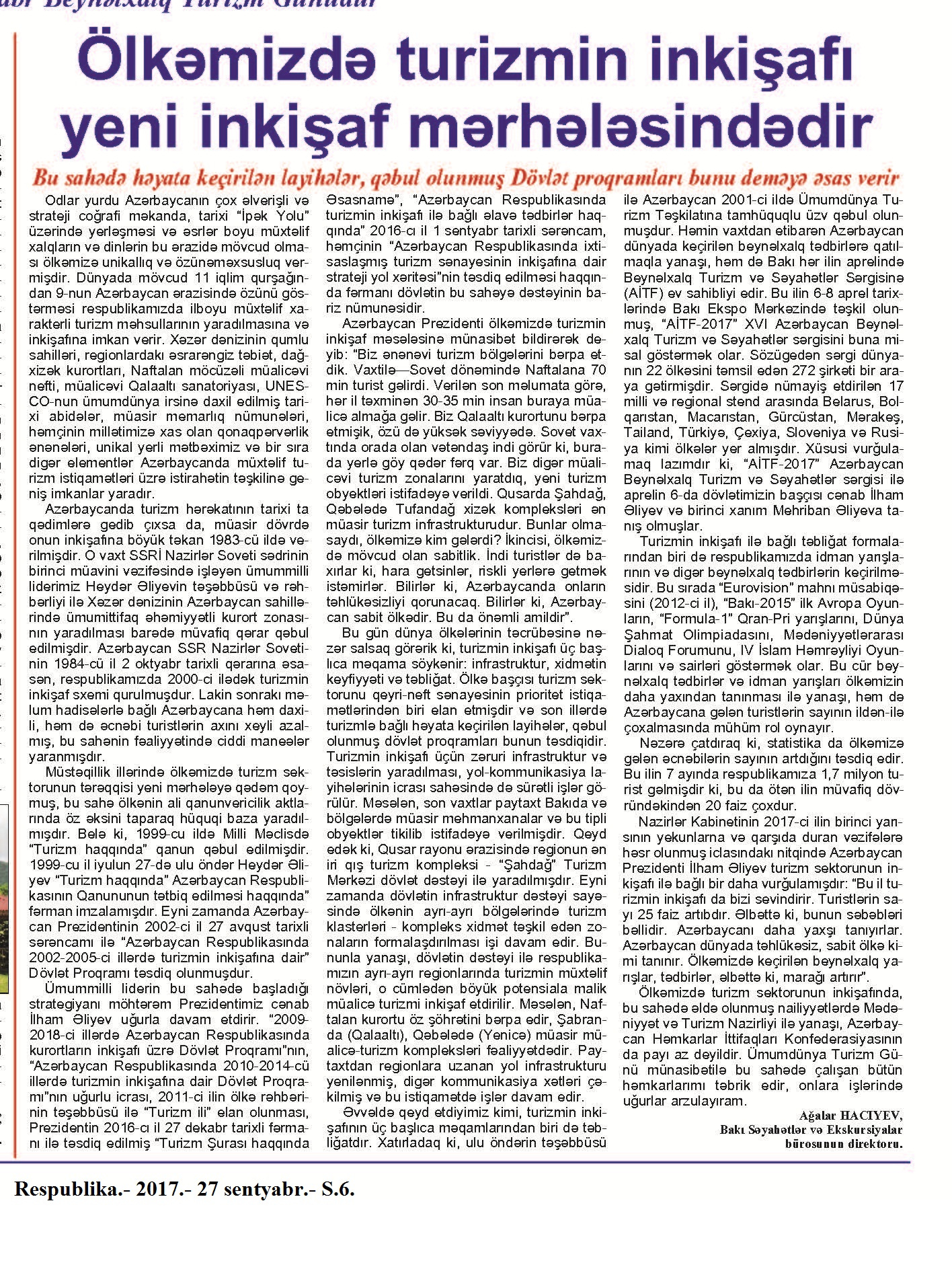 Bax: 49; 84 Ümumdünya Turizm Günü 371. Bakıda turizm işçilərinin peşə bayramı qeyd olunub: [Dünya Turizm Günü və Azərbaycanda “Turizm İşçiləri Günü” peşə bayramı münasibətilə keçirilən tədbirdə Mədəniyyət və Turizm naziri Əbülfəs Qarayev çıxış edib] //Azərbaycan.- 2017.- 28 sentyabr.- S.5. 372. Dünya Turizm Günü bölgələrdə də qeyd edilib //Mədəniyyət.- 2017.- 29 sentyabr.- S.7. 373. Fariz. 27 sentyabr turizm işçilərinin peşə bayramı günüdür //Mədəniyyət.- 2017.- 27 sentyabr.- S.3. 374. Hacıyev, A. Olkəmizdə turizmin inkişafı yeni inkişaf mərhələsindədir: [Beynəlxalq Turizm Gününə həsr olunmuş mövzu] //Respublika.- 2017.- 27 sentyabr.- S.6. 375. Hüseynov, F. Turizm qeyri-neft sektorunun prioritet istiqaməti kimi dinamik inkişaf edir: Bu sahədə çalışanların peşə bayramı münasibətilə mətbuat konfransı keçirildi: [“JW Marriott Absheron” hotelində Mədəniyyət və Turizm naziri Əbülfəs Qarayevin iştirakı ilə keçirilən tədbir haqqında] //Mədəniyyət.- 2017.- 29 sentyabr.- S.5. 376. “İçərişəhər” Dövlət Tarix-Memarlıq Qoruğunda Koreya Respublikasının kənd təsərrüfatı məhsullarının nümayişi keçirilib: [Dünya Turizm Günü münasibətilə] //Azərbaycan.- 2017.- 28 sentyabr.- S.5. 377. Mingəçevir Turizm Kollecində Dünya Turizm Günü ilə bağlı konfrans //Mədəniyyət.- 2017.- 29 sentyabr.- S.5. 378. Mükərrəmoğlu, M. Dünya Turizm Günü “Davamlı turizm inkişaf üçün alətdir” devizi altında qeyd olunub //Xalq qəzeti.- 2017.-28 sentyabr.- S.7. 379. Rəcəbli, H. Ölkəmizdə turizmin yüksələn xətlə inkişafı gələcəyə daha nikbin baxmağa əsas verir: Hadı Rəcəbli: “Ən böyük reklam turistin ölkəmizdən öz vətəninə xoş təəssüratla qayıtmasıdır”: [Milli Məclisin əmək və sosial siyasət komitəsinin sədri, professor Hadı Rəcəblinin müsahibəsi] //Azərbaycan.- 2017.- 28 sentyabr.- S.5.; Yeni Azərbaycan.- 2017.- 28 sentyabr.- S.3. 380. Salmanlı, R. Azərbaycan dünyada həm də turistlərin maraq göstərdiyi ölkə kimi tanınır: 27 sentyabr Ümumdünya Turizm Günüdür //Azərbaycan.- 2017.- 27 sentyabr.- S.6.