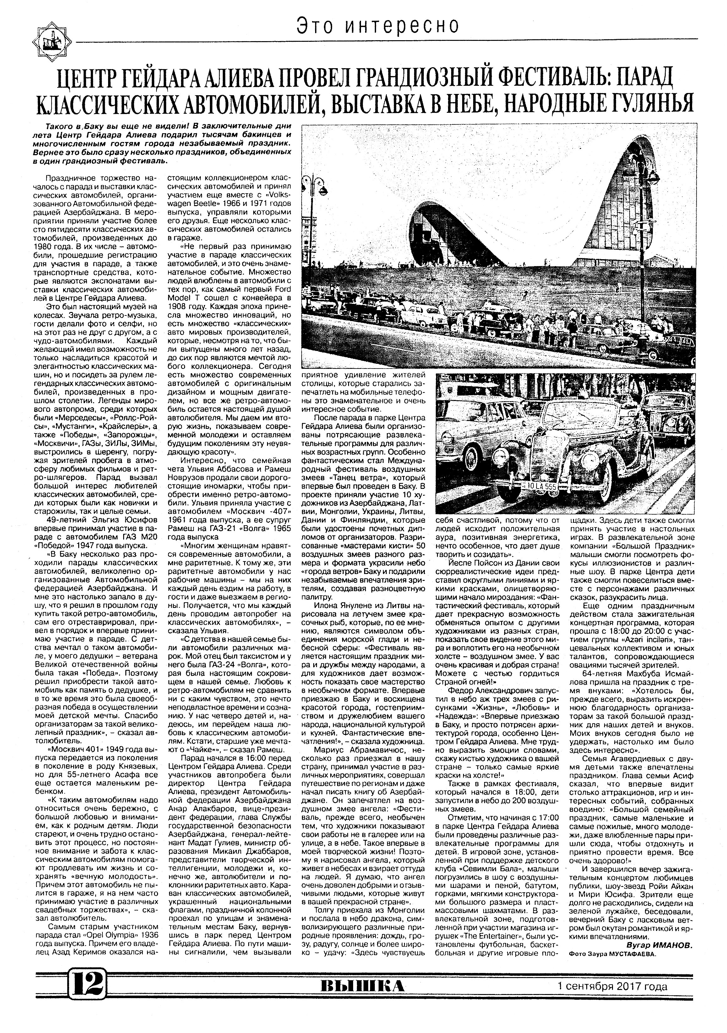 ДВОРЦЫ И ДОМА КУЛЬТУРЫ. ПАРКИ КУЛЬТУРЫ И ОТДЫХА 729. В парке Центра Гейдара Алиева состоялись авиашоу и выставка авиамоделей //Бакинский рабочий.- 2017.- 12 сентября.- С.8. 730. Гаджиева, Л. Покоряя небо. Пока с земли: В Баку состоялось первое шоу авиамоделирования под открытым небом: [в парке Центра Гeйдapа Aлиeва] //Азербайджанские известия.- 2017.- 12 сентября.- С.4. 731. Иманов, В. Центр Гейдара Алиева провел грандиозный фестиваль: Парад классических автомобилей, выставка в небе, народные гулянья //Вышка.- 2017.- 1 сентября.- С.12.