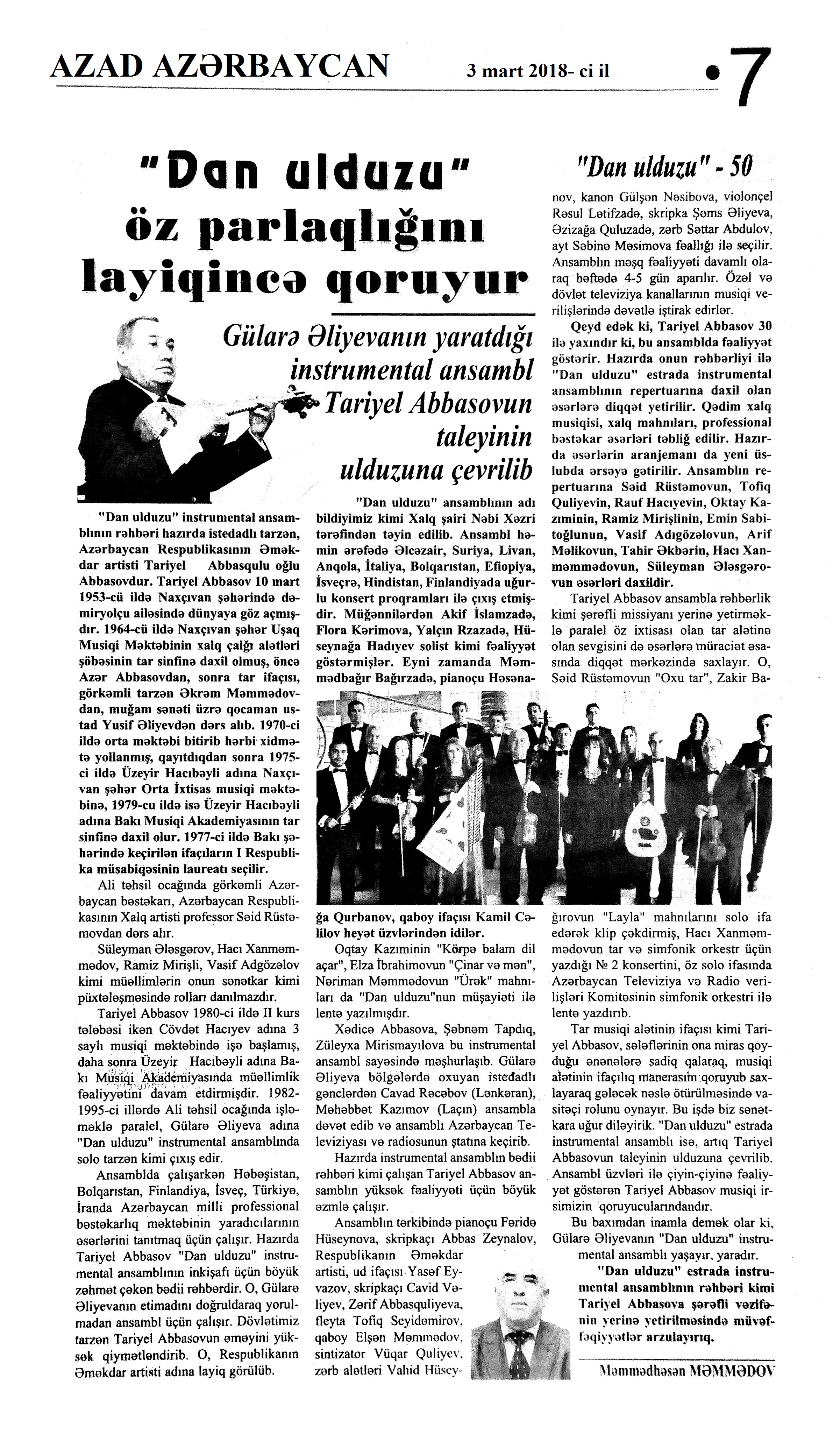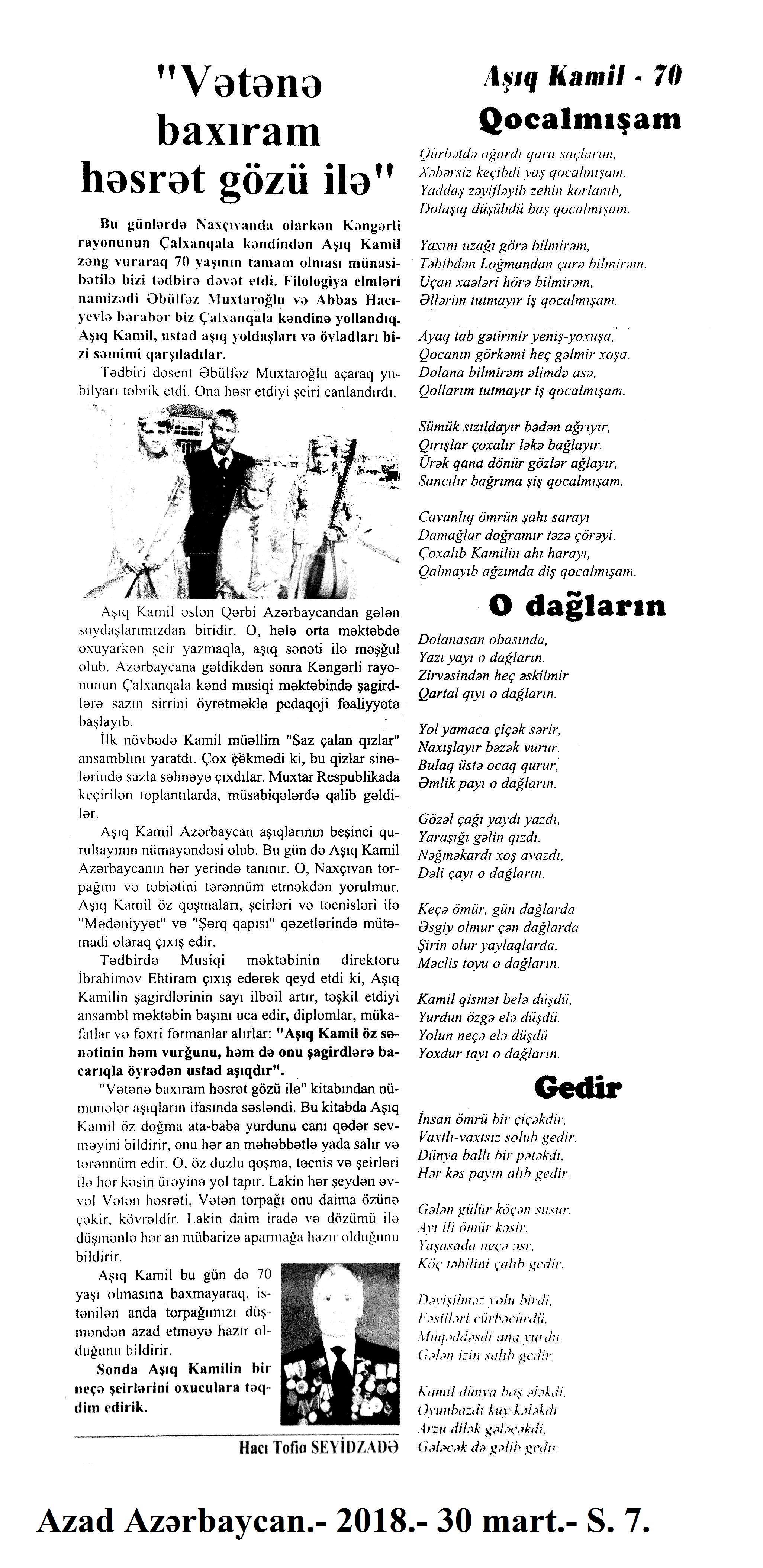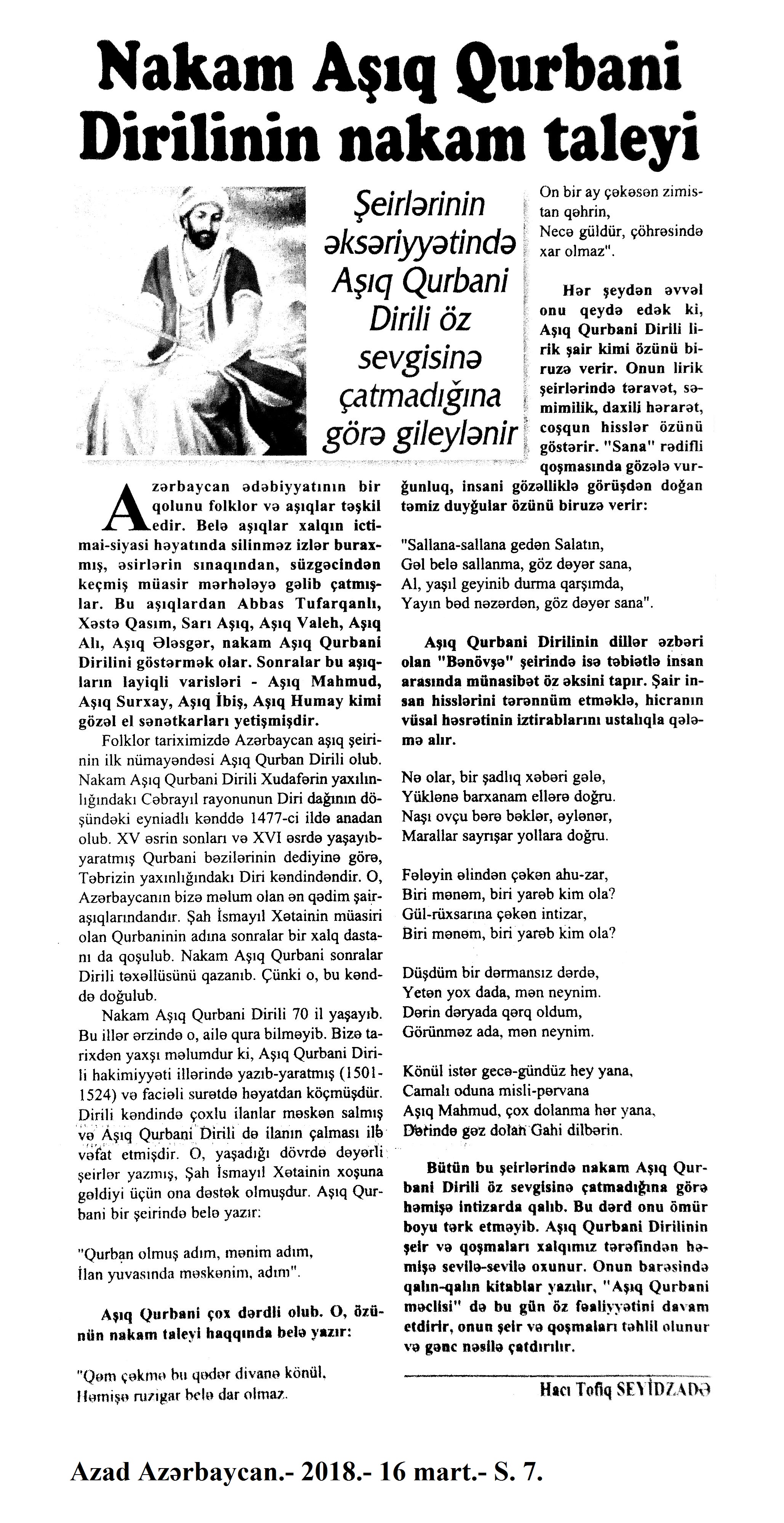 XALQ YARADICILIĞI 423. Aşıq Mirzə-Borçalı aşıq məktəbinin yetişdirməsi //Üç nöqtə.- 2018.-7 mart.- S.12. 424. Borçalı, M. Böyük söz xiridarı–şair Nəbi: [Borçalı mahalının saz-söz ustası] //Üç nöqtə.- 2018.-1 mart.- S.12. 425. Əyyub, M. Aşıq sənəti haqqında... //Palitra.- 2018.- 7 mart.- S.13. 426. Əyyub, M. El sənətkarları unudulmur: [Aşıq Məcid Qasımov haqqında] //Palitra.- 2018.- 1 mart.- S.15. 427. Kövrək Murad: Ovaxtkı aşıqlar bir-birinin sənətinə münasibətdə çox ədalətli, obyektiv idilər: [Aşıq Kövrək Muradla müsahibə] /müsahibəni apardı Mahmud Əyyub //Palitra.- 2018.- 31 mart.- S.15. 428. Qasımlı, M. Professor Məhərrəm Qasımlı: “Ozan-aşıq ensiklopediyası” çapa hazır vəziyyətdədir: [Azərbaycan Aşıqlar Birliyinin sədri, professorla müsahibə] /müsahibəni apardı Mahmud Əyyub //Palitra.- 2018.- 14 mart.- S.7. 429. Paşayev, Q. Azərbaycanın qoca qartalı: [aşıq Mikayıl Azaflı haqqında] //Ədəbiyyat qəzeti.- 2018.- 17 mart.- S.18-19. 430. Paşayev, Q. Mikayıl Azaflı: Azərbaycanın qoca qartalı: [aşıq poeziyasının nümayəndəsi haqqında] //525-ci qəzet.- 2018- 17 mart.- S.14. 431. Seyidzadə, T. Vətənə baxıram həsrət gözü ilə: [Aşıq Kamil haqqında] //Azad Azərbaycan.- 2018.- 30 mart.- S.7. 432. Tofiq, H. Nakam Aşıq Qurbani Dirilinin nakam taleyi //Azad Azərbaycan.- 2018.- 16 mart.- S.5.