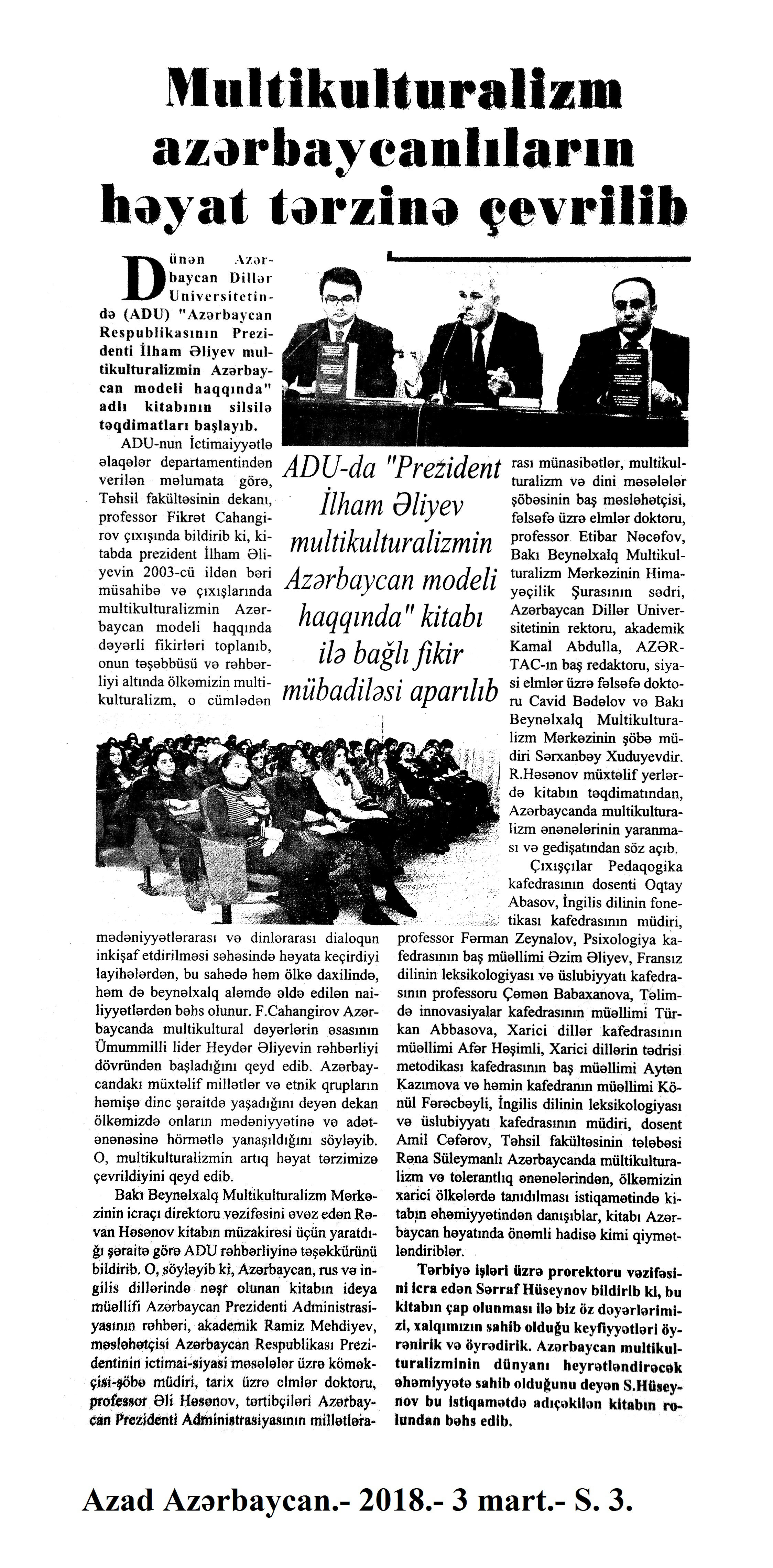 “Multikulturalizm” 197. Azadi, S. Dini və milli tolerantlığın ünvanı – Azərbaycan //İki sahil.- 2018.- 2 mart.- S.11. 198. Azərbaycan multikulturalizminə həsr olunmuş beynəlxalq konfrans: [Multikulturalizm Mərkəzində] //Mədəniyyət.- 2018.- 28 mart.- S.15. 199. “Azərbaycan Respublikasının Prezidenti İlham Əliyev multikulturalizmin Azərbaycan modeli haqqında” kitabı Qubada ictimai müzakirəyə çıxarılıb: [Heydər Əliyev Mərkəzində keçirilən tədbirdə] //Azərbaycan.- 2018.- 7 mart.- S.4. 200. Erməni terroru Azərbaycan multikulturalizminə qarşı: 1918-2018: [Bakı Beynəlxalq Multikulturalizm Mərkəzində keçirilən eyniadlı tədbir haqqında] //İki sahil.- 2018.- 28 mart.- S.26. 201. Multikulturalizm azərbaycanlıların həyat tərzinə çevrilib: [ADU-da “Azərbaycan Respublikasının Prezidenti İlham Əliyev multikulturalizmin Azərbaycan modeli haqqında” kitabının təqdimatı keçirilib] //Azad Azərbaycan.- 2018.- 3 mart.- S.2. 202. Multikulturalizmin Azərbaycan modeli Romada təqdim olunub: [Prezident Administrasiyasının millətlərarası münasibətlər, multikulturalizm və dini məsələlər şöbəsinin müdiri Etibar Nəcəfovun İtaliyada keçirdiyi görüşlər haqqında] //Azərbaycan.- 2018.- 4 mart.- S.6.