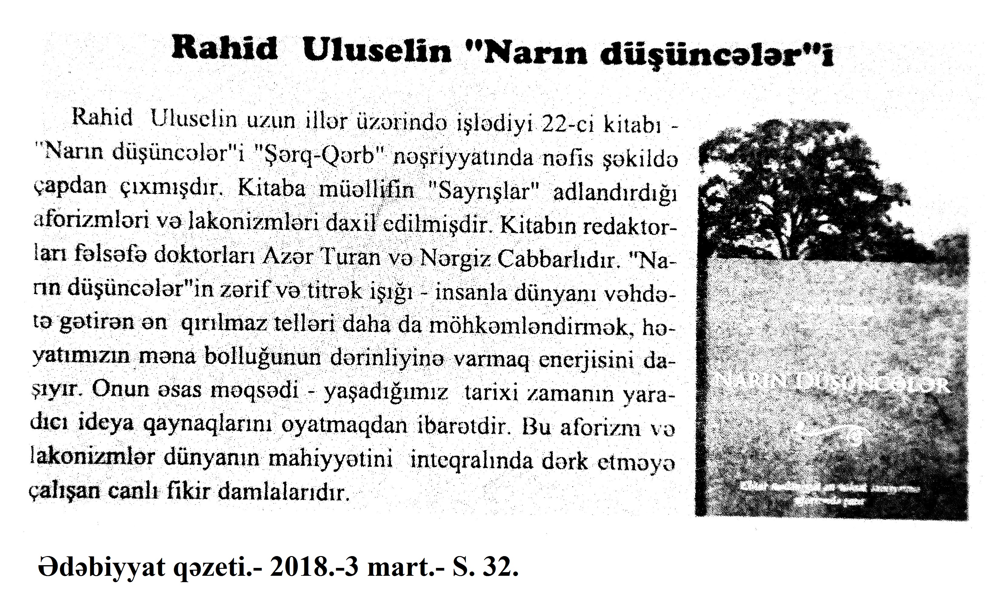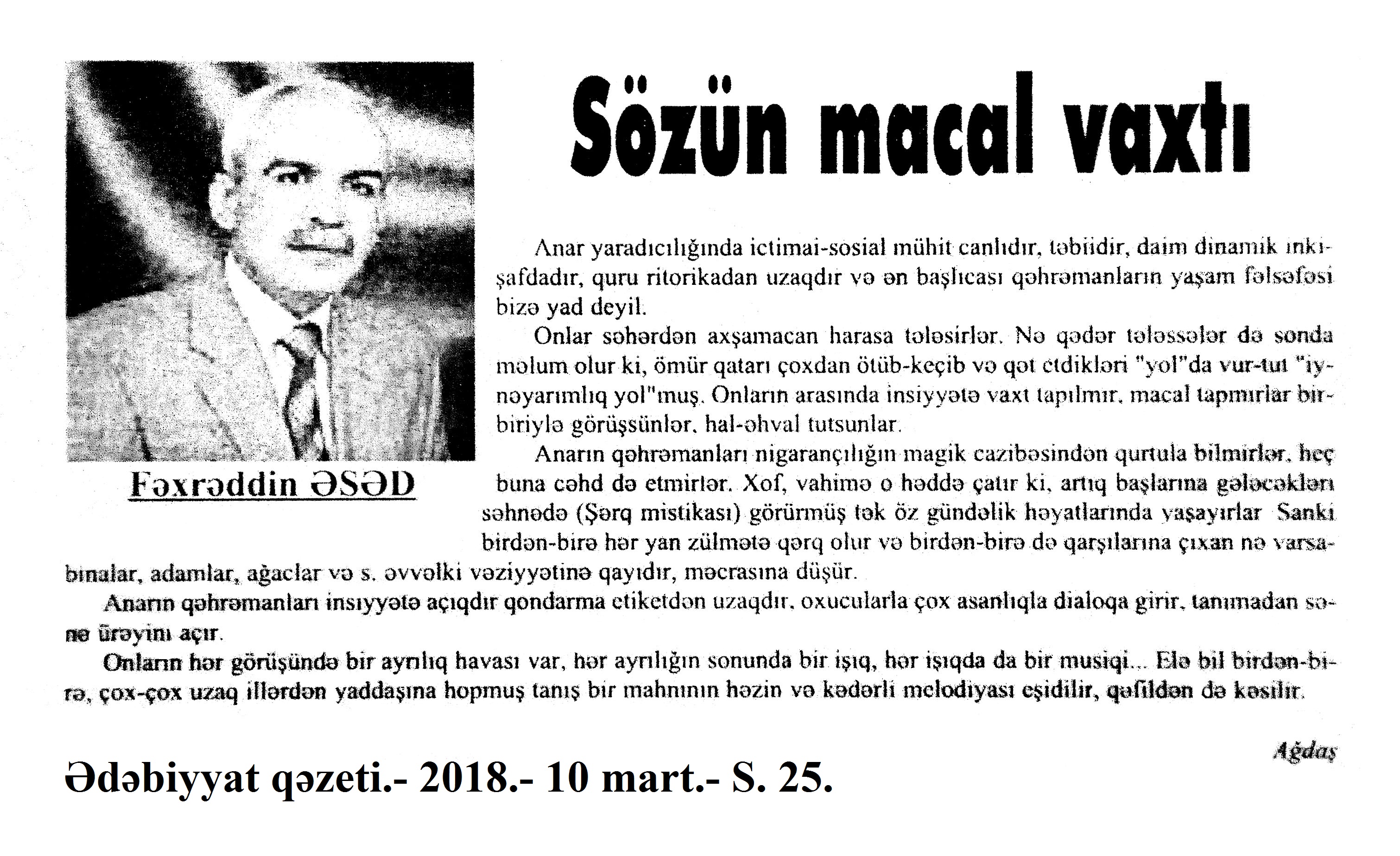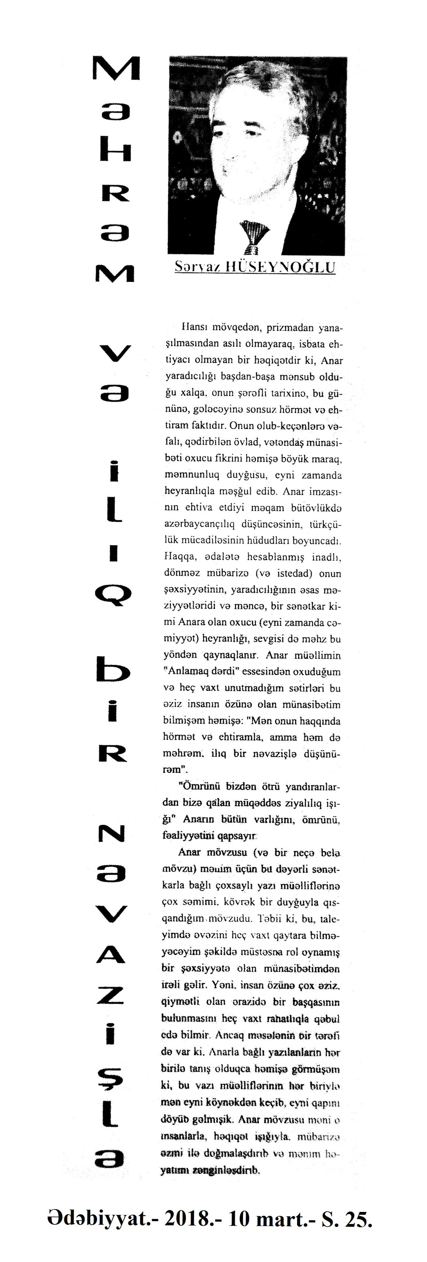 ESSELƏR 633. Əhmədzadə, Ü. Mavi və qara //525-ci qəzet.-2018.-8 mart.- S.7. 634. Hüseyn, F. Məcnunlar və Leyli: V hissə //Kaspi.-2018.- 3 mart.- S.20. 635. Qaraxanoğlu, M. Alleqoriyadan simvolikaya… //Ədəbiyyat qəzeti.- 2018.- 3 mart.- S.15. 636. Rəhimov, Ə. Anam gəlib!.. //Ədalət.-2018.- 1 mart.- S.7. 637. Rəhimov, Ə. Sədaqət //Ədalət.-2018.- 14 mart.- S.6.