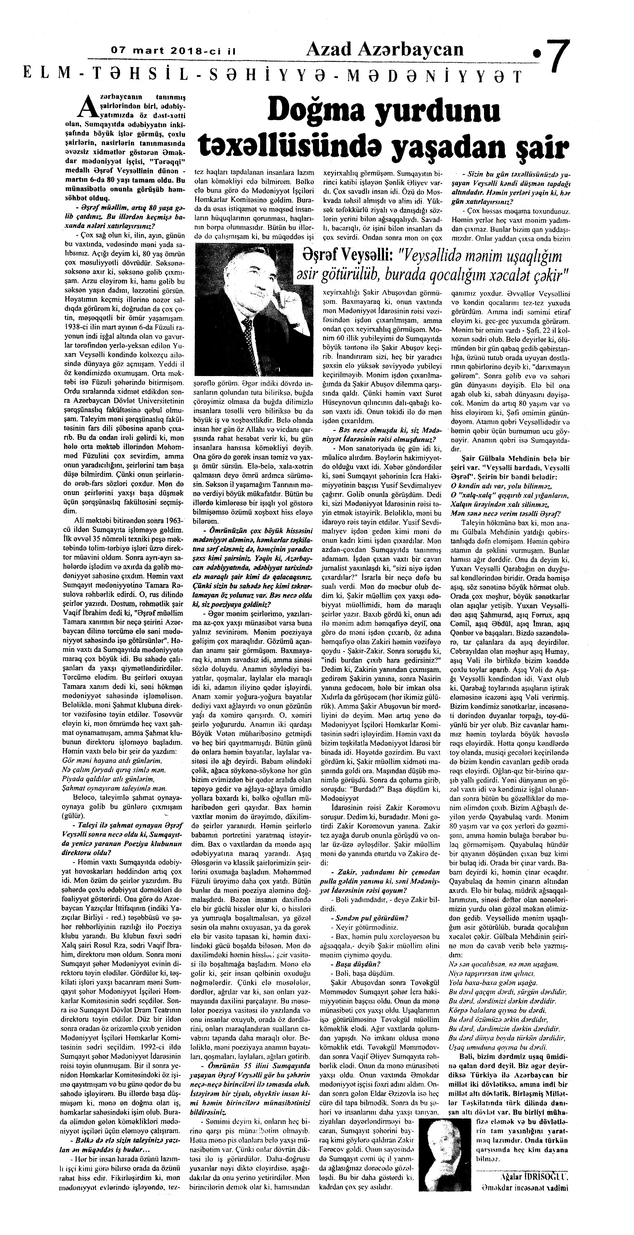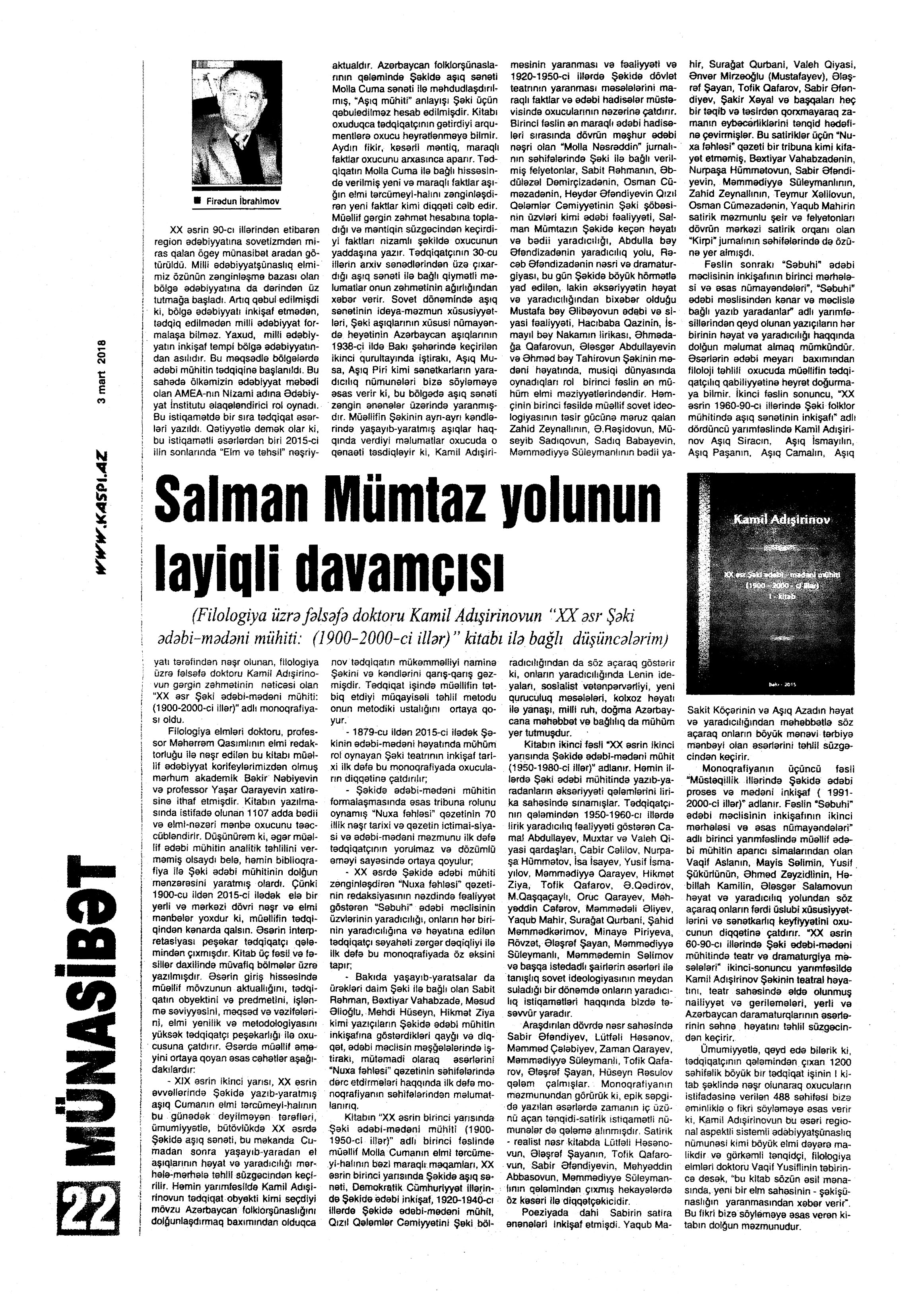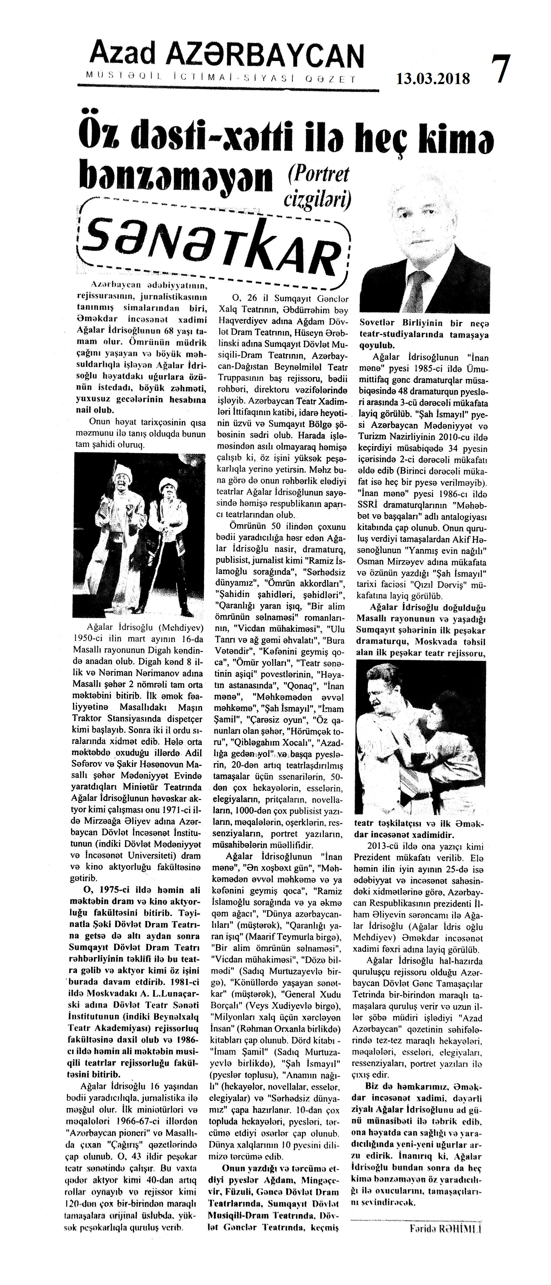 ESSELƏR 633. Əhmədzadə, Ü. Mavi və qara //525-ci qəzet.-2018.-8 mart.- S.7. 634. Hüseyn, F. Məcnunlar və Leyli: V hissə //Kaspi.-2018.- 3 mart.- S.20. 635. Qaraxanoğlu, M. Alleqoriyadan simvolikaya… //Ədəbiyyat qəzeti.- 2018.- 3 mart.- S.15. 636. Rəhimov, Ə. Anam gəlib!.. //Ədalət.-2018.- 1 mart.- S.7. 637. Rəhimov, Ə. Sədaqət //Ədalət.-2018.- 14 mart.- S.6.