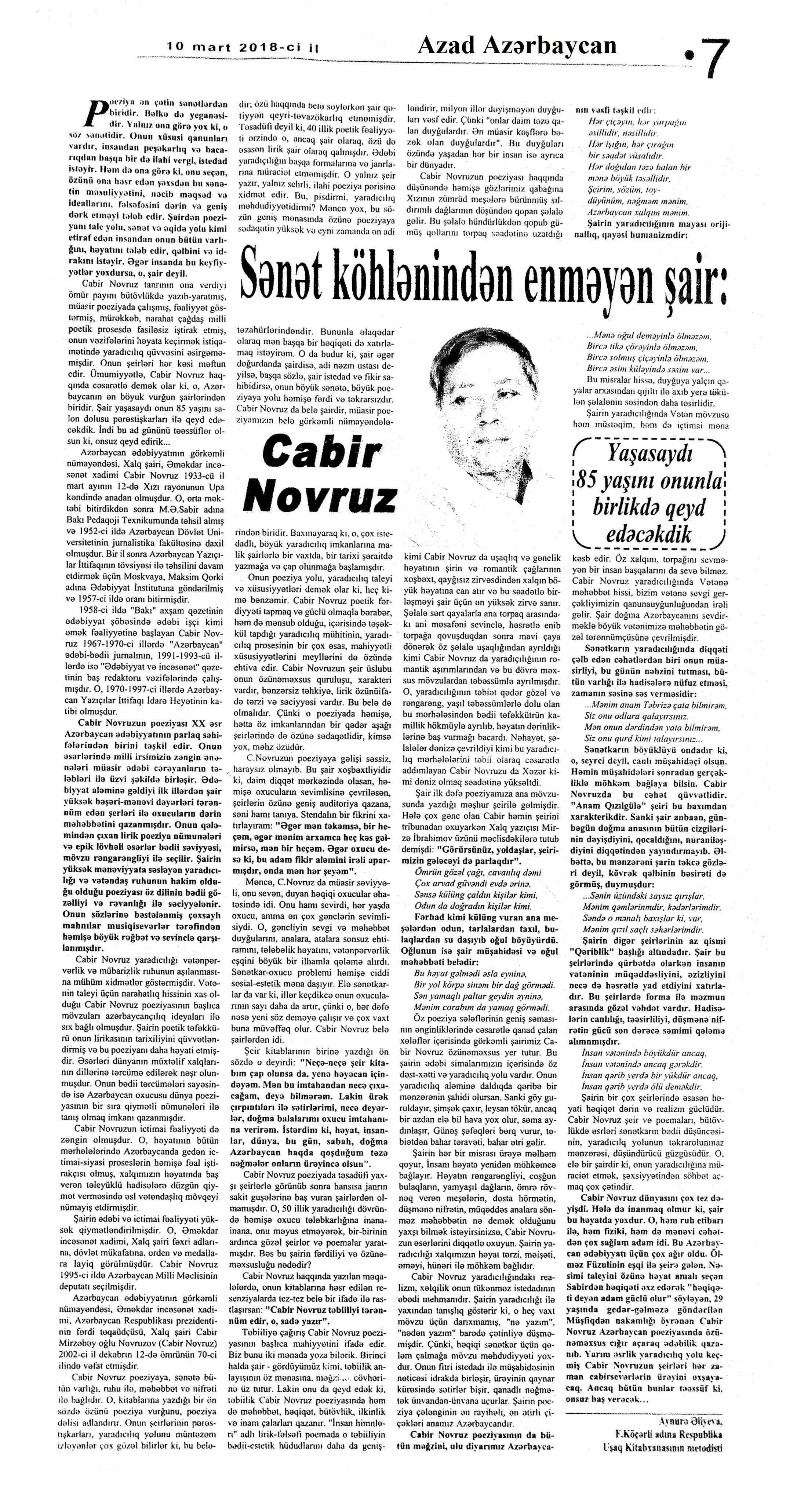 Cabir Novruz – 85 844. Axundova, E. Cabir Novruz şair adına heç bir zaman xələl gətirmədi: Cabir Novruz – 85 //525-ci qəzet.-2018.- 14 mart.- S.6. 845. Əliyeva, A. Sənət köhlənindən enməyən şair: Cabir Novruz: Yaşasaydı 85 yaşını onunla birlikdə qeyd edəcəkdik //Azad Azərbaycan.- 2018.- 10 mart.- S.7. 846. Əsgərli, Ə. Səmimiyyət və ünsiyyət şairi: Cabir Novruz – 85 //Azərbaycan.-2018.- 13 mart.- S.6. 847. Hüseynov, F. Tələsin, insanlar, əldən tutmağa...: Xalq şairi Cabir Novruzun 85 illiyinə həsr olunan gecə: [Müslüm Maqomayev adına Azərbaycan Dövlət Akademik Filarmoniyasında] //Mədəniyyət.-2018.- 14 mart.- S.3. 848. Xalq şairi Cabir Novruzun anadan olmasının 85 illiyi qeyd edilib: [Azərbaycan Dövlət Filarmoniyasında] //Ədəbiyyat qəzeti.- 2018.- 17 mart.- S.13. 849. Milli Kitabxanada növbəti sərgi Cabir Novruza həsr edilib //Həftə içi.- 2018.- 13 mart.- S.8.