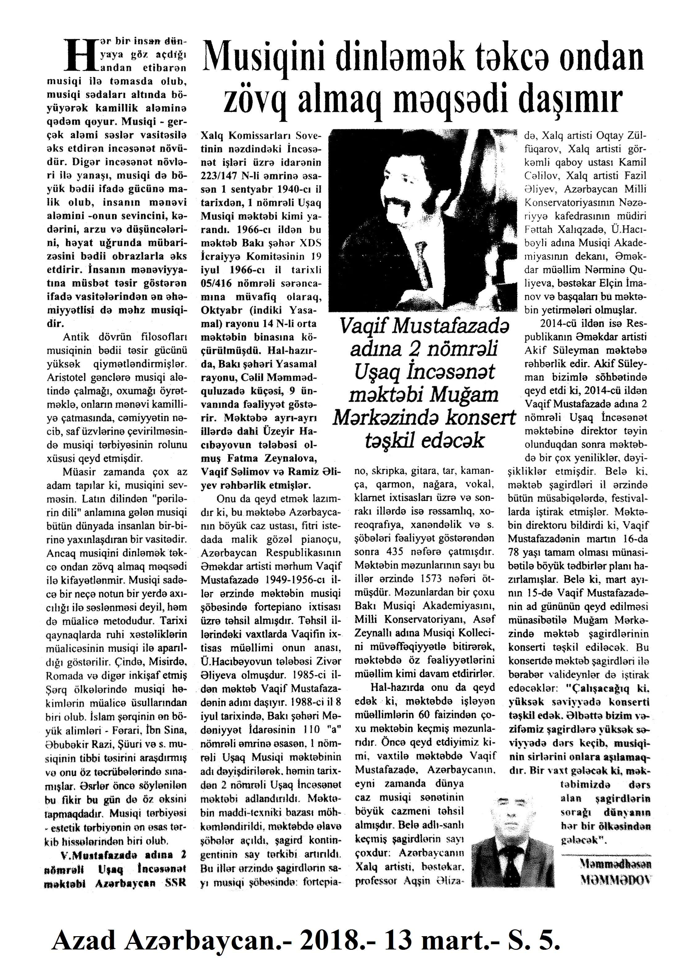 MUSİQİ 343. Abbaslı, T. Muğamıın Cabbar məqamıı //Mədəniyyət.-2018.- 30 mart.- S.13. 344. Ağayeva, T. Bu söhbətlər mənə çox gülməli gəlir: [Əməkdar artist Tünzalə Ağayeva ilə müsahibə] /müsahibəni apardı Arzu Murad //Üç nöqtə.- 2018.- 31 mart.- S.12. 345. Azəri, L. Səid Rüstəmov yaradıcılığı “Oxu tar”ın sədalarında: [Heydər Əliyev Sarayında keçirilən konsert haqqında] //Mədəniyyət.- 2018.- 16 mart.- S.5. 346. Cahangir Cahangirovun xatirəsi yad edildi: [Azərbaycan Milli Konservatoriyasında] //Həftə içi.- 2018.- 2 mart.- S.8. 347. Cavadov, Z. Qabaqcıl incəsənət məktəbi: [6 saylı Musiqi məktəbi haqqında] //Respublika.- 2018.- 14 mart.- S.5. 348. Daim sənətin zirvəsində olasınız, böyük sənətkar...: [Xalq artisti Arif Babayevin yubileyi münasibətilə professor Kərəm Kərimovun təbriki] //Olaylar.- 2018.- 30 mart.- S.13. 349. Əkbər, A. Bizim evdə o qədər ulduzlar parlayıb ki…: Aybəniz Əkbər: Tahir Əkbər barədə keçmiş zamanda danışmaq çox çətindir: [bəstəkarın həyat yoldaşı ilə müsahibə] /müsahibəni apardı X.Rəis //Kaspi.- 2018.- 29 mart.- S.14. 350. “Ələddin” uşaq müziklinin premyerası: [Heydər Əliyev Sarayında Əməkdar artist İnarə Babayevanın hazırladığı eyniadlı müziklinin təqdimatı haqqında] //Mədəniyyət.- 2018.- 7 mart.- S.8. 351. Fərəc Qarayevin əsəri beynəlxalq festivalda səsləndiriləcək: [Moskvada keçirilən VI Beynəlxalq Aktual Musiqi Festivalı çərçivəsində] //525-ci qəzet.- 2018.- 13 mart.- S.7. 352. Folklor qrupunun təqdimatı //Mədəniyyət.- 2018.- 7 mart.- S.6. 353. Gənc ifaçının konserti //Mədəniyyət.- 2018.- 7 mart.- S.5. 354. Görkəmli bəstəkarın xatirəsi yad edilib: [Milli Konservatoriyada Cahangir Cahangirovun xatirəsinə həsr edilmiş klassik musiqi gecəsinin keçirilməsi haqqında] //Mədəniyyət.- 2018.-2 mart.- S.4. 355. Hacıyev, R. Ürəyi alovlu Əhsənlə ərköyün Qədirin sənət möcüzəsi: [Əməkdar artist Əhsən Dadaşov və Xalq artisti Qədir Rüstəmov haqqında] //525-ci qəzet.- 2018.-8 mart.- S.6. 356. Xədicə. Azərbaycanlı musiqiçi Vyanada konsertlər verdi: [Abuzər Manafzadə] //525-ci qəzet.- 2018.- 28 mart.- S.7. 357. Xəlilova, İ. Tarix və musiqi fənləri arasında əlaqə təcrübəsindən: Şagirdlərdə bu yolla qazanılmış biliklər uzun zaman unudulmur //Azərbaycan müəllimi.- 2018.- 8 mart.- S.1; 6. 358. İstanbulda məşhur kamança ifaçısının konserti: [İmamyar Həsənovun] //Mədəniyyət.- 2018.- 28 mart.- S.6. 359. Qədirov, F. “Qoşa qanad”la ilkə imza: [Yusif Nəğməkarın eyniadlı şeirinə Tünzalə Ağayevanın bəstələdiyi mahnı haqqında] //Ədəbiyyat qəzeti.- 2018.- 3 mart.- S.32. 360. Məhərrəmova, T. Niyazi sənətinin böyüklüyü: Maestro pult arxasına keçəndə “məni yaşadan budur” deyirdi //Kaspi.- 2018.- 15 mart.- S.15. 361. Məmmədoğlu, M. Tbilisinin, o dövrkü Sovet İttifaqının caz şəhərinin cemseyşeni Vaqif Mustafazadə //Üç nöqtə.- 2018.- 30 mart.- S.12. 362. Məmmədov, M. “Dan ulduzu” öz parlaqlığını layiqincə qoruyur: Gülarə Əliyevanın yaratdığı instrumental ansambl Tariyel Abbasovun taleyinin ulduzuna çevrilib: [tarzən haqqında] //Azad Azərbaycan.- 2018.- 3 mart.- S.7. 363. Məmmədov, M. Ən böyük istəyim Azərbaycan Xalq Çalğı əlalətləri orkestrinin səs diapazonunu 7 oktavada görməkdir: [Qədim musiqi alətləri tərtibcisi Məmmədəli Məmmədovla müsahibə] /müsahibəni apardı Nailə Allahverdiyeva //Üç nöqtə.- 2018.- 15 mart.- S.12. 364. Məmmədov, M. Musiqini dinləmək təkcə ondan zövq almaq məqsədi daşımır: [Vaqif Mustafazadə adına 2 saylı Uşaq incəsənət məktəbi haqqında] //Azad Azərbaycan.- 2018.- 13 mart.- S.5. 365. Musiqi məktəbinin kollektivi konsert proqramı ilə çıxış edib: [M.Maqomayev adına Azərbaycan Dövlət Akademik Filarmoniyasında Tofiq Quliyev adına 12 saylı onbirillik Musiqi məktəbinin kollektivinin konserti] //Mədəniyyət.- 2018.- 7 mart.- S.6. 366. Müşfiq, Ş. Xoreoqrafiya Akademiyasında Tofiq Quliyevə həsr olunmuş konsert //525-ci qəzet.- 2018.- 8 mart.- S.3. 367. Novruzlu, N. Oxuduqlarımıza layiq olmağa çalışırıq: Novruz Novruzlu: Bizim ifa etdiyimiz mahnıların ətri, dadı, rəngi tamam başqadır: [Azərbaycan Dövlət Akademik Opera və Balet Teatrında aktyorla müsahibə] /müsahibəni apardı Xəyalə Rəis //Kaspi.- 2018.- 7 mart.- S.12. 368. Öz ardıcıllarını yetişdirən ustad: [Xalq artisti, tarzən Ramiz Quliyev haqqında] //525-ci qəzet.- 2018.- 17 mart.- S.13. 369. Rusiya telekanalında Müslüm Maqomayevin xatirəsi anılıb: [SSRİ və Azərbaycan SSR-nin Xalq artisti haqqında] //Mədəniyyət.- 2018.- 10 mart.- S.10. 370. Salmanov, R. Milli musiqi nümunələrimizin mahir ifaçısı: [tanınmış zərb alətləri ustası Çingiz Mehdiyev haqqında] //Xalq qəzeti.- 2018.- 22 mart.- S.6. 371. Sarıyeva, İ. Azərbaycanda yeni musiqi janrı – şanson musiqisi…: Bizdə yeganə şanson oxuyan Mirzə Babayev olub və onunla da bu ifa bitib: [müğənni Əli Mirəliyevin söylədikləri] //Bakı Xəbər.- 2018.- 10-12 mart.- S.14. 372. Şahanə. “Cəngi” ansamblı Mahnı Teatrında konsert verdi //525-ci qəzet.- 2018.- 14 mart.- S.6. 373. Tanınmış caz ifaçılarının musiqi axşamı: [Heydər Əliyev Sarayında] //Mədəniyyət.- 2018.- 2 mart.- S.16. 374. Teymurova, N. Teatrdan getmişəm, tədrislə məşgulam: [Xalq artisti Nəzakət Teymurova ilə müsahibə] /müsahibəni apardı Namiq Məmmədli //Ekspress.- 2018.- 20-27 mart.- S.9;13. 375. Tofiq Quliyevin əsərləri səsləndirilib: [Bakı Xoreoqrafiya Akademiyasında] //Mədəniyyət.- 2018.- 10 mart.- S.4. 376. Uşaq musiqi və incəsənət məktəblərində ixtisaslaşmış təlimlər: [Bərdə rayonunda] //Mədəniyyət.- 2018.- 16 mart.- S.3. 377. Vaqif Mustafa