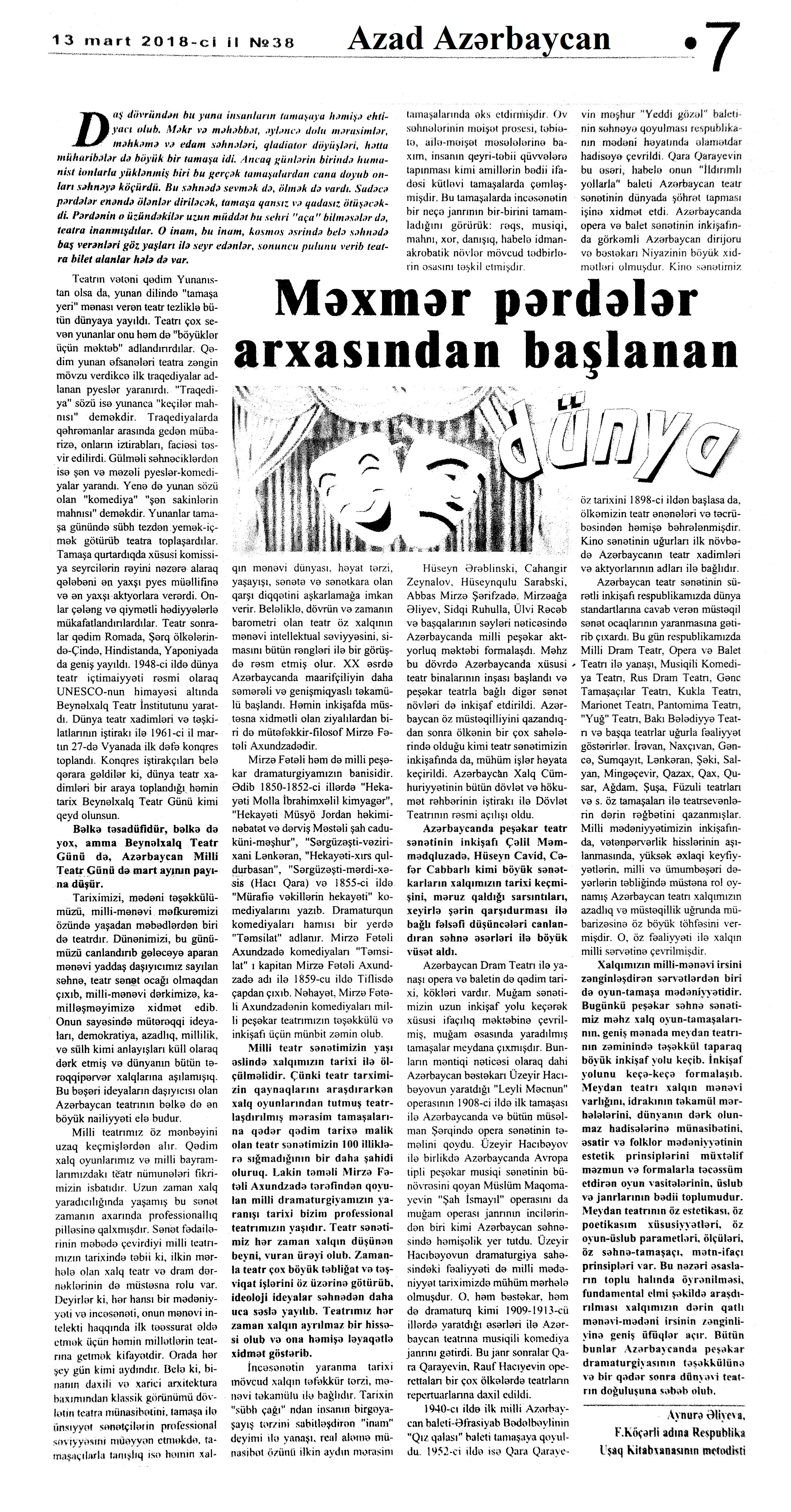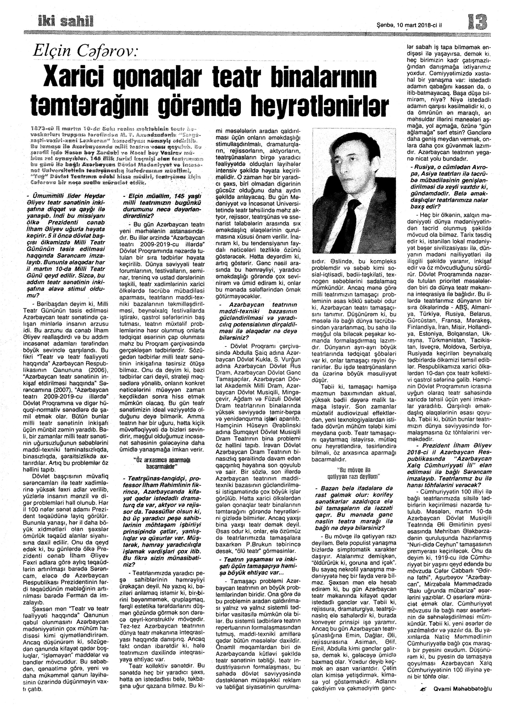 Bax: 69; 82; 149; 451 Milli Teatr Günü – 145 491. Babayeva, M. Milli teatrımız bu gün də, gələcəkdə də yaşayacaq //İki sahil.- 2018.- 10 mart.- S.16. 492. Bölgə teatrlarında bayram əhvalı: 10 Mart – Milli Teatr Günü paytaxtın teatr ocaqları ilə bərabər region teatrlarında da qeyd olunub //Mədəniyyət.- 2018.- 14 mart.- S.11. 493. Cəfərov, E. Xarici qonaqlar teatr binalarının təmtərağını görəndə heyrətlənirlər: [teatrşünas Elçin Cəfərovla müsahibə] /müsahibəni apardı Qvamı Məhəbətoğlu //İki sahil.- 2018.- 10 mart.- S.13. 494. Əliyeva, A. Məxmər pərdələr arxasından başlanan dünya //Azad Azərbaycan.- 2018.- 13 mart.- S.7. 495. Fərəcova, Z. Yüksək mənəviyyata səsləyən “Vəsiyyət”: 10 Mart – Milli Teatr Günüdür: [yazıçı-dramaturq Hüseynbala Mirələmovun eyniadlı pyesi Firudin Məhərrəmovun quruluşunda] //Azərbaycan.- 2018.-10 mart.- S.4. 496. “Gənc Tamaşaçılar”da Milli Teatr Günü //525-ci qəzet.- 2018.- 13 mart.- S.7. 497. Məmmədov, E. “Cavid Poeziya Teatrı” kitab-albomu haqqında qeydlər: [sənətşünaslıq üzrə fəlsəfə doktoru Ələkbər Qasımovun 10 Mart – Milli Teatr Günü ərəfəsində çapdan çıxan eyniadlı kitabı haqqında] //525-ci qəzet.- 2018.- 10 mart.- S.12. 498. Milli Teatr Günündə – Cümhuriyyətin 100 illiyi şərəfinə //Mədəniyyət.- 2018.- 10 mart.- S.2. 499. Milli teatrın 145 yaşı qeyd olundu: [Azərbaycan Dövlət Akademik Milli Dram Teatrında] //525-ci qəzet.- 2018.- 13 mart.- S.7. 500. Mirməmməd, G. Ən qocaman sənət bayramımız: Peşəkar milli teatrımızın 145 yaşı tamam olur //Mədəniyyət.- 2018.- 10 mart.- S.2. 501. Mirməmməd, G. Səhnədə qeyd edilən teatr bayramı //Mədəniyyət.- 2018.- 14 mart.- S.6. 502. Mükərrəmoğlu, M. Milli Teatr Günündə Cümhuriyyətin 100 illiyi şərəfinə yeni tamaşanın premyerası olacaq: [Azərbaycan Dövlət Musiqili Teatrında yazıçı-dramaturq Əli Əmirlinin “Nuri-didə Ceyhun” pyesi Mehriban Ələkbərzadənin quruluşunda] //Xalq qəzeti.-2018.- 6 mart.- S.7. 503. Mükərrəmoğlu, M. Teatrlarımız müasirləşməkdə davam edir: 10 Mart – Milli Teatr Günüdür //Xalq qəzeti.- 2018.- 10 mart.- S.6. 504. Rəis, X. Bayrama bayram qatan mükafatlar: [Teatr Xadimləri İttifaqında elmi-praktik konfransdan sonra teatr xadimlərimizin mükafatlara layiq görülmələri haqqında] //Kaspi.- 2018.- 15 mart.- S.11. 505. Rəis, X. 145 yaşlı “qoca”, ad günün mübarək! //Kaspi.- 2018.- 8-9 mart.- S.11. 506. Vahidqızı, Ü. “Zaman və teatr” elmi-praktik konfransı: [Azərbaycan Teatr Xadimləri İttifaqında keçirilən konfrans haqqında] //Xalq qəzeti.- 2018.- 10 mart.- S.6.