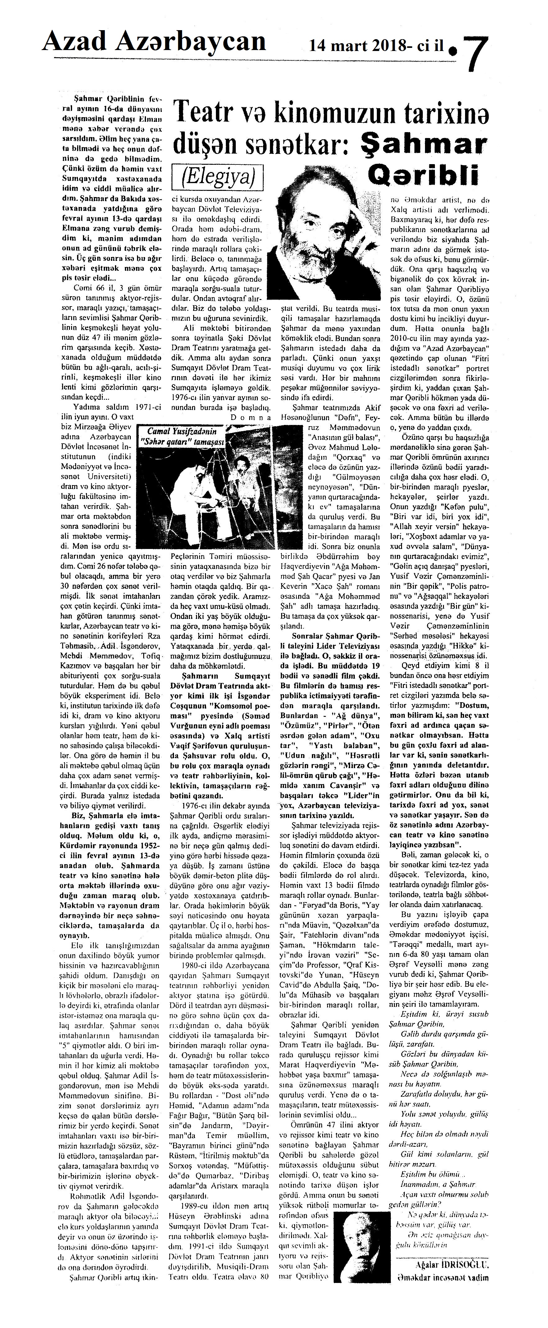 KİNO 443. “Arşın mal alan” fransalı tamaşaçılar tərəfindən maraqla qarşılanıb: [Parisdə xarici ölkələrin filmləri həftəsi çərçivəsində Üzeyir Hacıbəylinin eyniadlı əsərinin nümayişi haqqında] //Mədəniyyət.- 2018.-16 mart.- S.6.; Həftə içi.- 2018.- 16 mart.- S.8. 444. “Arşın mal alan”a fransız marağı //525-ci qəzet.- 2018.- 16 mart.- S.7. 445. Azərbaycanlı rejissorun layihəsi Kann festivalında: [Elvin Adıgözəlin “Yaşar” filmi] //Mədəniyyət.- 2018.- 7 mart.- S.5. 446. Azəri, L. Canlı, təbii obrazlar ustası: Yarım əsr “Azərbaycanfilm” kinostudiyasında çalışan aktyor Bahadur Əliyev kinonun durğunluq dövründə çox xiffət çəkib //Mədəniyyət.- 2018.- 7 mart.- S.12. 447. “Dəniz suyu içən it” festivalda mükafat qazanıb: [Murad Abiyevin eyniadlı filmi Rusiyanın Kazan şəhərində keçirilən “ZILANT” beynəlxalq kinofestivalında] //Mədəniyyət.- 2018.- 2 mart.- S.10. 448. Əşrəf, S. Düşərli quyu: [yazıçı-rejissor Səidə Haqverdiyevanın eyniadlı filmi haqqında] //Ədəbiyyat qəzeti.- 2018.- 31 mart.- S.30-31. 449. Fariz. “Eviniz abad” filminin təqdimatı keçirildi: [Mirsadıq Ağazadənin çəkdiyi eyniadlı filmin Nizami Kino Mərkəzində nümayişi haqqında] //Mədəniyyət.- 2018.- 20 mart.- S.6. 450. Fərəcova, Z. Kinomuzun “ögey” və doğmaları – analar...: Mənfi və ya müsbət obrazlarından, cəmiyyətdə tutduqları mövqelərdən asılı olmayaraq, onları bir cəhət birləşdirir - analıq duyğuları: [Nəcibə Məlikova, Ətayə Əliyeva, Nəsibə Zeynalova və Məhluqə Sadıqova haqqında] //Azərbaycan.- 2018.- 8 mart.- S.10. 451. Xəlilzadə, F. Sənət dünyasının sönməyən ulduz qardaşları: Hələ də onların “can verdiyi” obrazların, əsərlərin cazibəsindəyik: Azərbaycan kinosu – 120: [teatr, kino sənətinin, ədəbiyyatın inkişafında xüsusi xidmətləri olan Rza və Məmmədhüseyn Təhmasib qardaşlarının yaradıcılıqları haqqında] //Kaspi. -2018.- 3 mart.- S.7. 452. Kazımzadə, A. İşıqlı arzularım çoxdur...: [Əməkdar incəsənət xadimi, kinoşünas Aydın Kazımzadə ilə müsahibə] /müsahibəni apardı Hatəm Əsgərov //Respublika.- 2018.- 25 mart.- S.3. 453. Qaliboğlu, S. “Babam və oğlum” – kimdir günahkar?: [Nizami Kino Mərkəzində eyniadlı türk bədii filminin nümayişi haqqında] //Mədəniyyət.- 2018.- 7 mart.- S.15. 454. Məhərrəmova, T. “Kino və zaman”da əbədiləşən tarixi həqiqətlər: [Aydın Kazımzadənin eyniadlı kitabı haqqında] //Kaspi. - 2018.- 20 mart.- S.10. 455. Retro filmlərimizi görmürük: İstənilən televiziyanın kino siyasəti olmalıdır //Şərq.- 2018.- 14 mart.- S.13. 456. Səməndər Rzayev: Araq, serroz, sərxoş oynadığı son rol: Ramilə Qurbanlının “Ölümlü dünya” layihəsində //Üç nöqtə.- 2018.- 17 mart.- S.12. 457. Sultanova, M. “Nar bağı” filmi Kayseridə nümayiş olundu: [İlqar Nəcəfin çəkdiyi film] //Mədəniyyət.- 2018.-10 mart.- S.16. 458. Tahirə. Üç – beş sənətkar qalıb, ya qalmayıb: Rasim Balayev: Mətbuat belə çox maraqlananda insan özünü dəyərli hesab etməyə başlayır: [Xalq artistinin söylədikləri] //Şərq.- 2018.- 17 mart.- S.13.