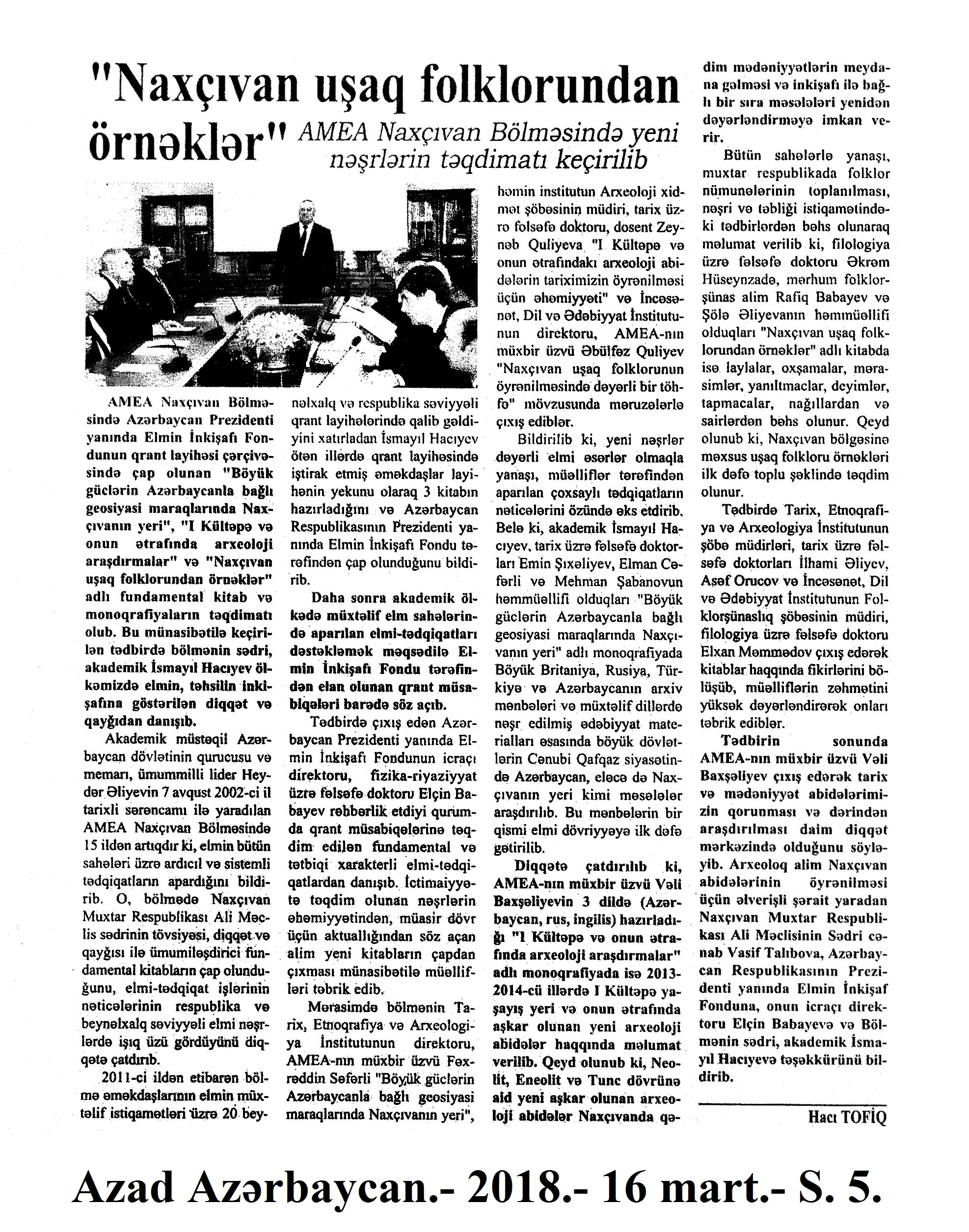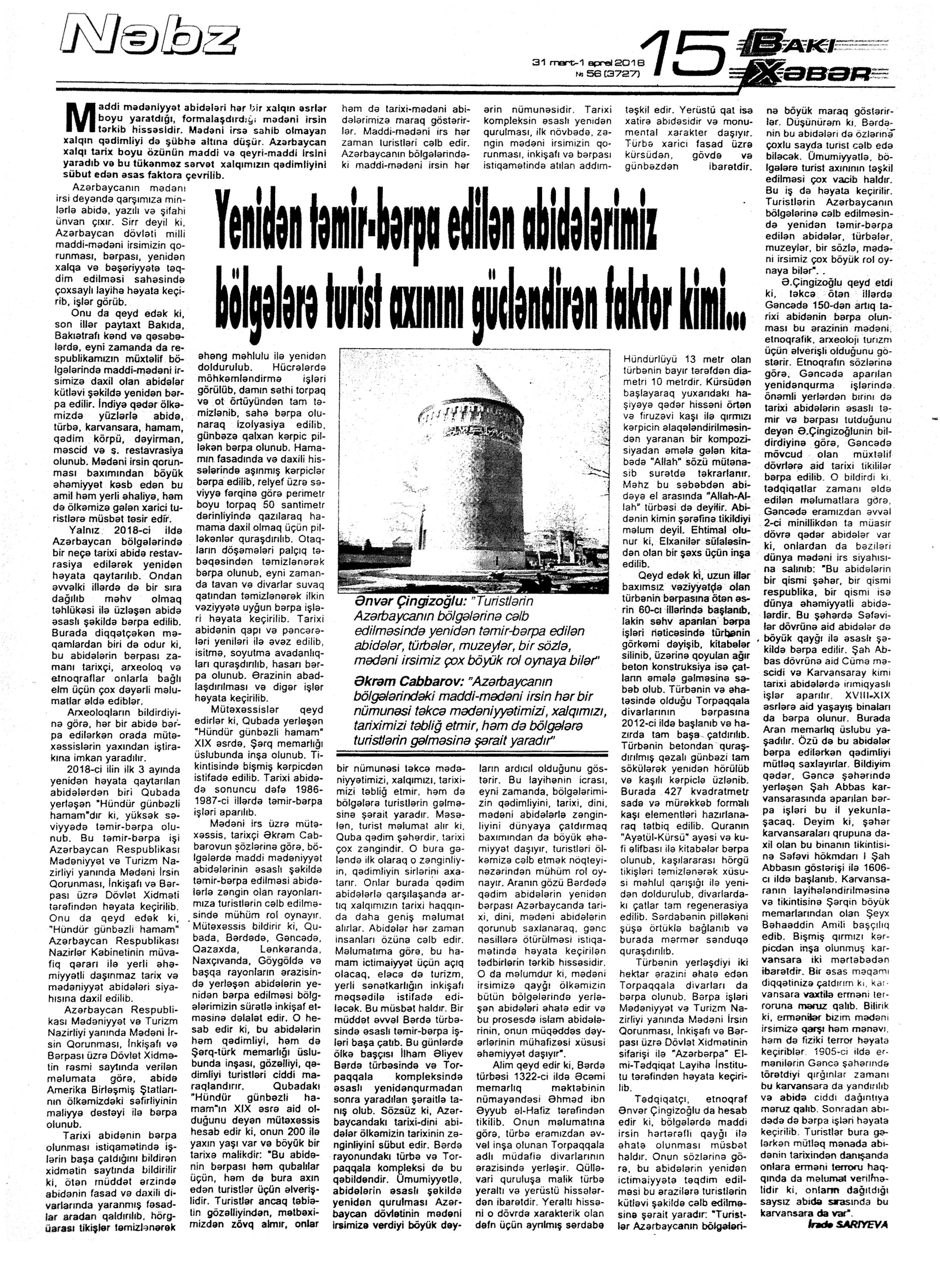 TARİX VƏ MƏDƏNİYYƏT ABİDƏLƏRİ 292. Bərdə türbəsində təmir-bərpa işləri başa çatıb //Mədəniyyət.- 2018.- 7 mart.- S.7. 293. Ermənistanın Azərbaycana məxsus maddi-mədəni irsin məhv edilməsi siyasəti ümumbəşəri sivilizasiyaya qarşı vəhşilikdir: [Xarici İşlər Nazirliyinin mətbuat xidmətinin məlumatı] //Azərbaycan.- 2018.- 28 mart.- S.4. 294. Fərəcova, Z. Bakının ilk abidələri: Tarixləşən heykəllər //Azərbaycan.- 2018.- 7 mart.- S.6. 295. Qubadakı “Hündür günbəzli hamam” ABŞ-ın maliyyə dəstəyi ilə bərpa olunub: Robert Sekuta: Ölkələr və xalqlar arasında ən gözəl bağlardan biri məhz mədəniyyət vasitəsilə qurulur: [Mədəniyyət və Turizm naziri Əbülfəs Qarayevin ABŞ-ın ölkəmizdəki səfiri ilə tarixi abidənin bərpasından sonra açılış mərasimində iştirakı haqqında] //Mədəniyyət.- 2018.- 28 mart.- S.3. 296. Sarıyeva, İ. Yenidən təmir-bərpa edilən abidələrimiz bölgələrə turist axınını gücləndirən faktor kimi... //Bakı Xəbər.- 2018.-31 mart.- S.15.