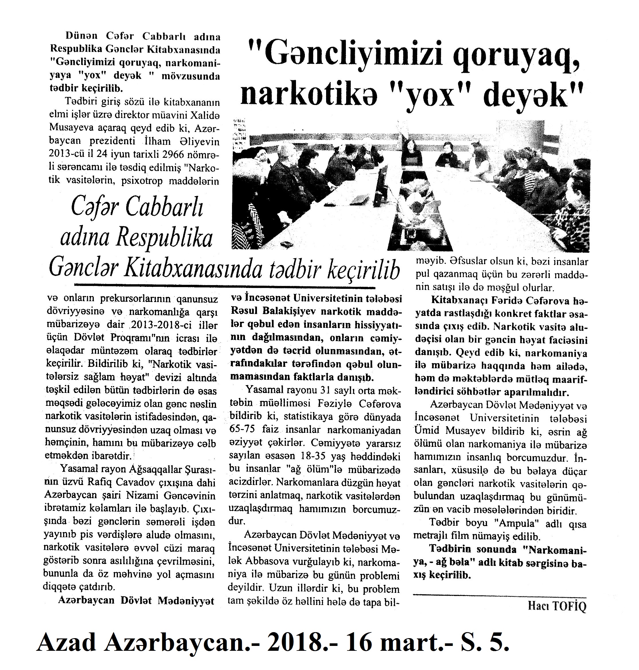Bax: 93 KİTABXANA İŞİ 276. Azəri, L. Milli Kitabxanada bir gün: Dövri mətbuat zalından reportaj //Mədəniyyəti.- 2018.-16 mart.- S.15. 277. Bakıxanovlar haqqında kitabın təqdimatı: [Gənclər Kitabxanasında Xalq artisti Tofiq Bakıxanov və aktyor Həsən Cəbrayılovun birgə tərtib etdikləri eyniadlı kitabın təqdimatı haqqında] //Mədəniyyət.- 2018.- 20 mart.- S.5. 278. Buktreyler festivalının promo çarxı təqdim olunub: [Muğam Mərkəzində] //Mədəniyyət.- 2018.- 14 mart.- S.13. 279. Fərəcov, S. Ulduz Sönməz: Mən belə yaşadım... kitabının təqdimatı keçirildi: [Milli Kitabxanada Əməkdar mədəniyyət işçisi Ulduz Quliyevanın həyat və yaradıcılığından bəhs edən eyniadlı kitabın təqdimatı haqqında] //Mədəniyyət.- 2018.- 7 mart.- S.4. 280. İsrail-Azərbaycan Beynəlxalq Assosiasiyasının direktoru Milli Kitabxanada //525-ci qəzet.- 2018.- 6 mart.- S.2. 281. Kitablarımız Minskdə beynəlxalq sərgi-yarmarkada nümayiş olunur //Mədəniyyət.- 2018.-2 mart.- S.4. 282. Qəbələdə “Kitabsevərlər klubu” təsis edilib: [Qəbələ rayonu Xırxatala kənd orta məktəbində] //Həftə içi.- 2018.- 8-9 mart.- S.8. 283. Qəbələdə pilot layihə çərçivəsində “Kitabsevərlər klubu” yaradılıb //Mədəniyyət.- 2018.- 10 mart.- S.7. 284. Qocayeva, Ə. Müqəddəs məbəd: [M.F.Axundov adına Milli Kitabxananın əməkdaşı Dilşad Sadıqova haqqında] //Respublika.- 2018.- 11 mart.- S.4. 285. Qurbanqızı, Z. Elmi Kitabxana yeni inkişaf mərhələsində: [BDU-nun Elmi Kitabxanası haqqında] //Respublika.- 2018.- 8 mart.- S.5. 286. Milli Kitabxana UNEC-lə birgə tədbir keçirdi: [“Tədris və akademik kommunikasiyanın təminatında elmi nəşrlər və kitabxanaların rolu: beynəlxalq standartlar və UNEC təcrübəsi” mövzusunda] //525-ci qəzet.- 2018.- 1 mart.- S.2. 287. Rəhman. X. Son dövrdə uşaq ədəbiyyatımız xeyli inkişaf edib: Firidun bəy Köçərli adına Respublika Uşaq kitabxanasının direktoru Şəhla Qəmbərova gördükləri mühüm işlərdən və planlarından danışıb //525-ci qəzet.- 2018.- 3 mart.- S.17. 288. Tofiq, H. Gəncliyimizi qoruyaq, narkotikə yox deyək: Cəfər Cabbarlı adına Respublika Gənclər Kitabxanasında tədbir keçirilib //Azad Azərbaycan.- 2018.- 16 mart.- S.5.