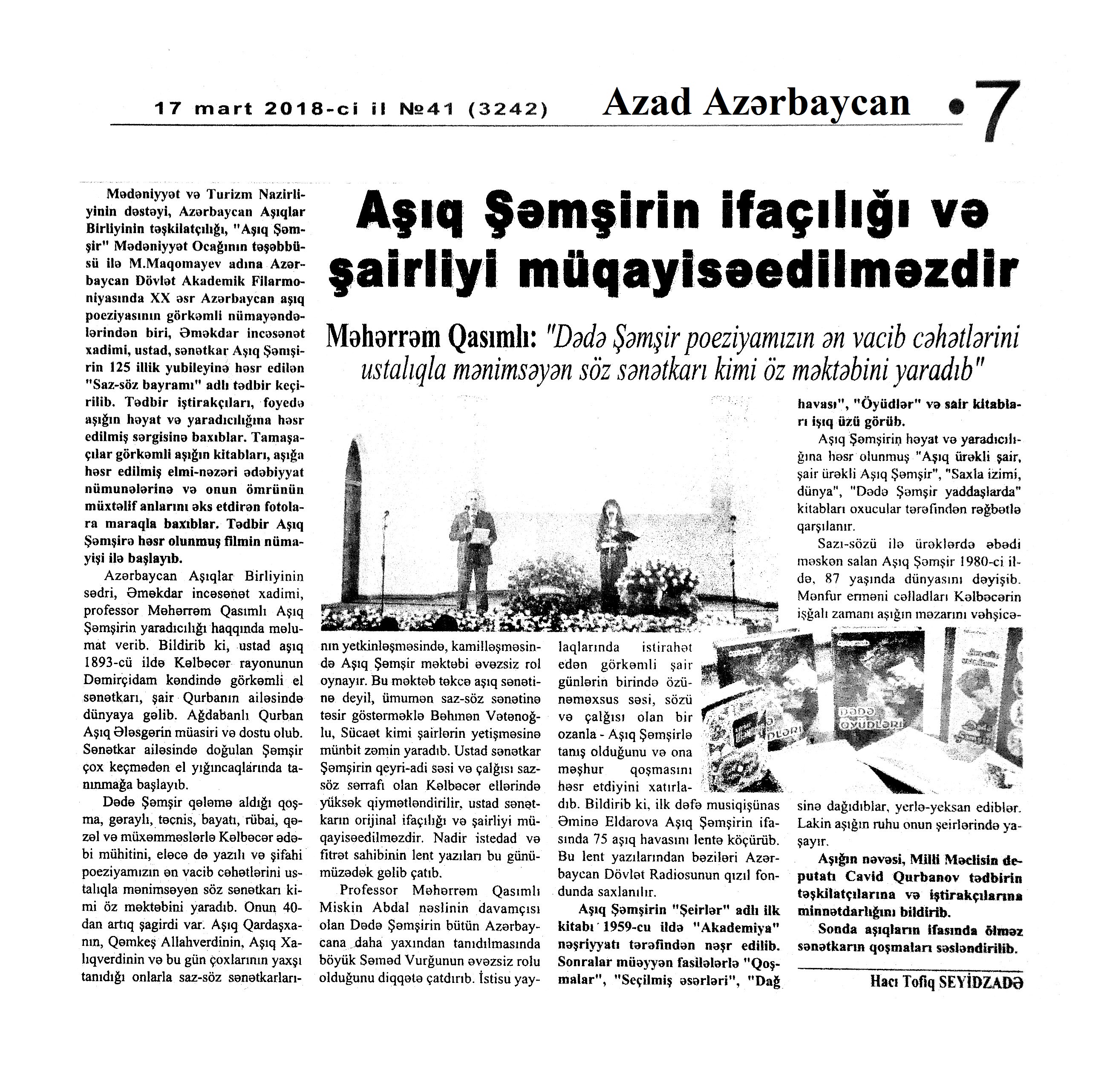 Aşıq Dədə Şəmşir – 125 433. Abbas, A. Aşıq Şəmşir dəlidağdan keçəndə… //Ədalət.- 2018.- 17 mart.- S.1;3. 434. Alışanlı, Ş. Sazın qüdrətilə sözün hikmətini qovuşduran ustad: Dədə Şəmşir – 125 //525-ci qəzet.- 2018.- 15 mart.- S.7. 435. Aşıq Şəmşirin yubileyinə həsr edilmiş “Saz-söz bayramı” adlı tədbir keçirilib: [Azərbaycan Dövlət Filarmoniyasında] //Azərbaycan.- 2018.- 17 mart.- S.7. 436. Aşıq Şəmşirin yubileyinə həsr edilmiş “Saz-söz bayramı”: [Dövlət Akademik Filarmoniyasında] //Mədəniyyət.- 2018.- 20 mart.- S.7. 437. Fərəcov, S. Aşıq musiqisi axşamları davam edir: Növbəti ədəbi-musiqili proqram Aşıq Şəmşirə həsr olunmuşdu: [Beynəlxalq Muğam Mərkəzində] //Mədəniyyət.- 2018.- 30 mart.- S.5. 438. Nərimanoğlu, M. Zərli tac kamallı başa yaraşır: Aşıq Şəmşir – 125 //Azərbaycan.- 2018.- 15 mart.- S.7. 439. Seyidağa, E. 87 il yaşayan ölməz ustad: Dədə Şəmşirin 125 illiyi yüksək səviyyədə qeyd olundu //Yeni Müsavat.- 2018.- 16 mart.- S.3. 440. Seyidzadə, H. Aşıq Şəmşirin ifaçılığı və şairliyi müqayisəedilməzdir //Azad Azərbaycan.- 2018.- 17 mart.- S.7.