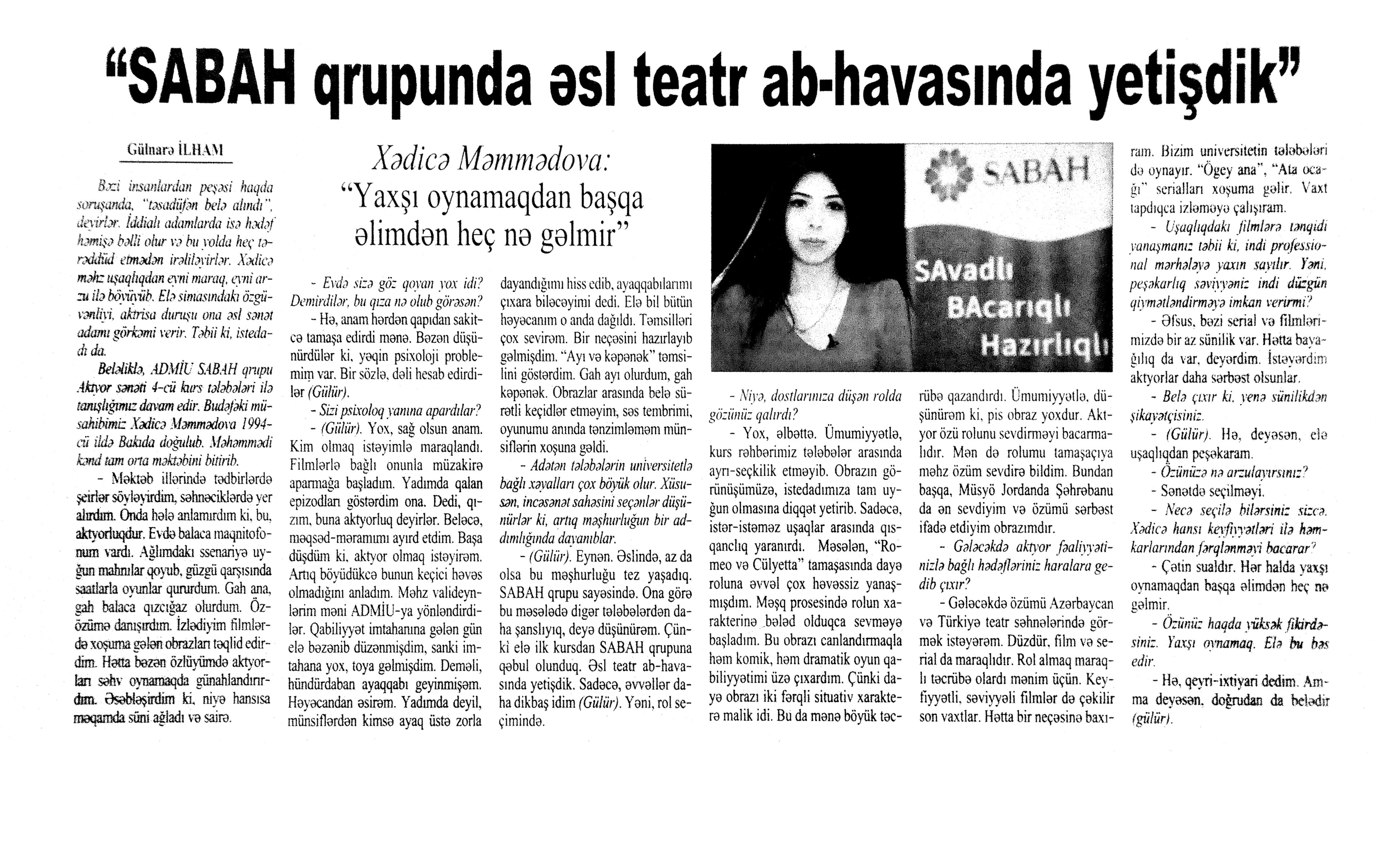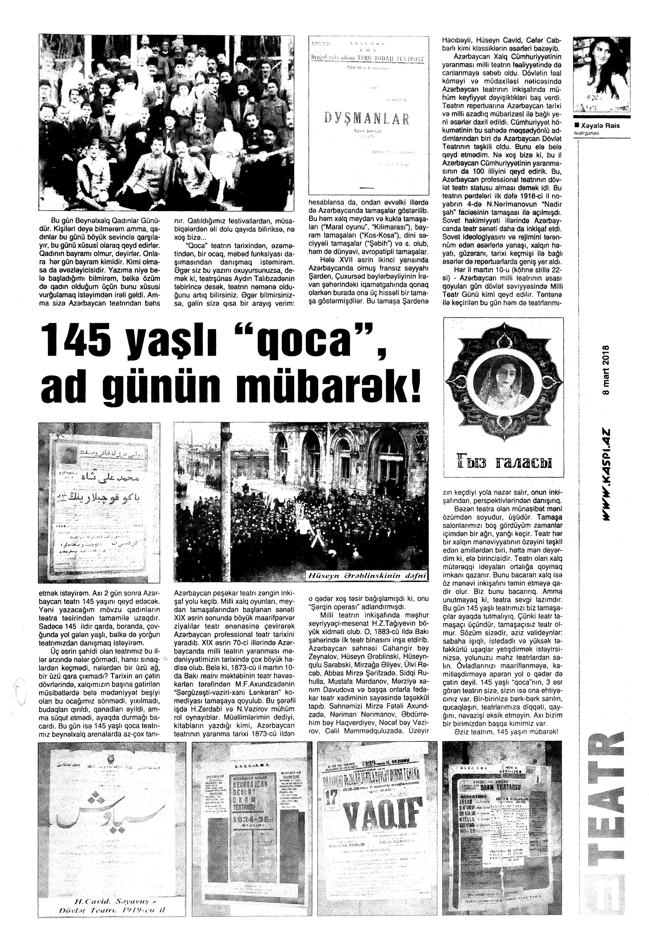 Azərbaycan Dövlət Gənc Tamaşaçılar Teatrı 524. Azəri, L. Məhəbbətin hərarəti dünyanın buzunu əridər: [Elşad Rəhimzadənin hazırladığı “Qar kraliçası” tamaşasının nümayişi haqqında] //Mədəniyyət.- 2018.- 20 mart.- S.7. 525. “Bir günəş altında” tamaşası təqdim olunub //Mədəniyyət.- 2018.- 10 mart.- S.2. 526. Əlili, G. Həyat yoldaşımı bir aktyor kimi bəyənirəm: Gültac Əlili: Kiçik roldan elə bir obraz düzəldərəm ki, böyük rolu oynayan aktyor yanımda kölgədə qalar: [teatrın aktrisası Gültac Əlili ilə müsahibə] /müsahibəni apardı Xəyalə Rəis //Kaspi.- 2018.- 20 mart.- S.12. 527. Gənc Tamaşaçılar Teatrı festival və olimpiadaya qatılıb: [Birləşmiş Ərəb Əmirliklərinin Əl-Füceyra şəhərində və Hindistanda] //Mədəniyyət.- 2018.- 14 mart.- S.10. 528. Hadızadə, K. Tanınmış aktyor: Uşaqlar məni söyürdü, təpikləyirdi...: Kərəm Hadızadə: Sadəcə olaraq dedilər Qazax açığını oynamalısan: [aktyorla müsahibə] /müsahibəni apardı Aliya //Üç nöqtə.- 2018.-2 mart.- S.12. 529. Müşfiq, Ş. “Mehmanxana sahibəsi”nin səhnədə yeni cilvəsi: [Cənnət Səlimovanın hazırladığı eyniadlı tamaşanın nümayişi haqqında] //525-ci qəzet.- 2018.- 28 mart.- S.7.