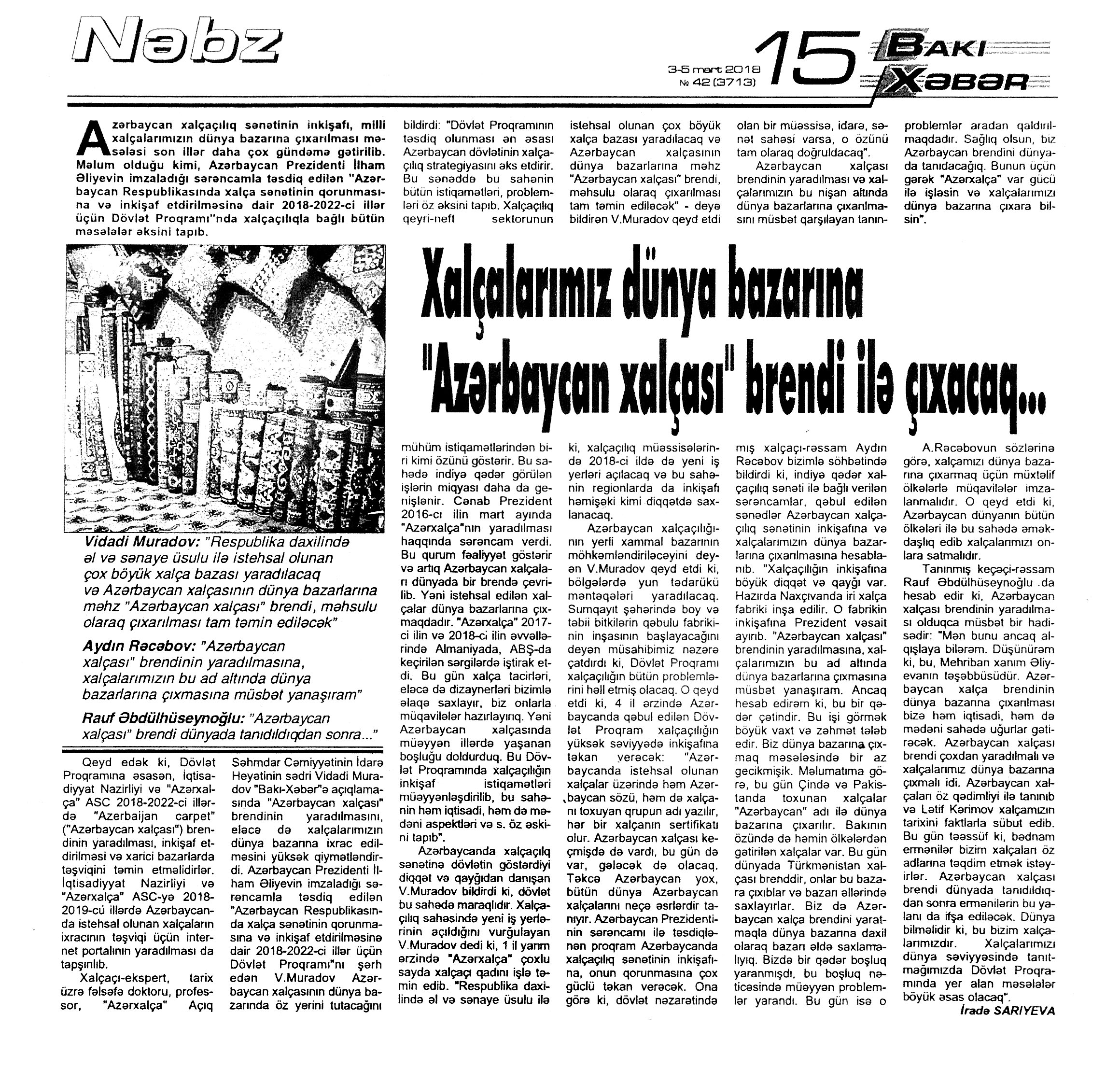 DEKORATİV-TƏTBİQİ İNCƏSƏNƏT 321. Azərbaycan Xalça Muzeyi ən yaxşı təcrübəyə layiq görülüb: [Beynəlxalq Sənədləşmə komitəsi tərəfindən] //Həftə içi.- 2018.- 2 mart.- S.8. 322. Azərbaycan Respublikasında xalça sənətinin qorunmasına və inkişaf etdirilməsinə dair 2018-2022-ci illər üçün Dövlət Proqramı //Azərbaycan.- 2018.-2 mart.- S.3. 323. Bayramova, Z. Xalçaçılığın inkişafı ölkəmizin iqtisadiyyatını gücləndirir //Səs.- 2018.- 2 mart.- S.8-9. 324. Cənubi Qafqazın ən qədim zinət əşyası Heydər Əliyev Mərkəzində //Azərbaycan.-2018.- 17 mart.- S.6. 325. Əhmədova, K. Öz işimi çox sevirəm və heç nəyə dəyişmərəm: Lalə Abdullayeva: Həmişə arzum olub ki, kiçik bir yerim olsun, orada öz işlərimi nümayiş etdirim: [dizaynerin müsahibəsi] /müsahibəni qələmə aldı Könül Əhmədova //Üç nöqtə.- 2018.- 6 mart.- S.7. 326. Fərəcov, S. Yaşıl yarpaqdan çeşidli libaslara...: [ipəkçiliyin inkişafı haqqında] //Mədəniyyət.- 2018.- 28 mart.- S.12. 327. Hüseynov, F. “Pazırık xalısı. Rəmzlər dünyası” kitabının təqdimatı keçirildi: Dünyanın ən qədim xalısı türk xalqlarına məxsusdur: [Xalça Muzeyində xalçaçı rəssam Məmmədhüseyn Hüseynovun eyniadlı kitabının təqdimatı haqqında] //Mədəniyyət.- 2018.- 10 mart.- S.4. 328. Hüseynov, F. Baharı birlikdə qarşılayaq: Qara Qarayev adına Mərkəzi İncəsənət Məktəbinin şagirdləri əl işlərini təqdim etdilər: [Xətai Sənət Mərkəzində] //Mədəniyyət.- 2018.- 7 mart.- S.8. 329. Hüseynov, M. Bu əsər insanlığın bizə gəlib çatan ən qədim sənət nümunələrindəndir: [dosent Məmmədhüseyn Hüseynovla müsahibə] /söhbətləşdi Sərdar Amin //Ədəbiyyat qəzeti.- 2018.- 3 mart.- S.18-19. 330. Xədicə. “Pazırık xalısı. Rəmzlər dünyası” nın təqdimatı olub: [Xalça Muzeyində xalçaçı rəssam Məmmədhüseyn Hüseynovun eyniadlı kitabının təqdimatı haqqında] //525-ci qəzet.- 2018.- 10 mart.- S.13. 331. Qarayeva, S. Xalça Muzeyindən reportaj: Muzeydə xanım jurnalistlər üçün mediatur təşkil olundu //525-ci qəzet.- 2018.- 6 mart.- S.7. 332. Qədim Azərbaycan müasir gənclərin gözü ilə: [Muzey Mərkəzinin sərgi qalereyasında 14-29 yaşlı gənclərin əl işlərinin nümayişi haqqında] //Mədəniyyət.- 2018.- 14 mart.- S.4. 333. Rəsulova, R. Yaşadılan el sənəti: xalçaçılıq //Xalq qəzeti.- 2018.- 27 mart.- S.10. 334. Sarıyeva, İ. Xalçalarımız dünya bazarına “Azərbaycan xalçası” brendi ilə çıxacaq... //Bakı Xəbər.- 2018.-3-5 mart.- S.15.