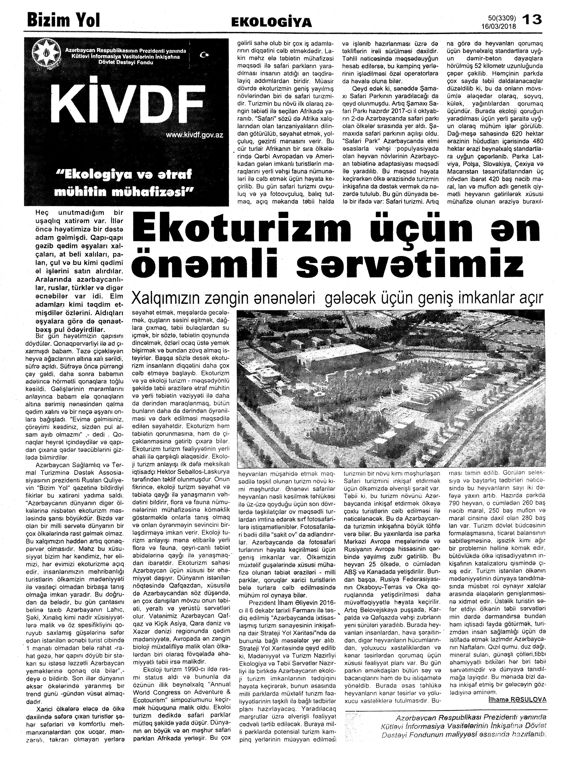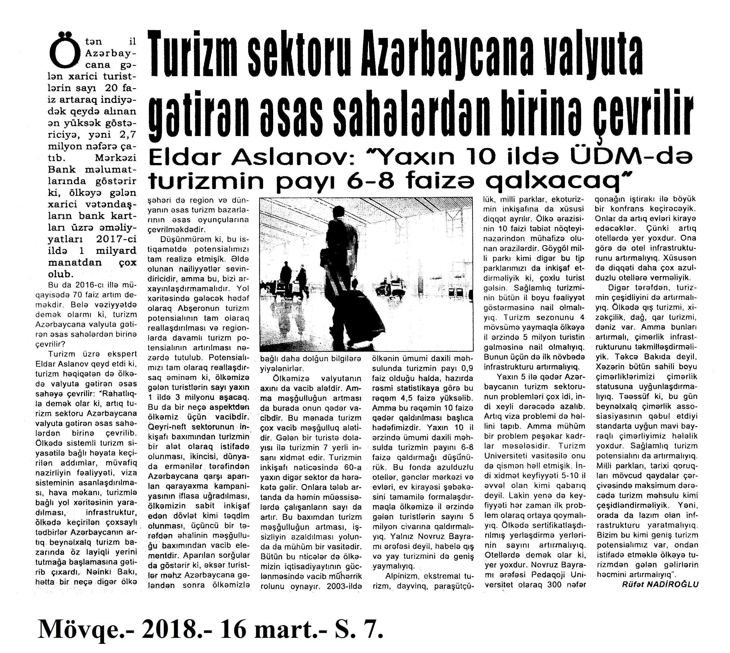 TURİZM 531. Azərbaycan turizmi İtaliyada təbliğ olunur //Mədəniyyət.- 2018.- 16 mart.- S.9. 532. Azərbaycanın turizm imkanları Avropanın ən böyük sərgisində: Sərgi çərçivəsində “İpək Yolu” ölkələri turizm nazirlərinin 8-ci görüşü keçirilib: [Almaniya paytaxtında işə başlayan “İTB 2018” beynəlxalq turizm sərgisində] //Mədəniyyət.- 2018.- 10 mart.- S.8. 533. Azərbaycanlı turizm eksperti Malayziyada mükafata layiq görülüb: [Nərgiz Səfərovanın “Datuk” fəxri adına layiq görülməsi haqqında] //Mədəniyyət.- 2018.- 2 mart.- S.9. 534. “Baku Guide” bələdçi kataloqunun mart sayında //Mədəniyyət.- 2018.- 7 mart.- S.16. 535. Cəlilova, G. Azərbaycanda ekoturizmin böyük perspektivindən danışılır...: [turizm sahəsi üzrə ekspert Ruslan Quliyevin soylədikləri] //Bakı Xəbər.- 2018.- 1 mart.- S.12. 536. Daşkənddə Azərbaycanın turizm potensialı ilə bağlı təqdimat keçirilib //Mədəniyyət.- 2018.- 28 mart.- S.9. 537. Daşkənddə Azərbaycanın turizm təqdimatı //Mədəniyyət.- 2018.- 20 mart.- S.9. 538. Əliyev, S. Naftalana müalicəyə və istirahətə gələnlərin sayı 40 faiz artıb //Azərbaycan.- 2018.- 11 mart.- S.1-2. 539. Həyatının coşqun çağında dünyadan köçdü...: [turizm sahəsində xidmətləri olmuş Azər İsmayılovun vəfatı ilə əlaqədar] //Mədəniyyət.- 2018.- 30 mart.- S.4. 540. Hüseynov, F. Bir kartla Bakını gəz, gör və qazan...: Rəsmi şəhər kartı turistlərə və yerli sakinlərə əlverişli imkanlar yaradacaq //Mədəniyyət.- 2018.- 2 mart.- S.9. 541. Hüseynov, F. Görüş yeri yenə Bakıdır: AİTF sərgisi 17-ci dəfə dünyanın aparıcı turizm ölkələri və şirkətlərini bir araya gətirəcək //Mədəniyyət.- 2018.- 30 mart.- S.8. 542. Hüseynov, F. Sağlamlıq və turizm – mövcud imkanlardan necə istifadə etməli?: Naftalanda keçirilən iclasda ölkəmizdə turizmin bu sahəsinin inkişaf perspektivləri müzakirə olundu: [iclasda Mədəniyyət və Turizm naziri Əbülfəs Qarayevin çıxış etməsi haqqında] //Mədəniyyət.- 2018.- 16 mart.- S.3. 543. Quliyev, L. Bərdə tərəqqi yolu ilə irəliləyir: [rayonun mədəniyyət və turizminin inkişafı haqqında] //Azərbaycan.- 2018.-1 mart.- S.5. 544. Qurbanova, N. Tarix, mətbəx, turist baxımından zəngin məkan – Şəki //Həftə içi.- 2018.- 29 mart.- S.7. 545. Moskvada ölkəmizin işgüzar turizm imkanları təbliğ olunub //Mədəniyyət.- 2018.- 20 mart.- S.9. 546. Moskvadakı turizm sərgisində ölkəmiz də təmsil olunur: [“MITT 2018” beynəlxalq turizm sərgisi çərçivəsində] //Mədəniyyət.- 2018.- 14 mart.- S.9. 547. Nadiroğlu, R. Turizm sektoru Azərbaycana valyuta gətirən əsas sahələrdən birinə çevrilir: [turizm üzrə ekspert Eldar Aslanovun fikirləri] //Mövqe.- 2018.- 16 mart.- S.7. 548. Ölkəmiz Avropa Spa Assosiasiyasının iclasında təmsil olunub: [Almaniya paytaxtında işə başlayan “İTB 2018” beynəlxalq turizm sərgisi çərçivəsində] //Mədəniyyət.- 2018.- 10 mart.- S.8. 549. Ölkəmiz Berlində turizm sərgisində təmsil olunur: Yunanıstanda isə Lüsern Dünya Turizm Forumunun “Beyin mərkəzi” toplanıb //Mədəniyyət.- 2018.- 7 mart.- S.9. 550. Paytaxtın rəsmi şəhər kartını yaratmaq məqsədilə memorandum imzalanıb: [Milli Turizm Təbliğat Bürosu, Bakı Nəqliyyat Agentliyi və “PASHA Travel” şirkətinin keçirdikləri görüşdə] //Azərbaycan.- 2018.- 1 mart.- S.3. 551. Polşa jurnalında paytaxtımızdakı turizm filmləri festivalı haqqında məlumat //Mədəniyyət.- 2018.- 30 mart.- S.8. 552. Rəsulova, İ. Ekoturizm üçün ən önəmli sərvətimiz: Xalqımızın zəngin ənənələri gələcək üçün geniş imkanlar açır //Bizim yol.- 2018.- 16 mart.- S.13. 553. Səlimov, Ə. Qəbələ Azərbaycanın turizm brendinə çevrilir: 2020-ci ildə “İslam dünyasının turizm paytaxtı” seçilməsi onun daha geniş miqyasda tanınmasına təsir göstərəcək //Azərbaycan.- 2018.-1 mart.- S.5. 554. Turizm Şurası turizm sahəsinin inkişafına öz töhfələrini verir //Yeni Azərbaycan.- 2018.- 3 mart.- S.7. 555. Turqut, T. Turistlər üçün ən cəlbedici ölkə //İki sahil.- 2018.- 22 mart.- S.13. 556. Vahidqızı, Ü. Berlin turizm sərgisində Azərbaycan da təmsil olunub //Xalq qəzeti.- 2018.- 11 mart.- S.6.