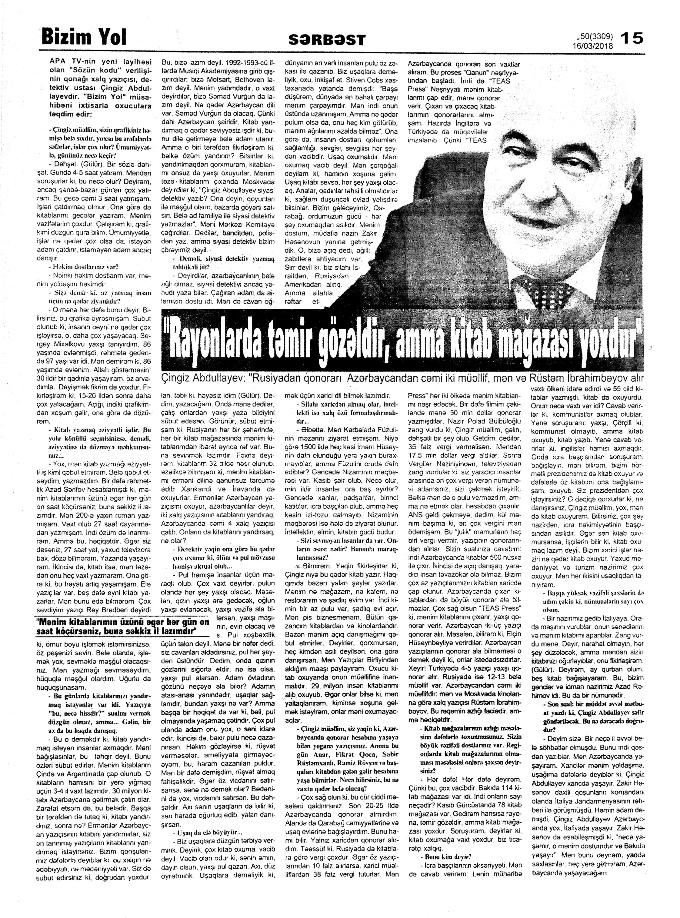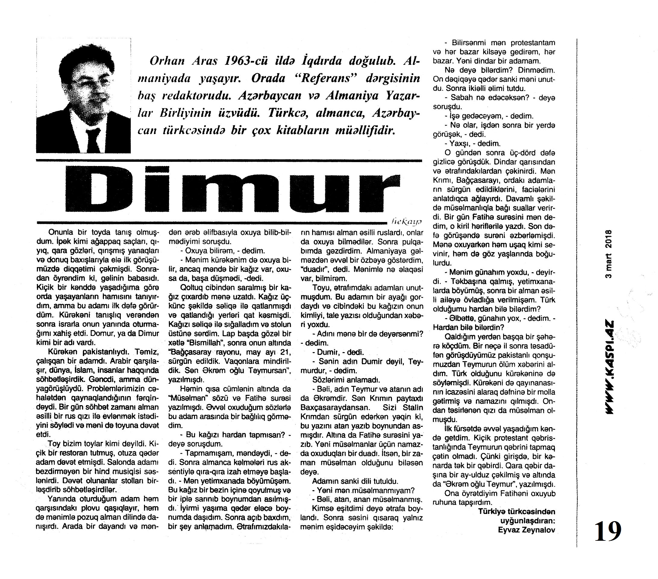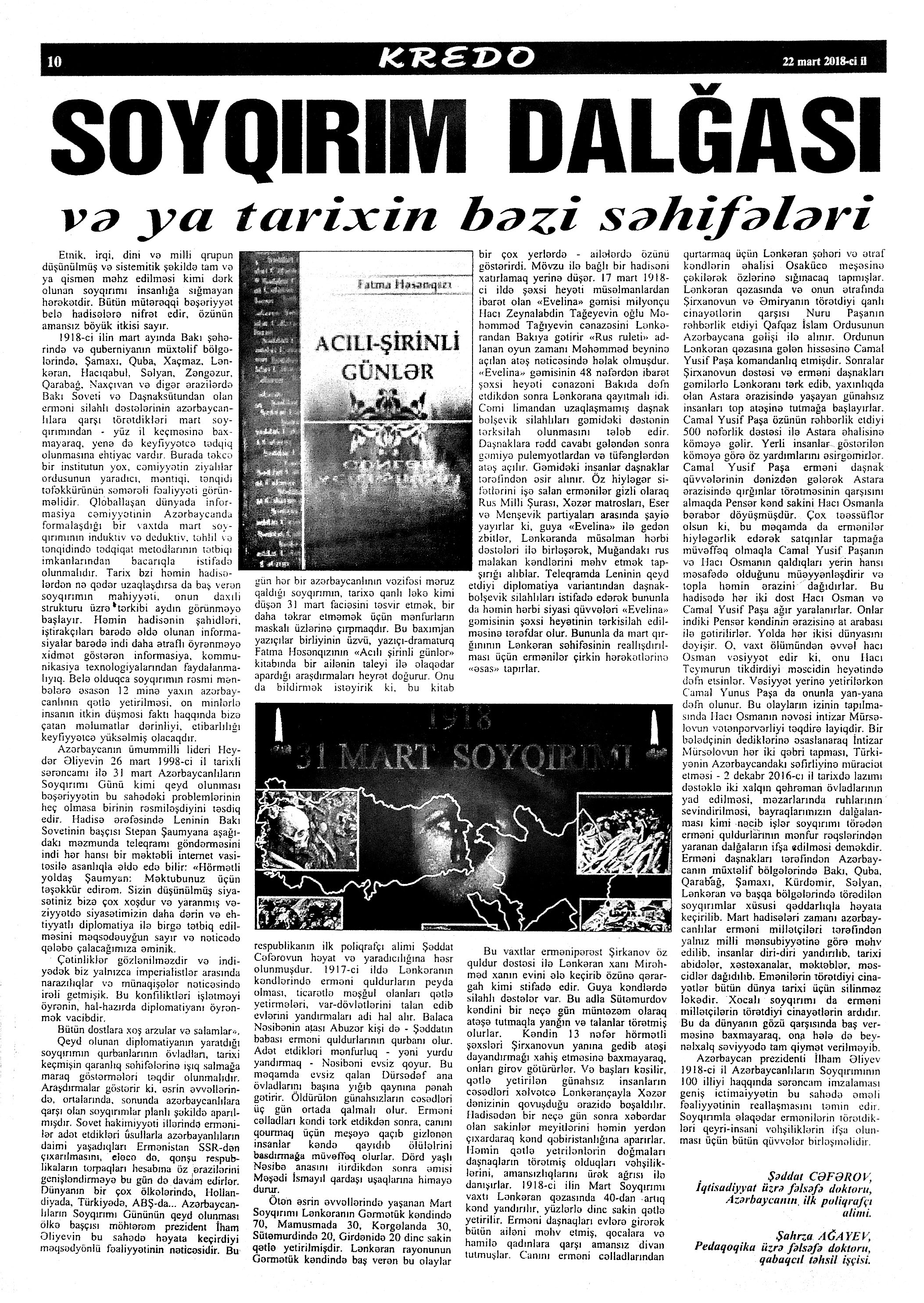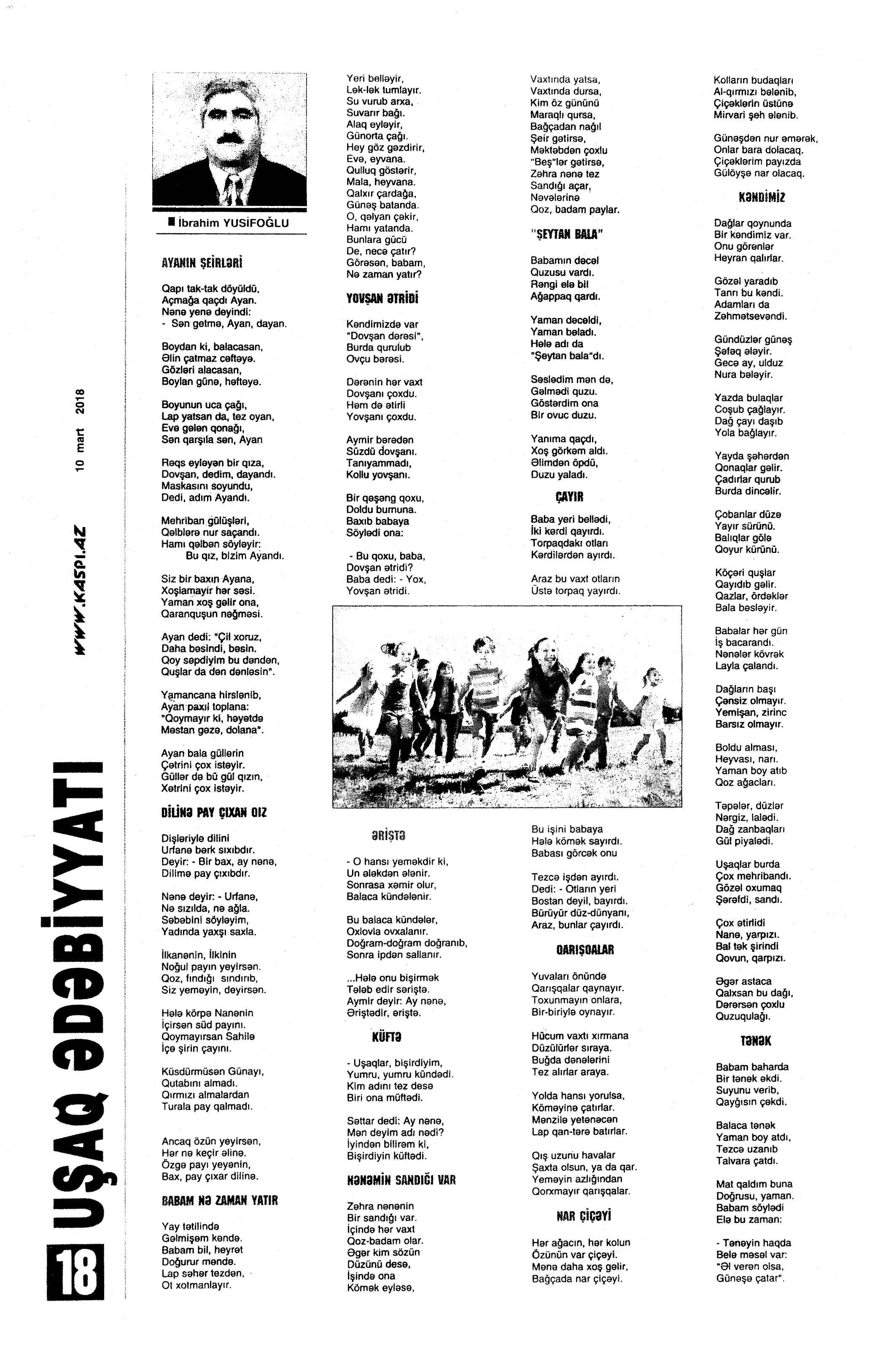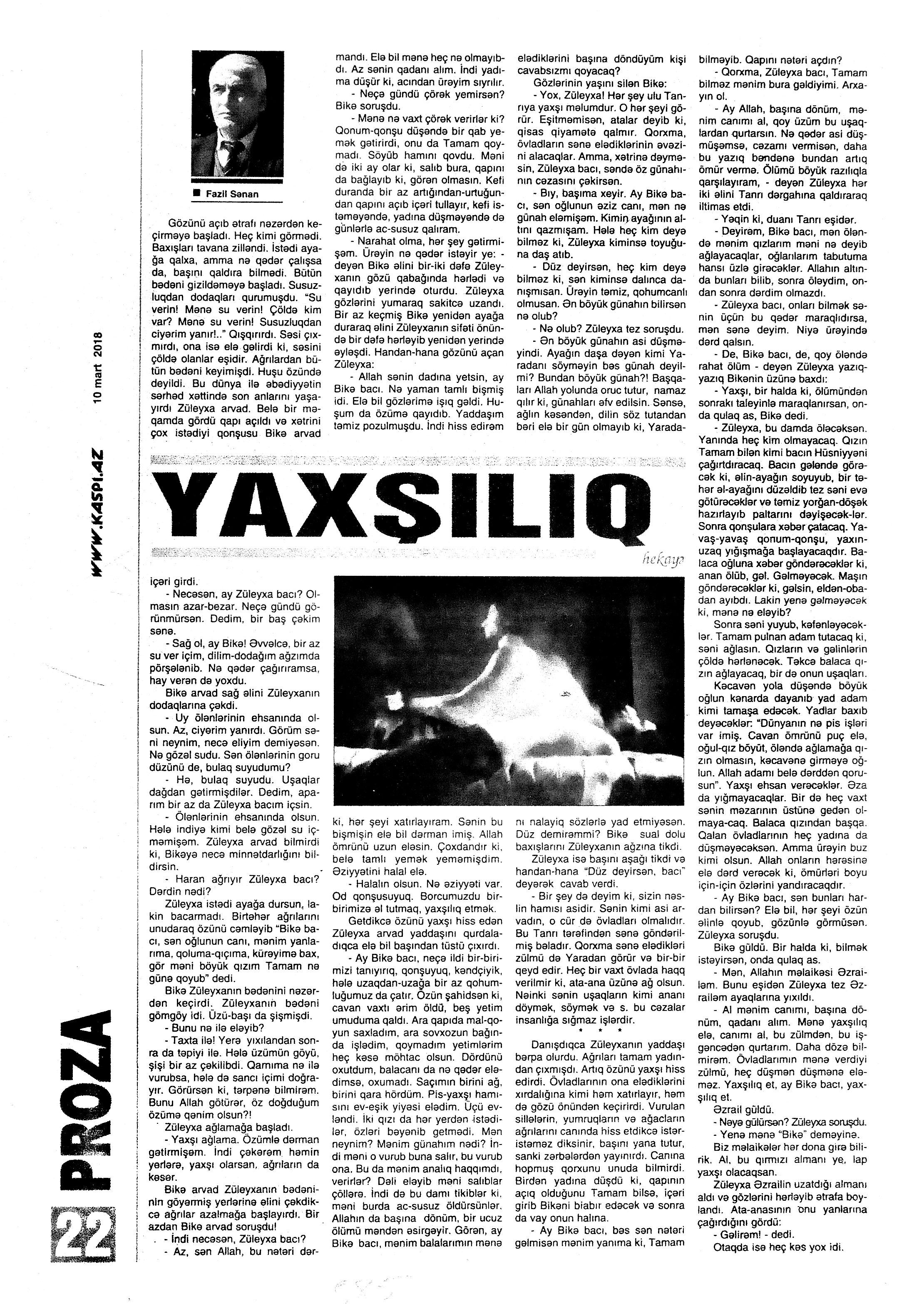 HEKAYƏLƏR 610. Abdulla, A. Şedevrin oğurlanması //525-ci qəzet.- 2018.- 10 mart.- S.19-22;24. 611. Abdulla, M. Dəli Bəybala//Ədəbiyyat qəzeti . -2018.- 3 mart.- S.11. 612. Aras, O. L. Dimur: [türk dilindən tərcümə] /tərc.etdi Eyvaz Zeynalov //Kaspi.-2018.- 3 mart.- S.19. 613. Cavanşirzadə, Ş. Həyat dərsi: hekayə //Kaspi.- 2018.- 31 mart.- S.20. 614. Çexov, A. Xeyirxah alman: [rus ədəbiyyatı] /tərc.etdi Kamran Nəzirli //Ədəbiyyat qəzeti.-2018.- 3 mart.- S.21. 615. Çexov, A. Yazıçı: [rus ədəbiyyatı] /tərc.etdi Kamran Nəzirli //525-ci qəzet.- 2018.- 10 mart.- S.24. 616. Əhmədqızı, H. Göyərçinlinin qonağı //525-ci qəzet.-2018.- 29 mart - S.7. 617. Əlabbas. Yolda adam //Ədəbiyyat qəzeti.- 2018.- 31 mart.- S.5. 618. Ənvəroğlu, Ç. Qisas gülləsi! //Ədalət.- 2018.- 3 mart.- S.16. 619. Fikrətoğlu, O. O və o biri //Ədəbiyyat qəzeti.- 2018.- 31 mart.- S.7. 620. Fikrətoğlu, O. Sonuncu əsgər //Kaspi.- 2018.- 17-19 mart.- S.18. 621. İsabəyli, Q. 3-ə bölünməyən 40 //Ədəbiyyat qəzeti.- 2018.- 17 mart.- S.7. 622. Kəngərli, A. Robot 50 KDK 101: Fantastik hekayə //525-ci qəzet. 2018.- 8 mart.- S.8. 623. Qiyas, Ə. Sarılıq...Həm də avtoportert //Ədəbiyyat qəzeti.- 2018.- 17 mart.- S.14-15. 624. Mehdi, Q. Savaş: hədis-hekayə //Ədəbiyyat qəzeti.- 2018.- 31 mart.- S.19. 625. Məhərrəmov, V. Şanapipiyin gəlişi //525-ci qəzet.- 2018.- 16 mart - S.7. 626. Sarvan, S. Niyə dərmədim; Dünənə ayna tut; Mən həmən aşıqəm və s. //Kaspi.- 2018.- 10-12 mart.- S.23. 627. Seyidli, P. Yuxu //Ədəbiyyat qəzeti.- 2018.- 17 mart.- S.4-5. 628. Sənan, F. Yaxşılıq //Kaspi.- 2018.- 10-12 mart.- S.22. 629. Vilayətoğlu, Z. İynə //Ədəbiyyat qəzeti.- 2018.- 3 mart.- S.20-21. 630. Yıldız, S. Həsrət damlaları //Ədəbiyyat qəzeti.- 2018.- 31 mart.- S.18-19. 631. Yusifoğlu, İ. Ayanın şeirləri; Dilinə pay çıxan qız; Yovşan ətridi və s. //Kaspi.- 2018.- 10-12 mart.- S.18.