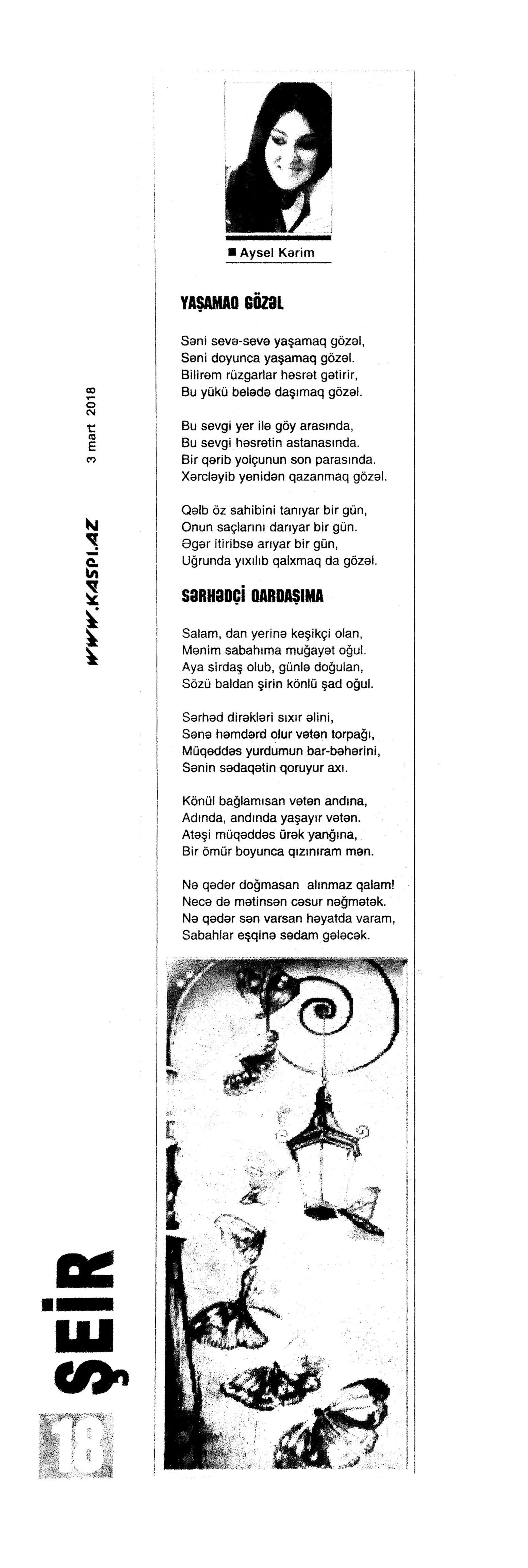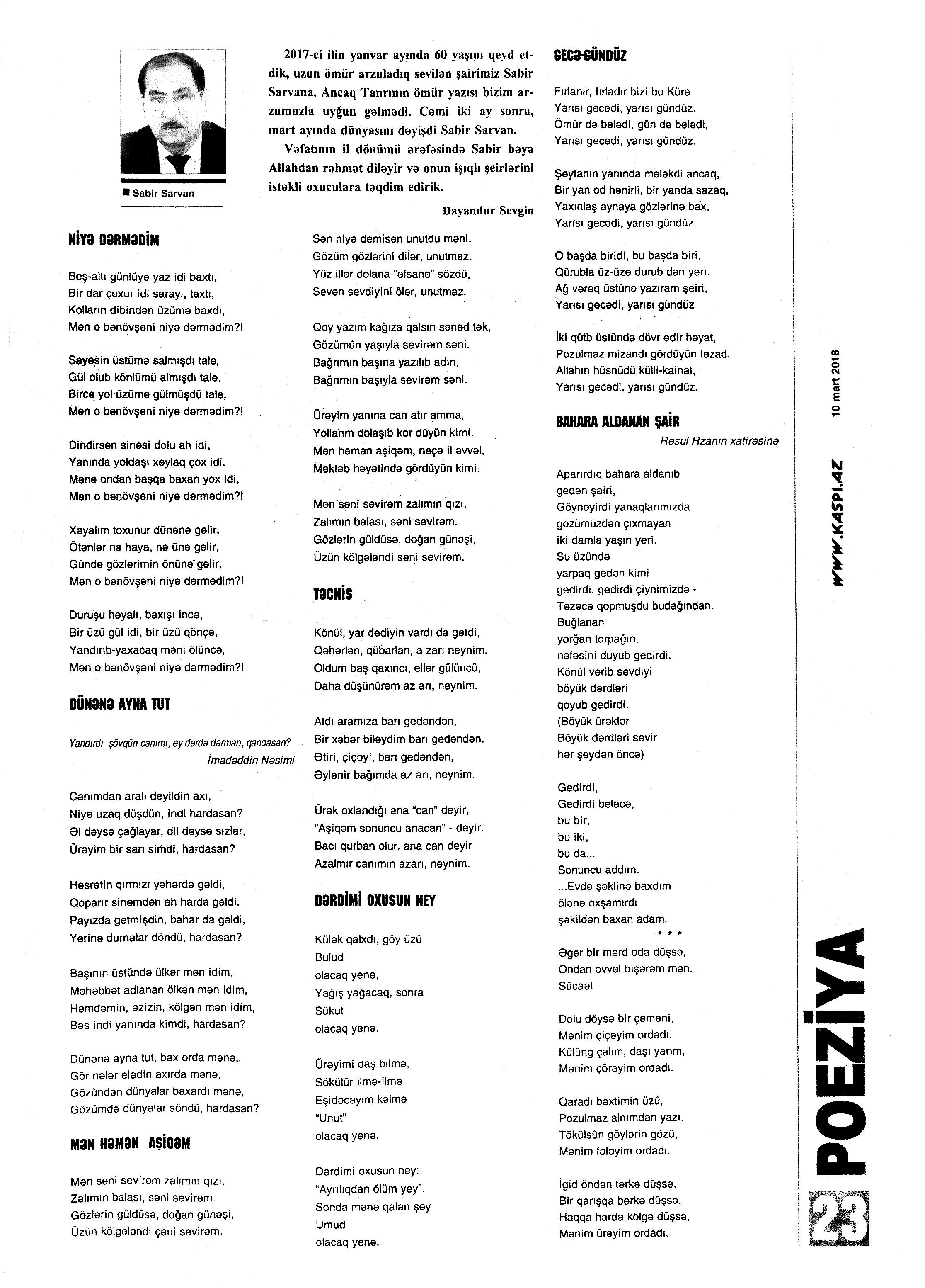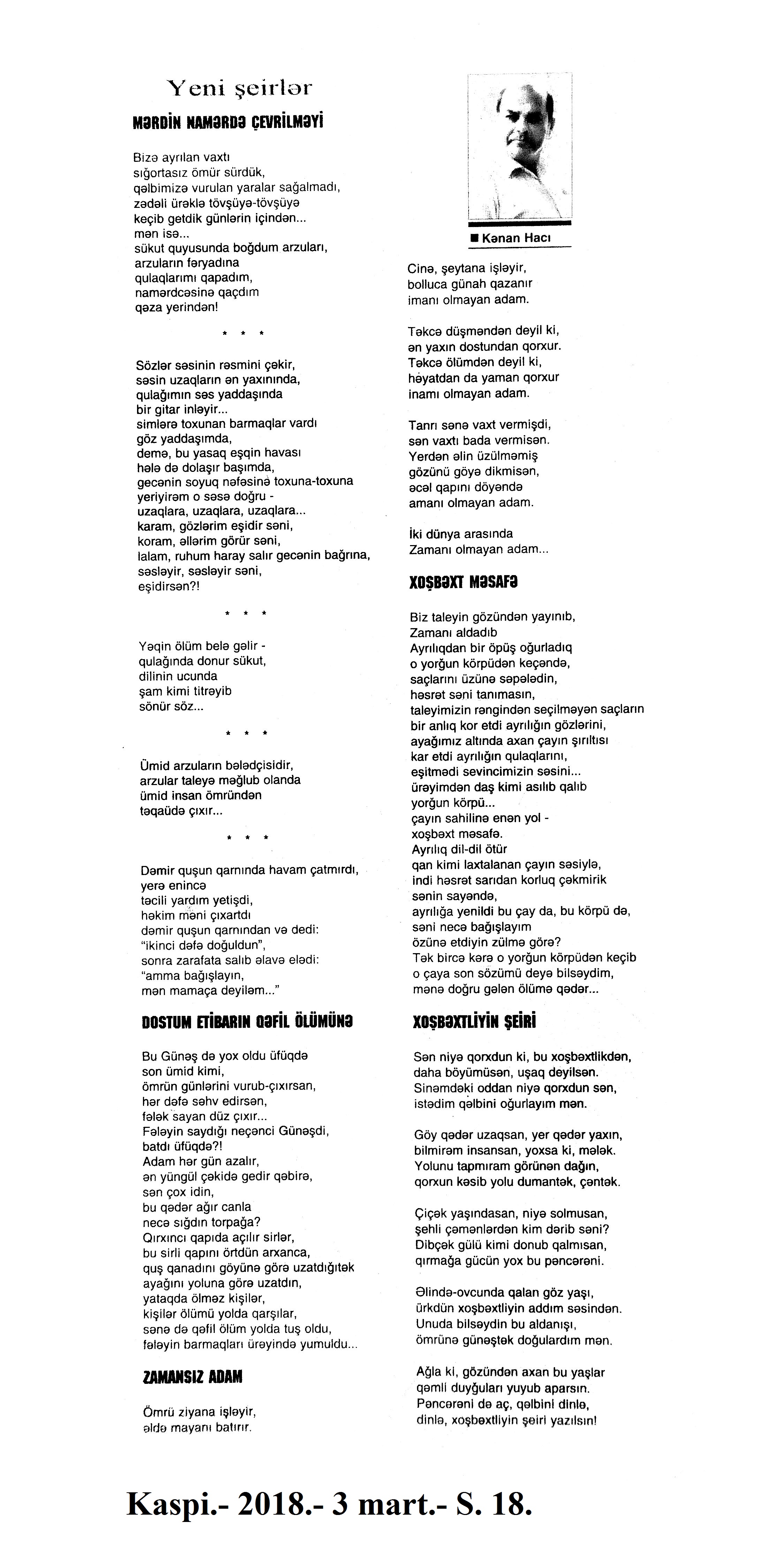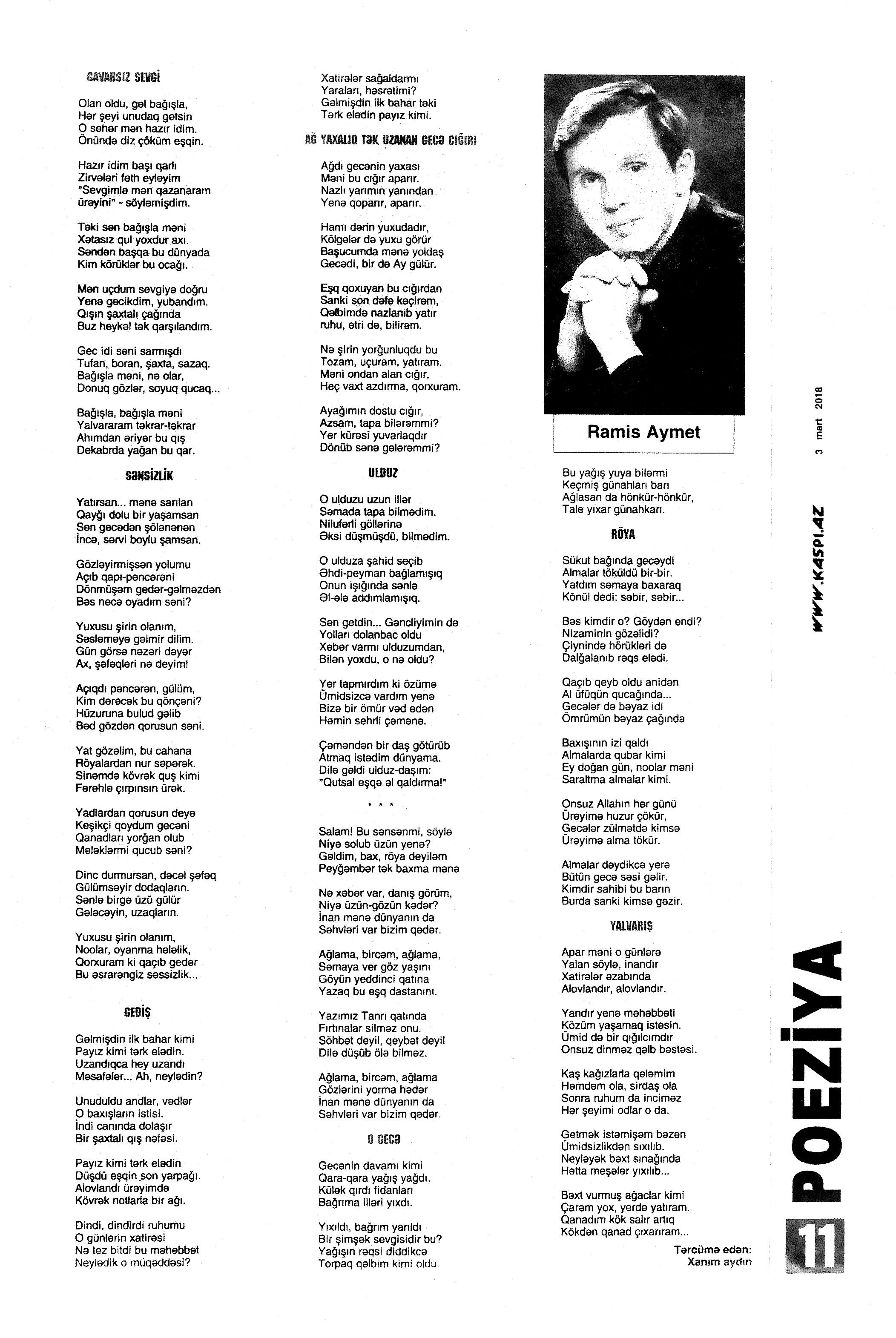 BƏDİİ ƏDƏBİYYAT VƏ ƏDƏBİYYATŞÜNASLIQ ŞEİRLƏR 563. Abbas, S. Hər yerdə səhəri yaz açdı bu gün //Ədəbiyyat qəzeti.- 2018.- 17 mart.- S.21.; Kredo.- 2018.- 15 mart.- S.2. 564. Abiyeva, K. Yağış; Məktəb illəri... //Ədalət.-2018.- 8 mart.- S.6. 565. Ağa, A. Bayraq şəkli; Uşaq dükanı; Ləpir və s. //Ədəbiyyat qəzeti.- 2018.- 17 mart.- S.9. 566. Ağasəfa.. Nə zəvvaram, nə hacıyam...; Doğulsaydı o dahi...; Bir başqa cürə; Bəsdir; Güclü //Ədəbiyyat qəzeti.- 2018.- 17 mart.- S.29. 567. Aslanxanlı, M. İşıq da gözümdə adi su kimi...; Dağlara söykənər bir el birliyi...; Bu yolda; Xəyalım süzüb gedir...; Buludlara çilənən...; Gör nə çətinlikdə; Əriyib yox olmaq...; Ömrü qatam... //Ədəbiyyat qəzeti.- 2018.- 3 mart.- S.29. 568. Ay, A. Bir də o balaca damlar var e...; Nə gözəl dərd çəkirəm...; Yolçu... //Ədəbiyyat qəzeti.- 2018.- 3 mart.- S.32. 569. Aymet, R. Cavabsız sevgi; Sənsizlik; Ulduz və s. [tatar dilindən tərcümə] /tərc.etdi Xanım Aydın //Kaspi.-2018.- 3 mart.- S.11. 570. Cavadov, S. Sevənlərə hədiyyə //Azərbaycan.- 2018.- 8 mart.- S.12. 571. Cəfərli, F. Günəş məhkumu; Nəfəsi kəsilmiş otel otaqları; İndi susmaq öldürür; Sobasına sevgi atanlar; Baxışların tutur məni; İliyinə kimi oxu //Ədəbiyyat qəzeti.- 2018.- 31 mart.- S.9. 572. Cəfərov, M. Bir mənzum məktuba cavab //525-ci qəzet.-2018.- 17 mart- S.12. 573. Çərkəz, S. Elə rəssam ki...; Yaxşıların üzünə; Professor: Ədibə xanım Paşayevaya; Yağış yağır və s. //Ədalət.- 2018.- 31 mart.- S.14.