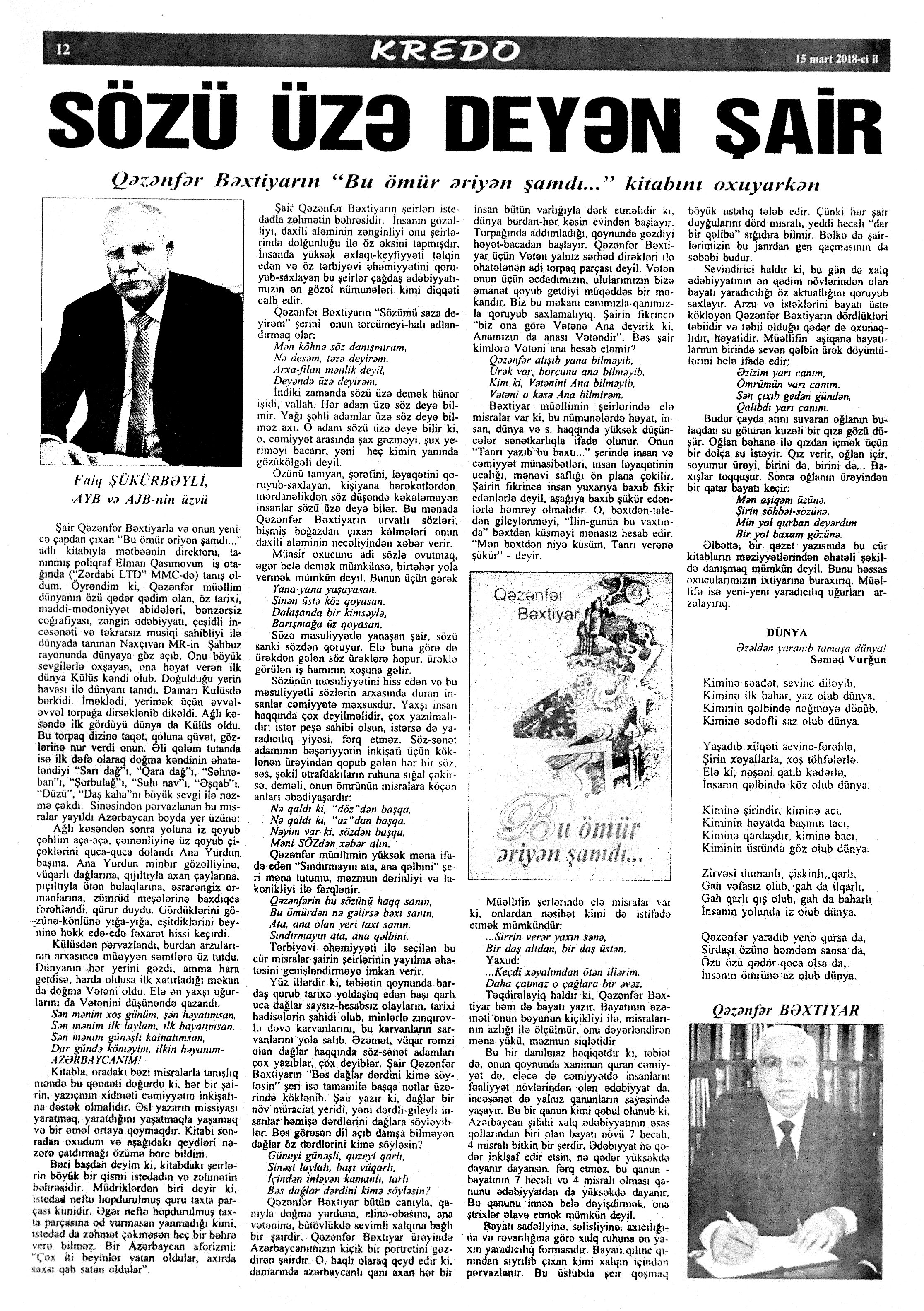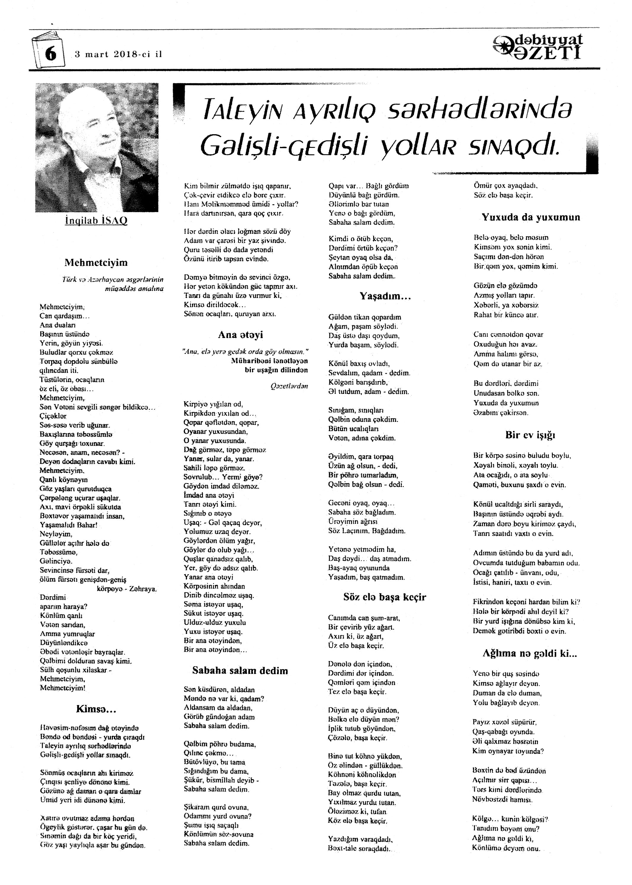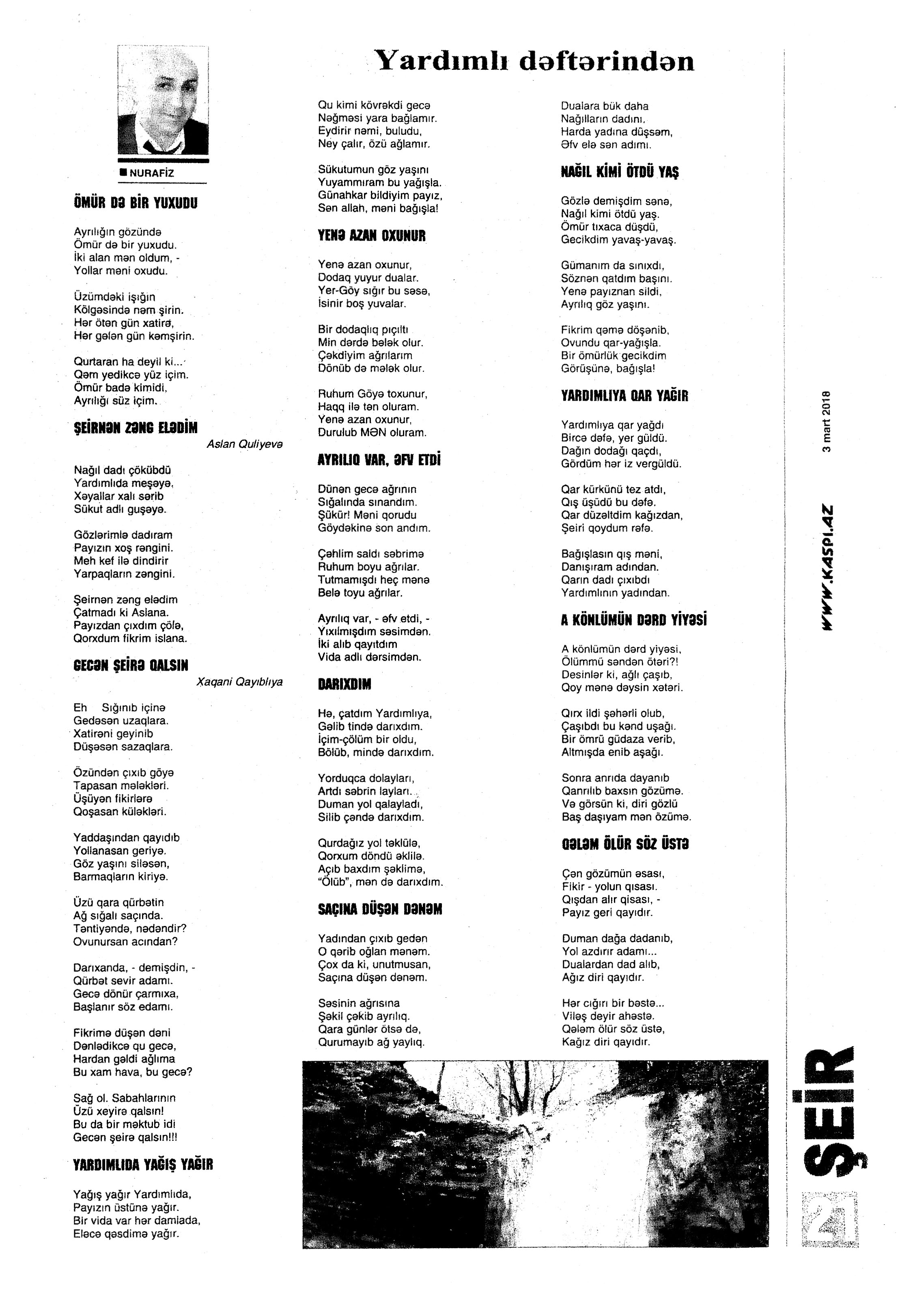 BƏDİİ ƏDƏBİYYAT VƏ ƏDƏBİYYATŞÜNASLIQ ŞEİRLƏR 563. Abbas, S. Hər yerdə səhəri yaz açdı bu gün //Ədəbiyyat qəzeti.- 2018.- 17 mart.- S.21.; Kredo.- 2018.- 15 mart.- S.2. 564. Abiyeva, K. Yağış; Məktəb illəri... //Ədalət.-2018.- 8 mart.- S.6. 565. Ağa, A. Bayraq şəkli; Uşaq dükanı; Ləpir və s. //Ədəbiyyat qəzeti.- 2018.- 17 mart.- S.9. 566. Ağasəfa.. Nə zəvvaram, nə hacıyam...; Doğulsaydı o dahi...; Bir başqa cürə; Bəsdir; Güclü //Ədəbiyyat qəzeti.- 2018.- 17 mart.- S.29. 567. Aslanxanlı, M. İşıq da gözümdə adi su kimi...; Dağlara söykənər bir el birliyi...; Bu yolda; Xəyalım süzüb gedir...; Buludlara çilənən...; Gör nə çətinlikdə; Əriyib yox olmaq...; Ömrü qatam... //Ədəbiyyat qəzeti.- 2018.- 3 mart.- S.29. 568. Ay, A. Bir də o balaca damlar var e...; Nə gözəl dərd çəkirəm...; Yolçu... //Ədəbiyyat qəzeti.- 2018.- 3 mart.- S.32. 569. Aymet, R. Cavabsız sevgi; Sənsizlik; Ulduz və s. [tatar dilindən tərcümə] /tərc.etdi Xanım Aydın //Kaspi.-2018.- 3 mart.- S.11. 570. Cavadov, S. Sevənlərə hədiyyə //Azərbaycan.- 2018.- 8 mart.- S.12. 571. Cəfərli, F. Günəş məhkumu; Nəfəsi kəsilmiş otel otaqları; İndi susmaq öldürür; Sobasına sevgi atanlar; Baxışların tutur məni; İliyinə kimi oxu //Ədəbiyyat qəzeti.- 2018.- 31 mart.- S.9. 572. Cəfərov, M. Bir mənzum məktuba cavab //525-ci qəzet.-2018.- 17 mart- S.12. 573. Çərkəz, S. Elə rəssam ki...; Yaxşıların üzünə; Professor: Ədibə xanım Paşayevaya; Yağış yağır və s. //Ədalət.- 2018.- 31 mart.- S.14.