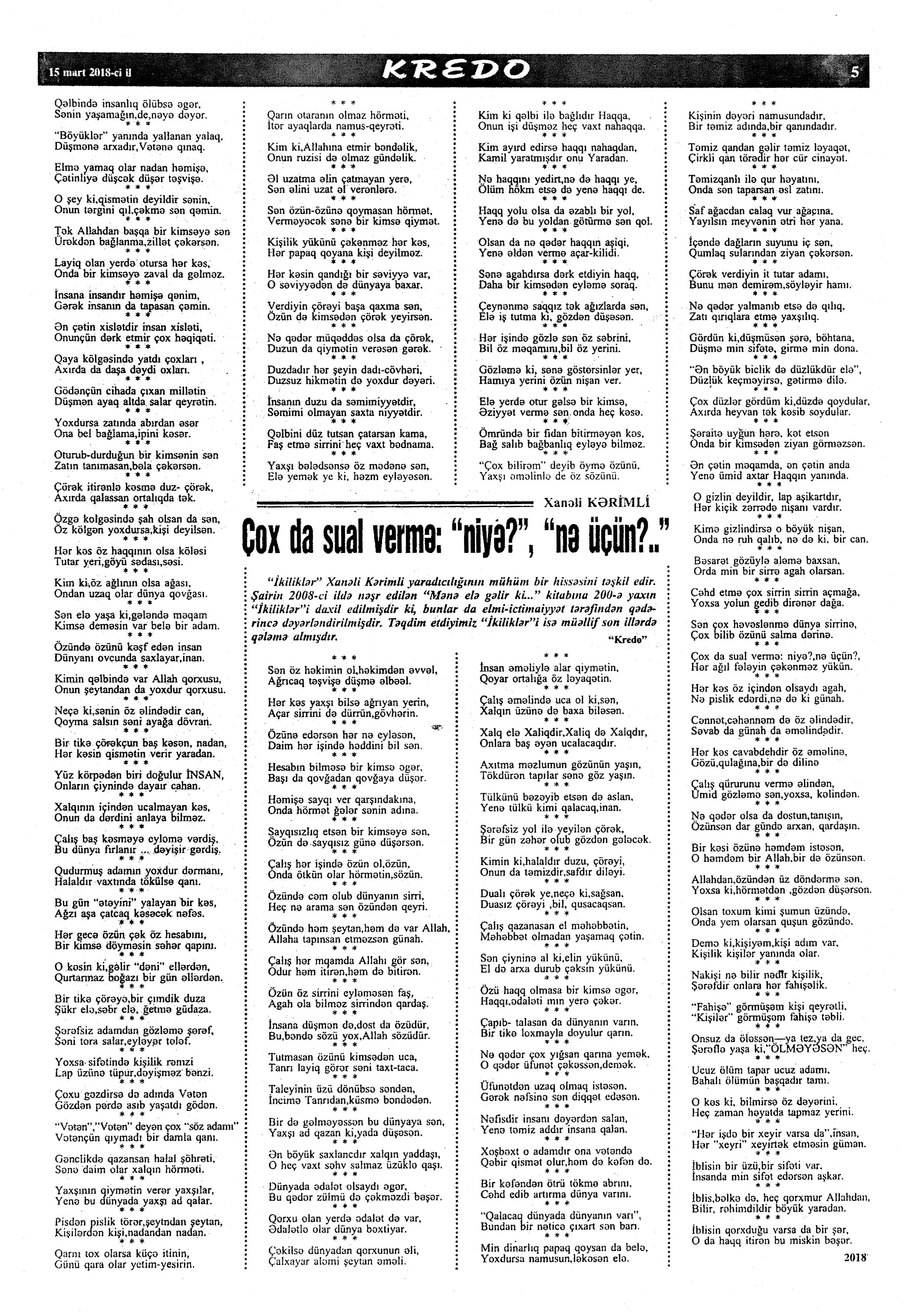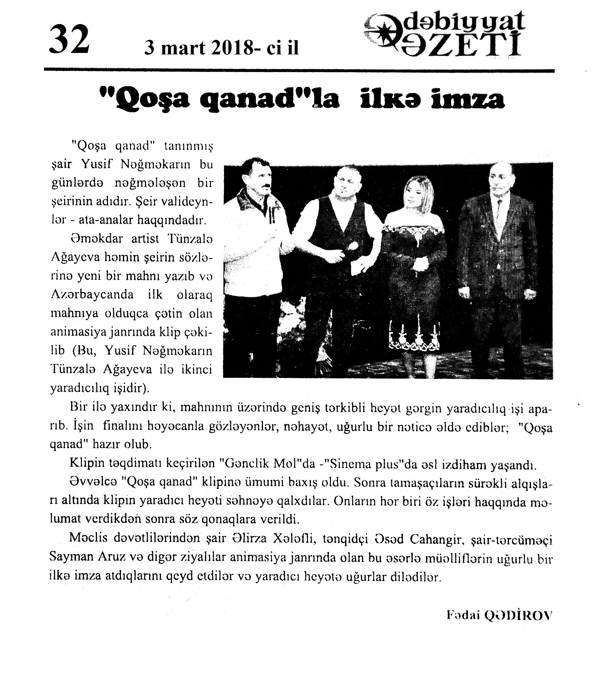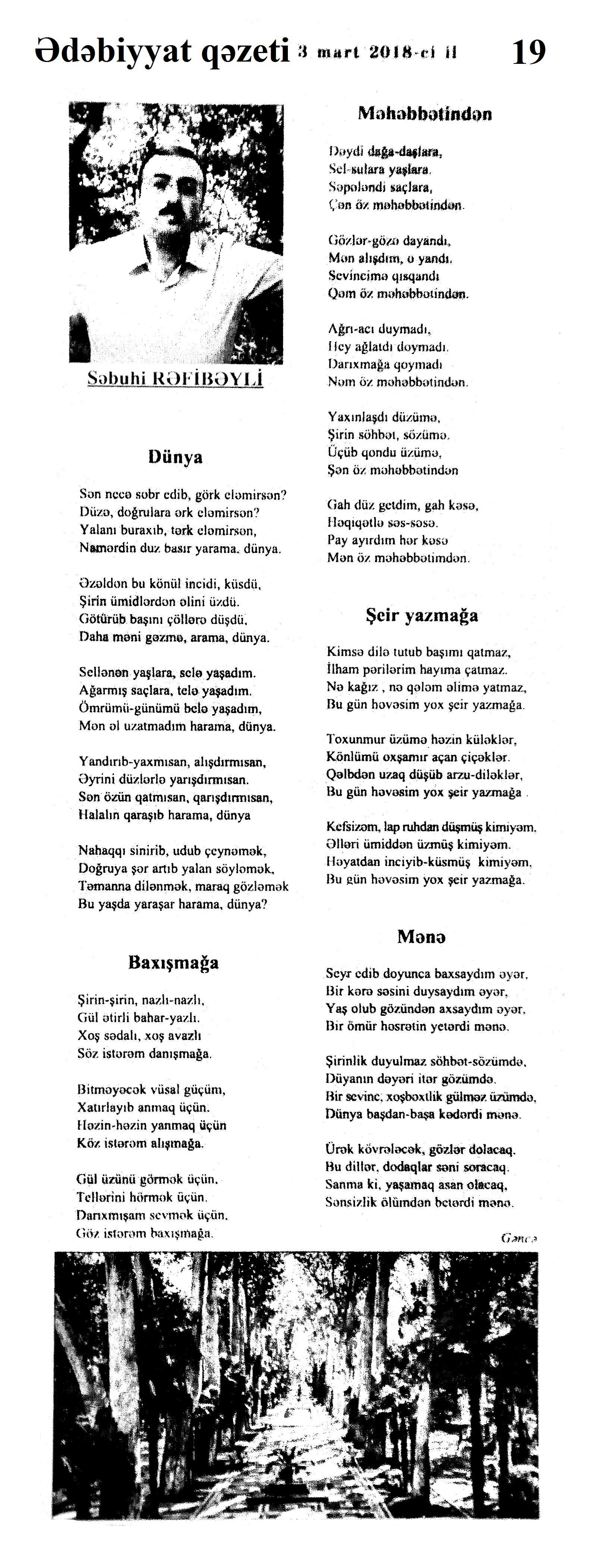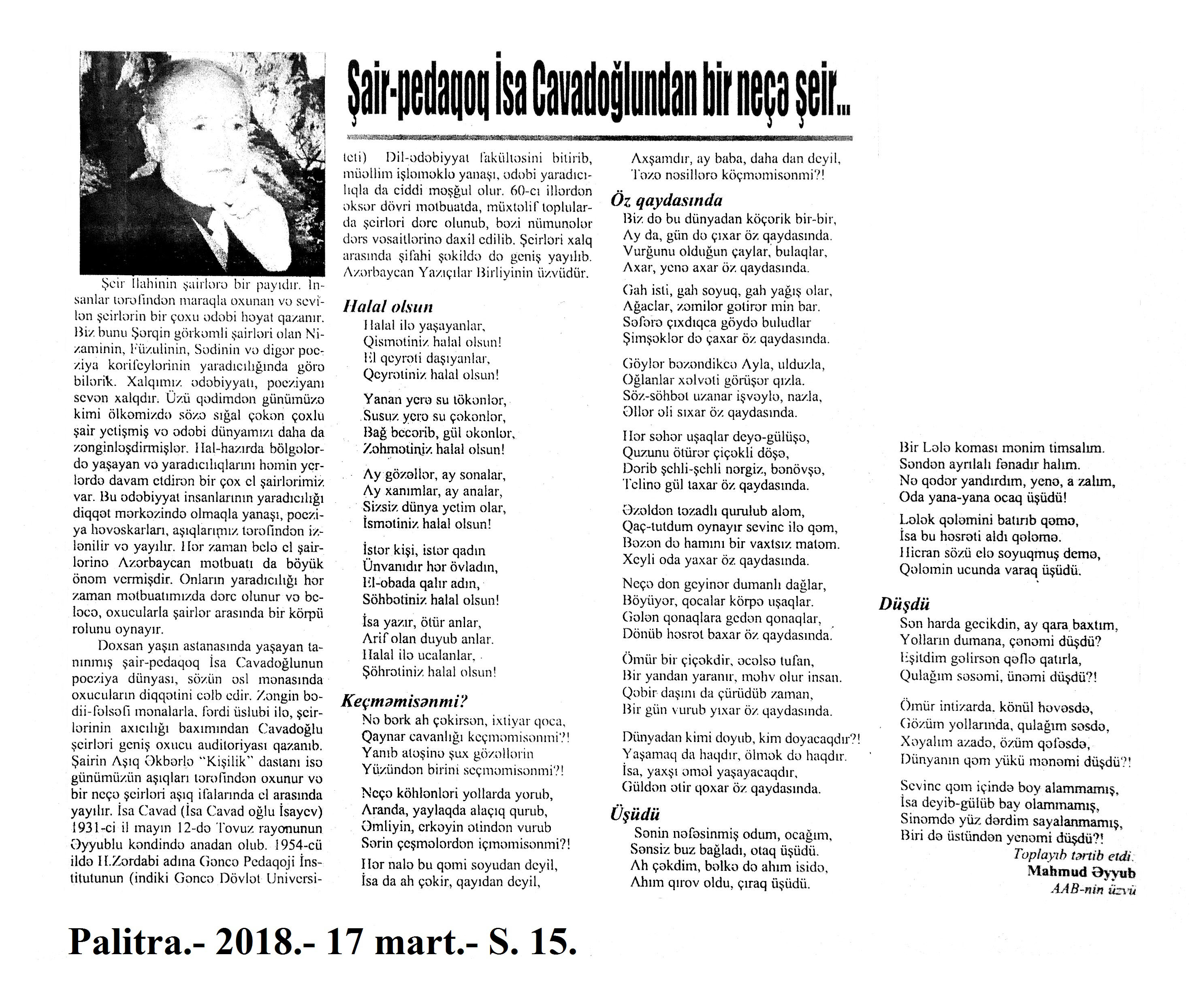 BƏDİİ ƏDƏBİYYAT VƏ ƏDƏBİYYATŞÜNASLIQ ŞEİRLƏR 563. Abbas, S. Hər yerdə səhəri yaz açdı bu gün //Ədəbiyyat qəzeti.- 2018.- 17 mart.- S.21.; Kredo.- 2018.- 15 mart.- S.2. 564. Abiyeva, K. Yağış; Məktəb illəri... //Ədalət.-2018.- 8 mart.- S.6. 565. Ağa, A. Bayraq şəkli; Uşaq dükanı; Ləpir və s. //Ədəbiyyat qəzeti.- 2018.- 17 mart.- S.9. 566. Ağasəfa.. Nə zəvvaram, nə hacıyam...; Doğulsaydı o dahi...; Bir başqa cürə; Bəsdir; Güclü //Ədəbiyyat qəzeti.- 2018.- 17 mart.- S.29. 567. Aslanxanlı, M. İşıq da gözümdə adi su kimi...; Dağlara söykənər bir el birliyi...; Bu yolda; Xəyalım süzüb gedir...; Buludlara çilənən...; Gör nə çətinlikdə; Əriyib yox olmaq...; Ömrü qatam... //Ədəbiyyat qəzeti.- 2018.- 3 mart.- S.29. 568. Ay, A. Bir də o balaca damlar var e...; Nə gözəl dərd çəkirəm...; Yolçu... //Ədəbiyyat qəzeti.- 2018.- 3 mart.- S.32. 569. Aymet, R. Cavabsız sevgi; Sənsizlik; Ulduz və s. [tatar dilindən tərcümə] /tərc.etdi Xanım Aydın //Kaspi.-2018.- 3 mart.- S.11. 570. Cavadov, S. Sevənlərə hədiyyə //Azərbaycan.- 2018.- 8 mart.- S.12. 571. Cəfərli, F. Günəş məhkumu; Nəfəsi kəsilmiş otel otaqları; İndi susmaq öldürür; Sobasına sevgi atanlar; Baxışların tutur məni; İliyinə kimi oxu //Ədəbiyyat qəzeti.- 2018.- 31 mart.- S.9. 572. Cəfərov, M. Bir mənzum məktuba cavab //525-ci qəzet.-2018.- 17 mart- S.12. 573. Çərkəz, S. Elə rəssam ki...; Yaxşıların üzünə; Professor: Ədibə xanım Paşayevaya; Yağış yağır və s. //Ədalət.- 2018.- 31 mart.- S.14.