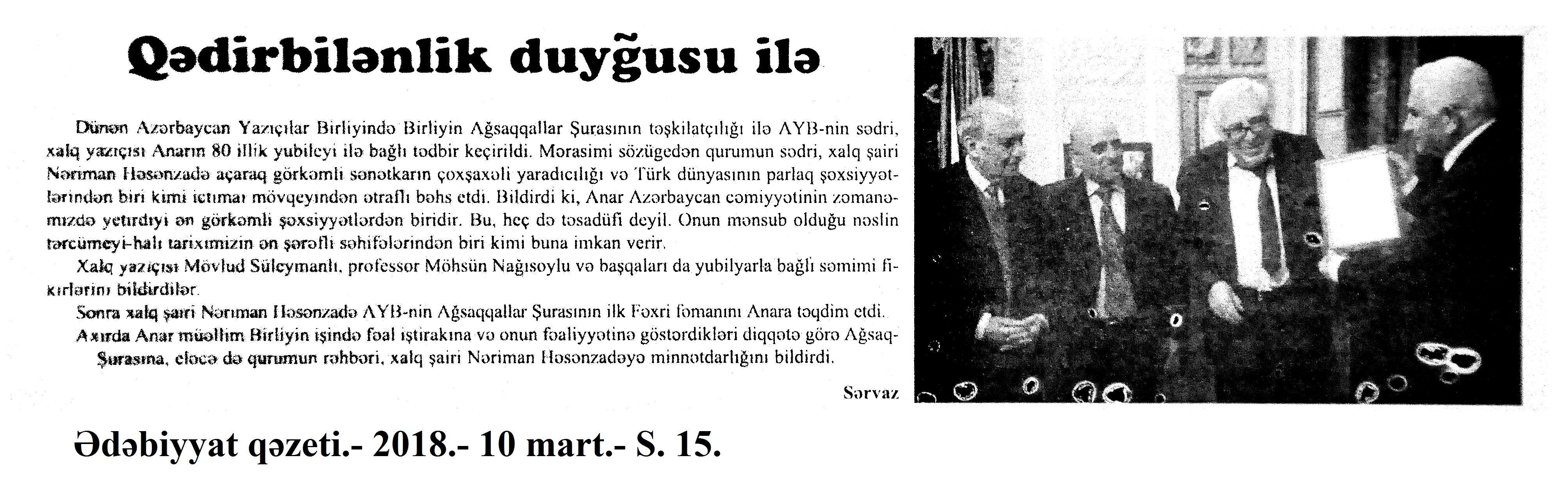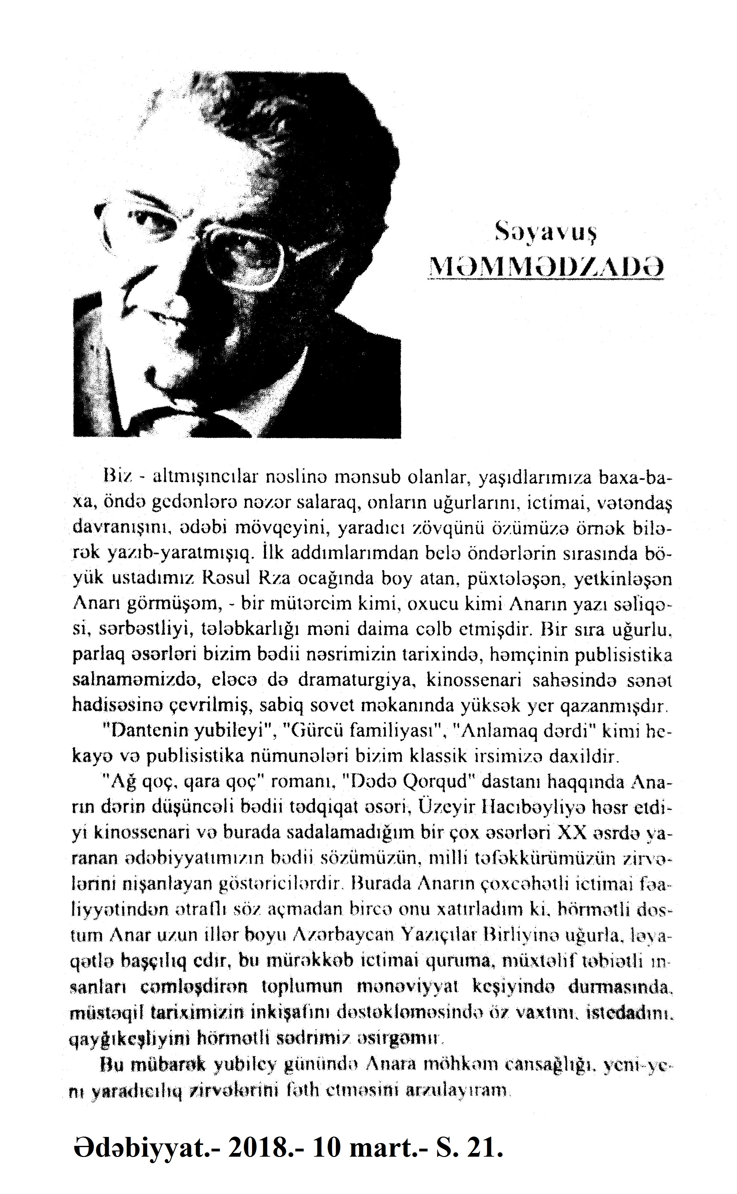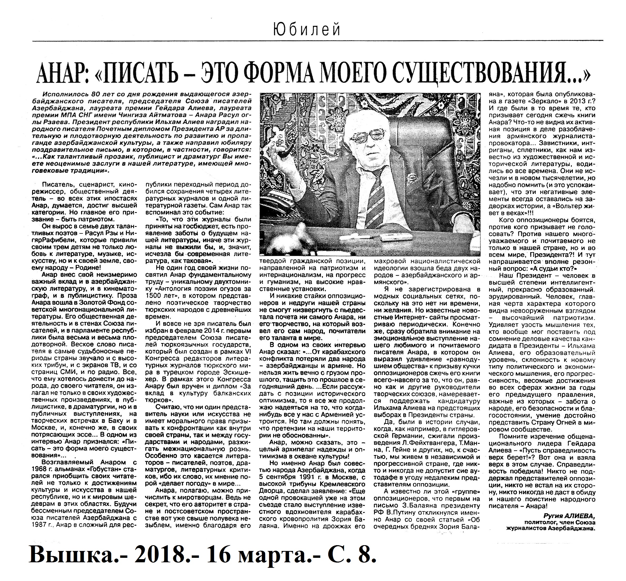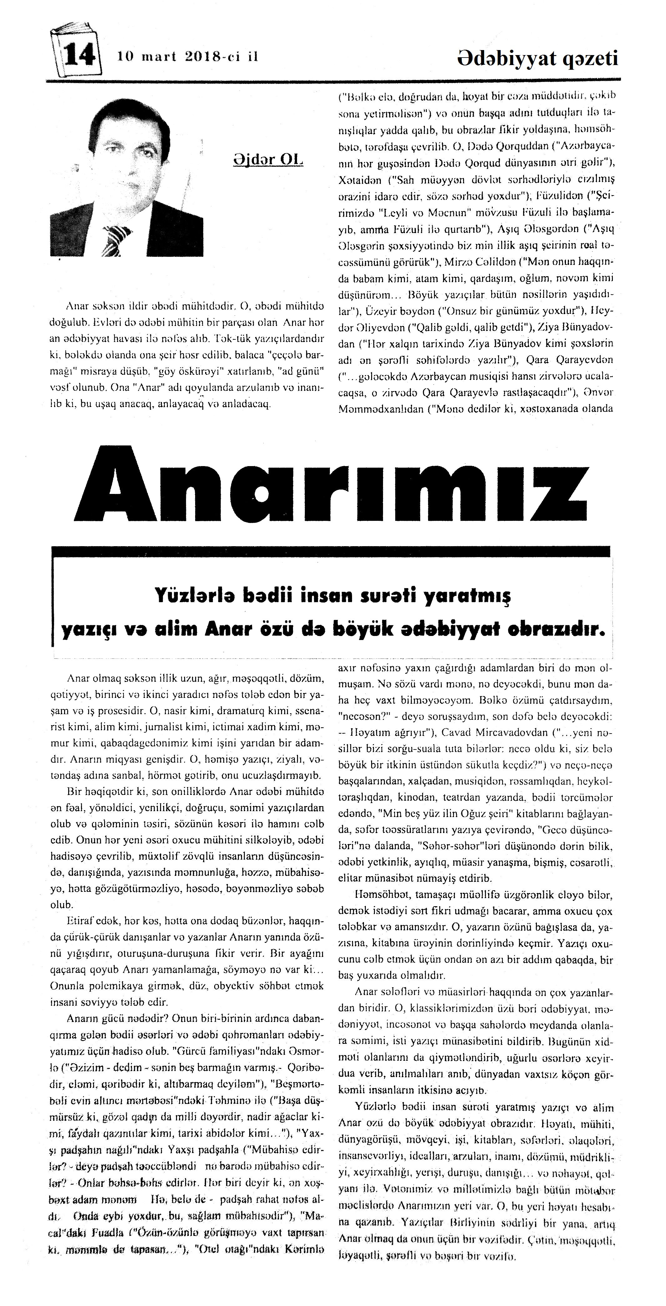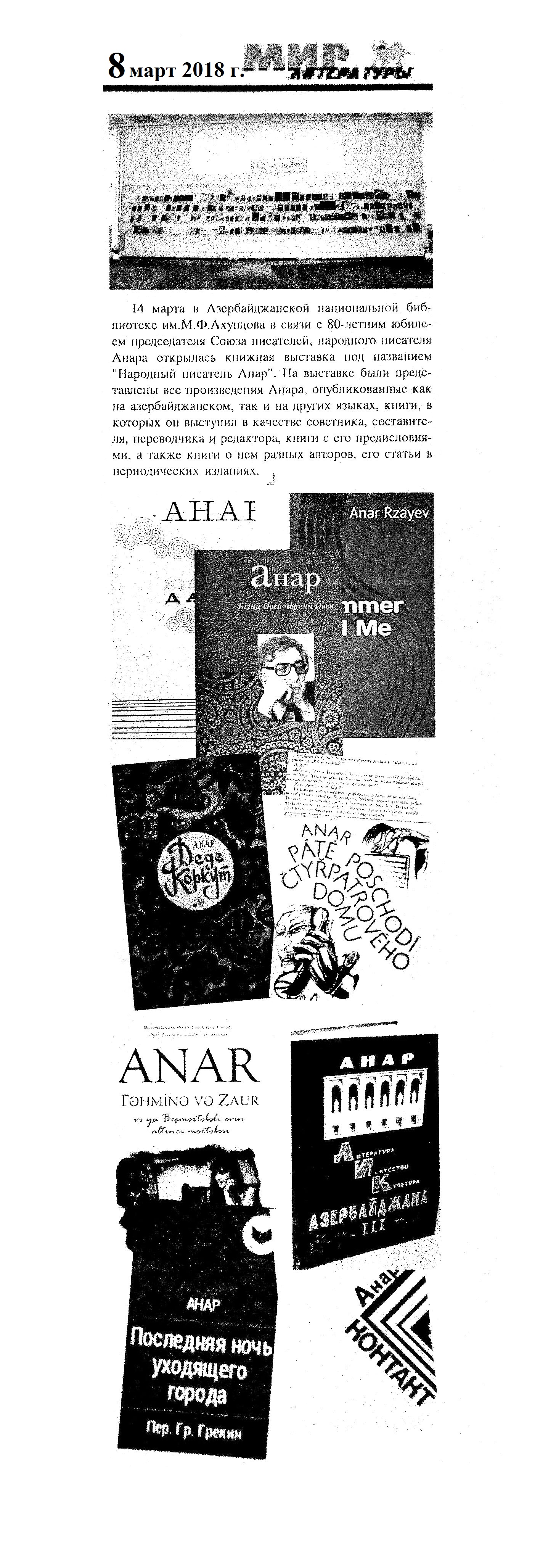 Анар – 80 1188. Алиев, И. Председателю Союза писателей Азербайджана народному писателю Анару //Бакинский рабочий.-2018.-14 марта.- С.2. 1189. Алиева, М. Народному писателю, председателю Союза писателей Азербайджана господину Анару Рзаеву //Бакинский рабочий.-2018.-16 марта.- С.6. 1190. Алиева, Р. Анар: «Писать - это форма моего существования...» //Вышка.-2018.-16 марта.- С.8. 1191. Анар: Книжная выставка в Азербайджанской Национальной Библиотеке имени М.Ф.Ахундова //Мир литературы.-2018.-№ 3(127) март.- С.8. 1192. Анар: «Очень хорошо помню тот вечер в Шуше» //Неделя.-2018.-16 марта.- С.18. 1193. Анар. Пессимистическое; Оптимистическое: Стихи //Мир литературы.-2018.-№ 3(127) март.- С.5. 1194. Ахундова, Э. Будучи кадровым чекистом, Гейдар Алиев был человеком, преданным своей нации: Беседа с народным писателем Азербайджана Анаром //Мир литературы.-2018.-№ 3(127) март.- С.6-7. 1195. Ахундова Э. Местодержатель памяти…: К юбилею народного писателя Азербайджана Анара //Каспiй.-2018.-14 марта.- С.8-9. 1196. Багиров, А. Интеллигент мирового масштаба //Мир литературы.-2018.-№ 3(127) март.- С.3. 1197. Бадалбейли, Ф. Анару в день рождения: Стихи //Мир литературы.-2018.-№ 3(127) март.- С.5. 1198. Первый вице-президент Мехрибан Алиева поздравила писателя Анара с 80-летним юбилеем //Бакинский рабочий.-2018.-16 марта.- С.1.