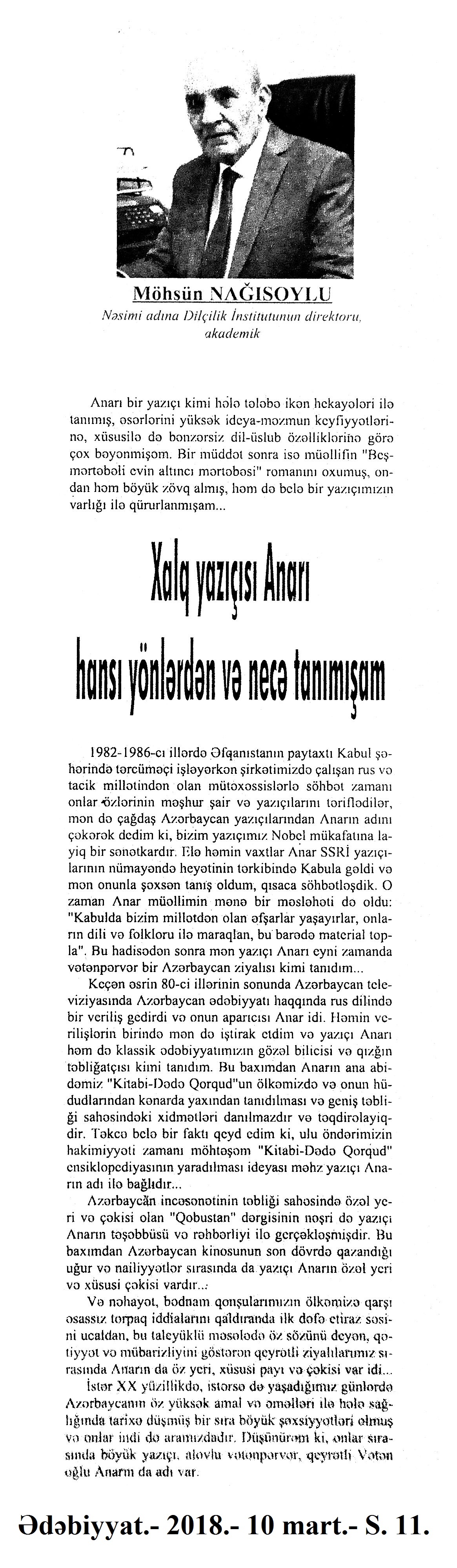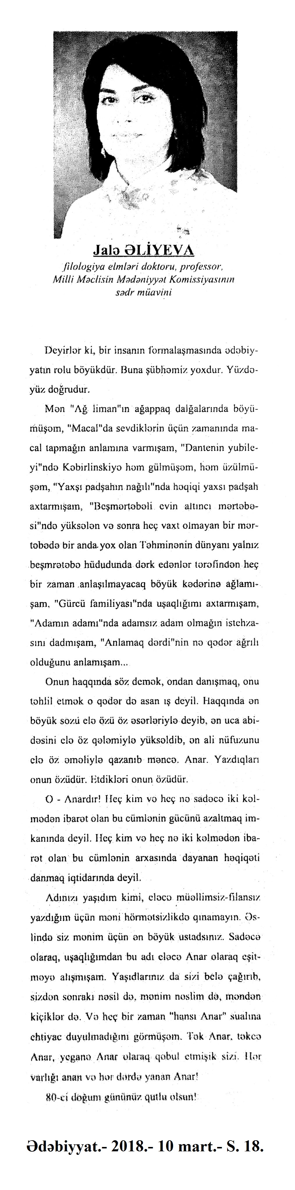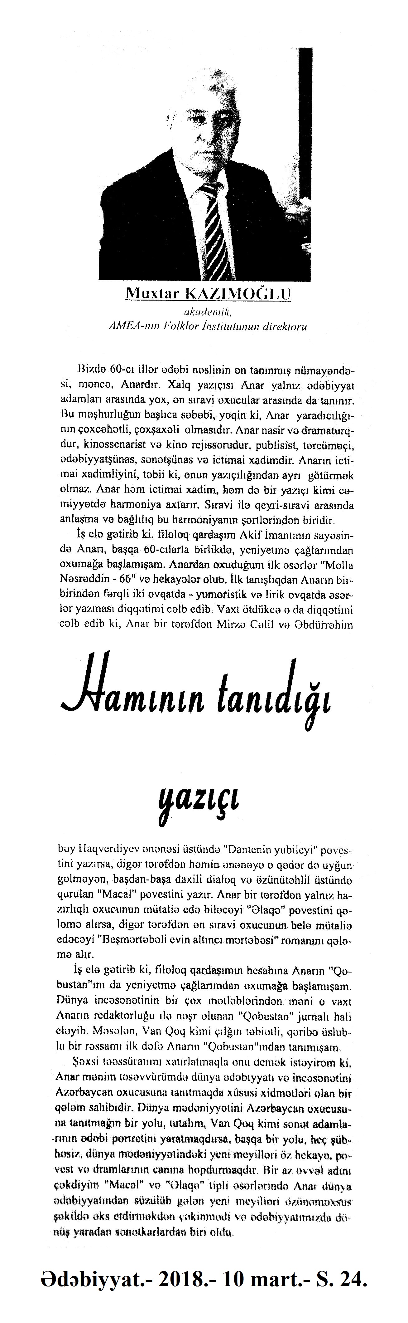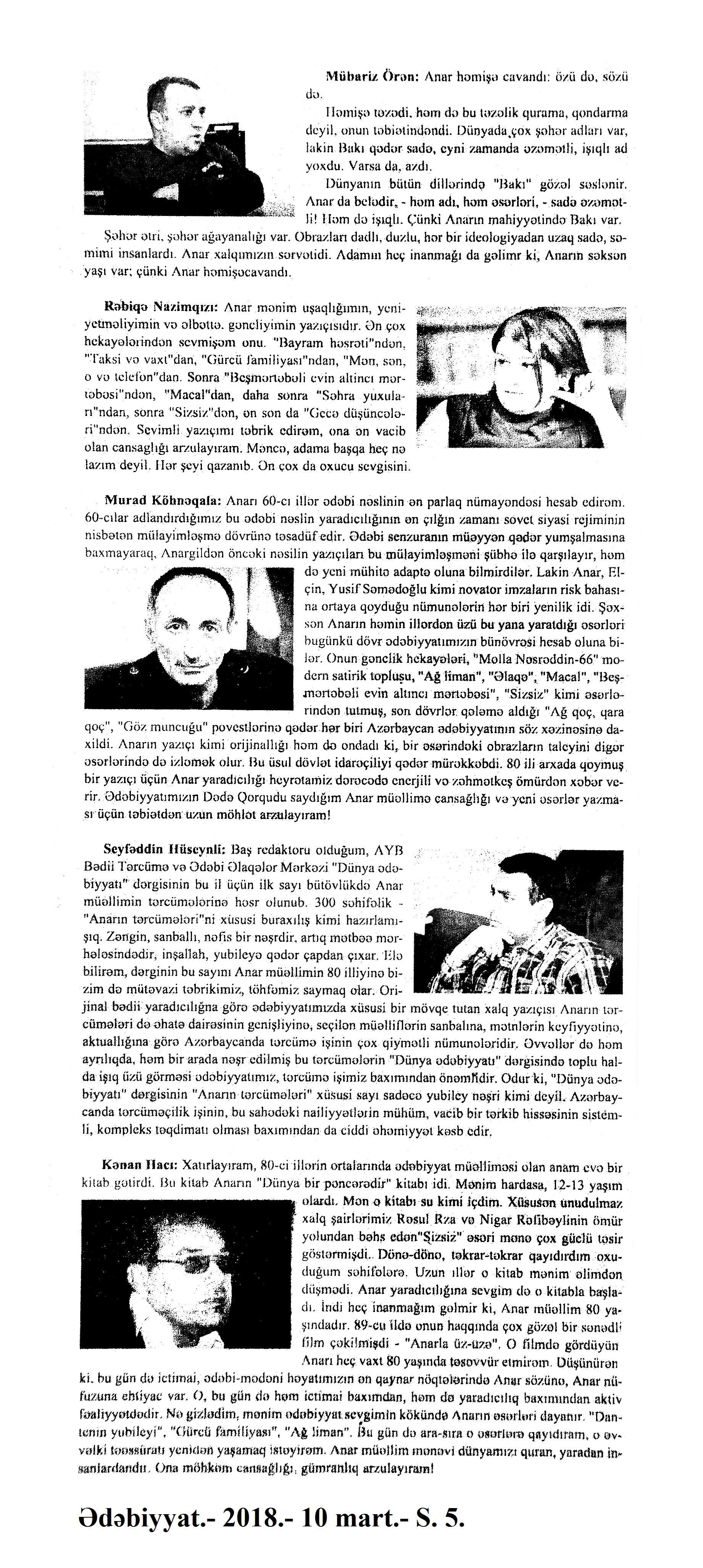 Анар – 80 1188. Алиев, И. Председателю Союза писателей Азербайджана народному писателю Анару //Бакинский рабочий.-2018.-14 марта.- С.2. 1189. Алиева, М. Народному писателю, председателю Союза писателей Азербайджана господину Анару Рзаеву //Бакинский рабочий.-2018.-16 марта.- С.6. 1190. Алиева, Р. Анар: «Писать - это форма моего существования...» //Вышка.-2018.-16 марта.- С.8. 1191. Анар: Книжная выставка в Азербайджанской Национальной Библиотеке имени М.Ф.Ахундова //Мир литературы.-2018.-№ 3(127) март.- С.8. 1192. Анар: «Очень хорошо помню тот вечер в Шуше» //Неделя.-2018.-16 марта.- С.18. 1193. Анар. Пессимистическое; Оптимистическое: Стихи //Мир литературы.-2018.-№ 3(127) март.- С.5. 1194. Ахундова, Э. Будучи кадровым чекистом, Гейдар Алиев был человеком, преданным своей нации: Беседа с народным писателем Азербайджана Анаром //Мир литературы.-2018.-№ 3(127) март.- С.6-7. 1195. Ахундова Э. Местодержатель памяти…: К юбилею народного писателя Азербайджана Анара //Каспiй.-2018.-14 марта.- С.8-9. 1196. Багиров, А. Интеллигент мирового масштаба //Мир литературы.-2018.-№ 3(127) март.- С.3. 1197. Бадалбейли, Ф. Анару в день рождения: Стихи //Мир литературы.-2018.-№ 3(127) март.- С.5. 1198. Первый вице-президент Мехрибан Алиева поздравила писателя Анара с 80-летним юбилеем //Бакинский рабочий.-2018.-16 марта.- С.1.