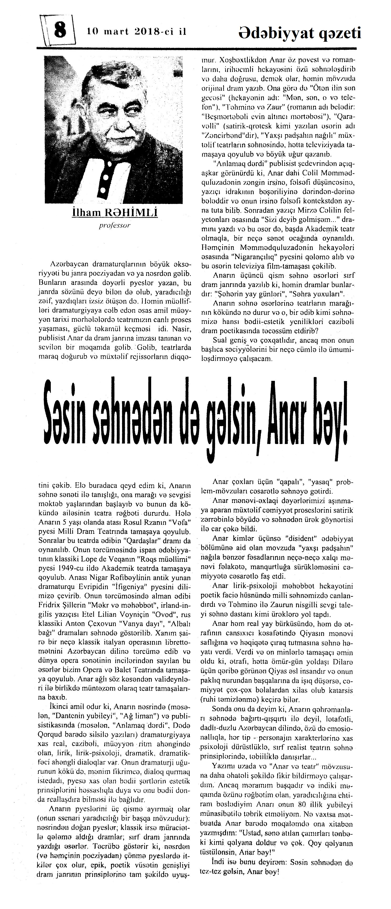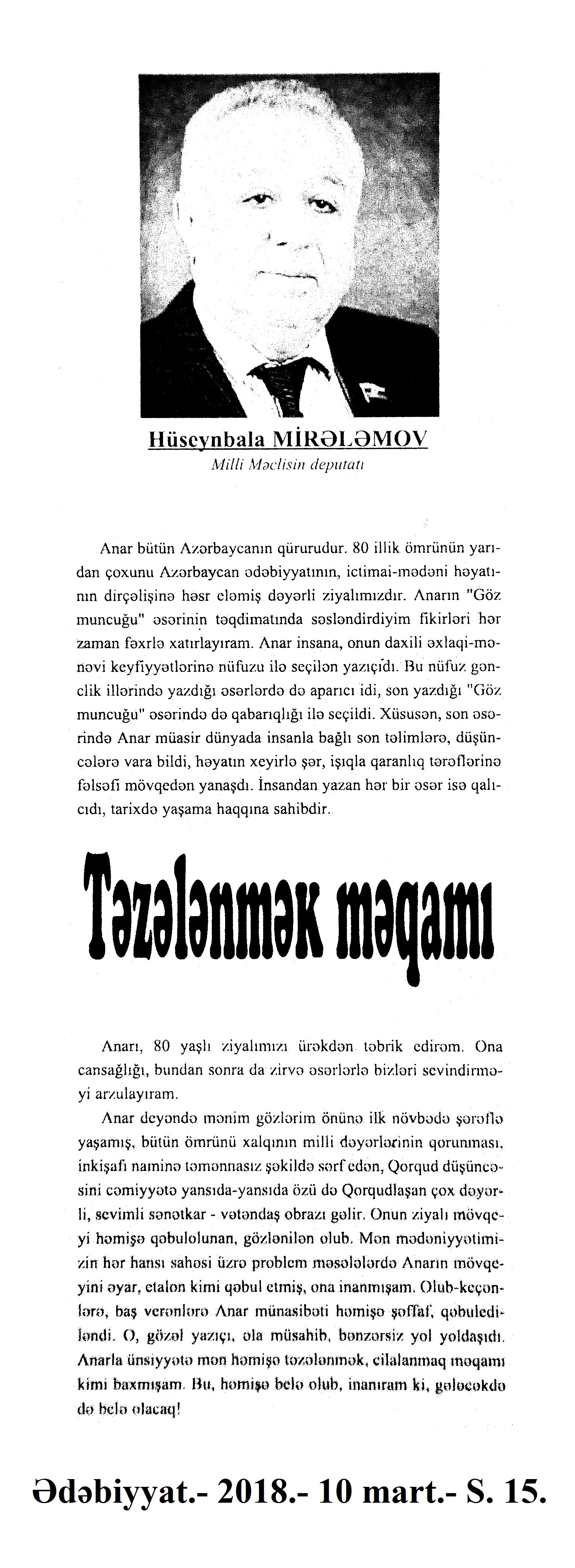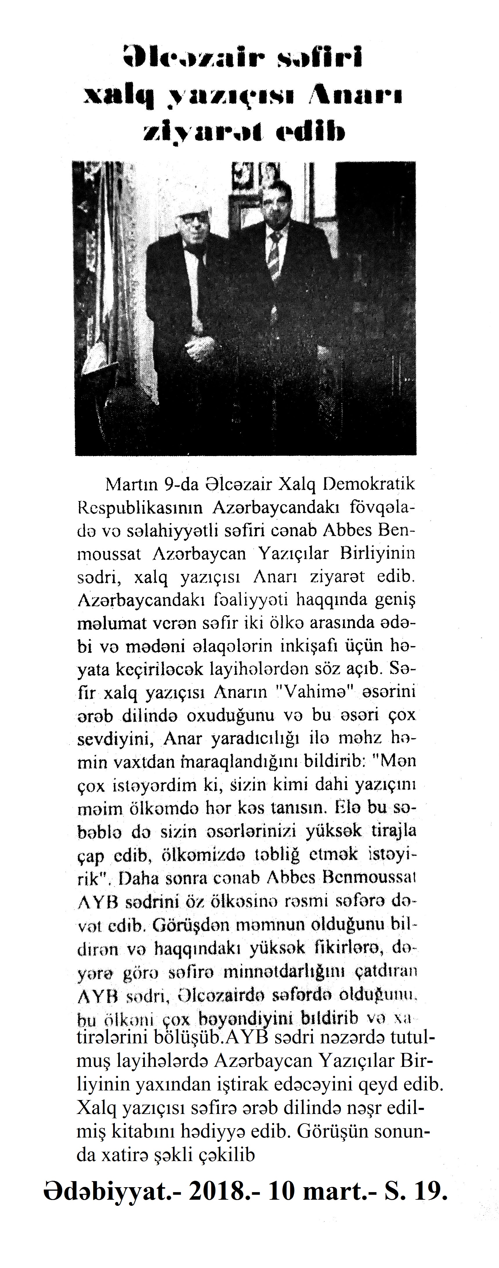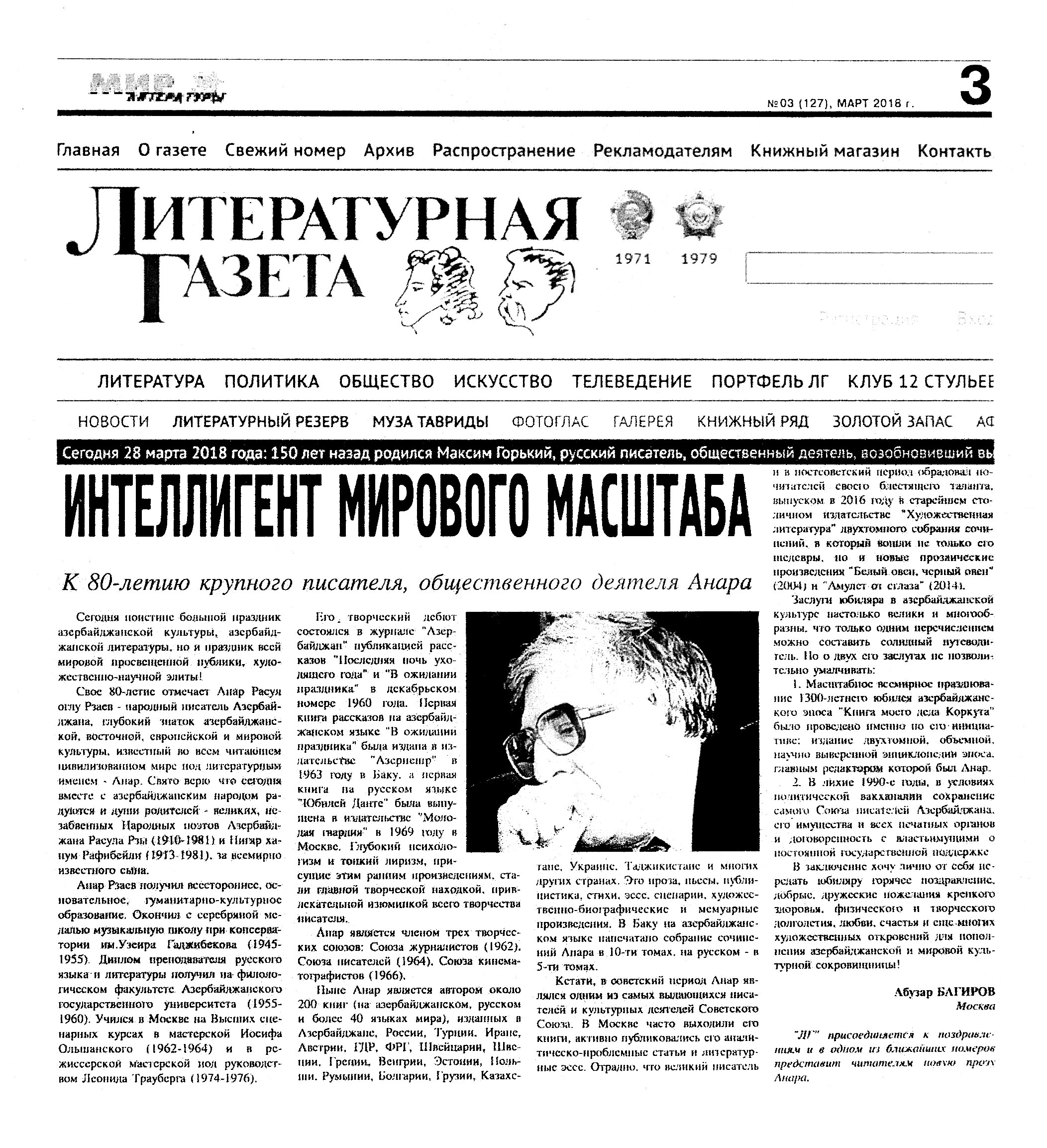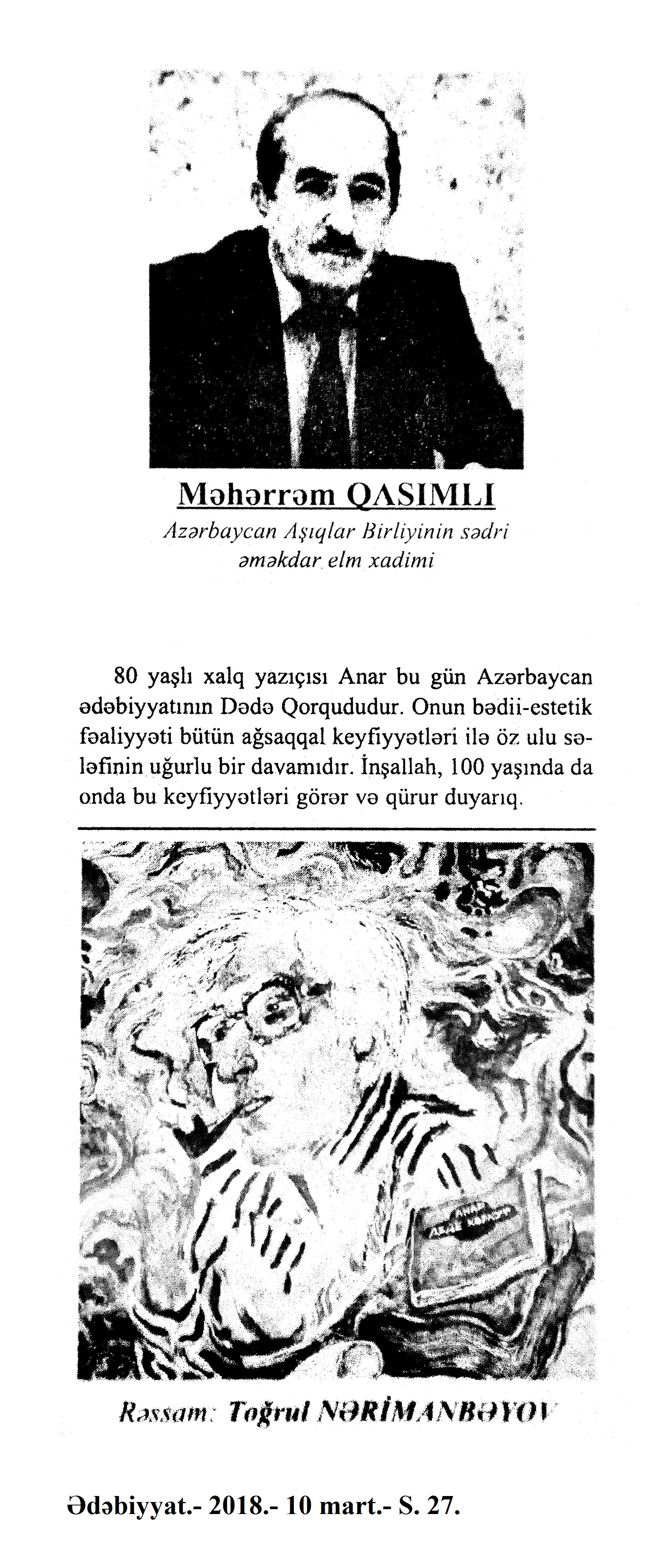 Анар – 80 1188. Алиев, И. Председателю Союза писателей Азербайджана народному писателю Анару //Бакинский рабочий.-2018.-14 марта.- С.2. 1189. Алиева, М. Народному писателю, председателю Союза писателей Азербайджана господину Анару Рзаеву //Бакинский рабочий.-2018.-16 марта.- С.6. 1190. Алиева, Р. Анар: «Писать - это форма моего существования...» //Вышка.-2018.-16 марта.- С.8. 1191. Анар: Книжная выставка в Азербайджанской Национальной Библиотеке имени М.Ф.Ахундова //Мир литературы.-2018.-№ 3(127) март.- С.8. 1192. Анар: «Очень хорошо помню тот вечер в Шуше» //Неделя.-2018.-16 марта.- С.18. 1193. Анар. Пессимистическое; Оптимистическое: Стихи //Мир литературы.-2018.-№ 3(127) март.- С.5. 1194. Ахундова, Э. Будучи кадровым чекистом, Гейдар Алиев был человеком, преданным своей нации: Беседа с народным писателем Азербайджана Анаром //Мир литературы.-2018.-№ 3(127) март.- С.6-7. 1195. Ахундова Э. Местодержатель памяти…: К юбилею народного писателя Азербайджана Анара //Каспiй.-2018.-14 марта.- С.8-9. 1196. Багиров, А. Интеллигент мирового масштаба //Мир литературы.-2018.-№ 3(127) март.- С.3. 1197. Бадалбейли, Ф. Анару в день рождения: Стихи //Мир литературы.-2018.-№ 3(127) март.- С.5. 1198. Первый вице-президент Мехрибан Алиева поздравила писателя Анара с 80-летним юбилеем //Бакинский рабочий.-2018.-16 марта.- С.1.