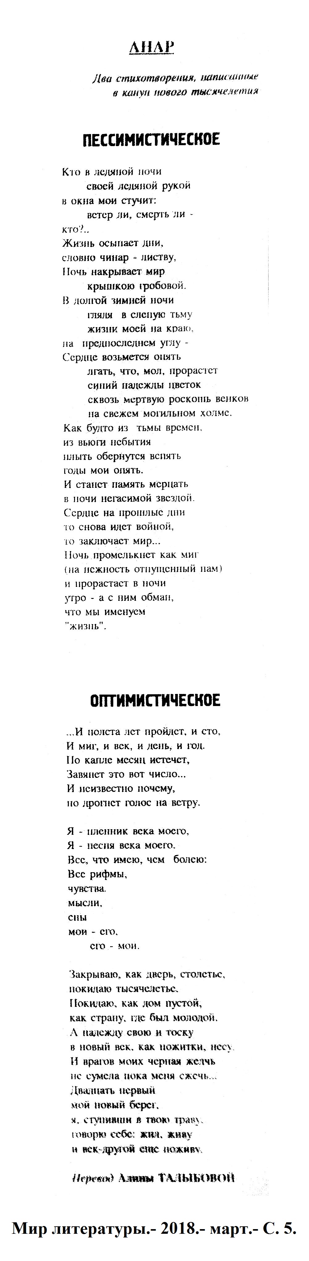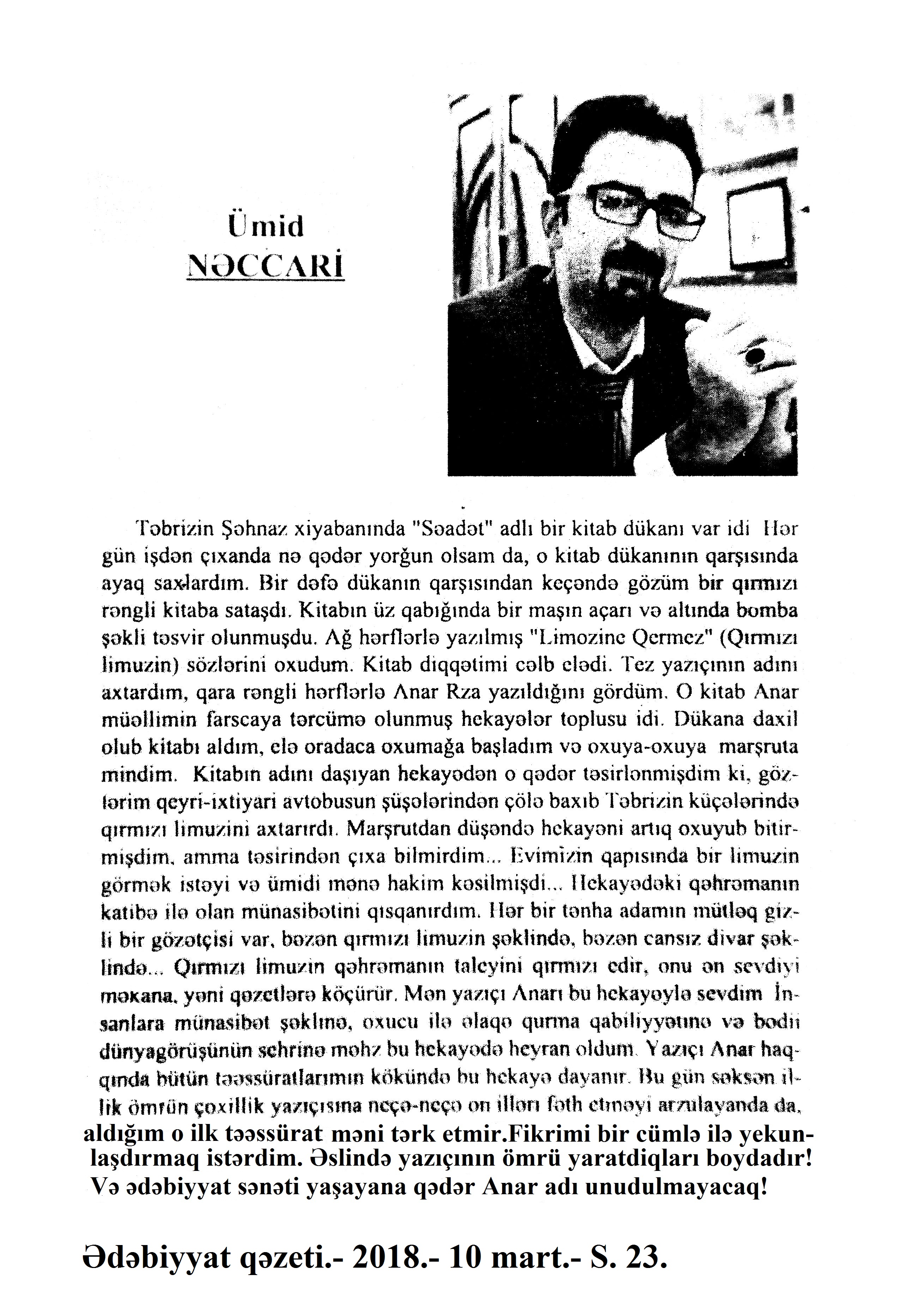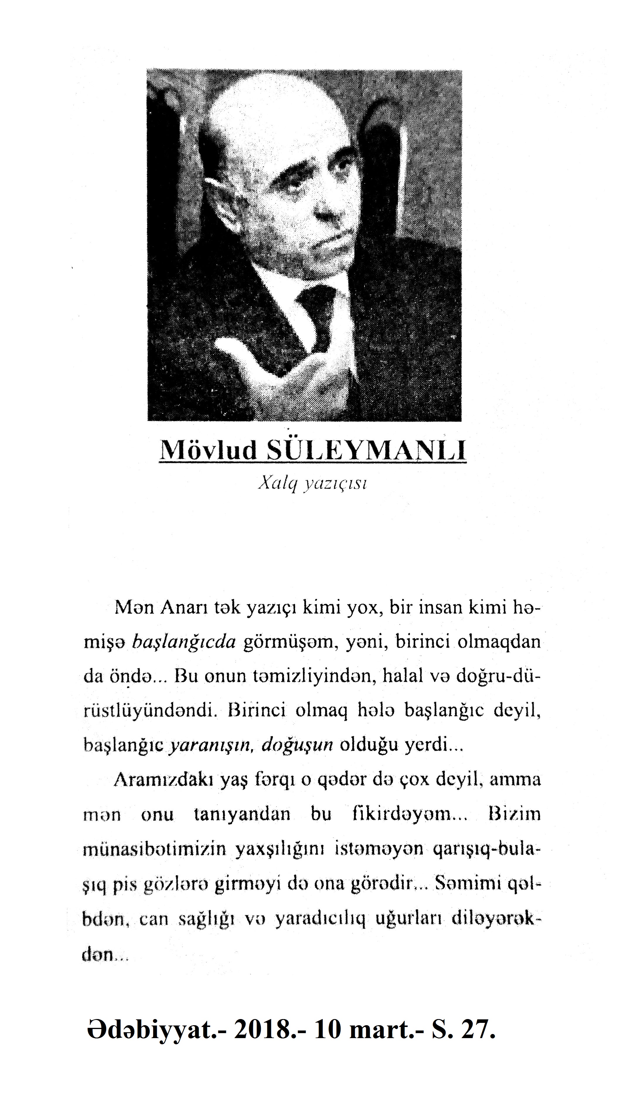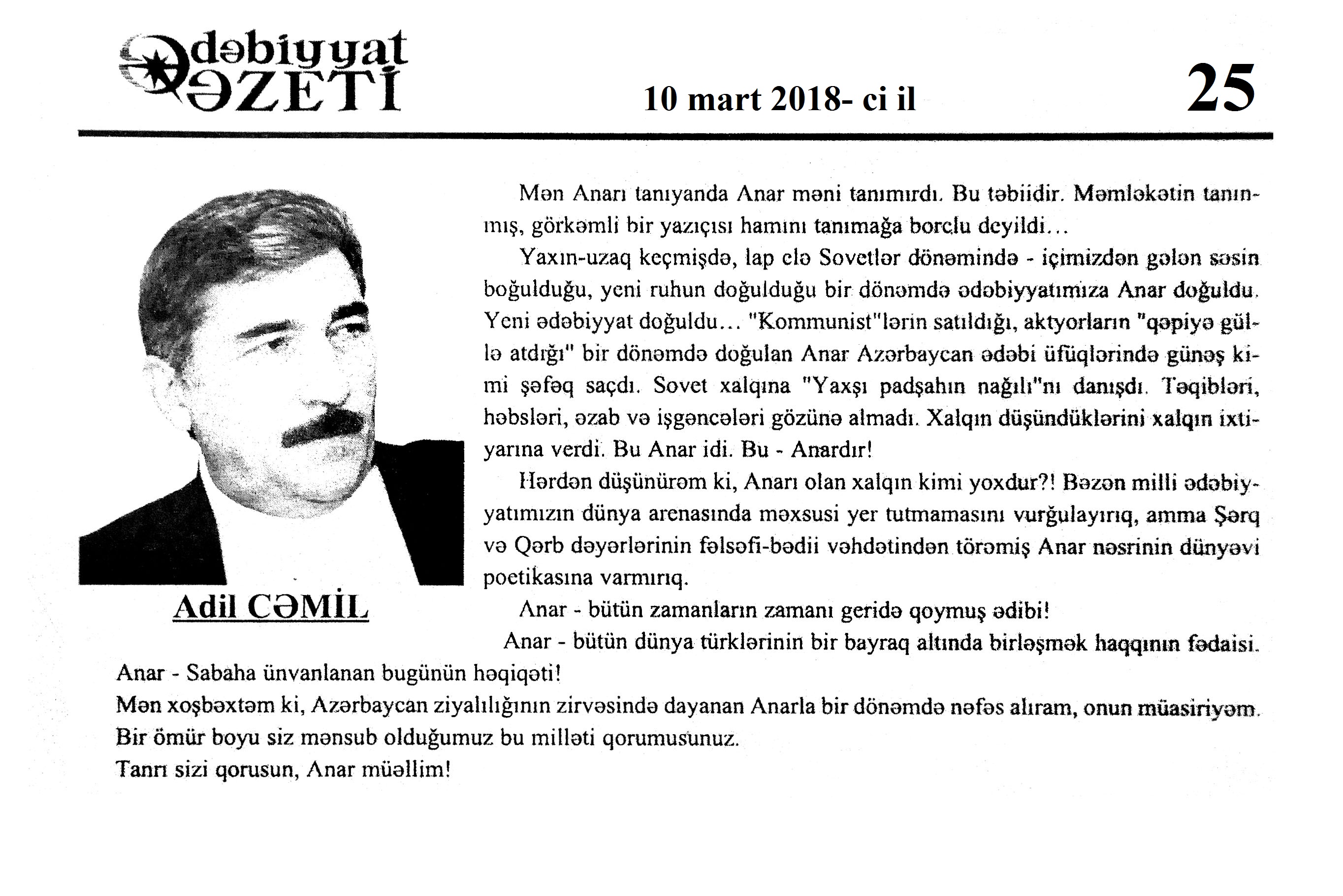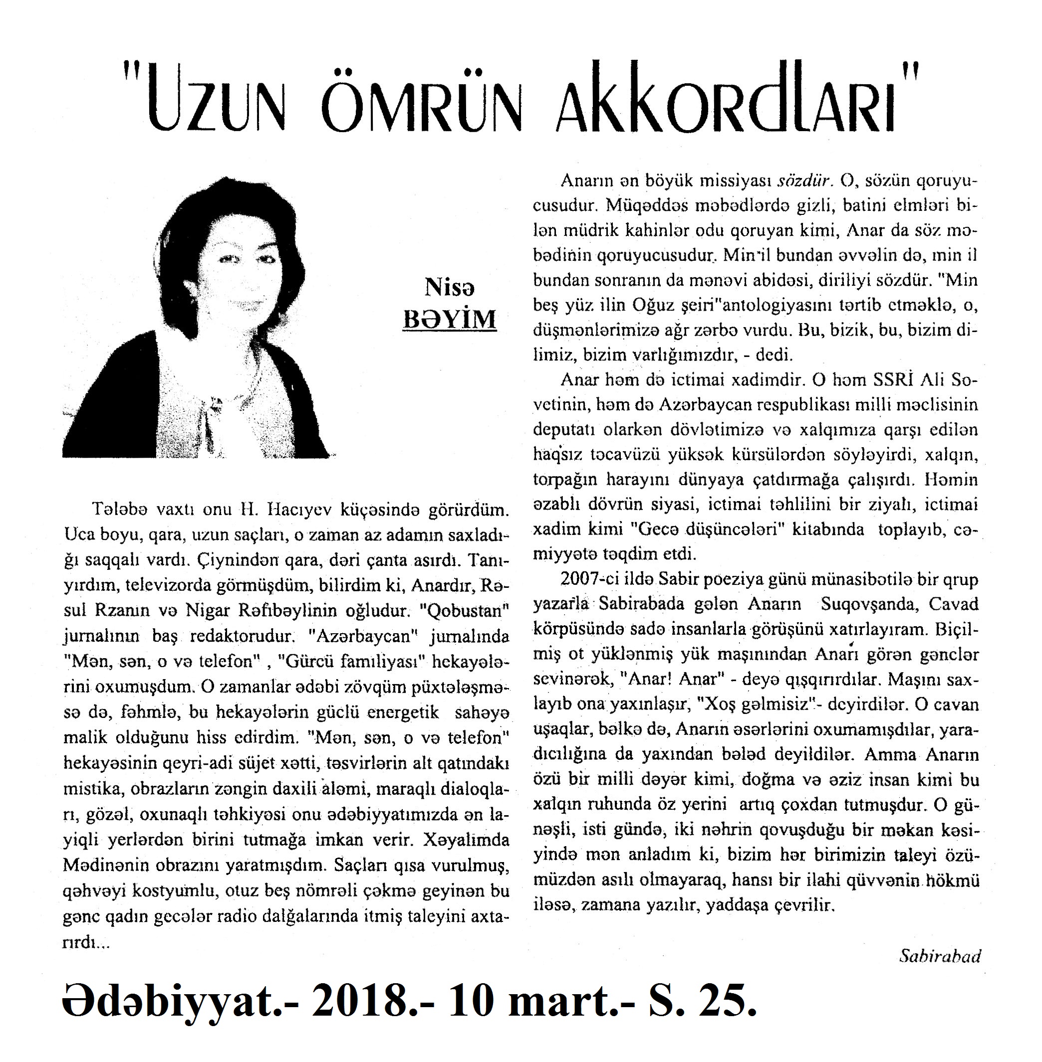 Анар – 80 1188. Алиев, И. Председателю Союза писателей Азербайджана народному писателю Анару //Бакинский рабочий.-2018.-14 марта.- С.2. 1189. Алиева, М. Народному писателю, председателю Союза писателей Азербайджана господину Анару Рзаеву //Бакинский рабочий.-2018.-16 марта.- С.6. 1190. Алиева, Р. Анар: «Писать - это форма моего существования...» //Вышка.-2018.-16 марта.- С.8. 1191. Анар: Книжная выставка в Азербайджанской Национальной Библиотеке имени М.Ф.Ахундова //Мир литературы.-2018.-№ 3(127) март.- С.8. 1192. Анар: «Очень хорошо помню тот вечер в Шуше» //Неделя.-2018.-16 марта.- С.18. 1193. Анар. Пессимистическое; Оптимистическое: Стихи //Мир литературы.-2018.-№ 3(127) март.- С.5. 1194. Ахундова, Э. Будучи кадровым чекистом, Гейдар Алиев был человеком, преданным своей нации: Беседа с народным писателем Азербайджана Анаром //Мир литературы.-2018.-№ 3(127) март.- С.6-7. 1195. Ахундова Э. Местодержатель памяти…: К юбилею народного писателя Азербайджана Анара //Каспiй.-2018.-14 марта.- С.8-9. 1196. Багиров, А. Интеллигент мирового масштаба //Мир литературы.-2018.-№ 3(127) март.- С.3. 1197. Бадалбейли, Ф. Анару в день рождения: Стихи //Мир литературы.-2018.-№ 3(127) март.- С.5. 1198. Первый вице-президент Мехрибан Алиева поздравила писателя Анара с 80-летним юбилеем //Бакинский рабочий.-2018.-16 марта.- С.1.