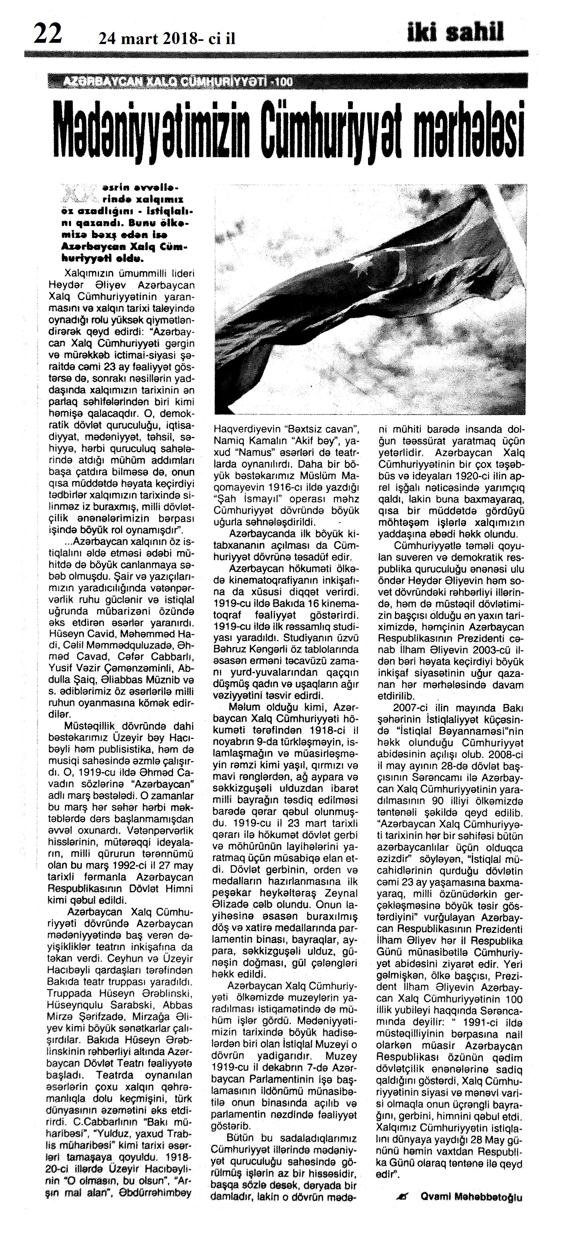 2018 - «Год Азербайджанской Демократической Республики» 1027. Абаскулиева, Э. Взгляд через столетие //Азербайджанские известия.-2018.-6 марта.- С.1. 1028. Абаскулиева, Э. Первые вехи Года АДР //Азербайджанские известия.-2018.-1 марта.- С.1. 1029. «Азермарка» объявляет конкурс детских рисунков, посвященный 100-летию Азербайджанской Демократической Республики //Бакинский рабочий.-2018.-14 марта.- С.5. 1030. В Москве состоялся «круглый стол», посвященный 100-летнему юбилею Азербайджанской Демократической Республики //Бакинский рабочий.-2018.-6 марта.- С.3. 1031.