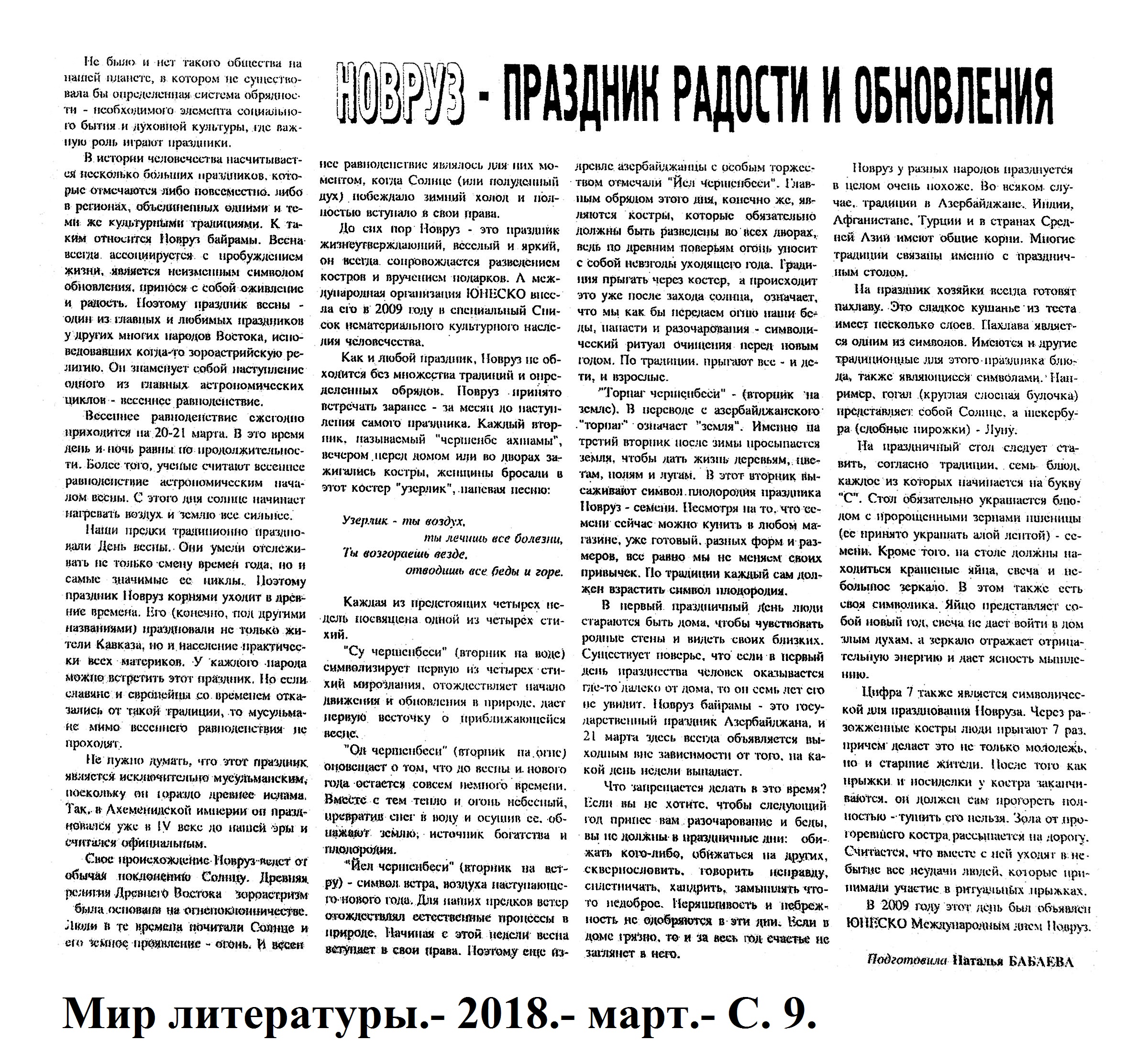 Новруз байрамы 998. Алиев, И. Поздравление азербайджанскому народу по случаю Новруз байрамы //Бакинский рабочий.-2018.-17 марта.- С.1. 999. Алиев, И. Президент Ильхам Алиев принял участие во всенародном веселье по случаю Новруз байрамы: Речь Президента Азербайджана Ильхама Алиева //Бакинский рабочий.-2018.-20 марта.- С.1-3. 1000. Асадова, И. Анар, Фахраддин Манафов, Чингиз Абдуллаев: Посетили вечер в рамках клуба: [мероприятие в Мугам-клубе] //Эхо.-2018.-16 марта.- С.8. 1001. Асадова, И. Научись печь шекербуру! //Эхо.-2018.-15 марта.- С.8. 1002. Асадуллаева, Дж. На Новруз байрамы Азербайджан посетили около 2 млн туристов //Эхо.-2018.-29 марта.- С.1, 3. 1003. Бабаева, Н. Новруз-праздник радости и обновления //Мир литературы.-2018.-№ 3(127) март.- С.9. 1004. В Беларуси прошел цикл мероприятий в связи с праздником Новруз //Бакинский рабочий.-2018.-28 марта.- С.7. 1005. В Вашингтоне отметили Новруз байрамы //Бакинский рабочий.-2018.-22 марта.- С.4. 1006. В Губинском «ASAN həyat» отметили Новруз байрамы //Бакинский рабочий.-2018.-27 марта.- С9. 1007. В дни каникул Музей ковра в Баку продолжит удивлять посетителей //Эхо.-2018.-16 марта.- С.8. 1008. В Израиле отметили Новруз байрамы //Бакинский рабочий.-2018.-24 марта.- С.2. 1009. В Калифорнии были представлены кулинарные традиции праздника Новруз //Бакинский рабочий.-2018.-22 марта.- С.2. 1010. В парке Центра Гейдара Алиева проведена международная выставка-конкурс «Семени» //Бакинский рабочий.-2018.-22 марта.- С.2. 1011. Гасанова, С. Праздник весны и надежды: Приход Новруз байрамы в Баку отметили красочными всенародными гуляньями //Азербайджанские известия.-2018.-20 марта.- С.1. 1012. Дети прифронтового села отмечают праздник Новруз: [село Газахлар Физулинского района] //Бакинский рабочий.-2018.-20 марта.- С.9. 1013. Джаббаров, З. Праздничные ярмарки //Бакинский рабочий.-2018.-6 марта.- С.6. 1014. Для молодежи, впервые голосующей на выборах, проведено культурно-массовое мероприятие по случаю Новруз байрамы //Бакинский рабочий.-2018.-20 марта.- С.6. 1015. Ислам, А. День, с которого начинается год: Новруз байрамы - праздник, вобравший в себя многовековые ценности нашего народа //Каспiй.-2018.- 6 марта.- С.11. 1016. Мамедова, А. Новруз шагает по земле: В Вене состоялась презентация азербайджанских келагаи //Каспiй.-2018.- 20 марта.- С.12. 1017. Мамедова, Т. Семь дней счастья и веселья: Весенний праздник Новруз издревле был насыщен различными обрядами и традициями, полными символического смысла //Азербайджанские известия.-2018.- 20 марта.- С.2. 1018. Мероприятия, посвященные празднику Новруз: [подготовило Министерство Культуры и Туризма] //Неделя.-2018.- 8 марта.- С.3. 1019. «Море туристов»: Множество иностранцев приехали в Баку на празднование Новруз байрамы //Бакинский рабочий.-2018.-22 марта.- С.3. 1020. На Площади фонтанов открылась праздничная ярмарка //Бакинский рабочий.-2018.-22 марта.- С.4. 1021. Награждены победители конкурса индивидуальных журналистских статей по случаю Новруз байрамы //Бакинский рабочий.-2018.-20 марта.- С.5. 1022. Новруз - праздник весны //İqtisadiyyat 2018.- 15-28 марта.- С.5. 1023. Праздник Новруз отмечен в Клайпеде //Бакинский рабочий.-2018.-23 марта.- С.3. 1024. Салаев, Г. Что мы знаем о Новруз байраме? //Эхо.-2018.-31 марта.- С.13. 1025. Спустя 24 года жители Джоджуг Мерджанлы встретили Новруз в родном селе //Бакинский рабочий.-2018.-22 марта.- С.3. 1026. Фонд «Знание» организовал праздничные торжества в Джоджуг Мерджанлы и в воинской части //Бакинский рабочий.-2018.-23 марта.- С.3.