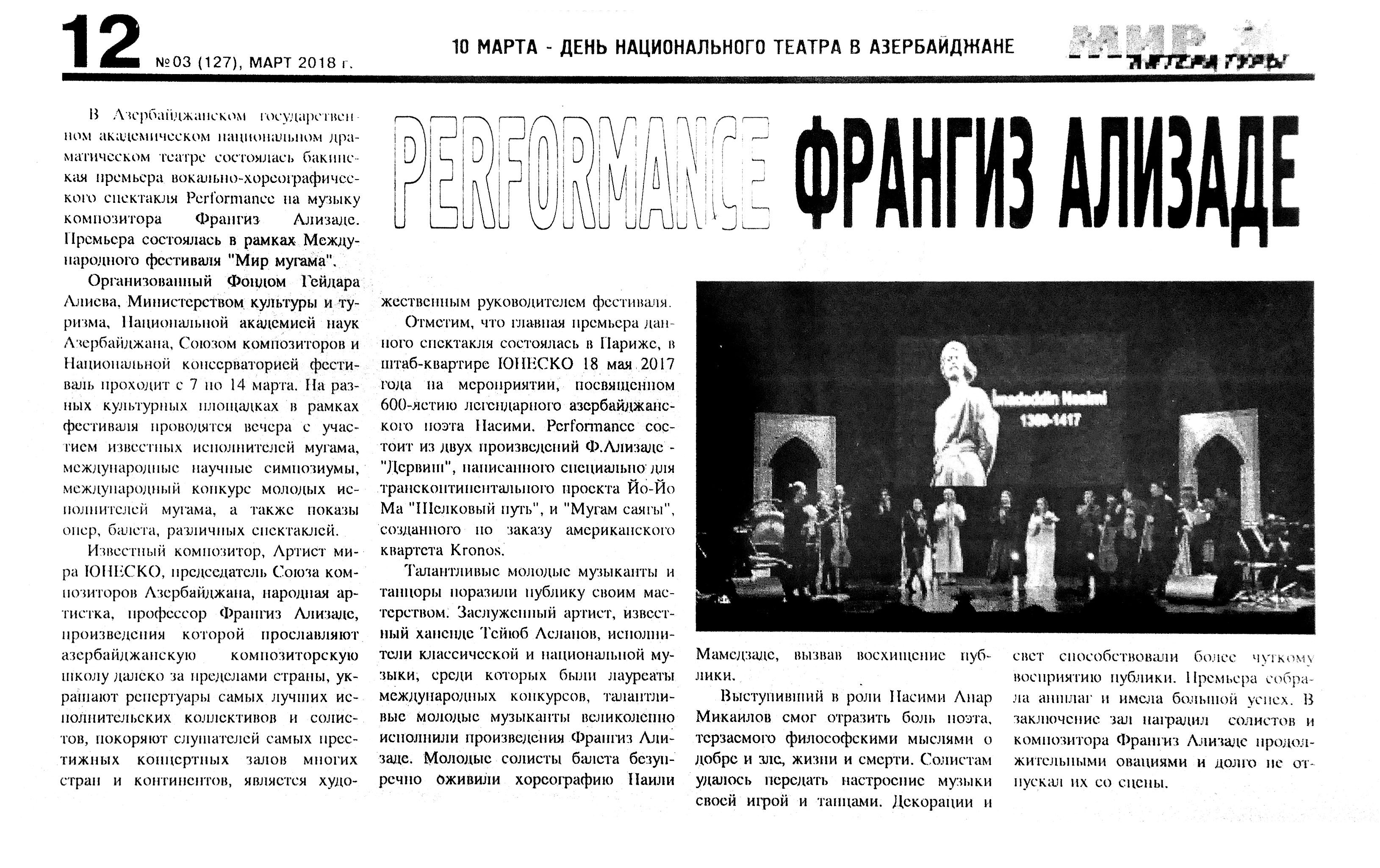 V международный фестиваль «Мир мугама» 1134. Асадова, И. Баку и Гянджу ждет «Мир мугама» //Эхо.-2018.-1 марта.- С.8. 1135. Кязимова, С. Весенний мугам //Азербайджанские известия.-2018.-10 марта.- С.1. 1136. Кязимова, С. Вечно живое искусство //Азербайджанские известия.-2018.-17 марта.- С.8.