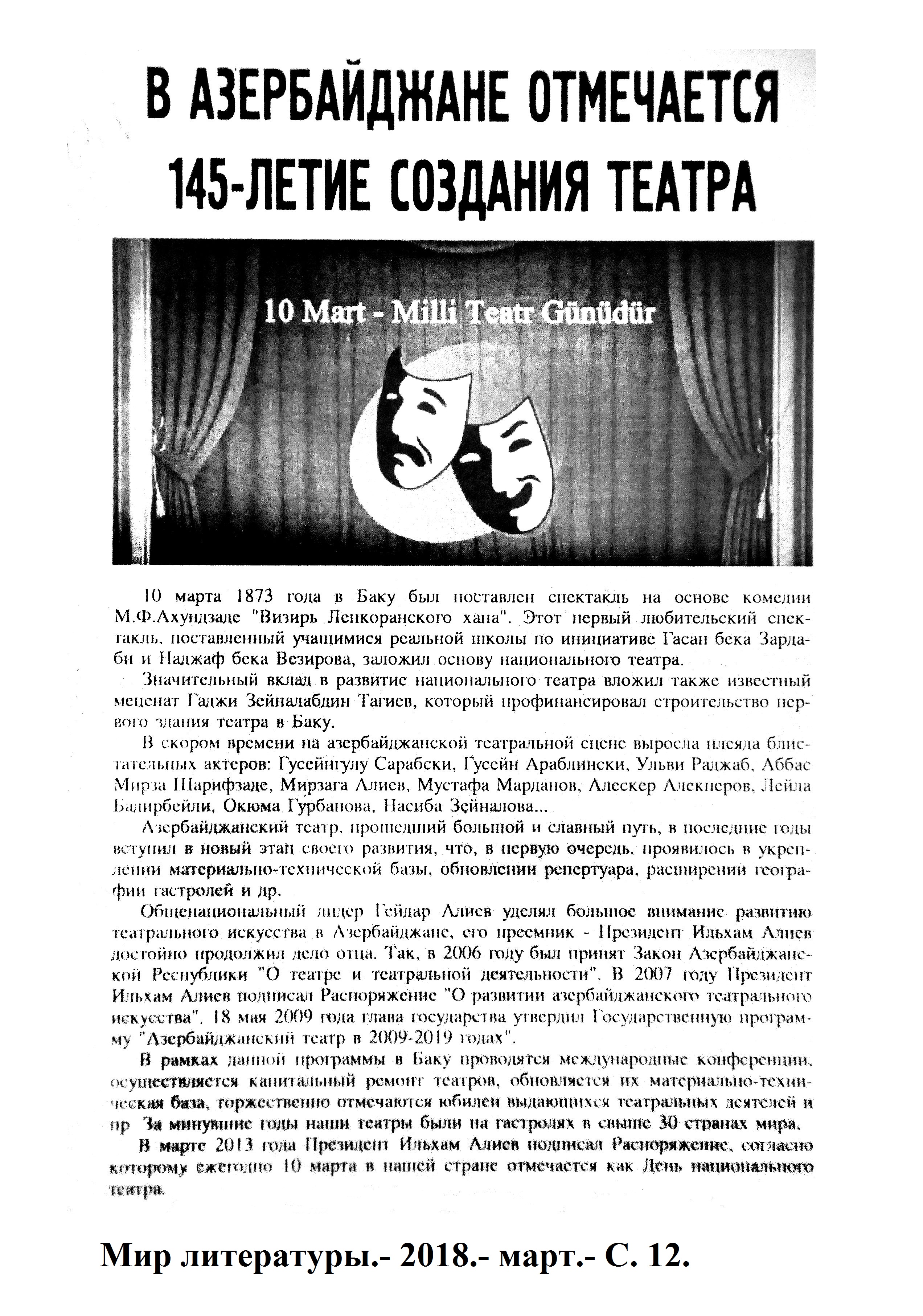 ТЕАТР 1158. Агаев, Н. Жизнь, отданная сцене: Исполнилось сто лет со дня рождения народной артистки Азербайджана Софьи Басирзаде //Азербайджанские известия.-2018.-17 марта.- С.3. 1159. Асадова, И. До мурашек по коже....: Молодые артисты вспоминают театральную глыбу - Нодара Шашиоглы //Эхо.-2018.-14марта.- С.8. 1160. В Азербайджане отмечается 145-летие создания театра //Мир литературы.-2018.-№ 3(127) март.- С.12. 1161. В Баку отметят 80-летие народного артиста Гасана Турабова //Эхо.-2018.-8 марта.- С.8. 1162. Микеладзе, Г. Главная миссия жизни - служение театру: Народному артисту Азербайджана Юрию Балиеву посвящается //Каспiй.-2018.-31 марта.- С.18, 21. 1163. Микеладзе, Г. Почти семейное застолье в РДТ: В честь 70-летия народный артист Азербайджана Александр Шаровский награжден орденом «Шараф» //Каспiй.-2018.-3 марта.- С.16-17. 1164. Подписано распоряжение о проведении 80-летнего юбилея Гасана Турабова //Ежедневные новости.-2018.-8 марта.- С.3. 1165. Президент Ильхам Алиев вручил орден «Достлуг» директору Московского академического театра сатиры: [Мамедали Агаеву] //Вышка.-2018.-8 марта.- С.2. 1166. Премьера в Сумгайытском театре прошла с большим успехом: [о спектакле «Свет в темноте» режиссера Ф. Магераммова] //Бакинский рабочий.-2018.-29 марта.- С.10. 1167. Президент Ильхам Алиев принял директора Московского академического театра сатиры Мамедали Агаева //Бакинский рабочий.-2018.-7 марта.- С.1. 1168. Скончался народный артист Азербайджана Юрий Николаевич Балиев //Бакинский рабочий.-2018.-28 марта.- С.7.