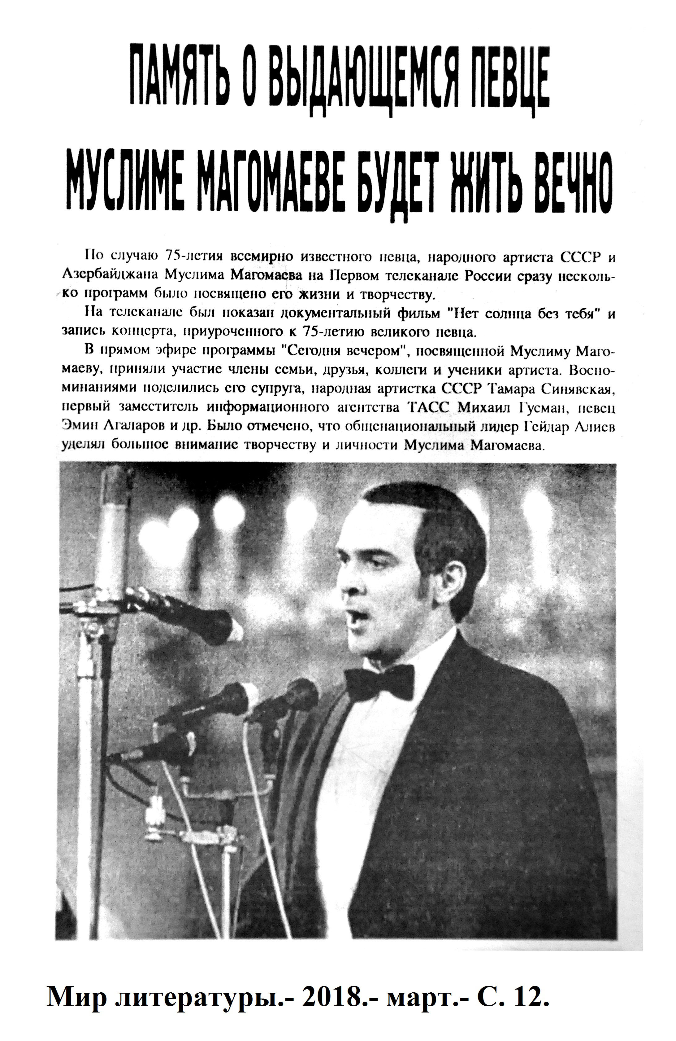 Mstislav Rostropoviç – 91 388. Maestroya həsr olunmuş konsert: [bəstəkarın adını daşıyan 21 saylı onbirillik Musiqi məktəbində] //Mədəniyyət.- 2018.- 30 mart.- S.4. 389. Muzeydə “açıq qapı”günü: [M.Rostropoviçlərin ev-muzeyində] //Mədəniyyət.- 2018.- 30 mart.- S.4. 390. Rostropoviçlərin ev-muzeyində “açıq qapı” günü //Mədəniyyət.- 2018.- 28 mart.- S.4.