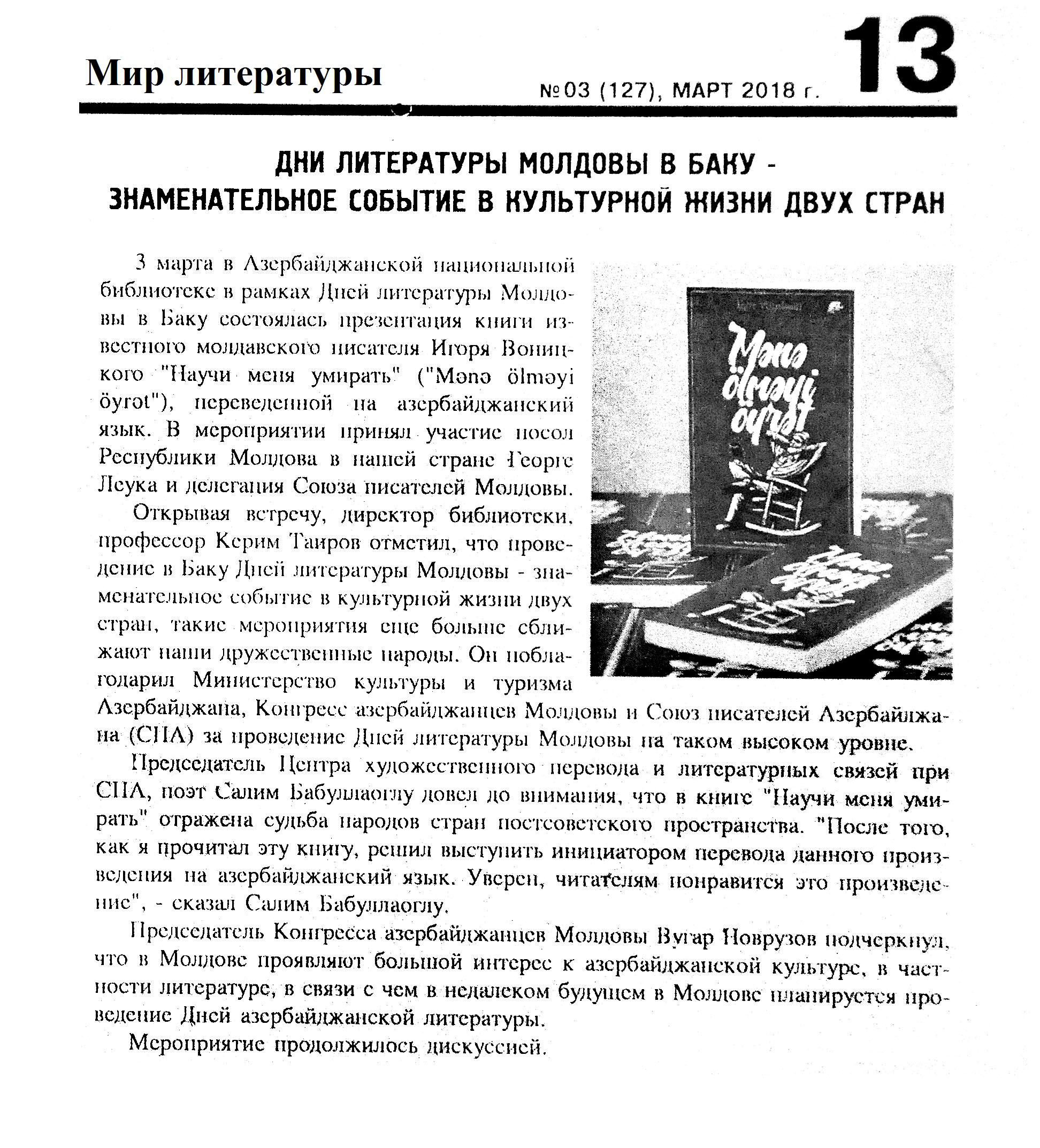 ƏDƏBİ ƏLAQƏLƏR 942. Abbaslı, T. SÖZün özü, gözü, közü...: Qədim Türkün bütün zamanlara işləyən Söz möhürü, hikmət boxçası Yunus Əmrə //Mədəniyyət.-2018.- 16 mart.- S.13. 943. Abdullayev, M. “Qarabağdan, Kərkükdən Çanaqqalaya”: Bakıda Avrasiya Türk Şairləri və Sənətçiləri Federasiyasının 15-ci toplantısı keçirilib //Xalq qəzeti.- 2018.- 11 mart.- S.6. 944. Ali Rza Özdəmir: Osmanlı və Qızılbaşlar arasında baş verənlər təbliğat maşınlarının hazırladığı psixoloji müharibə vasitələri idi: [Türkiyə yazarı ilə söhbət] /söhbətləşdi Kəbutər Haqverdi //Ədəbiyyat qəzeti.- 2018.- 31 mart.- S.31. 945. Arye Qut İtaliya mətbuatına müsahibəsində deyib: Xocalı soyqırımı mənim şəxsi faciəmdir: [beynəlxalq münasibətlər üzrə ekspertin atası Əmir Qutla birlikdə Xocalı soyqırımı haqqında yazdıqları “Ağrı” romanının italyan dilində nəşr olunması ilə bağli] //Yeni Azərbaycan.- 2018.- 1 mart.- S.6. 946. Azərbaycan ədəbiyyatı Berlində təqdim olunub: [“Sirr” (Azərbaycan hekayələri) kitabı] //Mədəniyyət.- 2018.- 30 mart.- S.15.; Xalq cəbhəsi.-2018.- 28 mart.- S.16. 947. Brotiqan, R. Birinci Dünya Müharibəsi... Los Anceles təyyarəsi...: [amerikan ədəbiyyatından tərcümə] /tərc.etdi Seyfəddin Hüseynli //Kaspi.- 2018.- 31 mart.- S.18. 948. Dirili, Y. Azərbaycanın təbiəti Aleksandr Dümanın “Qafqaz səfəri” əsərində dolğun verilib: 3-cü yazı //Xalq cəbhəsi.- 2018.- 31 mart.- S.14. 949. Əhmədli, B. Taqorun vətənində...: [müəllifin Hindistana səfər təəssüratları] //Ədəbiyyat qəzeti.- 2018.- 17 mart.- S.30-31. 950. Hacı K. Tarix kitabından qopan vərəqlər: [türk yazarı Əsli Perkerin “Cəllad məzarlığı” adlı romanı haqqında] //Ədəbiyyat qəzeti.- 2018.- 31 mart.- S.25. 951. Həyat formulu: Görkəmli bakılılar – Solomon Qusman və Lola Barsuk haqqında kitab: [Mixail Qusmanın eyniadlı kitabı haqqında] //Yeni Azərbaycan.- 2018.- 29 mart.- S.5. 952. Hikmət, N. İnsan mənzərələri: Pirayə xanıma: [türk ədəbiyyatı] /tərc.etdi Dilsuz //Ədəbiyyat qəzeti.- 2018.- 3 mart.- S.16-17. 953. Hikmət, N. İnsan mənzərələri: Pirayə xanıma: [türk ədəbiyyatı] /tərc.etdi Dilsuz //Ədəbiyyat qəzeti.- 2018.- 17 mart.- S.16-17. 954. Hikmət, N. İnsan mənzərələri: Pirayə xanıma: [türk ədəbiyyatı] /tərc.etdi Dilsuz //Ədəbiyyat qəzeti.- 2018.- 31mart.- S.16-17. 955. Hüseynzadə, X. Ölü göyərçinlər kimi...: [Amerika yazıçısı Rey Bredberinin yaradıcılığı haqqında] //Ədəbiyyat qəzeti.- 2018.- 31 mart.- S.29. 956. İsmayıl, M. Qürbətin bircə adı var, o da qürbətdir: [Şimali Kıprıslı yazar Saadeddin Yıldız haqqında] //Ədəbiyyat qəzeti.- 2018.- 31 mart.- S.18. 957. Kobetskayte, H. Hekayələrdəki ağ və qara: (Elçin Hüseynbəylinin Litva dilində nəşr edilmiş “Boz eşşəyin məktubları” kitabına ön söz) / tərcümə edən: //Kaspi.- 2018.- 31 mart.- S.14. 958. Qlovatski, Y. Şekspiri oxuyanda...: [ingilis şairi və dramaturqu Vilyam Şekspir haqqında] /Seyfəddin Hüseynlinin tərcüməsində //Kaspi.- 2018.- 31 mart.- S.15. 959. Mosenkis, Y. Avrasiyada ilk sivilizasiyaların genezisində qədim türklərin və Azərbaycanın rolu: [Ukrayna aliminin məqaləsi Məmməd İsmayılın təqdimatında] //Ədəbiyyat qəzeti. - 2018.- 17 mart.- S.8-9. 960. Rusiyada folklorçuların konqresi keçirilib: [Tula şəhərində keçirilən konqresdə Azərbaycan nümayəndə heyətinin iştirakı haqqında] //Xalq cəbhəsi.-2018.- 28 mart.- S.15. 961. “Sərdabənin sirri” tarixi romanı Azərbaycan dilində: [Ukrayna nasiri Nikolay Xomiçinin eyniadlı kitabı işıq üzü görüb] //525-ci qəzet.- 2018.- 15 mart.- S.7. 962. Şnakenberq, R. Böyük yazarların sirli həyatı: Mark Tven //Ədəbiyyat qəzeti.- 2018.- 31 mart.- S.32. 963. Türk yazıçısının Dağlıq Qarabağla bağlı əsəri “Azərbaycan” jurnalında: [Zeynalabidin Makasın “Muradı gözündə qalanlar” adlı əsərindən bir hissə] //Azərbaycan.- 2018.- 4 mart.- S.8.