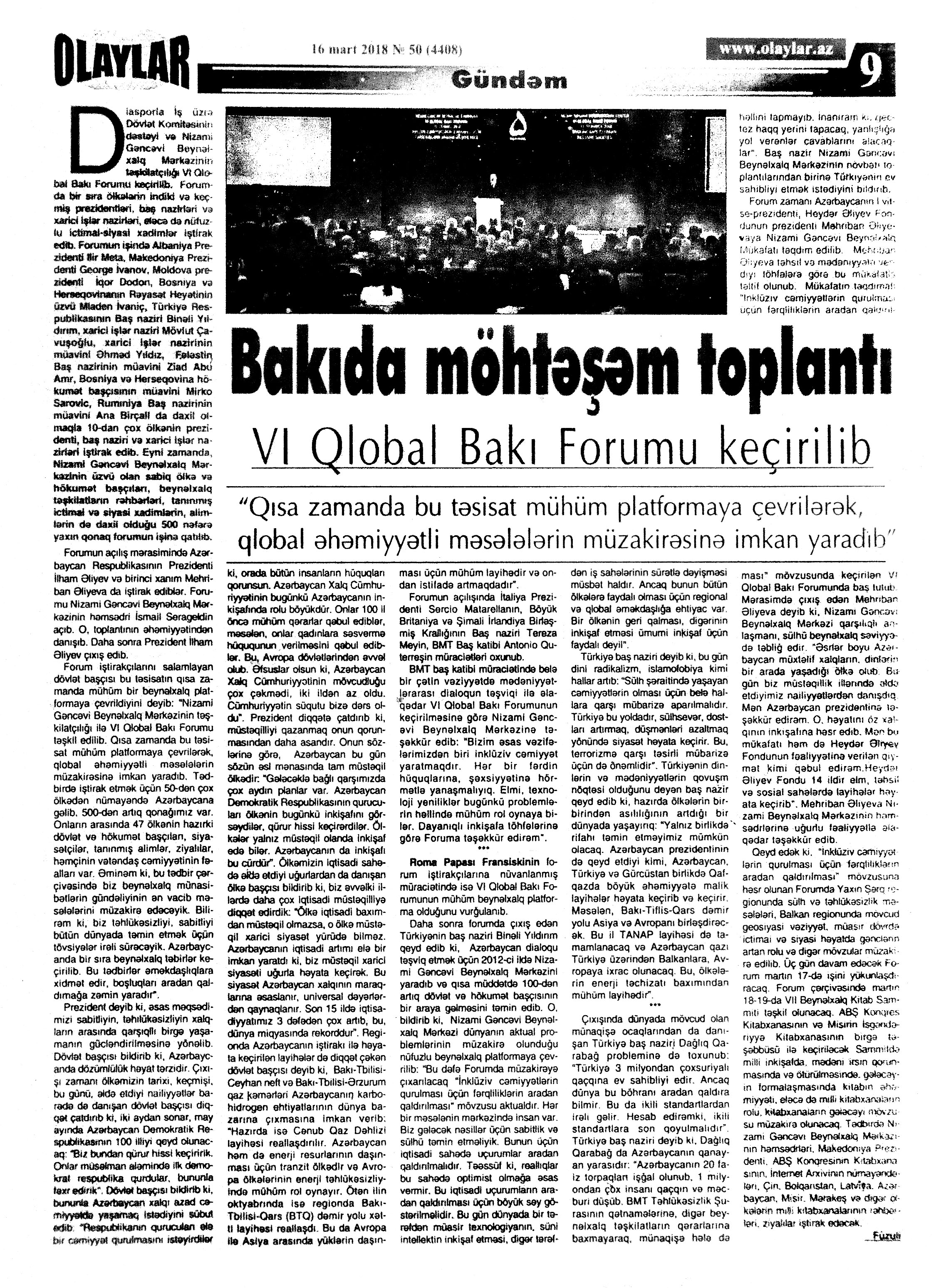 VI Глобальный Бакинский форум 1061. Алиев, И. Начал работу VI Глобальный Бакинский форум: Президент Азербайджана Ильхам Алиев принял участие в открытии Форума //Бакинский рабочий.-2018.- 16 марта.- С.1-4. 1062. В рамках Форума состоялось панельное заседание на тему «Религиозное, культурное разнообразие - чья роль более значима для политического лидерства? //Бакинский рабочий.-2018.- 20 марта.- С.8. 1063. Спасибо, Азербайджан: [вручение Мехрибан Алиевой медали «Низами Гянджеви»] //Наука.-2018.- 19 марта.- С.1. 1064. Устроен прием в честь участников VI Глобального Бакинского форума //Бакинский рабочий.-2018.- 16 марта.- С.1-4.