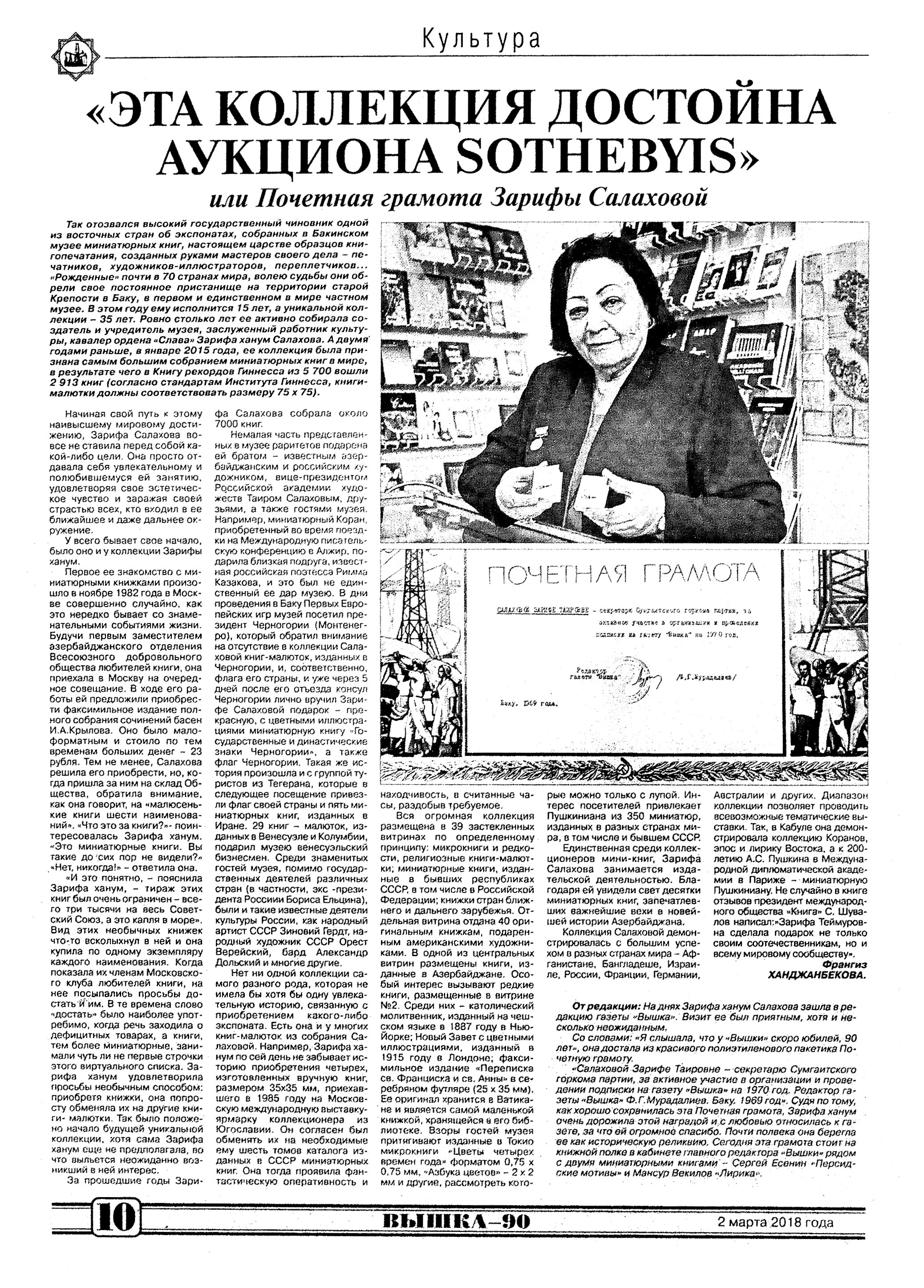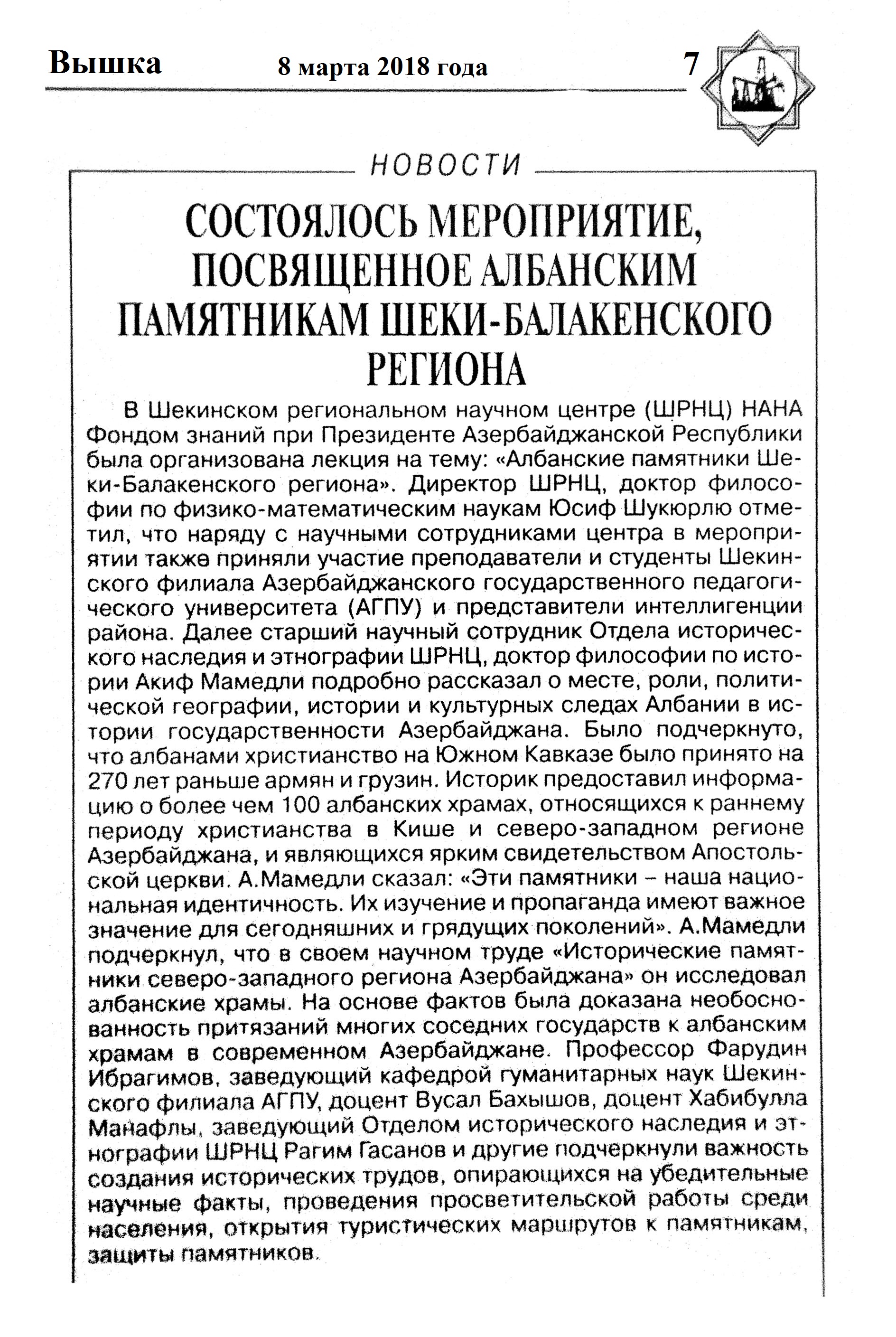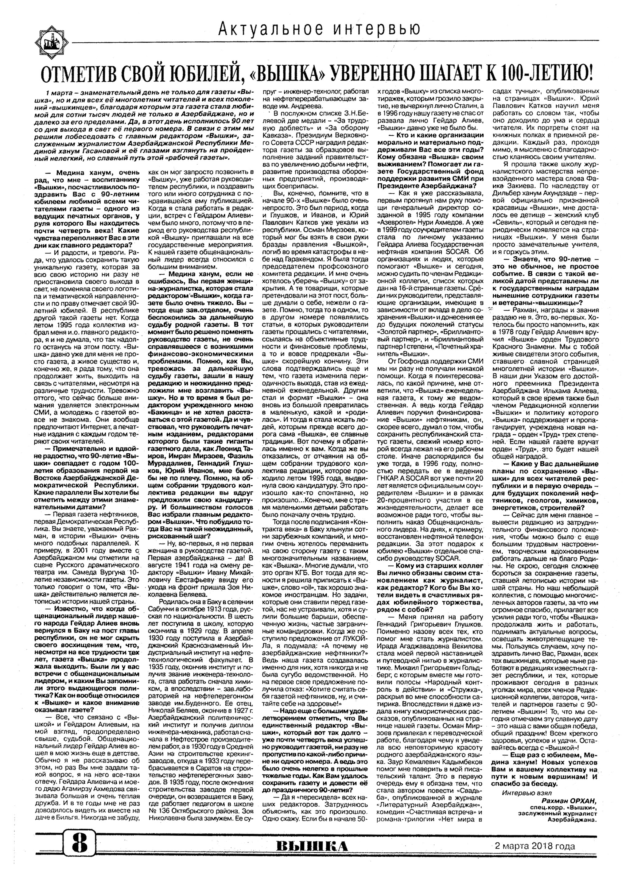 ИНФОРМАЦИОНОЕ И РЕКЛАМНОЕ ДЕЛО 1067. Алиев, И. Делегатам VII съезда Совета печати Азербайджана: Уважаемые делегаты съезда! //Бакинский рабочий.-2018.- 13 марта.- С. 3. 1068. Гасанова, М. Отметив свой юбилей, «Вышка» уверенно шагает к 100-летию!: [беседа с главным редактором газеты] /провел Р.Орхан //Вышка.-2018.-2 марта.- С.8. 1069. Отмечен 15-летний юбилей Совета печати Азербайджана //Бакинский рабочий.-2018.- 15 марта.- С. 3. 1070. Султанова, Л. «Вышка» - информационный мост между прошлым и будущим: Одному из флагманов русскоязычной прессы Азербайджана исполняется 90 лет //Вышка.-2018.-2 марта.- С.4. 1071. Султанова, Л. Информационный мост между прошлым и будущим: Одному из старейших периодических изданий Азербайджана - газете «Вышка» исполняется 90 лет //Азербайджанские известия.-2018.1 марта.- С.3.