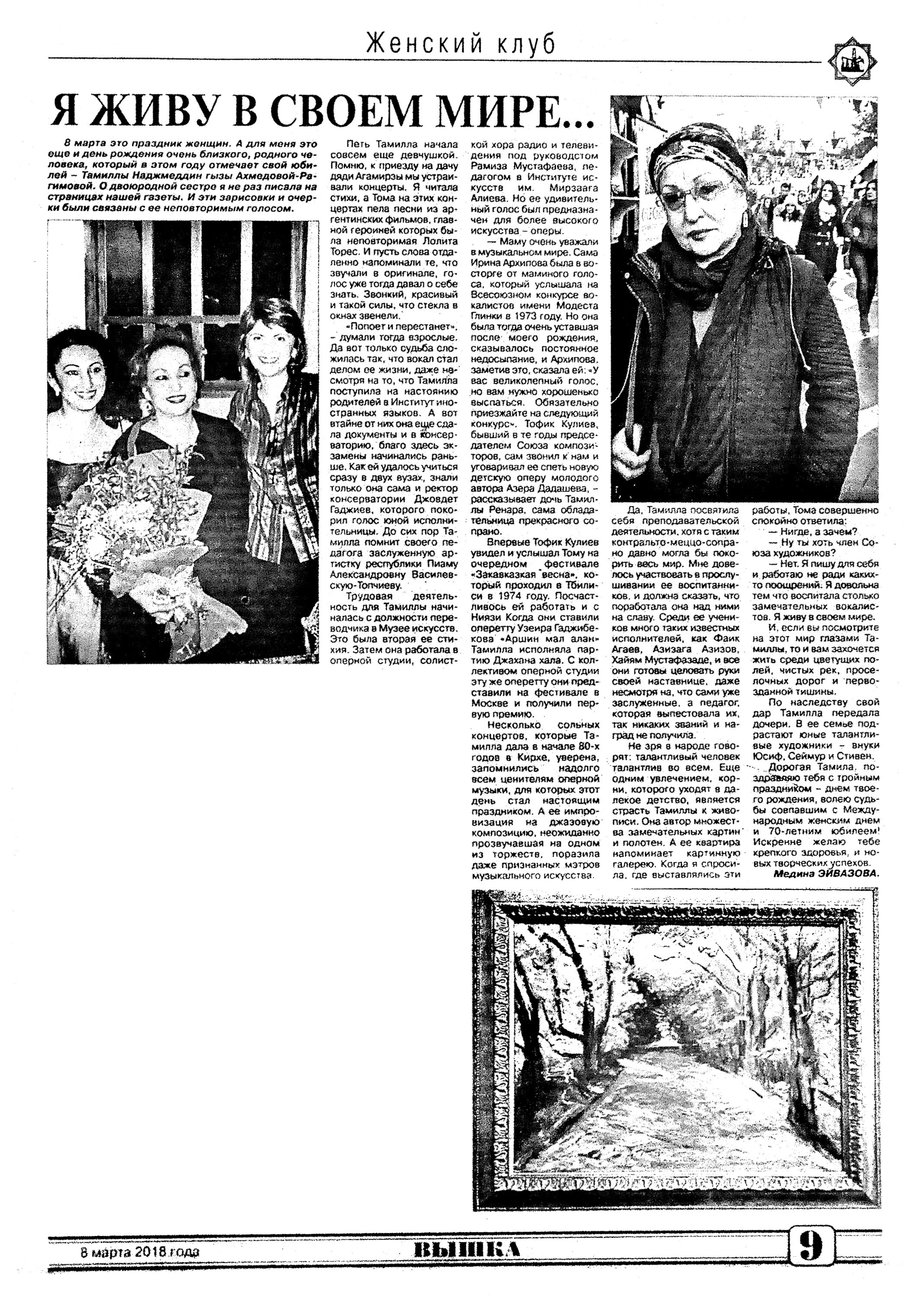 Международный женский день – 8 марта 987. Алиев, И. Поздравление азербайджанским женщинам по случаю 8 Марта - Международного женского дня //Бакинский рабочий.-2018.-7 марта.- С.1. 988. Асадова, И. Музей ковра поздравил женщин с 8 Марта //Эхо.-2018.-6 марта.- С.8. 989. Асадова, И. Нигяр Нариманбекова: Подарок от папы не забуду никогда! //Эхо.-2018.- 8 марта.- С.8. 990. Bakcell поддержал проведение выставки «Искусство, ремесло и предпринимательство»: [в отеле Pullman Baku] //Бакинский рабочий.-2018.-10 марта.- С.5. 991. В Ичеришехер проходит выставка «Женщины и цветы» //Бакинский рабочий.-2018.-10 марта.- С.4. 992. Ислам, А. Гимн жизни, весне и красоте: В Национальном музее искусств состоялся праздничный концерт //Каспiй.-2018.- 8 марта.- С.12. 993. Караева, С. Саадет Караева, создатель ансамбля «Одлар юрду» (Красноярск): «Самые сильные диаспоры - те, где активно работают женщины» //Азербайджанские известия.-2018.-8 марта.- С.1, 3. 994. Наши художники - нашим женщинам: В Ичеришехер прошел воркшоп, посвященный Международному женскому дню - 8 марта //Неделя.-2018.- 8 марта.- С.19. 995. Салаев, Г. Азербайджанские женщины - ученые и академики //Эхо.-2018.- 10 марта.- С.13. 996. Хиджран Гусейнова: «Обеспечение достойного места женщин в обществе - один из приоритетов политики нашего государства» //Бакинский рабочий.-2018.-8 марта.- С.4. 997. Эйвазова, М. Я живу в своем мире...: [о жизни и творчестве певицы, переводчика, художника Т.Ахмедовой-Рагимовой] //Вышка.-2018.-8 марта.- С.9.