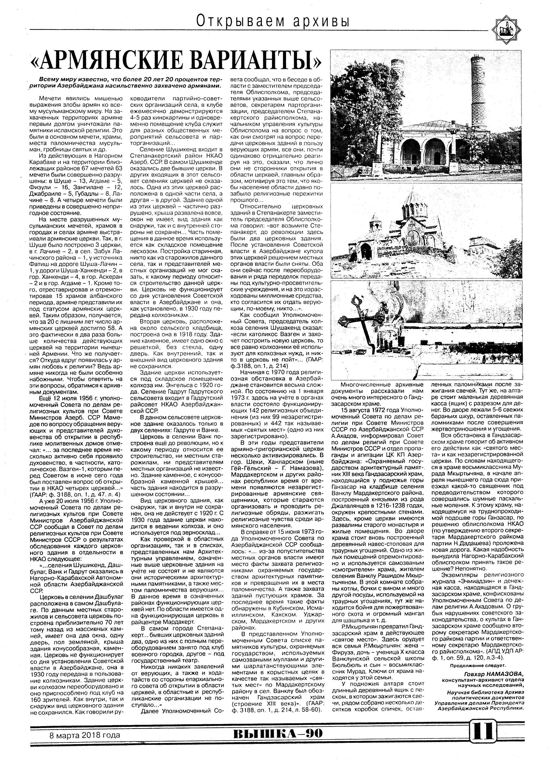 ПАМЯТНИКИ ИСТОРИИ И КУЛЬТУРЫ 1084. Амиров, Э. Кресту приверженные под сенью полумесяца: Забытые албанские князья эпохи халифата (704-821 гг.) //Бакинский рабочий.-2018.-6 марта.- С.7. 1085. Буланова, О. Караван сараи - прообраз гостиниц Азербайджана //Эхо.-2018.-31 марта.- С.16. 1086. Буланова, О. Страницы истории Баку: Мечеть Тезепир и Набат ханым Ашурбекова //Эхо.-2018.-3 марта.- С.13. 1087. Буланова, О. Тайны Баку: Старые стены и герб города: [Ичери шехер] //Эхо.-2018.-3 марта.- С.13. 1088. Новое дыхание купольной бани в Губе: Реставрационные работы осуществлены при финансовой поддержке Фонда послов США по охране культурного наследия //Эхо.-2018.-28 марта.- С.8. 1089. Состоялось мероприятие, посвященное албанским памятникам Шеки-Балакенского района: [подготовленное Фондом «Знание»] //Вышка.-2018.- 8 марта.- С.7.