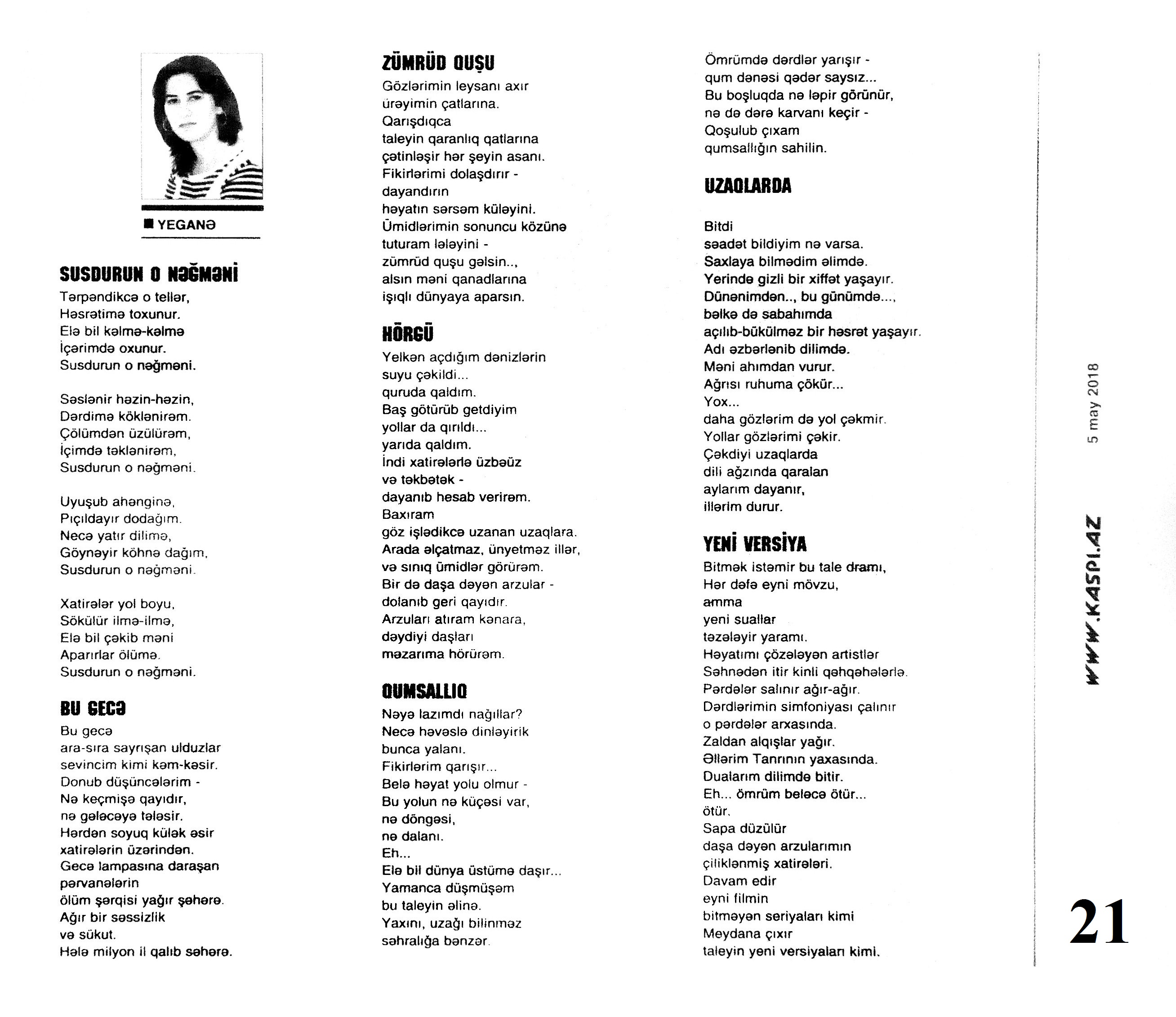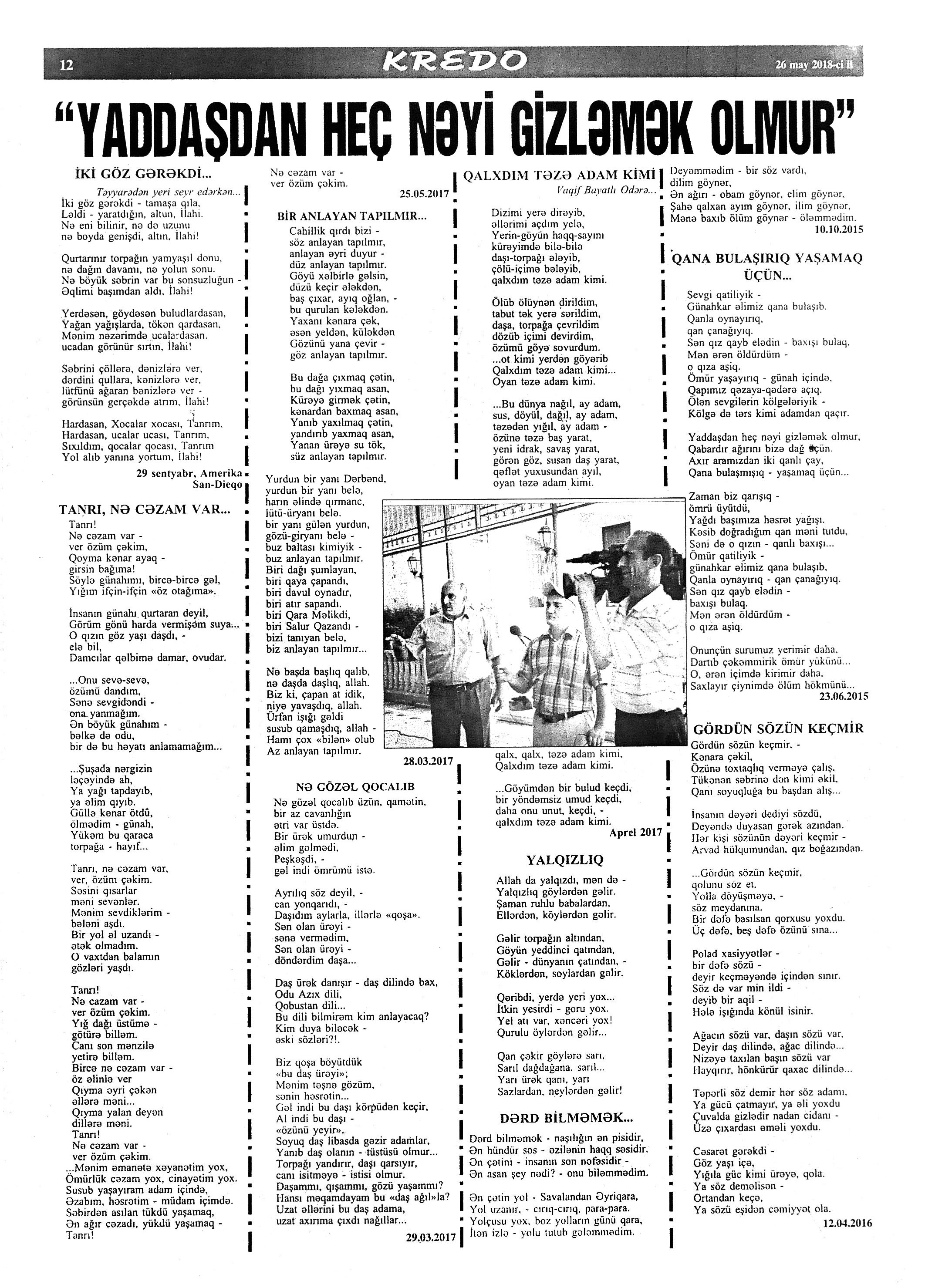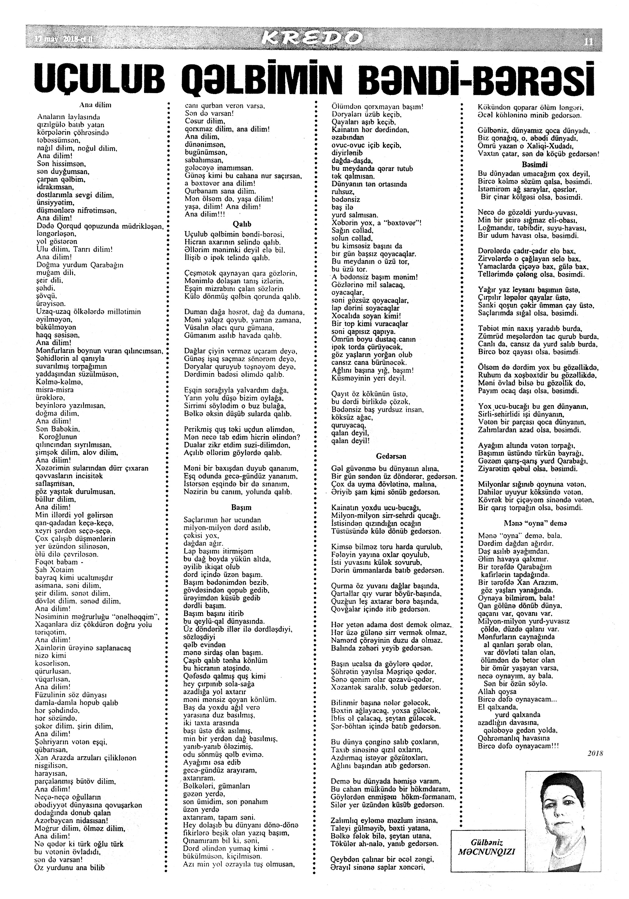 A. Könlüm Qarabağa getmək istəyir; 875. Əyyub, M. İsa Cavadoğlunun şeirləri... //Kaspi.-2018.- 12-14 may.- S.20. 876. Əzimli, Ə. Üç rəngli Bayraq; O əllərə; Xatırlamaq həvəsi; Bu səhər; Kül olan ocaq; Ürəyim; Gecə, işıq və günəş //525-ci qəzet.-2018.- 30 may.- S.7. 877. Əziz, V. Neynədin?; Gözümü yaşartdı xoş xatirələr...; Babam deyən nağıl-köhnə yenilik...; Qılıncım özünü kəsdi qınında...; Həyat məni pis öyrətdi...; Səs gəldi...; Qızlarda işarə saçla oynamaq...; Torpaq xırda-xırda böyüdür bizi...; Nə gördün? Hələ də yağış yağır...; Mən yavaş deyirəm: “Sevirəm səni”//Ədəbiyyat qəzeti.-2018.- 12 may.- S.14-15. 878. Ginzberq, A. Günəşlə doğuluruq və gecəyə düşürük biz; 29 fevral 1958; Payız yarpaqları: [amerikan ədəbiyyatı] /tərc.etdi Həmid Piriyev //Ədəbiyyat qəzeti.- 2018.- 6 may.- S.14. 879. Gülgün, M. Azərbaycan //Ədəbiyyat qəzeti.-2018.- 26 may.- S.17. 880. Xasayoğlu, R. Anam; Dostlarıma; Kişilər ağlamaz və s. //Kaspi.-2018.- 5-7 may.- S.21. 881. İldırım, A. Mən kiməm?; Əsir Azərbaycanım //Ədəbiyyat qəzeti.-2018.- 26 may.- S.16. 882. İlhamoğlu, Z. Şəhidlər xiyabanı; Çatmır; Olmadı; Könlüm və s. //Kaspi.-2018.- 5-7 may.- S.20. 883. Kvitko, L. Bacarıqlı oğlan; Lemyelanın ev işləri; Anna-Vanna; Bembadan Drembaya: [yəhudi ədəbiyyatı] /rus dilindən tərc.etdi Qəşəm İsabəyli //Ədəbiyyat qəzeti.-2018.- 12 may.- S.24. 884. Qaçayqızı, M. Yad şəhərin yuxusu; Ay işığı; Külək əsəndə və s. //Kaspi.-2018.- 5-7 may.- S.15. 885. Qasımlı, A. Aylı gecənin aydınlığında; Səni səsləyirəm; O yer ki... //Ədəbiyyat qəzeti.- 2018.- 12 may.- S.30. 886. Məcnunqızı, G. Uçulub qəlbimin bəndi-bərəsi: Ana dilim; Qalıb; Başım və s. //Kredo.-2018.- 17 may.- S.11. 887. Məmmədova, S. Vətən sağ olsun //Azərbaycan müəllimi.- 2018.- 11 may.- S.14. 888. Məzhər, M. Sərhədçi əsgər; Haydı, irəli!; Dalğalan, bayrağım! //525-ci qəzet.- 2018.- 2 may.- S.8. 889. Müşfiq, Ş. Günahım...; Utanır ürəyim; Deyirsən, dönəcəm yayda... və s. //525-ci qəzet.-2018.- 12 may.- S.24. 890. Narıngül. Sonuncu məktubdur mənim ürəyim...; Ürəkdə qalan var; Əl vurma, öldürəcək; Müharibə; Bağışla; Yağış //Ədəbiyyat qəzeti.- 2018.- 6 may.- S.10. 891. Nəccari, Ü. Gecə gecdir, şair... //Ədəbiyyat qəzeti.- 2018.- 6 may.- S.9. 892. Nəsiboğlu, R. Şair dostlarıma: Sükut nəğmələri silsiləsindən: Ölüm – adamın boş vaxtı; Hardasan... //Ədəbiyyat qəzeti.- 2018.- 12 may.- S.32. 893. Nurgül, X. Qayıq; Hüznlü sular; Bahar sindromu; Zəncirotu çiçəkləri; Unutmağa gedən qatar; Tərcümeyi-hal; Melanxoliya; Geriyə say fəlsəfəsi; Lüdviq van Bethovenə; Gecə qaralaması //Ədəbiyyat qəzeti.- 2018.- 6 may.- S.4. 894. Pinter, H. Sonra; Şeir; Paris; Bu yeri tanıyıram: [ingilis ədəbiyyatı] /tərc.etdi Həmid Piriyev //Ədəbiyyat qəzeti.- 2018.- 6 may.- S.14. 895. Piri, E. Can borcu; Mən qütb soyuğuyam //Azərbaycan müəllimi.- 2018.- 11 may.- S.14. 896. Rüstəm, S. Təbrizim //Ədəbiyyat qəzeti.-2018.- 26 may.- S.16. 897. Rüstəmxanlı, S. Bitməz yolçuluq; Sözün harayı; Yol; Yaxşıyam; Ölümsüzlük çağırır; Möcüzə ümidi; Minnətdarlıq; Ölümə yaxınlaşmaq; İstanbul minarələri; Əlövsətə; Pinqvin əxlaqı; Ad günüm; Bir azdan; Yaşamaq üstə; Məni axtarmayın; Qalar; Sən yolum //Ədəbiyyat qəzeti.-2018.- 19 may.- S.8-9. 898. Rza, T. Şah əsər...; Dərd yetim qalar; Yazıqdır...; Dəyməz... və s. //525-ci qəzet.-2018.- 5 may .- S.23. 899. Sabirli, R. Vətənim; Ana; Sən məni unuda bilməyəcəksən //Azərbaycan müəllimi.- 2018.- 11 may.- S.14. 900. Səhhət, A. Vətən //Ədəbiyyat qəzeti.-2018.- 26 may.- S.16. 901. Şahin, Ş. Gəl gedək darıxmağa //Ədəbiyyat qəzeti.- 2018.- 6 may.- S.25. 902. Şəfaqət, H. Ən doğma adamlar quş olub uçar, Dönər yuvasına səssiz ah kimi... //Ədəbiyyat qəzeti.-2018.- 19 may.- S.10. 903. Şəhriyar, S. Azərbaycan //Ədəbiyyat qəzeti.-2018.- 26 may.- S.16. 904. Şırlanlı, Ə. Sən ancaq zirvədə dayanmalısan!; Döyüşə hazır ol!; Bizim yerlərə... //Azərbaycan müəllimi.- 2018.- 11 may.- S.14. 905. Toğrulqızı, A. “Yetişdi ayrılıq vaxtı...”; Axtarıram; Son görüş; Xatirə oyanır //525-ci qəzet.-2018.- 4 may.- S.7. 906. Ulutürk, X. R. Mən yenə dönəcəm Azərbaycana //Ədəbiyyat qəzeti.-2018.- 26 may.- S.16-17. 907. Ülvi, Ə. Bir arzum çağlayır; Tanrıya xitab; O günlər; Olmayan və s. //Ədalət.-2018.- 12 may.- S.14. 908. Ülvi, Ə. Kişilər bayramı; Dilim; O ölməyib və s. //Ədalət.-2018.- 12 may.- S.14.; 525-ci qəzet.-2018.- 17 may.- S.8. 909. Vəfa, Z. Tər çiçəklər qoyduq...; Tərəzi; Siz Allah...; Bəs sən... //Ədəbiyyat qəzeti.- 2018.- 12 may.- S.30. 910. Vüsal, B. Qıl körpü; Haqqın fərmanı; Böyüdüb; Bir üzlü adam; Ruhlar məclisi; Qoruduğum uşaq; Ehtiram //525-ci qəzet.-2018.- 19 may.- S.23. 911. Yaqub, M. Tənhalığın üsyanı; Qış gəlir; Səyirmə; Qızıl dan kimi; Payız günüm; Hələ ki... //Kaspi.-2018.- 26-29 may.- S.17. 912. Yeganə. Susdurun o nəğməni; Bu gecə; Zümrüd quşu və s. //Kaspi.-2018.- 5-7 may.- S.21. 913. Yusifoğlu, İ. Bu dünyanın; Vətən nəğməsi //Azərbaycan müəllimi. - 2018.- 11 may.- S.14. 914. Zeynal, C. Gecələr gedirəm Füzuliyə mən; Duman dağlara gələcək yenə; Qalıb //Ədəbiyyat qəzeti.- 2018.- 6 may.- S.21.