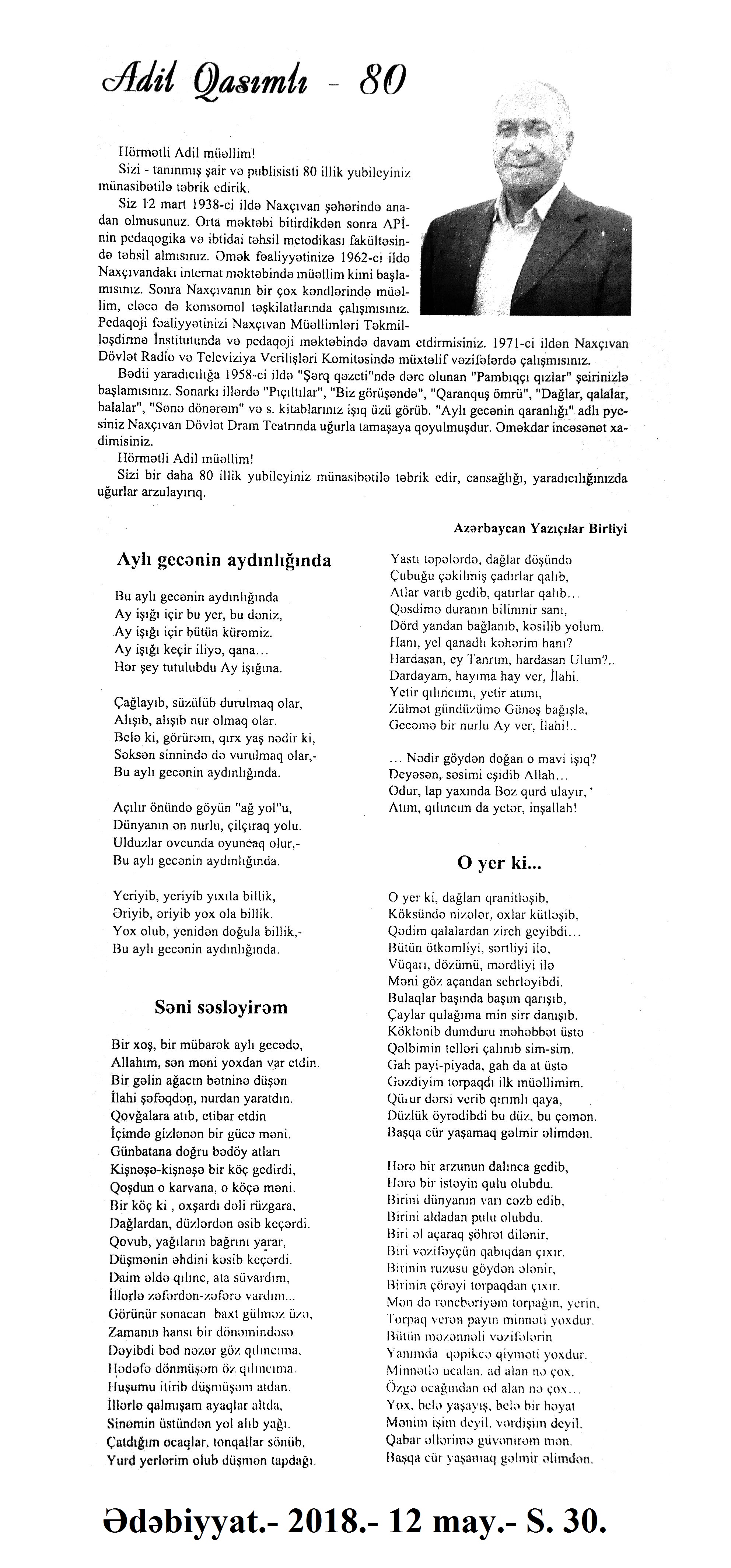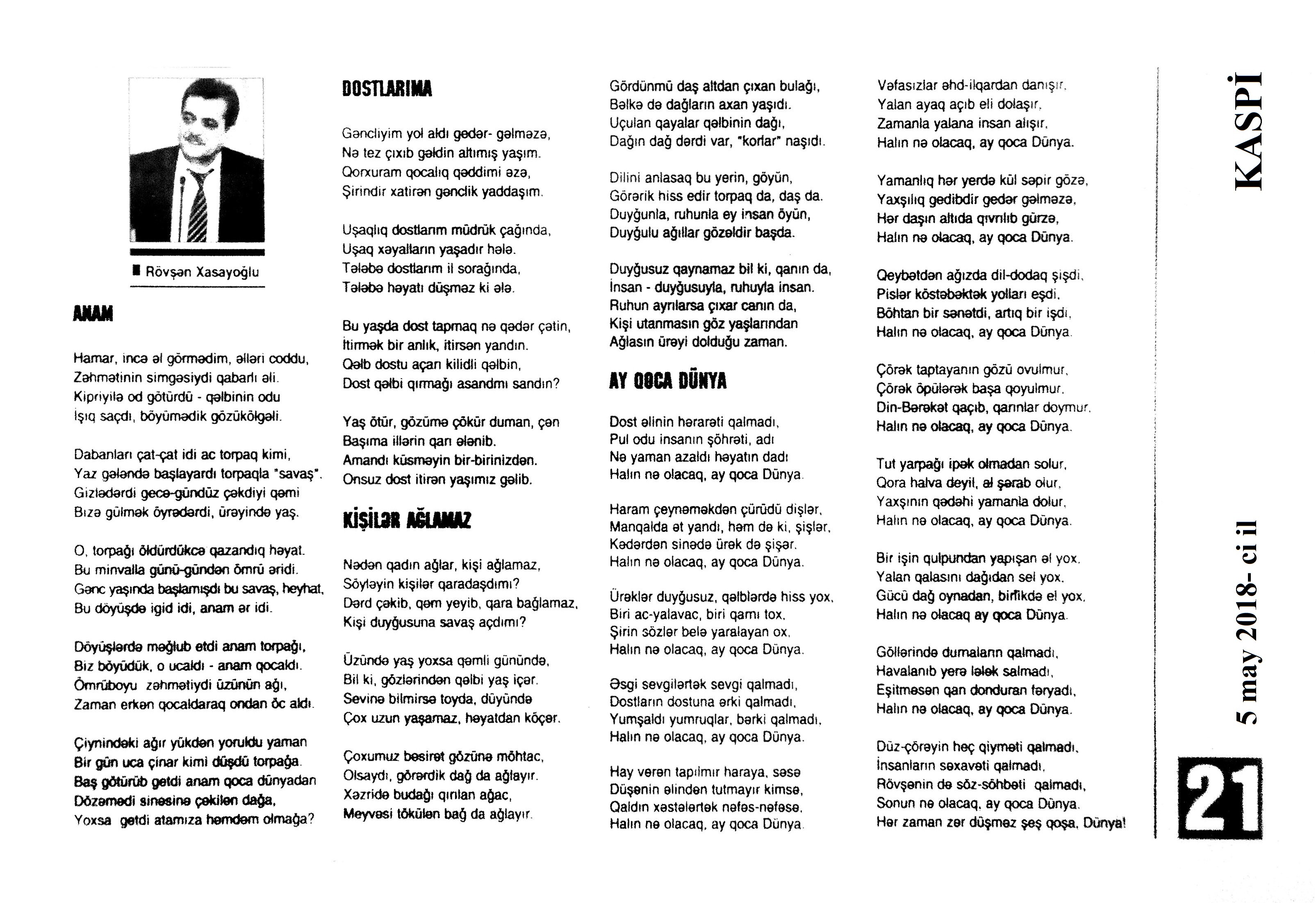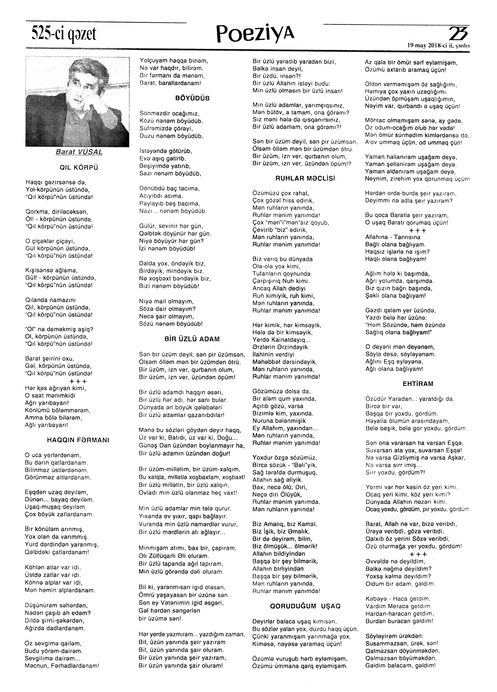 A. Könlüm Qarabağa getmək istəyir; 875. Əyyub, M. İsa Cavadoğlunun şeirləri... //Kaspi.-2018.- 12-14 may.- S.20. 876. Əzimli, Ə. Üç rəngli Bayraq; O əllərə; Xatırlamaq həvəsi; Bu səhər; Kül olan ocaq; Ürəyim; Gecə, işıq və günəş //525-ci qəzet.-2018.- 30 may.- S.7. 877. Əziz, V. Neynədin?; Gözümü yaşartdı xoş xatirələr...; Babam deyən nağıl-köhnə yenilik...; Qılıncım özünü kəsdi qınında...; Həyat məni pis öyrətdi...; Səs gəldi...; Qızlarda işarə saçla oynamaq...; Torpaq xırda-xırda böyüdür bizi...; Nə gördün? Hələ də yağış yağır...; Mən yavaş deyirəm: “Sevirəm səni”//Ədəbiyyat qəzeti.-2018.- 12 may.- S.14-15. 878. Ginzberq, A. Günəşlə doğuluruq və gecəyə düşürük biz; 29 fevral 1958; Payız yarpaqları: [amerikan ədəbiyyatı] /tərc.etdi Həmid Piriyev //Ədəbiyyat qəzeti.- 2018.- 6 may.- S.14. 879. Gülgün, M. Azərbaycan //Ədəbiyyat qəzeti.-2018.- 26 may.- S.17. 880. Xasayoğlu, R. Anam; Dostlarıma; Kişilər ağlamaz və s. //Kaspi.-2018.- 5-7 may.- S.21. 881. İldırım, A. Mən kiməm?; Əsir Azərbaycanım //Ədəbiyyat qəzeti.-2018.- 26 may.- S.16. 882. İlhamoğlu, Z. Şəhidlər xiyabanı; Çatmır; Olmadı; Könlüm və s. //Kaspi.-2018.- 5-7 may.- S.20. 883. Kvitko, L. Bacarıqlı oğlan; Lemyelanın ev işləri; Anna-Vanna; Bembadan Drembaya: [yəhudi ədəbiyyatı] /rus dilindən tərc.etdi Qəşəm İsabəyli //Ədəbiyyat qəzeti.-2018.- 12 may.- S.24. 884. Qaçayqızı, M. Yad şəhərin yuxusu; Ay işığı; Külək əsəndə və s. //Kaspi.-2018.- 5-7 may.- S.15. 885. Qasımlı, A. Aylı gecənin aydınlığında; Səni səsləyirəm; O yer ki... //Ədəbiyyat qəzeti.- 2018.- 12 may.- S.30. 886. Məcnunqızı, G. Uçulub qəlbimin bəndi-bərəsi: Ana dilim; Qalıb; Başım və s. //Kredo.-2018.- 17 may.- S.11. 887. Məmmədova, S. Vətən sağ olsun //Azərbaycan müəllimi.- 2018.- 11 may.- S.14. 888. Məzhər, M. Sərhədçi əsgər; Haydı, irəli!; Dalğalan, bayrağım! //525-ci qəzet.- 2018.- 2 may.- S.8. 889. Müşfiq, Ş. Günahım...; Utanır ürəyim; Deyirsən, dönəcəm yayda... və s. //525-ci qəzet.-2018.- 12 may.- S.24. 890. Narıngül. Sonuncu məktubdur mənim ürəyim...; Ürəkdə qalan var; Əl vurma, öldürəcək; Müharibə; Bağışla; Yağış //Ədəbiyyat qəzeti.- 2018.- 6 may.- S.10. 891. Nəccari, Ü. Gecə gecdir, şair... //Ədəbiyyat qəzeti.- 2018.- 6 may.- S.9. 892. Nəsiboğlu, R. Şair dostlarıma: Sükut nəğmələri silsiləsindən: Ölüm – adamın boş vaxtı; Hardasan... //Ədəbiyyat qəzeti.- 2018.- 12 may.- S.32. 893. Nurgül, X. Qayıq; Hüznlü sular; Bahar sindromu; Zəncirotu çiçəkləri; Unutmağa gedən qatar; Tərcümeyi-hal; Melanxoliya; Geriyə say fəlsəfəsi; Lüdviq van Bethovenə; Gecə qaralaması //Ədəbiyyat qəzeti.- 2018.- 6 may.- S.4. 894. Pinter, H. Sonra; Şeir; Paris; Bu yeri tanıyıram: [ingilis ədəbiyyatı] /tərc.etdi Həmid Piriyev //Ədəbiyyat qəzeti.- 2018.- 6 may.- S.14. 895. Piri, E. Can borcu; Mən qütb soyuğuyam //Azərbaycan müəllimi.- 2018.- 11 may.- S.14. 896. Rüstəm, S. Təbrizim //Ədəbiyyat qəzeti.-2018.- 26 may.- S.16. 897. Rüstəmxanlı, S. Bitməz yolçuluq; Sözün harayı; Yol; Yaxşıyam; Ölümsüzlük çağırır; Möcüzə ümidi; Minnətdarlıq; Ölümə yaxınlaşmaq; İstanbul minarələri; Əlövsətə; Pinqvin əxlaqı; Ad günüm; Bir azdan; Yaşamaq üstə; Məni axtarmayın; Qalar; Sən yolum //Ədəbiyyat qəzeti.-2018.- 19 may.- S.8-9. 898. Rza, T. Şah əsər...; Dərd yetim qalar; Yazıqdır...; Dəyməz... və s. //525-ci qəzet.-2018.- 5 may .- S.23. 899. Sabirli, R. Vətənim; Ana; Sən məni unuda bilməyəcəksən //Azərbaycan müəllimi.- 2018.- 11 may.- S.14. 900. Səhhət, A. Vətən //Ədəbiyyat qəzeti.-2018.- 26 may.- S.16. 901. Şahin, Ş. Gəl gedək darıxmağa //Ədəbiyyat qəzeti.- 2018.- 6 may.- S.25. 902. Şəfaqət, H. Ən doğma adamlar quş olub uçar, Dönər yuvasına səssiz ah kimi... //Ədəbiyyat qəzeti.-2018.- 19 may.- S.10. 903. Şəhriyar, S. Azərbaycan //Ədəbiyyat qəzeti.-2018.- 26 may.- S.16. 904. Şırlanlı, Ə. Sən ancaq zirvədə dayanmalısan!; Döyüşə hazır ol!; Bizim yerlərə... //Azərbaycan müəllimi.- 2018.- 11 may.- S.14. 905. Toğrulqızı, A. “Yetişdi ayrılıq vaxtı...”; Axtarıram; Son görüş; Xatirə oyanır //525-ci qəzet.-2018.- 4 may.- S.7. 906. Ulutürk, X. R. Mən yenə dönəcəm Azərbaycana //Ədəbiyyat qəzeti.-2018.- 26 may.- S.16-17. 907. Ülvi, Ə. Bir arzum çağlayır; Tanrıya xitab; O günlər; Olmayan və s. //Ədalət.-2018.- 12 may.- S.14. 908. Ülvi, Ə. Kişilər bayramı; Dilim; O ölməyib və s. //Ədalət.-2018.- 12 may.- S.14.; 525-ci qəzet.-2018.- 17 may.- S.8. 909. Vəfa, Z. Tər çiçəklər qoyduq...; Tərəzi; Siz Allah...; Bəs sən... //Ədəbiyyat qəzeti.- 2018.- 12 may.- S.30. 910. Vüsal, B. Qıl körpü; Haqqın fərmanı; Böyüdüb; Bir üzlü adam; Ruhlar məclisi; Qoruduğum uşaq; Ehtiram //525-ci qəzet.-2018.- 19 may.- S.23. 911. Yaqub, M. Tənhalığın üsyanı; Qış gəlir; Səyirmə; Qızıl dan kimi; Payız günüm; Hələ ki... //Kaspi.-2018.- 26-29 may.- S.17. 912. Yeganə. Susdurun o nəğməni; Bu gecə; Zümrüd quşu və s. //Kaspi.-2018.- 5-7 may.- S.21. 913. Yusifoğlu, İ. Bu dünyanın; Vətən nəğməsi //Azərbaycan müəllimi. - 2018.- 11 may.- S.14. 914. Zeynal, C. Gecələr gedirəm Füzuliyə mən; Duman dağlara gələcək yenə; Qalıb //Ədəbiyyat qəzeti.- 2018.- 6 may.- S.21.