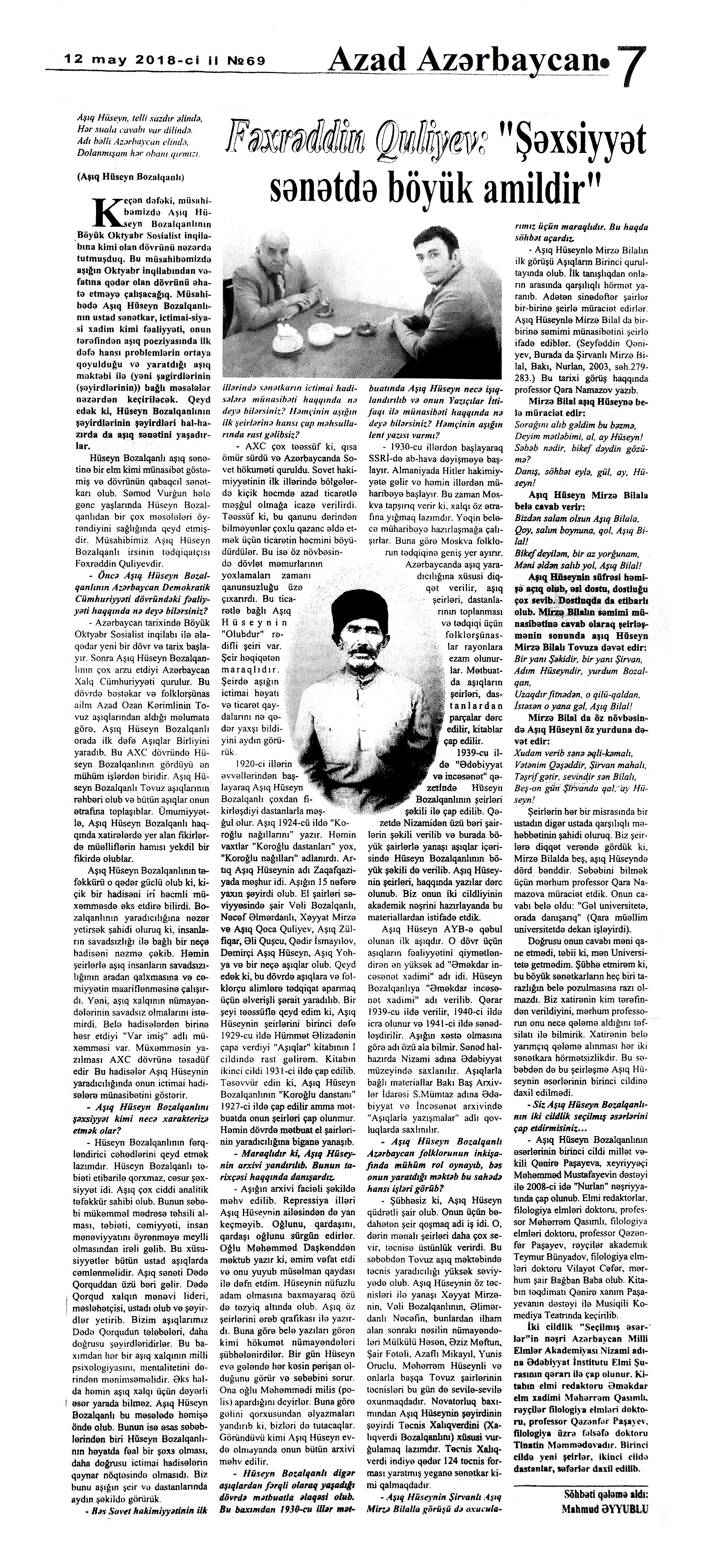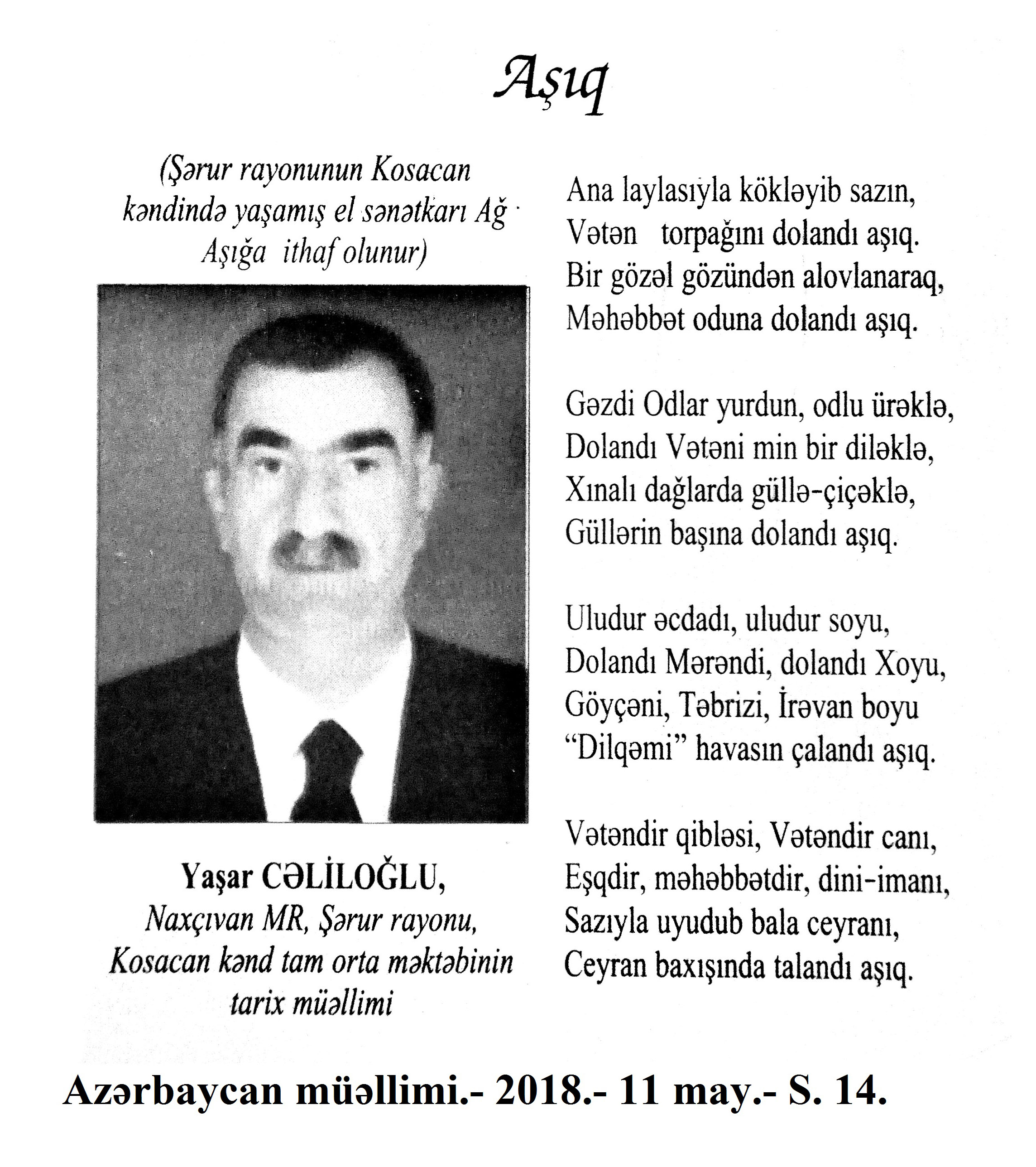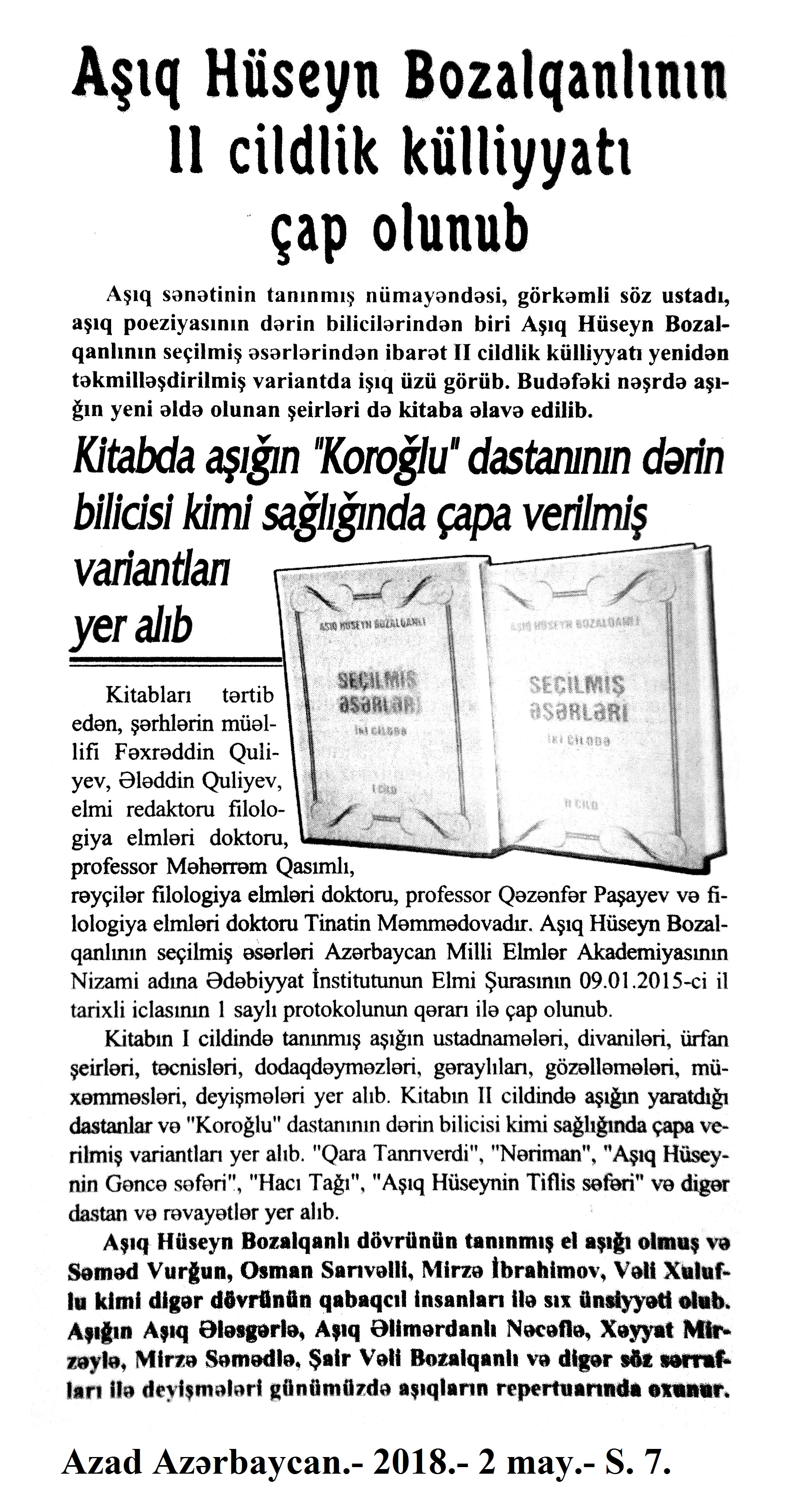 XALQ YARADICILIĞI 731. Aşıq Azər Xanlaroğlu dünyasını dəyişib //Mədəniyyət.-2018.- 16 may.- S.11. 732. Aşıq Məhəmməd Şıxlının yubileyi qeyd edilib: [Dövlət Mahnı Teatrında] //Mədəniyyət.-2018.- 16 may.- S.4. 733. “Aşıq musiqisi axşamları” layihəsinə yekun vuruldu: [Beynəlxalq Muğam Mərkəzində] //525-ci qəzet.- 2018.- 31 may.- S.6. 734. “Dastan gecələri”ndə “Leyli və Məcnun”: [Muğam Mərkəzində “Dastan gecələri” layihəsi çərçivəsində eyniadlı dastanın təqdimatı haqqında] //Mədəniyyət.-2018.- 25 may.- S.2. 735. Fəxrəddin Quliyev: Şəxsiyyət sənətdə böyük amildir: [aşıq Bozalqanlı irsinin tədqiqatçısının müsahibəsi] /müsahibəni apardı Mahmud Əyyublu //Azad Azərbaycan.- 2018.- 12 may.- S.7.; Palitra.- 2018.- 11 may.- S.13. 736. Quliyev, T. Aşıq Hüseyn Bozalqanlının II cildlik külliyatı çap olunub //Azad Azərbaycan.- 2018.- 2 may.- S.7. Aşıq Şəmşir – 125 737. Aşıq Şəmşirin ədəbi dünyası: [regionlarda Aşıq Şəmşirin 125 illiyinə həsr olunmuş eyniadlı tədbirlərin keçirilməsi haqqında] //Mədəniyyət.- 2018.- 2 may.- S.7. 738. Aşıq Şəmşirin 125 illiyinə həsr edilmiş tədbir: [Saatlı Rayon Mərkəzi Kitabxanasında] //Mədəniyyət.- 2018.- 11 may.- S.6. 739. Əliyeva, A. Yetsə qulağına Şəmşirin səsi...: Görkəmli saz-söz ustadının zəngin yaradıcılığı bu gün də aktuallığını qoruyub saxlayır: Aşıq Şəmşir – 125 //Mədəniyyət.- 2018.- 4 may.- S.13.