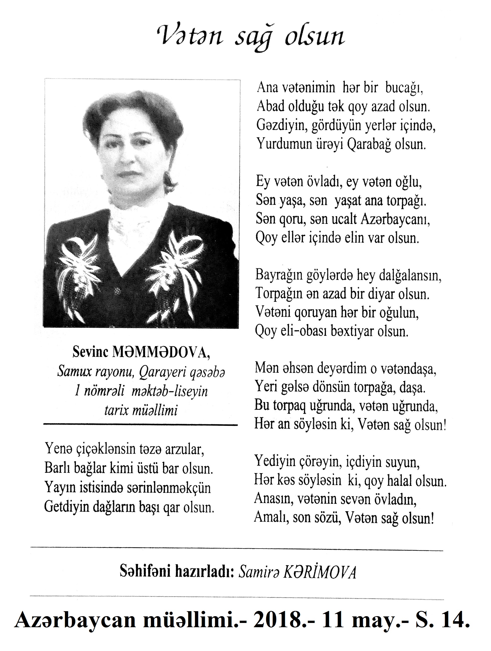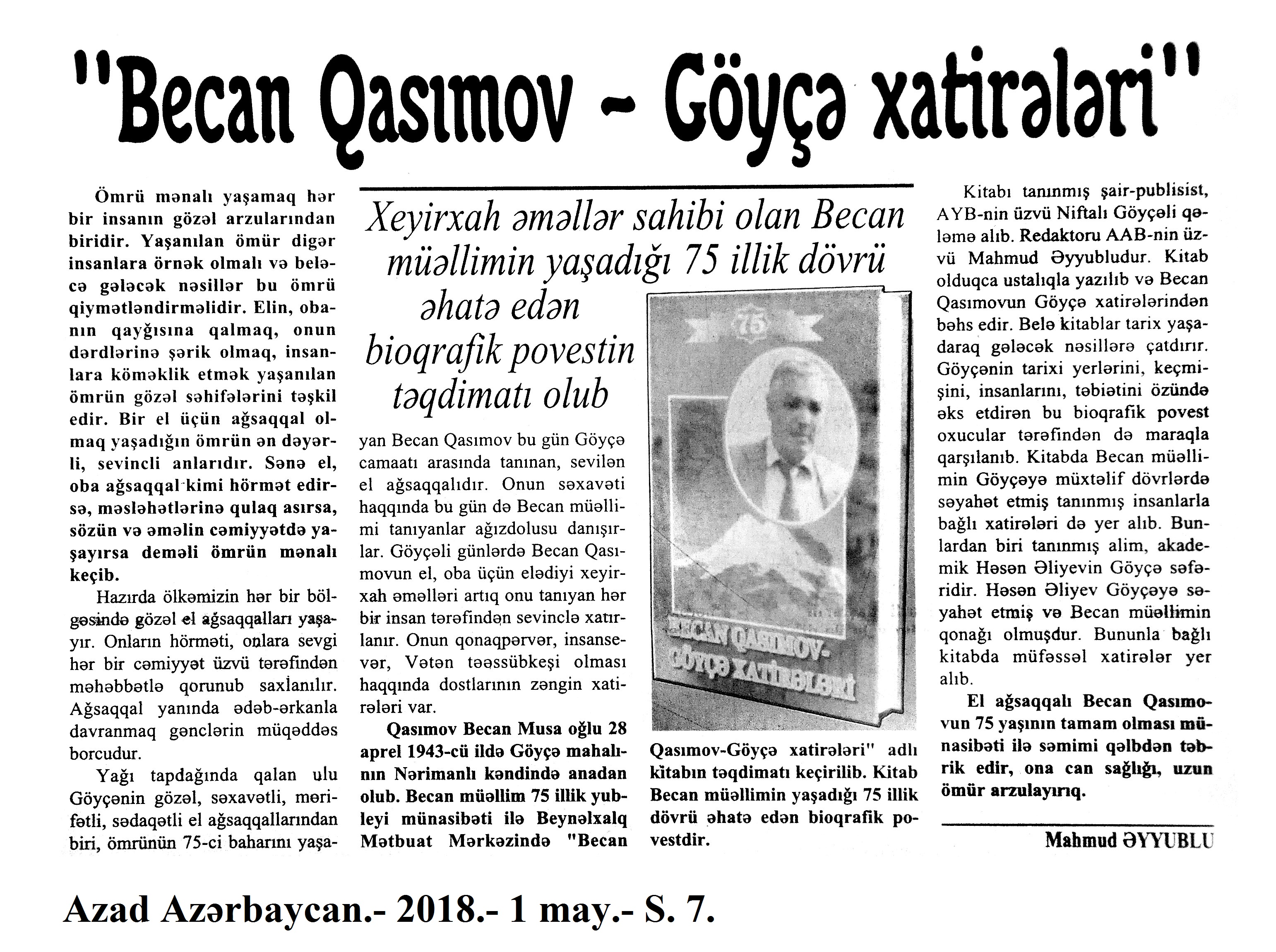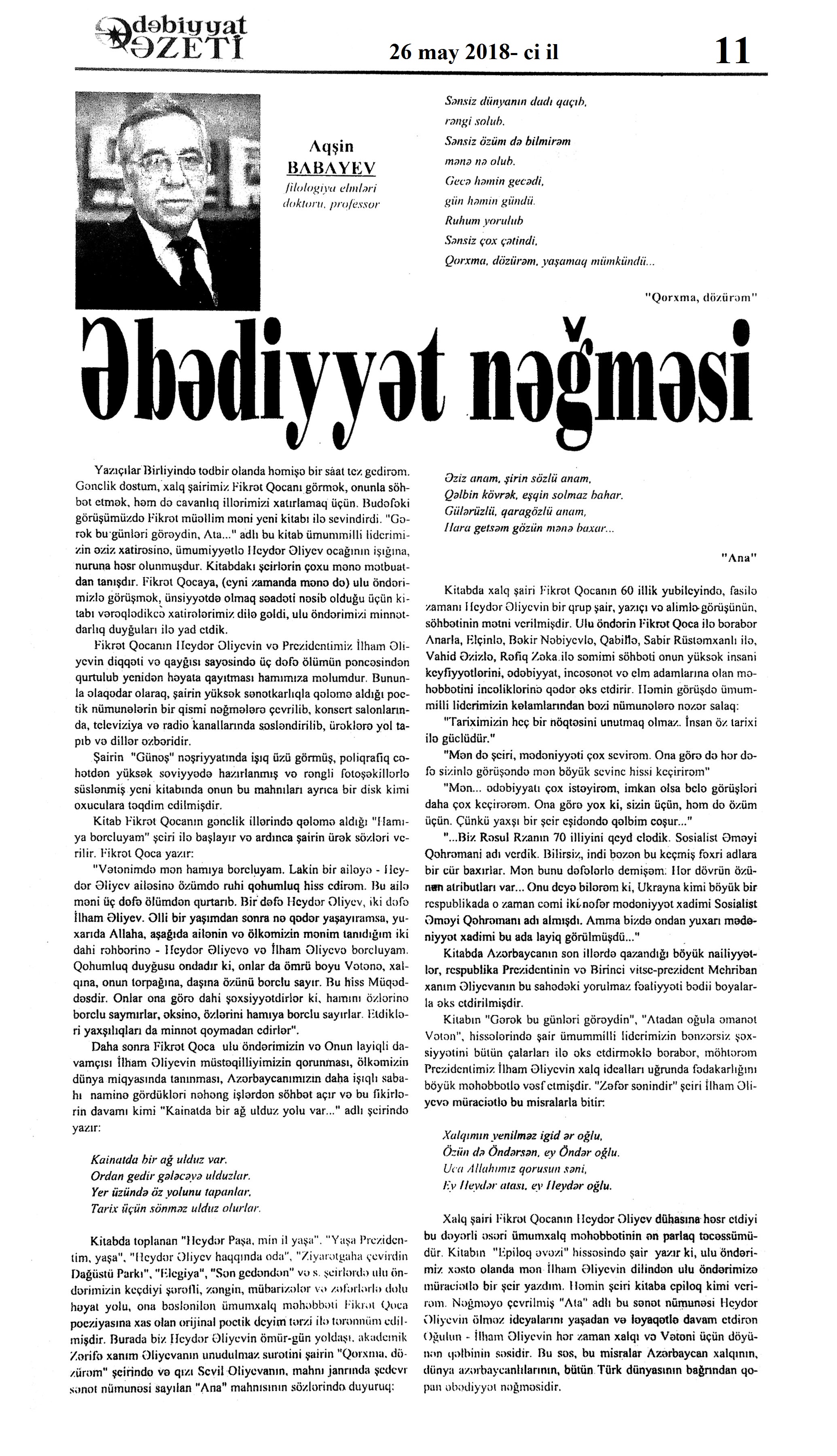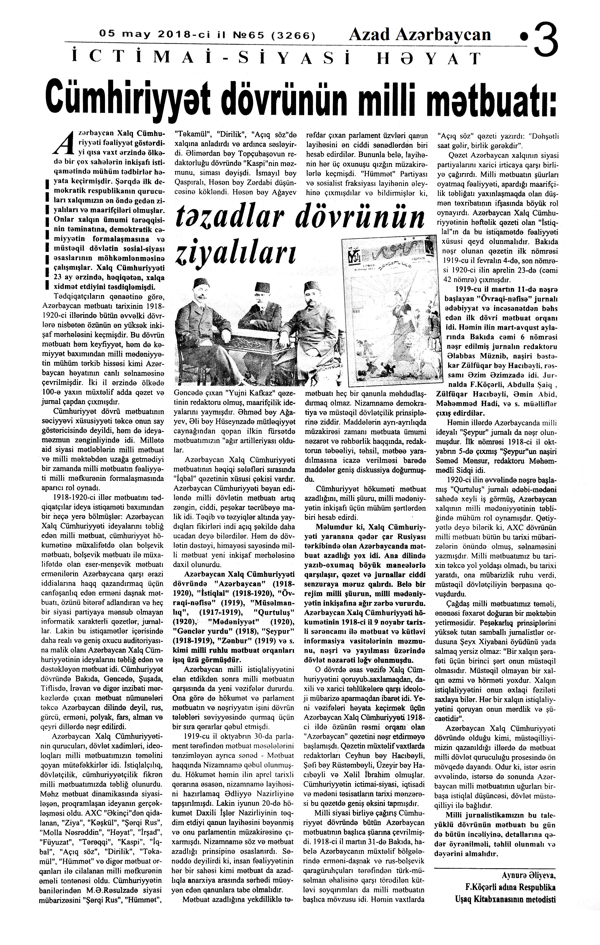 kitabı haqqında] 1021. Əyyublu, M. Nərimanovun siyasi bioqrafiyası cox zəngindir: Firdovsiyyə Əhmədova: Bəzən Nərimanovu Şərq dünyasında məscid tribunasının yaradıcısı kimi dəyərləndirirlər: [tarix üzrə fəlsəfə doktoru, Əməkdar müəllimlə müsahibə] /müsahibəni apardı Mahmud Əyyublu //Azad Azərbaycan.- 2018.- 8 may.- S.6. 1022. Fərəcov, S. “Yaşıl qələm”dən keçən qara tale: [publisist, nasir və dramaturq Mustafa bəy Əlibəyov haqqında] //Mədəniyyət.- 2018.-2 may.- S.12. 1023. Günay Reyhan: Şeir mənim ruhumun səsidir və ruhu dindirən də Tanrıdır: [gənc şairə ilə müsahibə] /müsahibəni apardı Mahmud Əyyublu //Palitra.- 2018.- 24 may.- S.13. 1024. Hacı K. Zamanımızın müdriki: Aqşin Babayevin “O biri dünyanın astanasında” kitabını oxuyarkən //Ədəbiyyat qəzeti.- 2018.- 12 may.- S.9. 1025. Hacıyeva, A. Heydər Hüseynov Həsən bəy Zərdabinin Lev Tolstoya məktubu barədə: bugünümüzdən baxış: Akademik Heydər Hüseynov – 110 //Xalq qəzeti.-2018.- 13 may.- S.6. 1026. Hafiz Əli: [tanınmış şairin vəfatı ilə bağlı AYB-nin başsağlığı] //Ədəbiyyat qəzeti.- 2018.- 19 may.- S.30. 1027. Xaçınçaylı, Q. Leninqraddan Avstriyayadək döyüş yolu keçmişəm //Həftə içi.-2018.- 5-7 may.- S.5. 1028. Xaçınçaylı, Q. Mənim qəhrəman qardaşım: [Qarabağda həlak olmuş döyüşçü Səməndər Əhmədov haqqında] //Həftə içi.- 2018.- 22 may.- S.7. 1029. Xalq şairi Balaş Azəroğlu və “21 Azər hərəkatı” //Kredo.-2018.- 31 may.- S.6. 1030. Xələfli, Ə. R. Bir ayrılıq odu var...: Şair Hüseyn Kürdoğlunun xatirəsinə poema-epos //Kredo.-2018.- 17 may.- S.8-9. 1031. Xəlil Rza Ulutürk: XX əsrdə türk xalqları üçün türkçülük ideologiyasından böyük amal olmayıb: [mərhum şairin Azər Turana məktubu] /təqdim etdi Azər Turan //Ədəbiyyat qəzeti.- 2018.- 26 may.- S.14-15. 1032. Xəlilzadə, F. Taleyimizin güzgüsü: [yazıçı Manaf Süleymanov haqqında] //Kaspi.-2018.- 22 may.- S.10. 1033. Xürrəmqızı, A. Şirvan elinin folklor fədaisi: [professor Seyfəddin Qəniyev haqqında] //Xalq cəbhəsi.-2018.- 5 may.- S.14. 1034. İdrisoğlu, A. “Statusman”ın özünəməxsusluğu: yazçı təxəyyülünün orijinallığı: [Hümbət Quliyevin eyniadlı kitabı haqqında] //Azad Azərbaycan.- 2018.- 22 may.- S.7. 1035. İsabəyli, Q. XX əsrin yəhudi uşaq ədəbiyyatının ən məşhur şairi: Lev Kvitko //Ədəbiyyat qəzeti.-2018.- 12 may.- S.24. 1036. İsmayıl. Sabir Azəri təkcə ədəbiyyatda deyil, publisistikada da öz sözünü deyib: O, 34 il ərzində mətbuatda, radioda jurnalistikanın inkişafına xidmət edib //Şərq.-2018.- 2 may.- S.11. 1037. Kamal Abdullanın “Yarımçıq əlyazma”sı.: Bakı Mühəndislik Unversitetində akademik Kamal Abdulla ilə görüş keçirilib //Azad Azərbaycan.-2018.-4 may.- S.5. 1038. Kamal, R. Məti Osmanoğlu: Ədəbiyyat yaddaş və düşüncə tipi kimi: [filoloqun yaradıcılığı haqqında] //Ədəbiyyat qəzeti.- 2018.- 6 may.- S.12. 1039. Kazımov, İ. Dilçilik terminlərinin izahlı lüğəti: [AMEA-nın Nəsimi adına Dilçilik İnstitutunun əməkdaşları professor S.Sadıqova, filologiya üzrə fəlsəfə doktorları N.Hüseynova, İ.Abdullayeva, S.Novruzova, Ş.Həsənli-Qəribova tərəfindən hazrlanan eyniadlı kitabın nəşri haqqında] //525-ci qəzet.-2018.- 23 may.- S.7. 1040. Kazımov, Q. Dünyanı daha aydın görən şair: [Əflatunun poeziyası haqqında] //525-ci qəzet.-2018.- 9 may.- S.7. 1041. Kazımov, Q. Təbiətə və insana, dərd içində boğulan dünyaya məhəbbətlə //Kredo.- 2018.- 3 may.- S.11;13. 1042. Kəramət. Ədəbi Zəkanın bu günü və gələcəyi: (Şair KƏRAMƏTLƏ gözlənilən söhbət) / müsahibəni apardı Zemfira Ədalətqızı //Ədalət.-2018.- 12 may.- S.13. 1043. Kərimli, X. Söz ömrünə calanan ömür: Vaqif Məmmədovun 70 illiyinə//525-ci qəzet.-2018.- 11 may.- S.8. 1044. Kərimova, A. “Milli yaddaş”ın izi ilə...: “Kaspi” liseyində Xalq şairi Sabir Rüstəmxanlı ilə şagirdlərin görüşü keçirildi //Kaspi.-2018.- 5-7 may.- S.17. 1045. “Kitab evi” İctimai Birliyi şair Adilə Nəzərin yeni kitabını təqdim edib: [“Beşinci mövsüm” şeirlər kitabı haqqında] //Ədəbiyyat qəzeti.- 2018.- 26 may.- S.32. 1046. Qabulzadə, A. Həmzət bəy Qəbulovun “Molla Nəsrəddin”dəki yazıları //525-ci qəzet.- 2018.- 1 may.- S.6. 1047. Qabulzadə, A. Həmzət bəy Qəbulovun “Molla Nəsrəddin”dəki yazıları //525-ci qəzet.- 2018.- 2 may.- S.6. 1048. Qabulzadə, A. Həmzət bəy Qəbulovun “Molla Nəsrəddin”dəki yazıları: Həmzət bəy Qəbulov-Şirvanlı haqqında bir neçə söz //525-ci qəzet.- 2018.- 3 may.- S.6. 1049. Qaliboğlu, E. Bəhlul Bəhcətin faciəvi taleyi: [folklorşünas haqqında] //Xalq cəbhəsi.- 2018.- 4 may.- S.14. 1050. Qaliboğlu, E. Mirəli Seyidov – Azərbaycan türklərinin tarixinə kompleks yanaşan alim //Xalq cəbhəsi.-2018.- 1 may.- S.14. 1051. Qaliboğlu, S. “Anna Axmatova və Şərq”: [filologiya üzrə fəlsəfə doktoru Aynur Nəcəfovanın eyniadlı kitabı haqqında] //Mədəniyyət.- 2018.- 16 may. - S.13. 1052. Qaraoğlu, F. Tarixdə iz buraxanlar: Fyodor Dostoyevski: [rus yazıçısı haqqında] //Bakı Xəbər.-2018.- 26-29 may.- S.15. 1053. Qaraoğlu, F. Tarixdə iz buraxanlar: Mirvarid Dilbazi //Bakı Xəbər.-2018.- 12-14 may.- S.12. 1054. Qaraoğlu, F. Tarixdə iz buraxanlar: Qasım bəy Zakir //Bakı Xəbər.-2018.- 16may.- S.13. 1055. Qaraoğlu, F. Tarixdə iz buraxanlar: Mirzə Şəfi Vazeh //Bakı Xəbər.-2018.- 22 may.- S.15. 1056. Qaraoğlu, F. Tarixi şəxsiyyət Şah İsmayıl Xətai... //Bakı Xəbər.- 2018.- 19-21 may.- S.15. 1057. Qasımov, R. Türk-İslam mədəniyyətinin paytaxtı Naxçıvan və XI əsr şairimiz Qətran Təbrizi //525-ci qəzet.-2018.- 18 may.- S.6. 1058. Qismət, A. Nasirlər