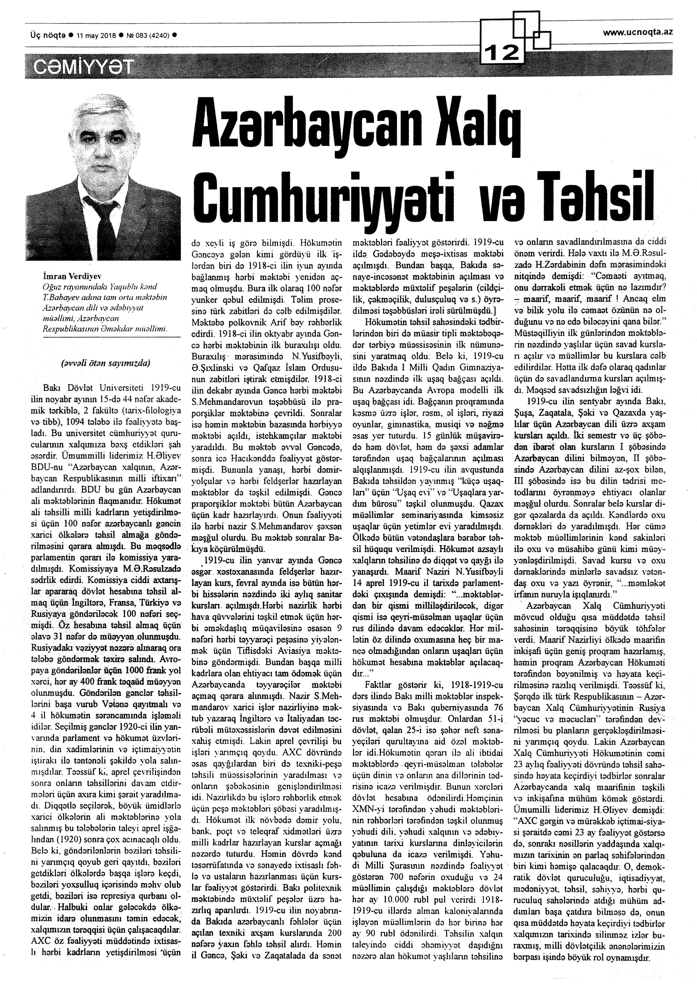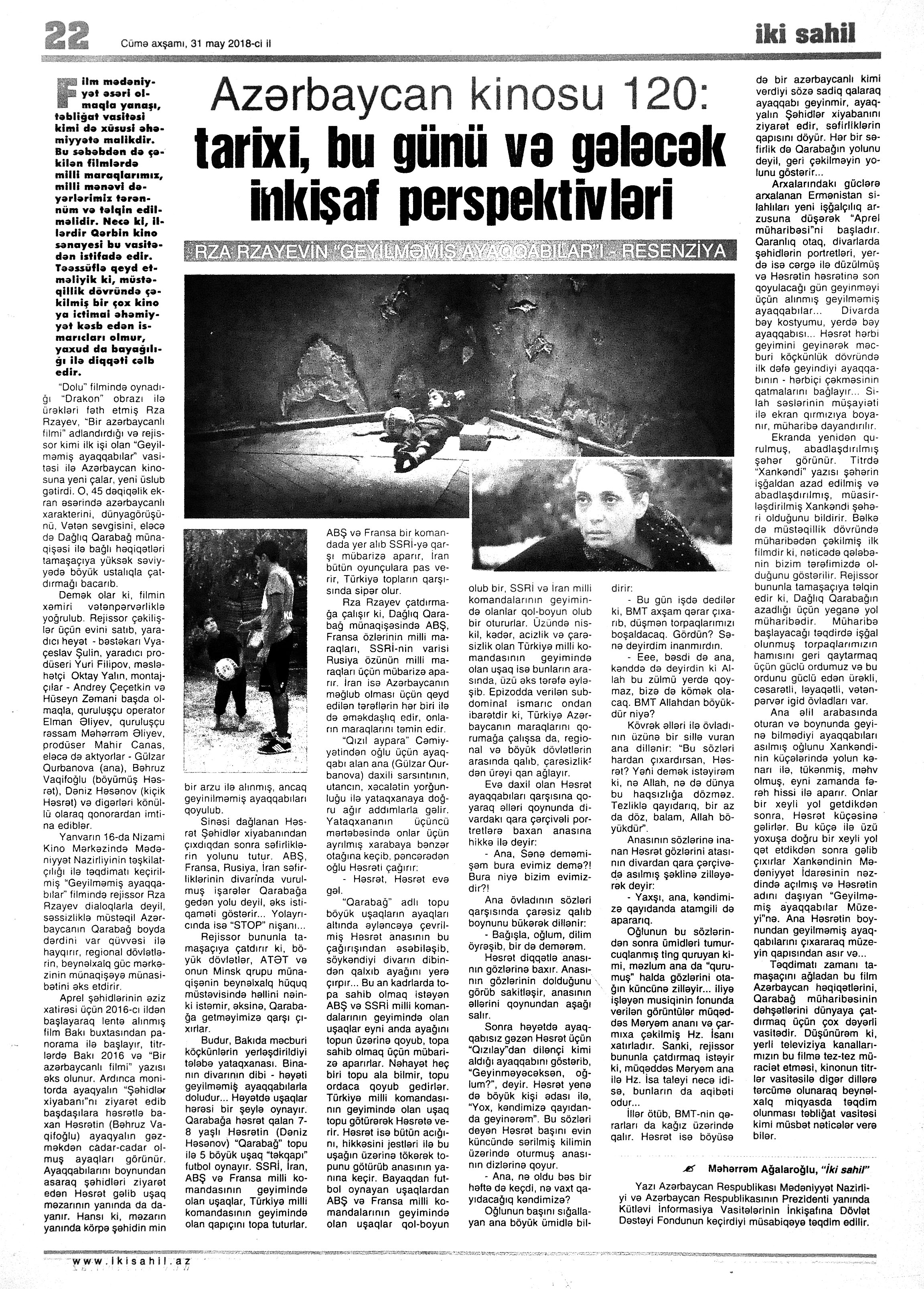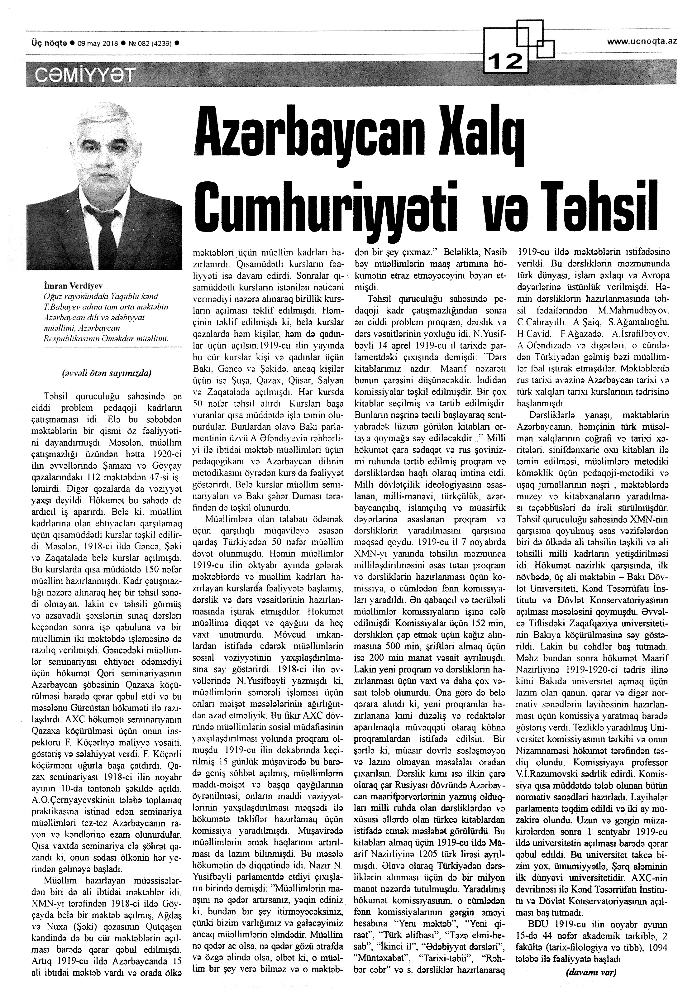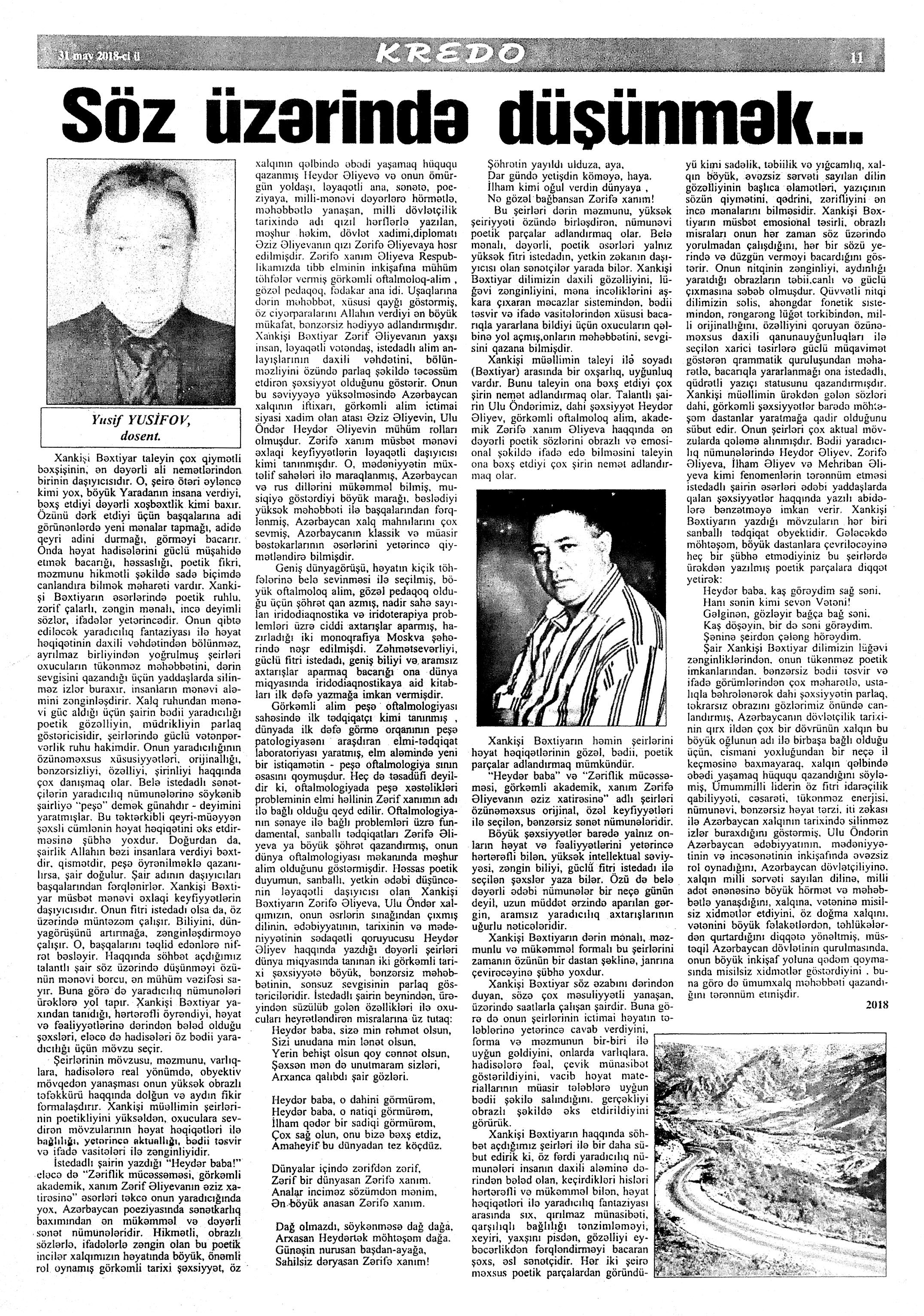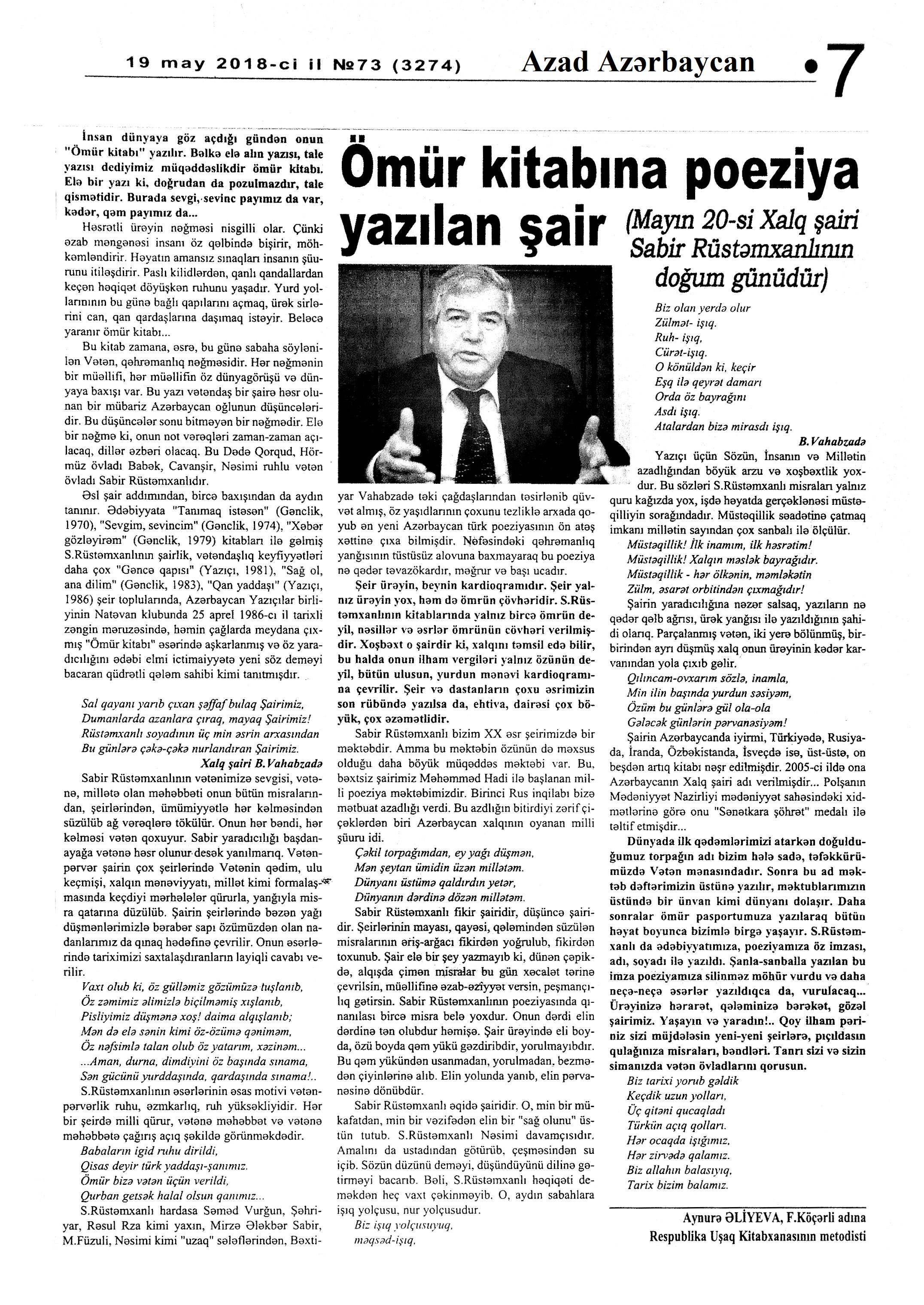 kitabı haqqında] 1021. Əyyublu, M. Nərimanovun siyasi bioqrafiyası cox zəngindir: Firdovsiyyə Əhmədova: Bəzən Nərimanovu Şərq dünyasında məscid tribunasının yaradıcısı kimi dəyərləndirirlər: [tarix üzrə fəlsəfə doktoru, Əməkdar müəllimlə müsahibə] /müsahibəni apardı Mahmud Əyyublu //Azad Azərbaycan.- 2018.- 8 may.- S.6. 1022. Fərəcov, S. “Yaşıl qələm”dən keçən qara tale: [publisist, nasir və dramaturq Mustafa bəy Əlibəyov haqqında] //Mədəniyyət.- 2018.-2 may.- S.12. 1023. Günay Reyhan: Şeir mənim ruhumun səsidir və ruhu dindirən də Tanrıdır: [gənc şairə ilə müsahibə] /müsahibəni apardı Mahmud Əyyublu //Palitra.- 2018.- 24 may.- S.13. 1024. Hacı K. Zamanımızın müdriki: Aqşin Babayevin “O biri dünyanın astanasında” kitabını oxuyarkən //Ədəbiyyat qəzeti.- 2018.- 12 may.- S.9. 1025. Hacıyeva, A. Heydər Hüseynov Həsən bəy Zərdabinin Lev Tolstoya məktubu barədə: bugünümüzdən baxış: Akademik Heydər Hüseynov – 110 //Xalq qəzeti.-2018.- 13 may.- S.6. 1026. Hafiz Əli: [tanınmış şairin vəfatı ilə bağlı AYB-nin başsağlığı] //Ədəbiyyat qəzeti.- 2018.- 19 may.- S.30. 1027. Xaçınçaylı, Q. Leninqraddan Avstriyayadək döyüş yolu keçmişəm //Həftə içi.-2018.- 5-7 may.- S.5. 1028. Xaçınçaylı, Q. Mənim qəhrəman qardaşım: [Qarabağda həlak olmuş döyüşçü Səməndər Əhmədov haqqında] //Həftə içi.- 2018.- 22 may.- S.7. 1029. Xalq şairi Balaş Azəroğlu və “21 Azər hərəkatı” //Kredo.-2018.- 31 may.- S.6. 1030. Xələfli, Ə. R. Bir ayrılıq odu var...: Şair Hüseyn Kürdoğlunun xatirəsinə poema-epos //Kredo.-2018.- 17 may.- S.8-9. 1031. Xəlil Rza Ulutürk: XX əsrdə türk xalqları üçün türkçülük ideologiyasından böyük amal olmayıb: [mərhum şairin Azər Turana məktubu] /təqdim etdi Azər Turan //Ədəbiyyat qəzeti.- 2018.- 26 may.- S.14-15. 1032. Xəlilzadə, F. Taleyimizin güzgüsü: [yazıçı Manaf Süleymanov haqqında] //Kaspi.-2018.- 22 may.- S.10. 1033. Xürrəmqızı, A. Şirvan elinin folklor fədaisi: [professor Seyfəddin Qəniyev haqqında] //Xalq cəbhəsi.-2018.- 5 may.- S.14. 1034. İdrisoğlu, A. “Statusman”ın özünəməxsusluğu: yazçı təxəyyülünün orijinallığı: [Hümbət Quliyevin eyniadlı kitabı haqqında] //Azad Azərbaycan.- 2018.- 22 may.- S.7. 1035. İsabəyli, Q. XX əsrin yəhudi uşaq ədəbiyyatının ən məşhur şairi: Lev Kvitko //Ədəbiyyat qəzeti.-2018.- 12 may.- S.24. 1036. İsmayıl. Sabir Azəri təkcə ədəbiyyatda deyil, publisistikada da öz sözünü deyib: O, 34 il ərzində mətbuatda, radioda jurnalistikanın inkişafına xidmət edib //Şərq.-2018.- 2 may.- S.11. 1037. Kamal Abdullanın “Yarımçıq əlyazma”sı.: Bakı Mühəndislik Unversitetində akademik Kamal Abdulla ilə görüş keçirilib //Azad Azərbaycan.-2018.-4 may.- S.5. 1038. Kamal, R. Məti Osmanoğlu: Ədəbiyyat yaddaş və düşüncə tipi kimi: [filoloqun yaradıcılığı haqqında] //Ədəbiyyat qəzeti.- 2018.- 6 may.- S.12. 1039. Kazımov, İ. Dilçilik terminlərinin izahlı lüğəti: [AMEA-nın Nəsimi adına Dilçilik İnstitutunun əməkdaşları professor S.Sadıqova, filologiya üzrə fəlsəfə doktorları N.Hüseynova, İ.Abdullayeva, S.Novruzova, Ş.Həsənli-Qəribova tərəfindən hazrlanan eyniadlı kitabın nəşri haqqında] //525-ci qəzet.-2018.- 23 may.- S.7. 1040. Kazımov, Q. Dünyanı daha aydın görən şair: [Əflatunun poeziyası haqqında] //525-ci qəzet.-2018.- 9 may.- S.7. 1041. Kazımov, Q. Təbiətə və insana, dərd içində boğulan dünyaya məhəbbətlə //Kredo.- 2018.- 3 may.- S.11;13. 1042. Kəramət. Ədəbi Zəkanın bu günü və gələcəyi: (Şair KƏRAMƏTLƏ gözlənilən söhbət) / müsahibəni apardı Zemfira Ədalətqızı //Ədalət.-2018.- 12 may.- S.13. 1043. Kərimli, X. Söz ömrünə calanan ömür: Vaqif Məmmədovun 70 illiyinə//525-ci qəzet.-2018.- 11 may.- S.8. 1044. Kərimova, A. “Milli yaddaş”ın izi ilə...: “Kaspi” liseyində Xalq şairi Sabir Rüstəmxanlı ilə şagirdlərin görüşü keçirildi //Kaspi.-2018.- 5-7 may.- S.17. 1045. “Kitab evi” İctimai Birliyi şair Adilə Nəzərin yeni kitabını təqdim edib: [“Beşinci mövsüm” şeirlər kitabı haqqında] //Ədəbiyyat qəzeti.- 2018.- 26 may.- S.32. 1046. Qabulzadə, A. Həmzət bəy Qəbulovun “Molla Nəsrəddin”dəki yazıları //525-ci qəzet.- 2018.- 1 may.- S.6. 1047. Qabulzadə, A. Həmzət bəy Qəbulovun “Molla Nəsrəddin”dəki yazıları //525-ci qəzet.- 2018.- 2 may.- S.6. 1048. Qabulzadə, A. Həmzət bəy Qəbulovun “Molla Nəsrəddin”dəki yazıları: Həmzət bəy Qəbulov-Şirvanlı haqqında bir neçə söz //525-ci qəzet.- 2018.- 3 may.- S.6. 1049. Qaliboğlu, E. Bəhlul Bəhcətin faciəvi taleyi: [folklorşünas haqqında] //Xalq cəbhəsi.- 2018.- 4 may.- S.14. 1050. Qaliboğlu, E. Mirəli Seyidov – Azərbaycan türklərinin tarixinə kompleks yanaşan alim //Xalq cəbhəsi.-2018.- 1 may.- S.14. 1051. Qaliboğlu, S. “Anna Axmatova və Şərq”: [filologiya üzrə fəlsəfə doktoru Aynur Nəcəfovanın eyniadlı kitabı haqqında] //Mədəniyyət.- 2018.- 16 may. - S.13. 1052. Qaraoğlu, F. Tarixdə iz buraxanlar: Fyodor Dostoyevski: [rus yazıçısı haqqında] //Bakı Xəbər.-2018.- 26-29 may.- S.15. 1053. Qaraoğlu, F. Tarixdə iz buraxanlar: Mirvarid Dilbazi //Bakı Xəbər.-2018.- 12-14 may.- S.12. 1054. Qaraoğlu, F. Tarixdə iz buraxanlar: Qasım bəy Zakir //Bakı Xəbər.-2018.- 16may.- S.13. 1055. Qaraoğlu, F. Tarixdə iz buraxanlar: Mirzə Şəfi Vazeh //Bakı Xəbər.-2018.- 22 may.- S.15. 1056. Qaraoğlu, F. Tarixi şəxsiyyət Şah İsmayıl Xətai... //Bakı Xəbər.- 2018.- 19-21 may.- S.15. 1057. Qasımov, R. Türk-İslam mədəniyyətinin paytaxtı Naxçıvan və XI əsr şairimiz Qətran Təbrizi //525-ci qəzet.-2018.- 18 may.- S.6. 1058. Qismət, A. Nasirlər