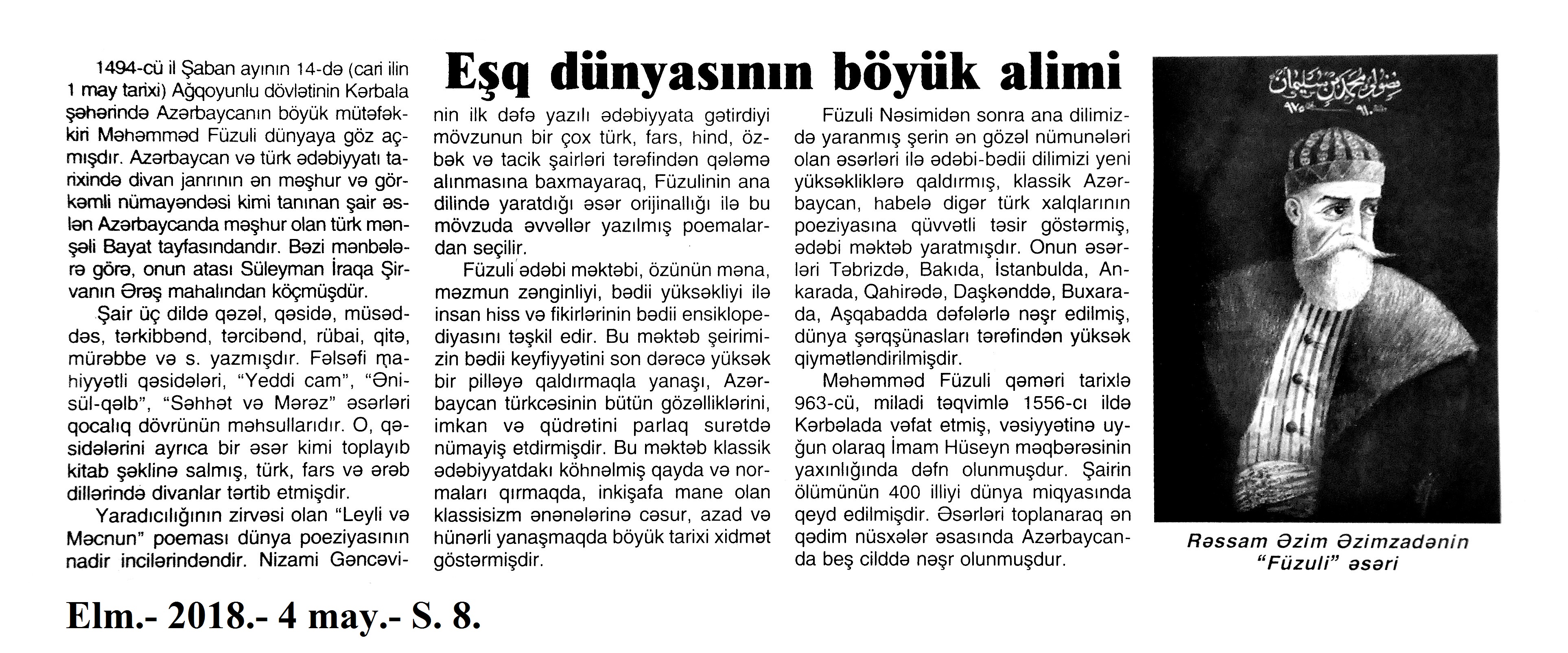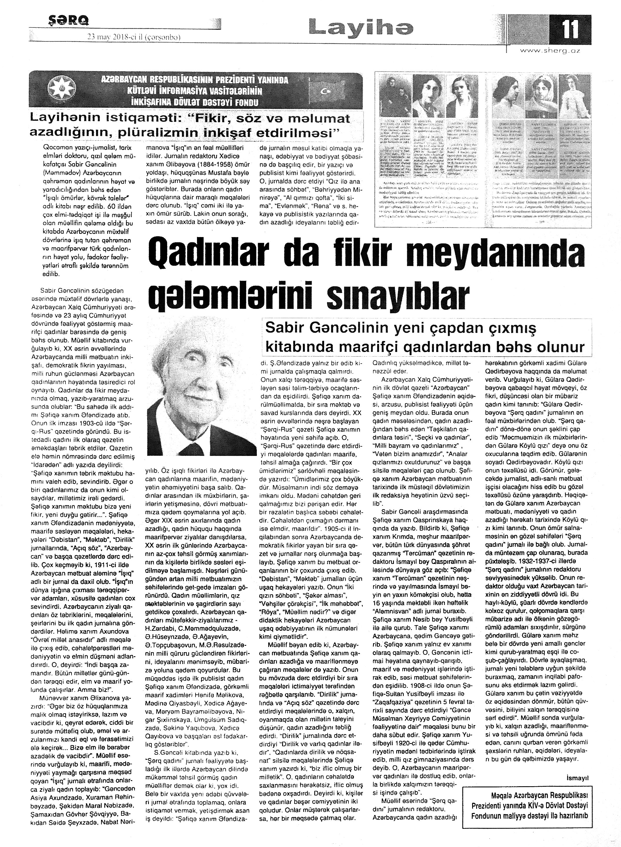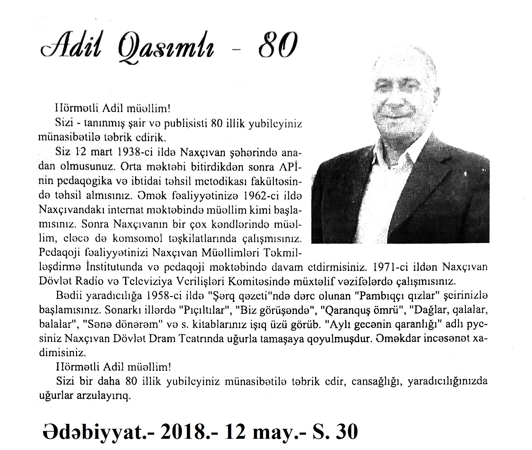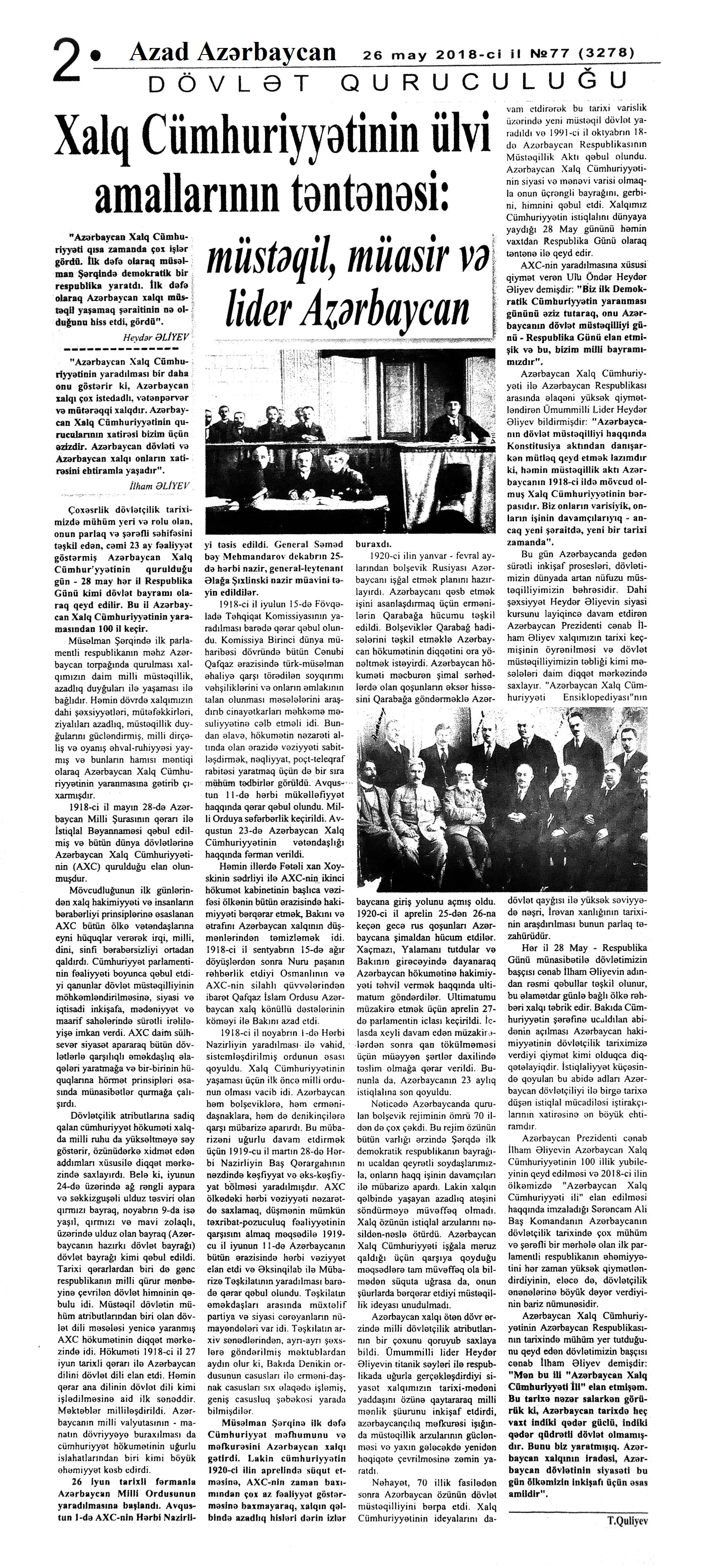 kitabı haqqında] 1021. Əyyublu, M. Nərimanovun siyasi bioqrafiyası cox zəngindir: Firdovsiyyə Əhmədova: Bəzən Nərimanovu Şərq dünyasında məscid tribunasının yaradıcısı kimi dəyərləndirirlər: [tarix üzrə fəlsəfə doktoru, Əməkdar müəllimlə müsahibə] /müsahibəni apardı Mahmud Əyyublu //Azad Azərbaycan.- 2018.- 8 may.- S.6. 1022. Fərəcov, S. “Yaşıl qələm”dən keçən qara tale: [publisist, nasir və dramaturq Mustafa bəy Əlibəyov haqqında] //Mədəniyyət.- 2018.-2 may.- S.12. 1023. Günay Reyhan: Şeir mənim ruhumun səsidir və ruhu dindirən də Tanrıdır: [gənc şairə ilə müsahibə] /müsahibəni apardı Mahmud Əyyublu //Palitra.- 2018.- 24 may.- S.13. 1024. Hacı K. Zamanımızın müdriki: Aqşin Babayevin “O biri dünyanın astanasında” kitabını oxuyarkən //Ədəbiyyat qəzeti.- 2018.- 12 may.- S.9. 1025. Hacıyeva, A. Heydər Hüseynov Həsən bəy Zərdabinin Lev Tolstoya məktubu barədə: bugünümüzdən baxış: Akademik Heydər Hüseynov – 110 //Xalq qəzeti.-2018.- 13 may.- S.6. 1026. Hafiz Əli: [tanınmış şairin vəfatı ilə bağlı AYB-nin başsağlığı] //Ədəbiyyat qəzeti.- 2018.- 19 may.- S.30. 1027. Xaçınçaylı, Q. Leninqraddan Avstriyayadək döyüş yolu keçmişəm //Həftə içi.-2018.- 5-7 may.- S.5. 1028. Xaçınçaylı, Q. Mənim qəhrəman qardaşım: [Qarabağda həlak olmuş döyüşçü Səməndər Əhmədov haqqında] //Həftə içi.- 2018.- 22 may.- S.7. 1029. Xalq şairi Balaş Azəroğlu və “21 Azər hərəkatı” //Kredo.-2018.- 31 may.- S.6. 1030. Xələfli, Ə. R. Bir ayrılıq odu var...: Şair Hüseyn Kürdoğlunun xatirəsinə poema-epos //Kredo.-2018.- 17 may.- S.8-9. 1031. Xəlil Rza Ulutürk: XX əsrdə türk xalqları üçün türkçülük ideologiyasından böyük amal olmayıb: [mərhum şairin Azər Turana məktubu] /təqdim etdi Azər Turan //Ədəbiyyat qəzeti.- 2018.- 26 may.- S.14-15. 1032. Xəlilzadə, F. Taleyimizin güzgüsü: [yazıçı Manaf Süleymanov haqqında] //Kaspi.-2018.- 22 may.- S.10. 1033. Xürrəmqızı, A. Şirvan elinin folklor fədaisi: [professor Seyfəddin Qəniyev haqqında] //Xalq cəbhəsi.-2018.- 5 may.- S.14. 1034. İdrisoğlu, A. “Statusman”ın özünəməxsusluğu: yazçı təxəyyülünün orijinallığı: [Hümbət Quliyevin eyniadlı kitabı haqqında] //Azad Azərbaycan.- 2018.- 22 may.- S.7. 1035. İsabəyli, Q. XX əsrin yəhudi uşaq ədəbiyyatının ən məşhur şairi: Lev Kvitko //Ədəbiyyat qəzeti.-2018.- 12 may.- S.24. 1036. İsmayıl. Sabir Azəri təkcə ədəbiyyatda deyil, publisistikada da öz sözünü deyib: O, 34 il ərzində mətbuatda, radioda jurnalistikanın inkişafına xidmət edib //Şərq.-2018.- 2 may.- S.11. 1037. Kamal Abdullanın “Yarımçıq əlyazma”sı.: Bakı Mühəndislik Unversitetində akademik Kamal Abdulla ilə görüş keçirilib //Azad Azərbaycan.-2018.-4 may.- S.5. 1038. Kamal, R. Məti Osmanoğlu: Ədəbiyyat yaddaş və düşüncə tipi kimi: [filoloqun yaradıcılığı haqqında] //Ədəbiyyat qəzeti.- 2018.- 6 may.- S.12. 1039. Kazımov, İ. Dilçilik terminlərinin izahlı lüğəti: [AMEA-nın Nəsimi adına Dilçilik İnstitutunun əməkdaşları professor S.Sadıqova, filologiya üzrə fəlsəfə doktorları N.Hüseynova, İ.Abdullayeva, S.Novruzova, Ş.Həsənli-Qəribova tərəfindən hazrlanan eyniadlı kitabın nəşri haqqında] //525-ci qəzet.-2018.- 23 may.- S.7. 1040. Kazımov, Q. Dünyanı daha aydın görən şair: [Əflatunun poeziyası haqqında] //525-ci qəzet.-2018.- 9 may.- S.7. 1041. Kazımov, Q. Təbiətə və insana, dərd içində boğulan dünyaya məhəbbətlə //Kredo.- 2018.- 3 may.- S.11;13. 1042. Kəramət. Ədəbi Zəkanın bu günü və gələcəyi: (Şair KƏRAMƏTLƏ gözlənilən söhbət) / müsahibəni apardı Zemfira Ədalətqızı //Ədalət.-2018.- 12 may.- S.13. 1043. Kərimli, X. Söz ömrünə calanan ömür: Vaqif Məmmədovun 70 illiyinə//525-ci qəzet.-2018.- 11 may.- S.8. 1044. Kərimova, A. “Milli yaddaş”ın izi ilə...: “Kaspi” liseyində Xalq şairi Sabir Rüstəmxanlı ilə şagirdlərin görüşü keçirildi //Kaspi.-2018.- 5-7 may.- S.17. 1045. “Kitab evi” İctimai Birliyi şair Adilə Nəzərin yeni kitabını təqdim edib: [“Beşinci mövsüm” şeirlər kitabı haqqında] //Ədəbiyyat qəzeti.- 2018.- 26 may.- S.32. 1046. Qabulzadə, A. Həmzət bəy Qəbulovun “Molla Nəsrəddin”dəki yazıları //525-ci qəzet.- 2018.- 1 may.- S.6. 1047. Qabulzadə, A. Həmzət bəy Qəbulovun “Molla Nəsrəddin”dəki yazıları //525-ci qəzet.- 2018.- 2 may.- S.6. 1048. Qabulzadə, A. Həmzət bəy Qəbulovun “Molla Nəsrəddin”dəki yazıları: Həmzət bəy Qəbulov-Şirvanlı haqqında bir neçə söz //525-ci qəzet.- 2018.- 3 may.- S.6. 1049. Qaliboğlu, E. Bəhlul Bəhcətin faciəvi taleyi: [folklorşünas haqqında] //Xalq cəbhəsi.- 2018.- 4 may.- S.14. 1050. Qaliboğlu, E. Mirəli Seyidov – Azərbaycan türklərinin tarixinə kompleks yanaşan alim //Xalq cəbhəsi.-2018.- 1 may.- S.14. 1051. Qaliboğlu, S. “Anna Axmatova və Şərq”: [filologiya üzrə fəlsəfə doktoru Aynur Nəcəfovanın eyniadlı kitabı haqqında] //Mədəniyyət.- 2018.- 16 may. - S.13. 1052. Qaraoğlu, F. Tarixdə iz buraxanlar: Fyodor Dostoyevski: [rus yazıçısı haqqında] //Bakı Xəbər.-2018.- 26-29 may.- S.15. 1053. Qaraoğlu, F. Tarixdə iz buraxanlar: Mirvarid Dilbazi //Bakı Xəbər.-2018.- 12-14 may.- S.12. 1054. Qaraoğlu, F. Tarixdə iz buraxanlar: Qasım bəy Zakir //Bakı Xəbər.-2018.- 16may.- S.13. 1055. Qaraoğlu, F. Tarixdə iz buraxanlar: Mirzə Şəfi Vazeh //Bakı Xəbər.-2018.- 22 may.- S.15. 1056. Qaraoğlu, F. Tarixi şəxsiyyət Şah İsmayıl Xətai... //Bakı Xəbər.- 2018.- 19-21 may.- S.15. 1057. Qasımov, R. Türk-İslam mədəniyyətinin paytaxtı Naxçıvan və XI əsr şairimiz Qətran Təbrizi //525-ci qəzet.-2018.- 18 may.- S.6. 1058. Qismət, A. Nasirlər