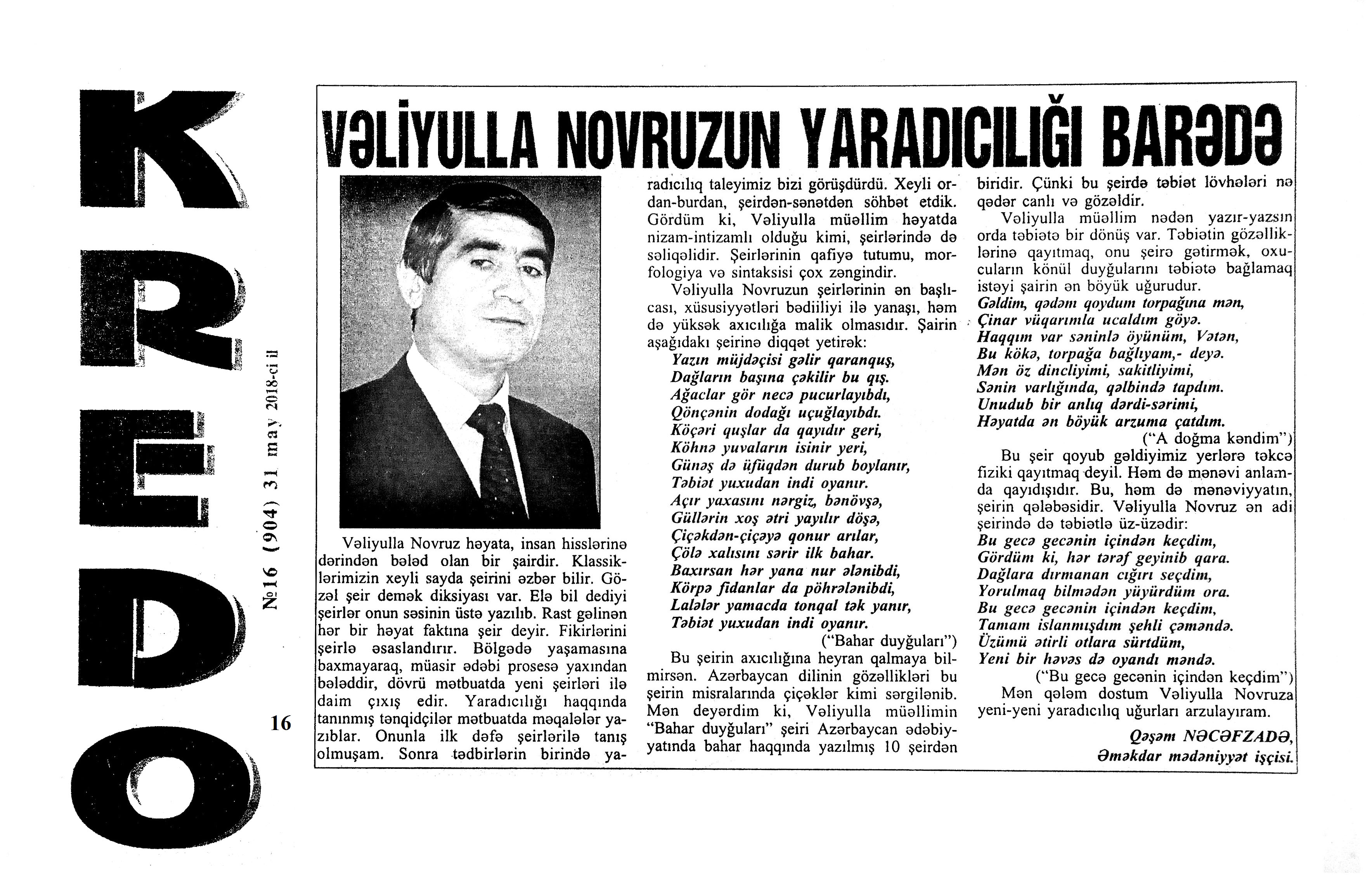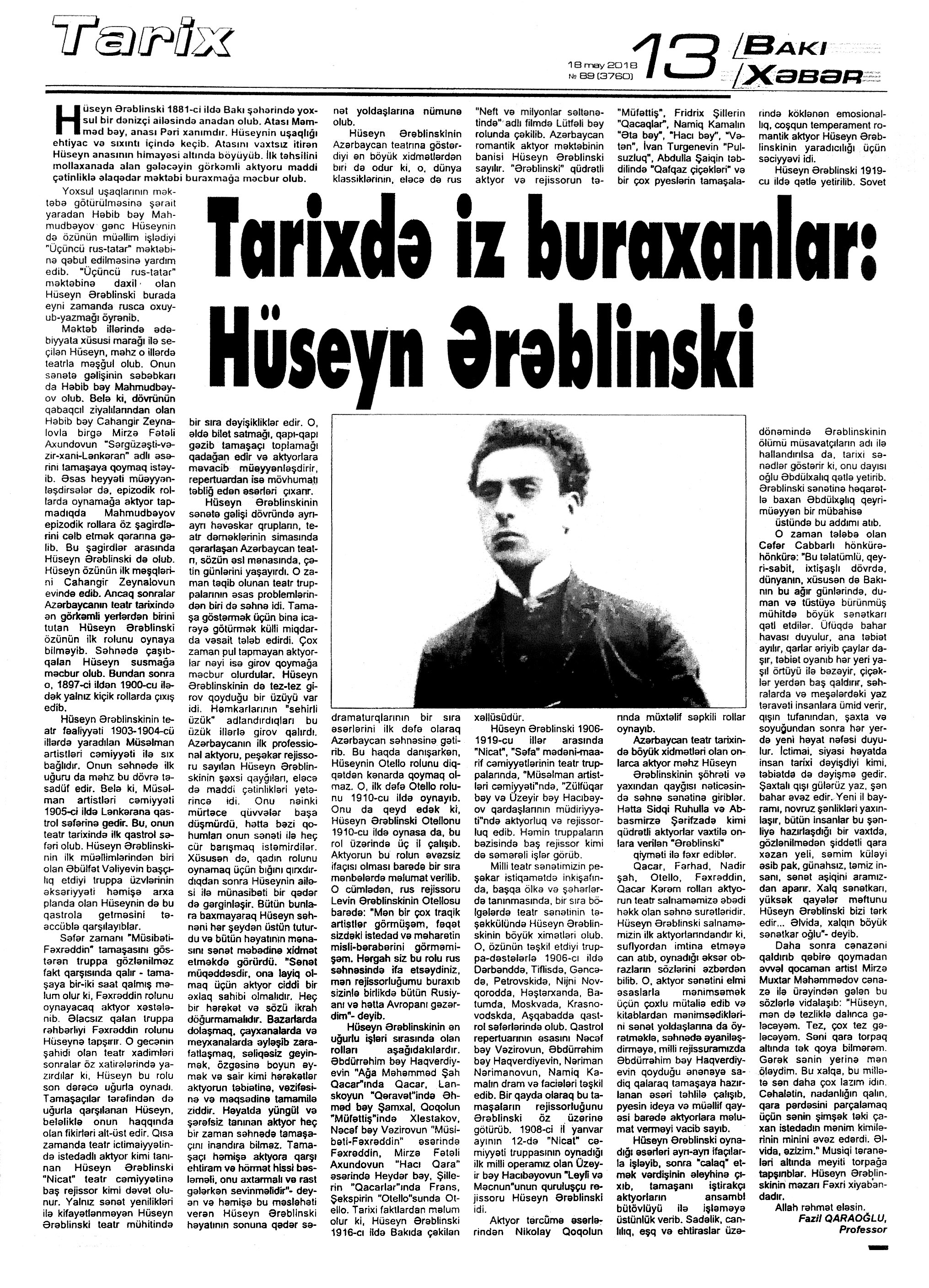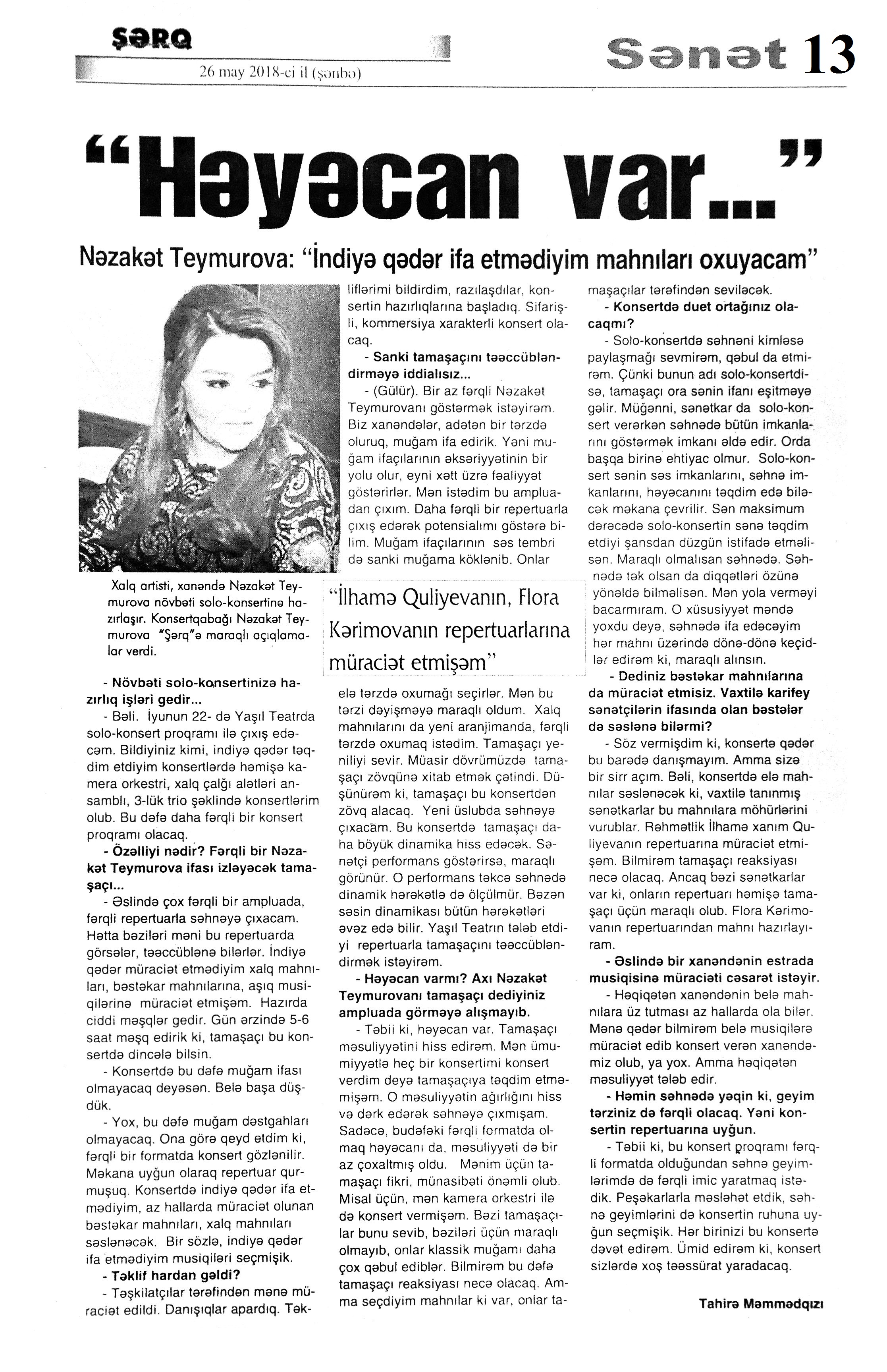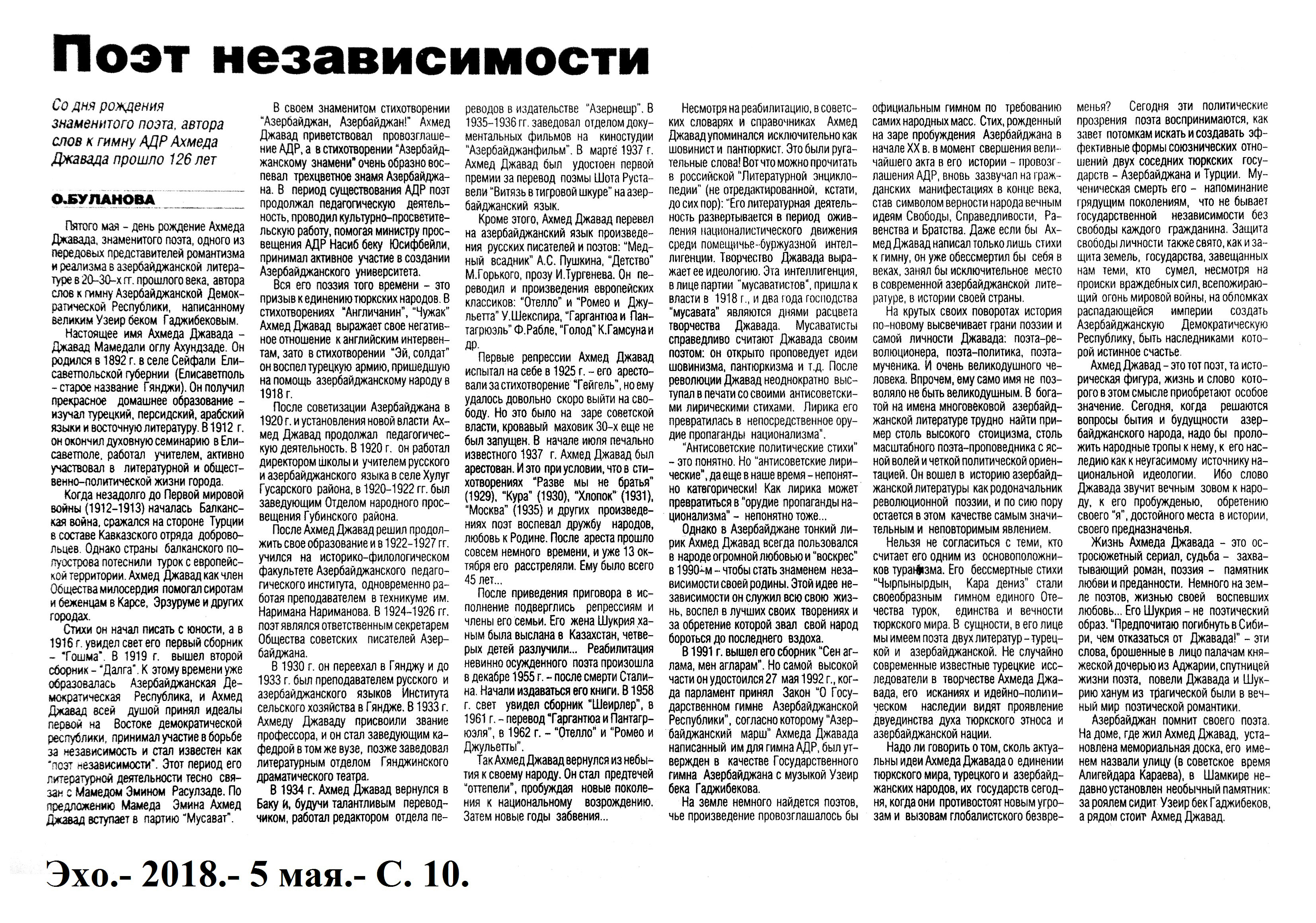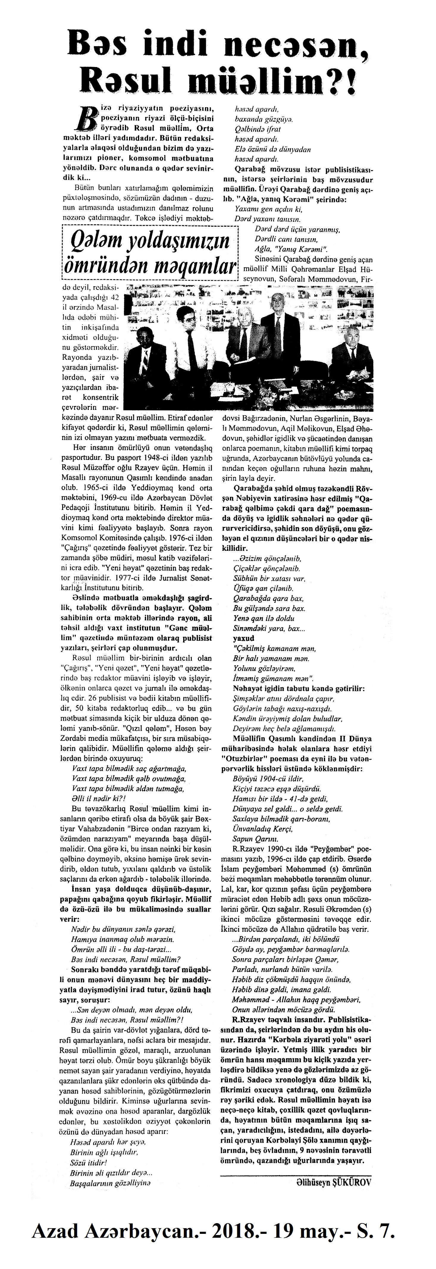 kitabı haqqında] 1021. Əyyublu, M. Nərimanovun siyasi bioqrafiyası cox zəngindir: Firdovsiyyə Əhmədova: Bəzən Nərimanovu Şərq dünyasında məscid tribunasının yaradıcısı kimi dəyərləndirirlər: [tarix üzrə fəlsəfə doktoru, Əməkdar müəllimlə müsahibə] /müsahibəni apardı Mahmud Əyyublu //Azad Azərbaycan.- 2018.- 8 may.- S.6. 1022. Fərəcov, S. “Yaşıl qələm”dən keçən qara tale: [publisist, nasir və dramaturq Mustafa bəy Əlibəyov haqqında] //Mədəniyyət.- 2018.-2 may.- S.12. 1023. Günay Reyhan: Şeir mənim ruhumun səsidir və ruhu dindirən də Tanrıdır: [gənc şairə ilə müsahibə] /müsahibəni apardı Mahmud Əyyublu //Palitra.- 2018.- 24 may.- S.13. 1024. Hacı K. Zamanımızın müdriki: Aqşin Babayevin “O biri dünyanın astanasında” kitabını oxuyarkən //Ədəbiyyat qəzeti.- 2018.- 12 may.- S.9. 1025. Hacıyeva, A. Heydər Hüseynov Həsən bəy Zərdabinin Lev Tolstoya məktubu barədə: bugünümüzdən baxış: Akademik Heydər Hüseynov – 110 //Xalq qəzeti.-2018.- 13 may.- S.6. 1026. Hafiz Əli: [tanınmış şairin vəfatı ilə bağlı AYB-nin başsağlığı] //Ədəbiyyat qəzeti.- 2018.- 19 may.- S.30. 1027. Xaçınçaylı, Q. Leninqraddan Avstriyayadək döyüş yolu keçmişəm //Həftə içi.-2018.- 5-7 may.- S.5. 1028. Xaçınçaylı, Q. Mənim qəhrəman qardaşım: [Qarabağda həlak olmuş döyüşçü Səməndər Əhmədov haqqında] //Həftə içi.- 2018.- 22 may.- S.7. 1029. Xalq şairi Balaş Azəroğlu və “21 Azər hərəkatı” //Kredo.-2018.- 31 may.- S.6. 1030. Xələfli, Ə. R. Bir ayrılıq odu var...: Şair Hüseyn Kürdoğlunun xatirəsinə poema-epos //Kredo.-2018.- 17 may.- S.8-9. 1031. Xəlil Rza Ulutürk: XX əsrdə türk xalqları üçün türkçülük ideologiyasından böyük amal olmayıb: [mərhum şairin Azər Turana məktubu] /təqdim etdi Azər Turan //Ədəbiyyat qəzeti.- 2018.- 26 may.- S.14-15. 1032. Xəlilzadə, F. Taleyimizin güzgüsü: [yazıçı Manaf Süleymanov haqqında] //Kaspi.-2018.- 22 may.- S.10. 1033. Xürrəmqızı, A. Şirvan elinin folklor fədaisi: [professor Seyfəddin Qəniyev haqqında] //Xalq cəbhəsi.-2018.- 5 may.- S.14. 1034. İdrisoğlu, A. “Statusman”ın özünəməxsusluğu: yazçı təxəyyülünün orijinallığı: [Hümbət Quliyevin eyniadlı kitabı haqqında] //Azad Azərbaycan.- 2018.- 22 may.- S.7. 1035. İsabəyli, Q. XX əsrin yəhudi uşaq ədəbiyyatının ən məşhur şairi: Lev Kvitko //Ədəbiyyat qəzeti.-2018.- 12 may.- S.24. 1036. İsmayıl. Sabir Azəri təkcə ədəbiyyatda deyil, publisistikada da öz sözünü deyib: O, 34 il ərzində mətbuatda, radioda jurnalistikanın inkişafına xidmət edib //Şərq.-2018.- 2 may.- S.11. 1037. Kamal Abdullanın “Yarımçıq əlyazma”sı.: Bakı Mühəndislik Unversitetində akademik Kamal Abdulla ilə görüş keçirilib //Azad Azərbaycan.-2018.-4 may.- S.5. 1038. Kamal, R. Məti Osmanoğlu: Ədəbiyyat yaddaş və düşüncə tipi kimi: [filoloqun yaradıcılığı haqqında] //Ədəbiyyat qəzeti.- 2018.- 6 may.- S.12. 1039. Kazımov, İ. Dilçilik terminlərinin izahlı lüğəti: [AMEA-nın Nəsimi adına Dilçilik İnstitutunun əməkdaşları professor S.Sadıqova, filologiya üzrə fəlsəfə doktorları N.Hüseynova, İ.Abdullayeva, S.Novruzova, Ş.Həsənli-Qəribova tərəfindən hazrlanan eyniadlı kitabın nəşri haqqında] //525-ci qəzet.-2018.- 23 may.- S.7. 1040. Kazımov, Q. Dünyanı daha aydın görən şair: [Əflatunun poeziyası haqqında] //525-ci qəzet.-2018.- 9 may.- S.7. 1041. Kazımov, Q. Təbiətə və insana, dərd içində boğulan dünyaya məhəbbətlə //Kredo.- 2018.- 3 may.- S.11;13. 1042. Kəramət. Ədəbi Zəkanın bu günü və gələcəyi: (Şair KƏRAMƏTLƏ gözlənilən söhbət) / müsahibəni apardı Zemfira Ədalətqızı //Ədalət.-2018.- 12 may.- S.13. 1043. Kərimli, X. Söz ömrünə calanan ömür: Vaqif Məmmədovun 70 illiyinə//525-ci qəzet.-2018.- 11 may.- S.8. 1044. Kərimova, A. “Milli yaddaş”ın izi ilə...: “Kaspi” liseyində Xalq şairi Sabir Rüstəmxanlı ilə şagirdlərin görüşü keçirildi //Kaspi.-2018.- 5-7 may.- S.17. 1045. “Kitab evi” İctimai Birliyi şair Adilə Nəzərin yeni kitabını təqdim edib: [“Beşinci mövsüm” şeirlər kitabı haqqında] //Ədəbiyyat qəzeti.- 2018.- 26 may.- S.32. 1046. Qabulzadə, A. Həmzət bəy Qəbulovun “Molla Nəsrəddin”dəki yazıları //525-ci qəzet.- 2018.- 1 may.- S.6. 1047. Qabulzadə, A. Həmzət bəy Qəbulovun “Molla Nəsrəddin”dəki yazıları //525-ci qəzet.- 2018.- 2 may.- S.6. 1048. Qabulzadə, A. Həmzət bəy Qəbulovun “Molla Nəsrəddin”dəki yazıları: Həmzət bəy Qəbulov-Şirvanlı haqqında bir neçə söz //525-ci qəzet.- 2018.- 3 may.- S.6. 1049. Qaliboğlu, E. Bəhlul Bəhcətin faciəvi taleyi: [folklorşünas haqqında] //Xalq cəbhəsi.- 2018.- 4 may.- S.14. 1050. Qaliboğlu, E. Mirəli Seyidov – Azərbaycan türklərinin tarixinə kompleks yanaşan alim //Xalq cəbhəsi.-2018.- 1 may.- S.14. 1051. Qaliboğlu, S. “Anna Axmatova və Şərq”: [filologiya üzrə fəlsəfə doktoru Aynur Nəcəfovanın eyniadlı kitabı haqqında] //Mədəniyyət.- 2018.- 16 may. - S.13. 1052. Qaraoğlu, F. Tarixdə iz buraxanlar: Fyodor Dostoyevski: [rus yazıçısı haqqında] //Bakı Xəbər.-2018.- 26-29 may.- S.15. 1053. Qaraoğlu, F. Tarixdə iz buraxanlar: Mirvarid Dilbazi //Bakı Xəbər.-2018.- 12-14 may.- S.12. 1054. Qaraoğlu, F. Tarixdə iz buraxanlar: Qasım bəy Zakir //Bakı Xəbər.-2018.- 16may.- S.13. 1055. Qaraoğlu, F. Tarixdə iz buraxanlar: Mirzə Şəfi Vazeh //Bakı Xəbər.-2018.- 22 may.- S.15. 1056. Qaraoğlu, F. Tarixi şəxsiyyət Şah İsmayıl Xətai... //Bakı Xəbər.- 2018.- 19-21 may.- S.15. 1057. Qasımov, R. Türk-İslam mədəniyyətinin paytaxtı Naxçıvan və XI əsr şairimiz Qətran Təbrizi //525-ci qəzet.-2018.- 18 may.- S.6. 1058. Qismət, A. Nasirlər