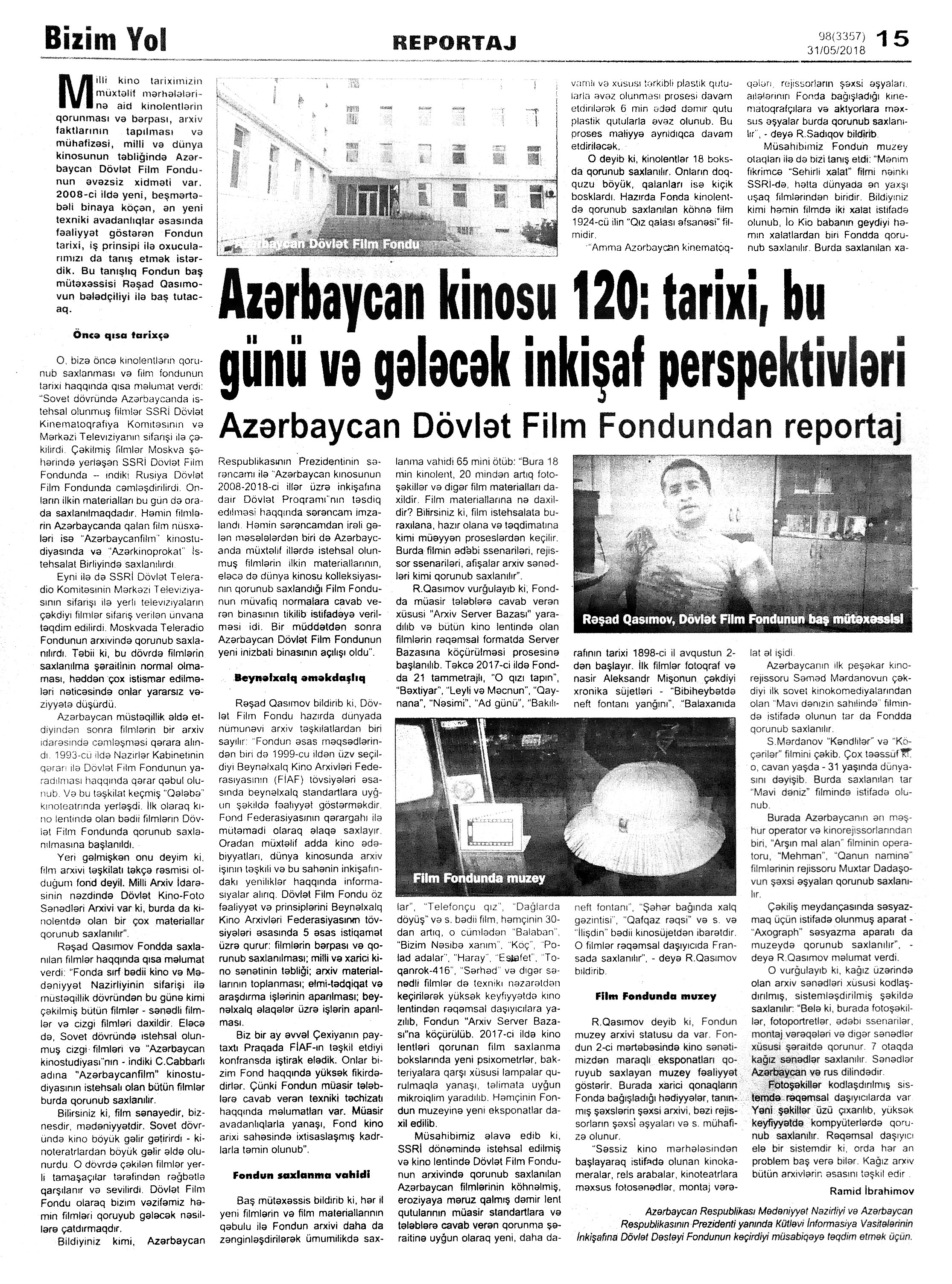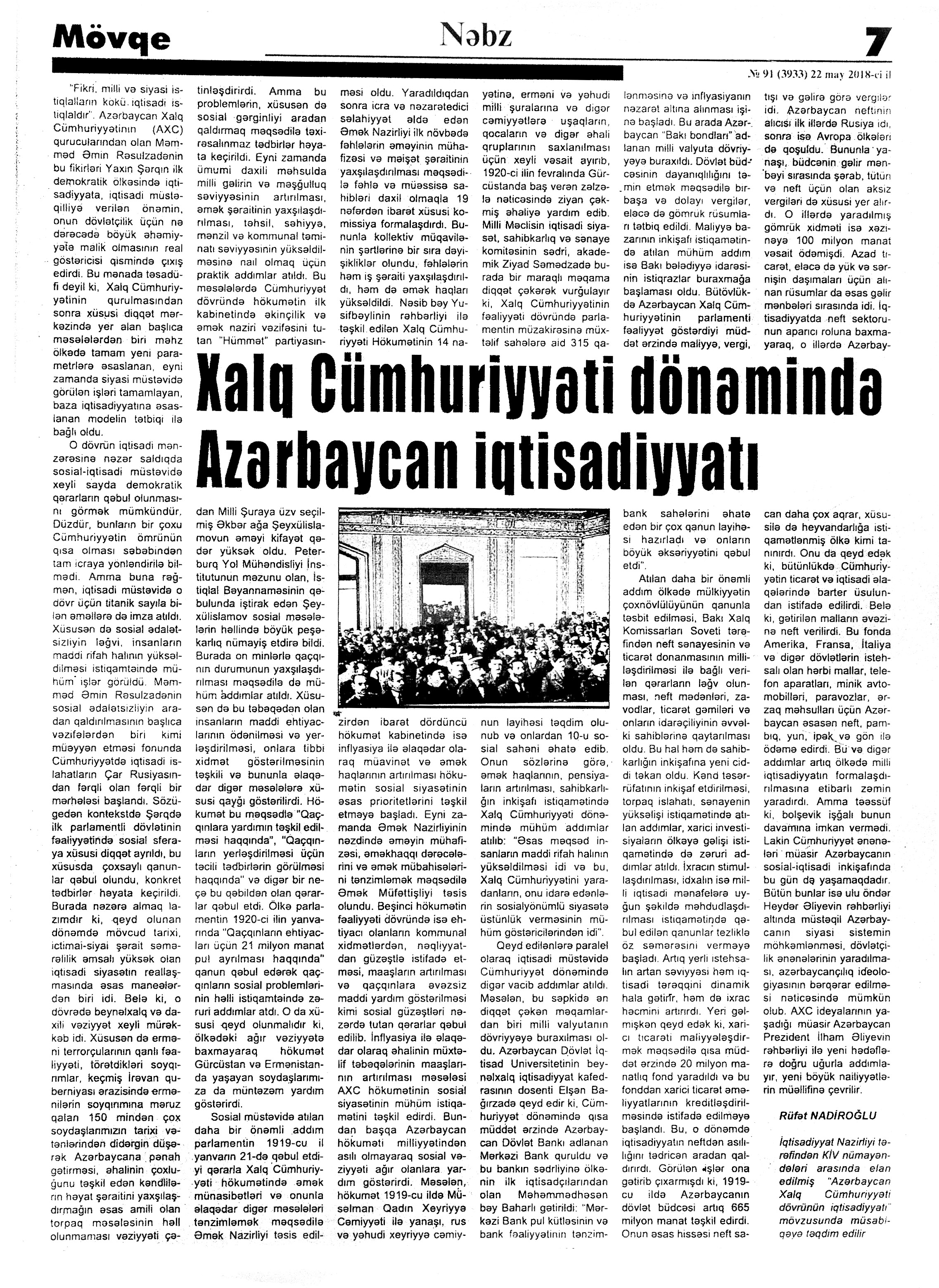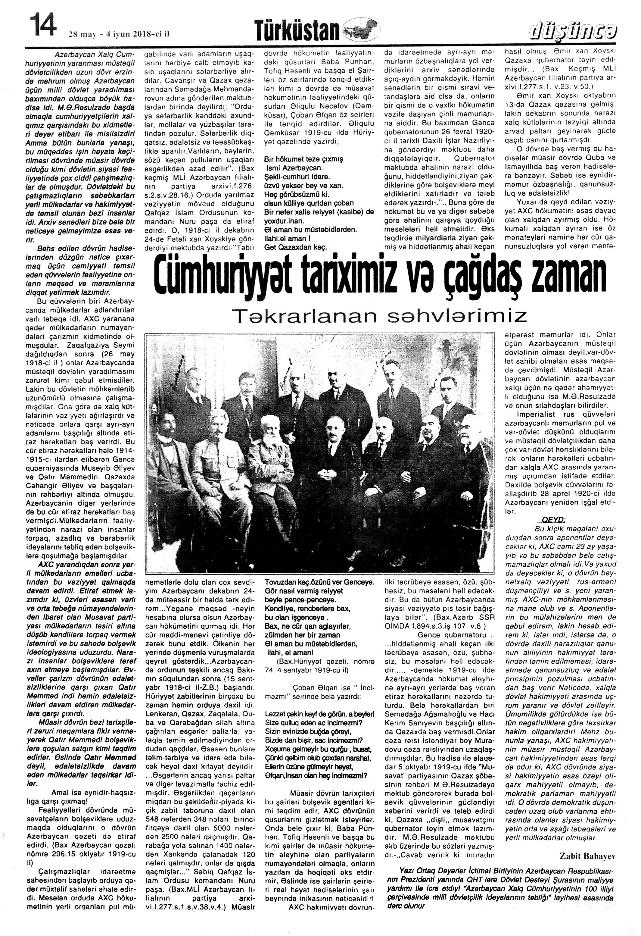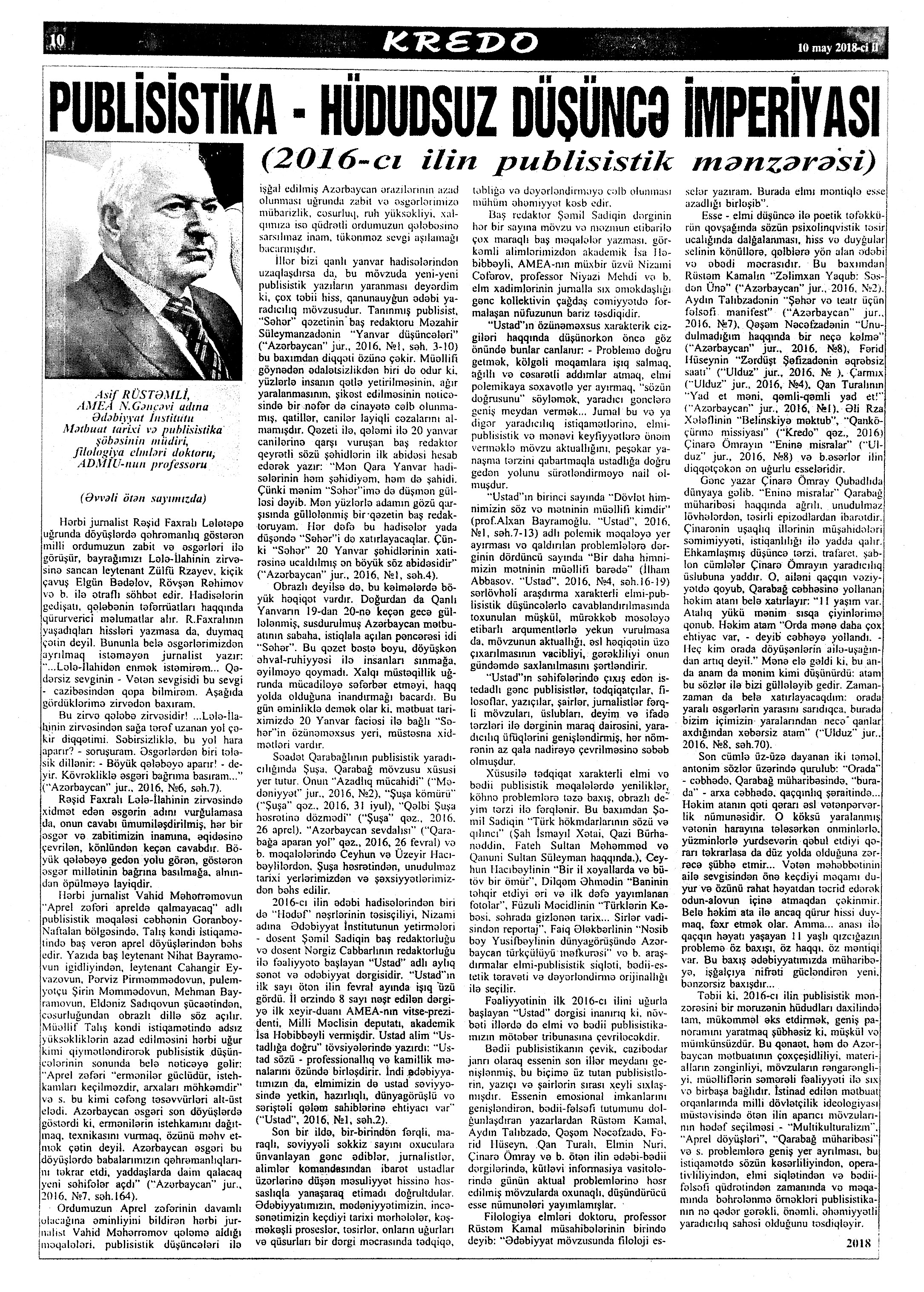 kitabı haqqında] 1021. Əyyublu, M. Nərimanovun siyasi bioqrafiyası cox zəngindir: Firdovsiyyə Əhmədova: Bəzən Nərimanovu Şərq dünyasında məscid tribunasının yaradıcısı kimi dəyərləndirirlər: [tarix üzrə fəlsəfə doktoru, Əməkdar müəllimlə müsahibə] /müsahibəni apardı Mahmud Əyyublu //Azad Azərbaycan.- 2018.- 8 may.- S.6. 1022. Fərəcov, S. “Yaşıl qələm”dən keçən qara tale: [publisist, nasir və dramaturq Mustafa bəy Əlibəyov haqqında] //Mədəniyyət.- 2018.-2 may.- S.12. 1023. Günay Reyhan: Şeir mənim ruhumun səsidir və ruhu dindirən də Tanrıdır: [gənc şairə ilə müsahibə] /müsahibəni apardı Mahmud Əyyublu //Palitra.- 2018.- 24 may.- S.13. 1024. Hacı K. Zamanımızın müdriki: Aqşin Babayevin “O biri dünyanın astanasında” kitabını oxuyarkən //Ədəbiyyat qəzeti.- 2018.- 12 may.- S.9. 1025. Hacıyeva, A. Heydər Hüseynov Həsən bəy Zərdabinin Lev Tolstoya məktubu barədə: bugünümüzdən baxış: Akademik Heydər Hüseynov – 110 //Xalq qəzeti.-2018.- 13 may.- S.6. 1026. Hafiz Əli: [tanınmış şairin vəfatı ilə bağlı AYB-nin başsağlığı] //Ədəbiyyat qəzeti.- 2018.- 19 may.- S.30. 1027. Xaçınçaylı, Q. Leninqraddan Avstriyayadək döyüş yolu keçmişəm //Həftə içi.-2018.- 5-7 may.- S.5. 1028. Xaçınçaylı, Q. Mənim qəhrəman qardaşım: [Qarabağda həlak olmuş döyüşçü Səməndər Əhmədov haqqında] //Həftə içi.- 2018.- 22 may.- S.7. 1029. Xalq şairi Balaş Azəroğlu və “21 Azər hərəkatı” //Kredo.-2018.- 31 may.- S.6. 1030. Xələfli, Ə. R. Bir ayrılıq odu var...: Şair Hüseyn Kürdoğlunun xatirəsinə poema-epos //Kredo.-2018.- 17 may.- S.8-9. 1031. Xəlil Rza Ulutürk: XX əsrdə türk xalqları üçün türkçülük ideologiyasından böyük amal olmayıb: [mərhum şairin Azər Turana məktubu] /təqdim etdi Azər Turan //Ədəbiyyat qəzeti.- 2018.- 26 may.- S.14-15. 1032. Xəlilzadə, F. Taleyimizin güzgüsü: [yazıçı Manaf Süleymanov haqqında] //Kaspi.-2018.- 22 may.- S.10. 1033. Xürrəmqızı, A. Şirvan elinin folklor fədaisi: [professor Seyfəddin Qəniyev haqqında] //Xalq cəbhəsi.-2018.- 5 may.- S.14. 1034. İdrisoğlu, A. “Statusman”ın özünəməxsusluğu: yazçı təxəyyülünün orijinallığı: [Hümbət Quliyevin eyniadlı kitabı haqqında] //Azad Azərbaycan.- 2018.- 22 may.- S.7. 1035. İsabəyli, Q. XX əsrin yəhudi uşaq ədəbiyyatının ən məşhur şairi: Lev Kvitko //Ədəbiyyat qəzeti.-2018.- 12 may.- S.24. 1036. İsmayıl. Sabir Azəri təkcə ədəbiyyatda deyil, publisistikada da öz sözünü deyib: O, 34 il ərzində mətbuatda, radioda jurnalistikanın inkişafına xidmət edib //Şərq.-2018.- 2 may.- S.11. 1037. Kamal Abdullanın “Yarımçıq əlyazma”sı.: Bakı Mühəndislik Unversitetində akademik Kamal Abdulla ilə görüş keçirilib //Azad Azərbaycan.-2018.-4 may.- S.5. 1038. Kamal, R. Məti Osmanoğlu: Ədəbiyyat yaddaş və düşüncə tipi kimi: [filoloqun yaradıcılığı haqqında] //Ədəbiyyat qəzeti.- 2018.- 6 may.- S.12. 1039. Kazımov, İ. Dilçilik terminlərinin izahlı lüğəti: [AMEA-nın Nəsimi adına Dilçilik İnstitutunun əməkdaşları professor S.Sadıqova, filologiya üzrə fəlsəfə doktorları N.Hüseynova, İ.Abdullayeva, S.Novruzova, Ş.Həsənli-Qəribova tərəfindən hazrlanan eyniadlı kitabın nəşri haqqında] //525-ci qəzet.-2018.- 23 may.- S.7. 1040. Kazımov, Q. Dünyanı daha aydın görən şair: [Əflatunun poeziyası haqqında] //525-ci qəzet.-2018.- 9 may.- S.7. 1041. Kazımov, Q. Təbiətə və insana, dərd içində boğulan dünyaya məhəbbətlə //Kredo.- 2018.- 3 may.- S.11;13. 1042. Kəramət. Ədəbi Zəkanın bu günü və gələcəyi: (Şair KƏRAMƏTLƏ gözlənilən söhbət) / müsahibəni apardı Zemfira Ədalətqızı //Ədalət.-2018.- 12 may.- S.13. 1043. Kərimli, X. Söz ömrünə calanan ömür: Vaqif Məmmədovun 70 illiyinə//525-ci qəzet.-2018.- 11 may.- S.8. 1044. Kərimova, A. “Milli yaddaş”ın izi ilə...: “Kaspi” liseyində Xalq şairi Sabir Rüstəmxanlı ilə şagirdlərin görüşü keçirildi //Kaspi.-2018.- 5-7 may.- S.17. 1045. “Kitab evi” İctimai Birliyi şair Adilə Nəzərin yeni kitabını təqdim edib: [“Beşinci mövsüm” şeirlər kitabı haqqında] //Ədəbiyyat qəzeti.- 2018.- 26 may.- S.32. 1046. Qabulzadə, A. Həmzət bəy Qəbulovun “Molla Nəsrəddin”dəki yazıları //525-ci qəzet.- 2018.- 1 may.- S.6. 1047. Qabulzadə, A. Həmzət bəy Qəbulovun “Molla Nəsrəddin”dəki yazıları //525-ci qəzet.- 2018.- 2 may.- S.6. 1048. Qabulzadə, A. Həmzət bəy Qəbulovun “Molla Nəsrəddin”dəki yazıları: Həmzət bəy Qəbulov-Şirvanlı haqqında bir neçə söz //525-ci qəzet.- 2018.- 3 may.- S.6. 1049. Qaliboğlu, E. Bəhlul Bəhcətin faciəvi taleyi: [folklorşünas haqqında] //Xalq cəbhəsi.- 2018.- 4 may.- S.14. 1050. Qaliboğlu, E. Mirəli Seyidov – Azərbaycan türklərinin tarixinə kompleks yanaşan alim //Xalq cəbhəsi.-2018.- 1 may.- S.14. 1051. Qaliboğlu, S. “Anna Axmatova və Şərq”: [filologiya üzrə fəlsəfə doktoru Aynur Nəcəfovanın eyniadlı kitabı haqqında] //Mədəniyyət.- 2018.- 16 may. - S.13. 1052. Qaraoğlu, F. Tarixdə iz buraxanlar: Fyodor Dostoyevski: [rus yazıçısı haqqında] //Bakı Xəbər.-2018.- 26-29 may.- S.15. 1053. Qaraoğlu, F. Tarixdə iz buraxanlar: Mirvarid Dilbazi //Bakı Xəbər.-2018.- 12-14 may.- S.12. 1054. Qaraoğlu, F. Tarixdə iz buraxanlar: Qasım bəy Zakir //Bakı Xəbər.-2018.- 16may.- S.13. 1055. Qaraoğlu, F. Tarixdə iz buraxanlar: Mirzə Şəfi Vazeh //Bakı Xəbər.-2018.- 22 may.- S.15. 1056. Qaraoğlu, F. Tarixi şəxsiyyət Şah İsmayıl Xətai... //Bakı Xəbər.- 2018.- 19-21 may.- S.15. 1057. Qasımov, R. Türk-İslam mədəniyyətinin paytaxtı Naxçıvan və XI əsr şairimiz Qətran Təbrizi //525-ci qəzet.-2018.- 18 may.- S.6. 1058. Qismət, A. Nasirlər