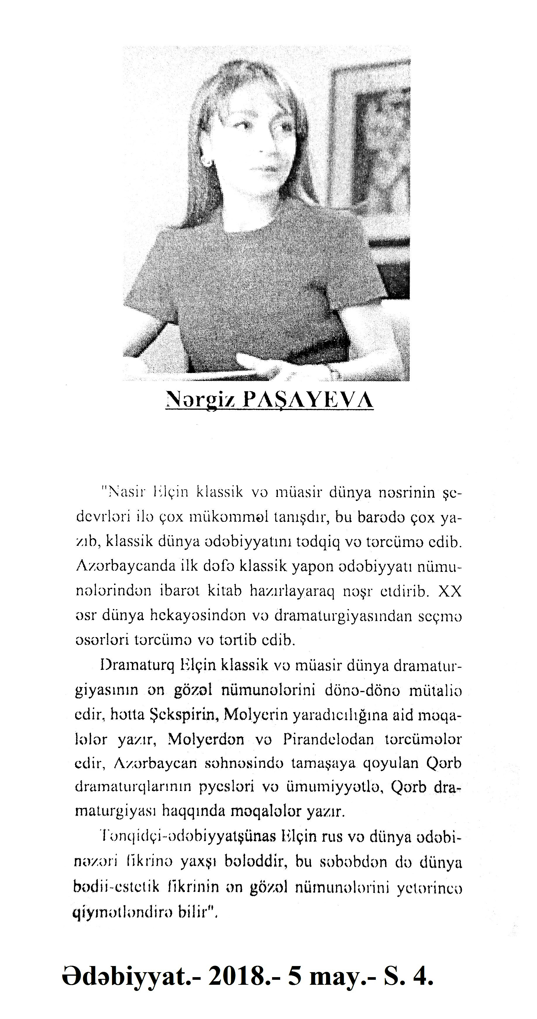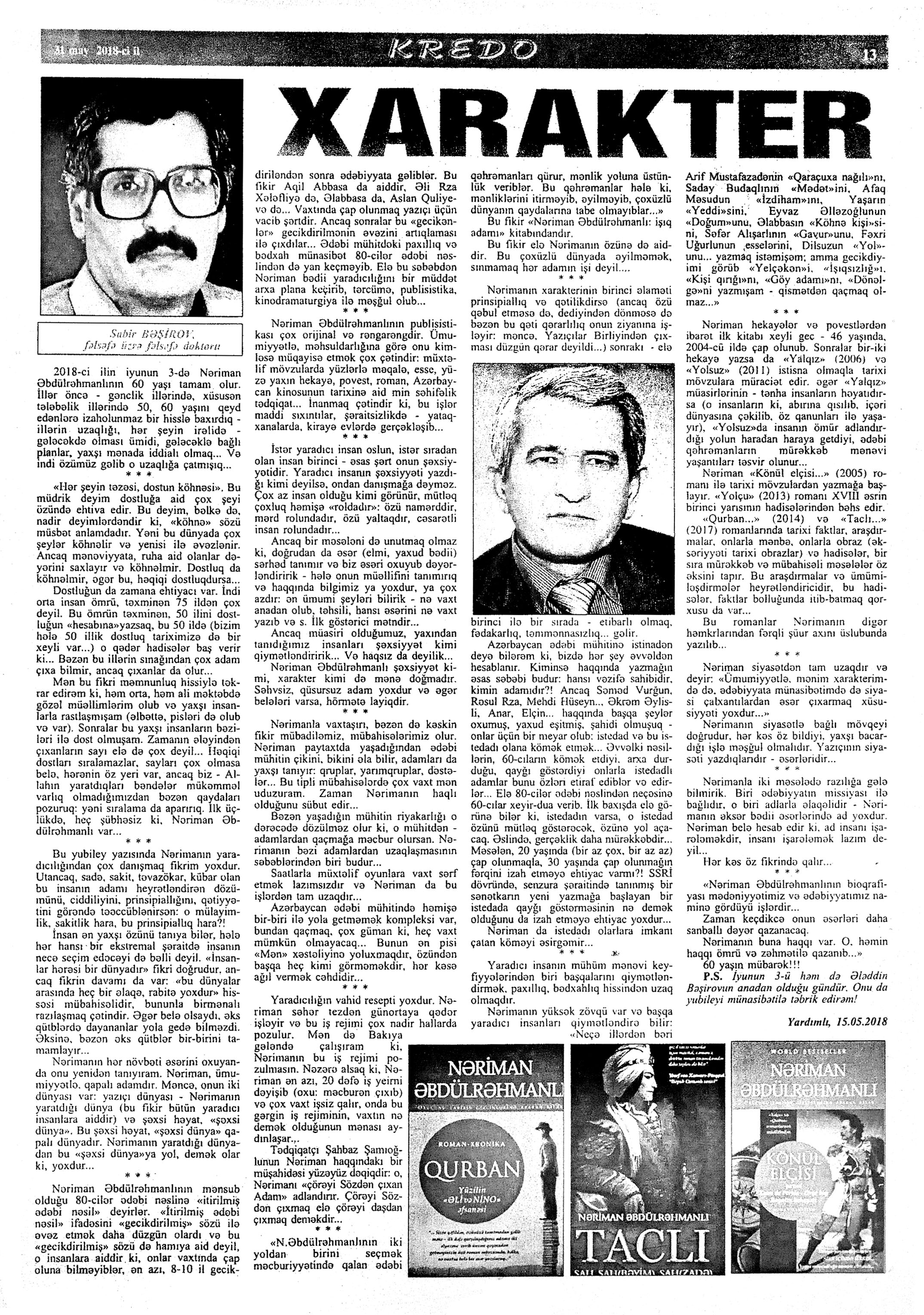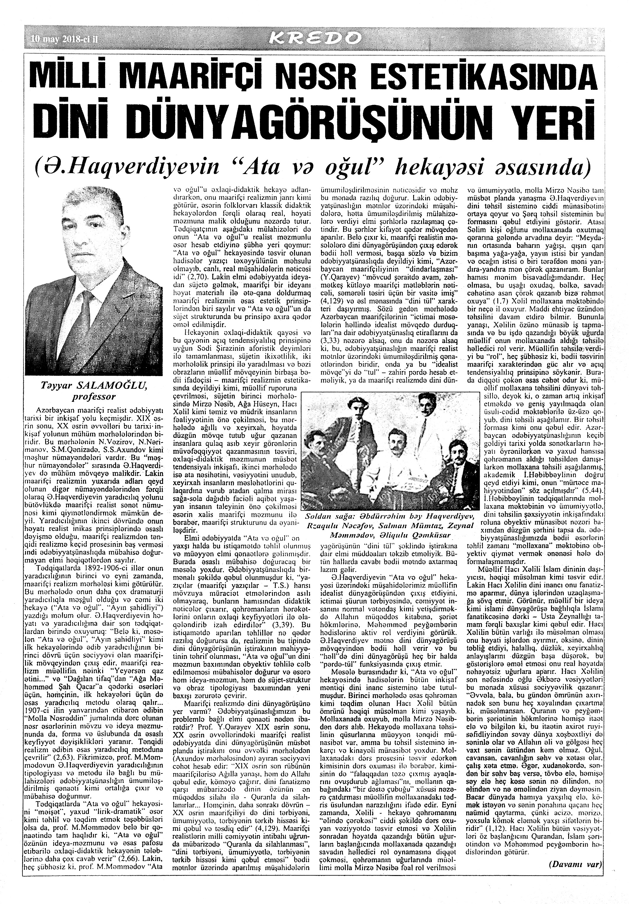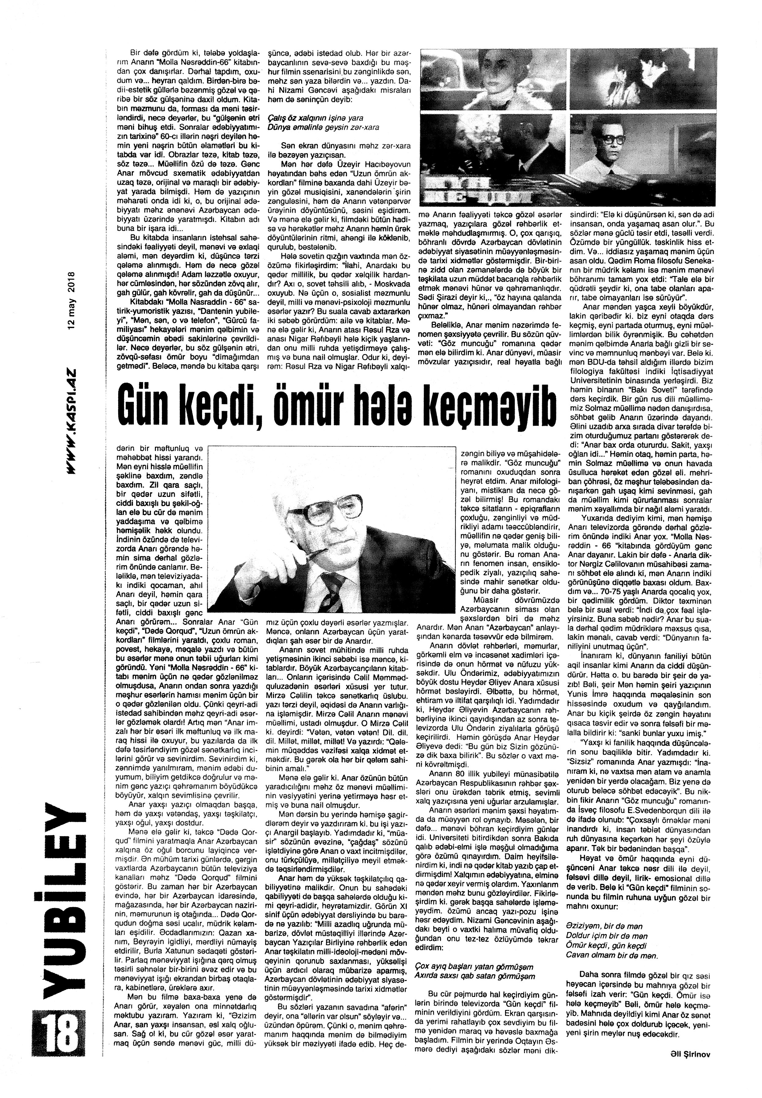 kitabı işıq üzü görüb] 1081. Mütəllimov, T. Klassik nəsrin plastika imkanları //Ədəbiyyat qəzeti.-2018.- 19 may.- S.14-15. 1082. Nasir, Ş. İftixar hissilə vərəqlənən sanballı nəşr: Unudulmaz tarixi şəxsiyyət Nəriman Nərimanovla bağlı albom-kitab haqqında düşüncələr //525-ci qəzet.-2018.- 31 may.- S.6. 1083. Nazimqızı, R. Məhəbbət mənim üçün ədəbi oyunlardan ibarətdir: [yazıçı Rəbiqə Nazimqızı ilə müsahibə] /müsahibəni apardı Günel Şamilqızı, Aysu Kərimova //Kaspi.- 2018.- 19-22 may.- S.12-13. 1084. Nəcəfova, R. “Cənubi Azərbaycana salam”: [Neftçaladakı Heydər Əliyev Mərkəzində Cənubi Azərbaycan ədəbiyyatı bölməsinin sədri Sayman Aruzun yaradıcılığına həsr olunmuş eyniadlı görüş haqqında] //525-ci qəzet.-2018.- 23 may.- S.8. 1085. Nəcəfzadə, Q. Vəliyulla Novruzun yaradıcılığı barədə //Kredo -2018.- 31 may.- S.16. 1086. Nəriman Əyyub – 80: [şairin yubileyi münasibətilə AYB-nin təbriki] //Ədəbiyyat qəzeti.- 2018.- 19 may.- S.32. 1087. Novruzoğlu, R. Əsrin imamı, yaxud ay işığında məktub: (romandan səhifələr): (dini tarixi araşdırmalar) //Kredo.- 2018.- 10 may.- S.12;14. 1088. Novruzoğlu, R. Əsrin imamı, yaxud ay işığında məktub: (romandan səhifələr): (dini tarixi araşdırmalar) //Kredo.- 2018.- 17 may.- S.12;14. 1089. Novruzov, T. Mirzə Fətəli irsinin yenidən fəthi: Zaman Əsgərli tədqiqatında //Azad Azərbaycan.-2018.- 25 may.- S.7. 1090. Orucoğlu, Z. Halal və səmimi söz adamı: [şair Mükafat Yaqub haqqında] //525-ci qəzet.- 2018.- 1 may.- S.8. 1091. Paşayev, Q. Yarımçıq qalmış arzular: [yazıçı Həqiqət xanımın 32 yaşında dünyasını dəyişən, ömür-gün yoldaşından bəhs edən əsəri haqqında] //Ədalət.- 2018.- 2 may.- S.6.; 525-ci qəzet.- 2018.- 2 may.- S.7. 1092. Piriyev, H. Öz əsərini danışdır: Həmid Piriyev- “Şanapipik haqqında mahnı”: [yazıçının eyniadlı əsəri haqqında müsahibəsi] /müsahibəni apardı Hədiyyə Şəfaqət //Ədəbiyyat qəzeti.-2018.- 12 may.- S.12-13. 1093. Piriyev, Q. Miskin Abdal ocağının söz xiridarları: Tofiq və Rafiq Hüseynzadələr //Xalq qəzeti.-2018.- 13 may.- S.7. 1094. Rzasoy, S. “Əli Rza Xələfli” fakturası milli nəsr təfəkkürünün “yazıçı-mətn-oxucu” qapalı dövriyyəsində: [şairin yaradıcılığı haqqında] //Kredo.- 2018.- 24 may.- S.6;10. 1095. Salamoğlu, T. Milli maarifçi nəsr estetikasında dini dünyagörüşün yeri: (Ə.Haqverdiyevin “Ata və oğul” hekayəsi əsasında) //Kredo.- 2018.- 10 may.- S.15. 1096. Salamoğlu, T. Milli maarifçi nəsr estetikasında dini dünyagörüşün yeri: (Ə.Haqverdiyevin “Ata və oğul” hekayəsi əsasında) //Kredo.-2018.- 17 may.- S.4-5. 1097. Salman, Ə. Sən kimsən, Vəliyulla Novruz?: [şair haqqında] //Kredo.- 2018.- 3 may.- S.13. 1098. Salmanlı, R. Hərbçi, şair və tarixçi: Unudulmazlar: [Əhməd bəy Cavanşir haqqında] //Azərbaycan.- 2018.- 6 may.- S.12. 1099. Seyidzadə, H. T. Abbasqulu Ağa Bakıxanovun yaradıcılığı araşdırılır: AMEA-nın Milli Azərbaycan Tarıxi Muzeyində tədbir keçirilib //Azad Azərbaycan.- 2018.- 15 may.- S.5. 1100. Səfərov, E. Düşündürən poeziya: İnqilab İsaqın 65 illiyinə //525-ci qəzet.-2018.- 15 may.- S. 8. 1101. Səma, G. Kəmaləddin Qədimin “Köç”ü: [roman haqqında] //Kaspi.- 2018.- 5-7 may.- S.16. 1102. Sübhan. Zəlimxan Yaqub Almatıda anılıb //Ədalət.-2018.- 8 may.- S.7. 1103. Şahanə. “Ədəbiyyat adamı” mükafatı sahiblərinə təqdim olundu: [Azərbaycan Yaradıcılıq Fondunun sədri, yazıçı Kamal Abdulla layihə haqqında geniş məlumat verib] //525-ci qəzet.-2018.- 30 may.- S.7. 1104. Şahanə. Yazıçı Kamran Nəzirli “Humay” milli mükafatına layiq görüldü //525-ci qəzet.-2018.- 16 may.- S.7. 1105. Şahnaz Şahin: Yazmağa tələbəlik illərindən başlamışdım, amma...: ... Yazdıqlarımı böyük auditoriya qarşısına çıxarmırdım: [Sabirabad rayonunda yaşayıb-yaradan şairlə müsahibə] /müsahibəni apardı Şahanə Müşfiq //525-ci qəzet.-2018.- 23 may.- S.7. 1106. Şəlalə Həsənova – 60: [ədəbiyyatşünas alimin yubileyi münasibətilə AYB-nin təbriki] //Ədəbiyyat qəzeti.-2018.- 6 may.- S.31.