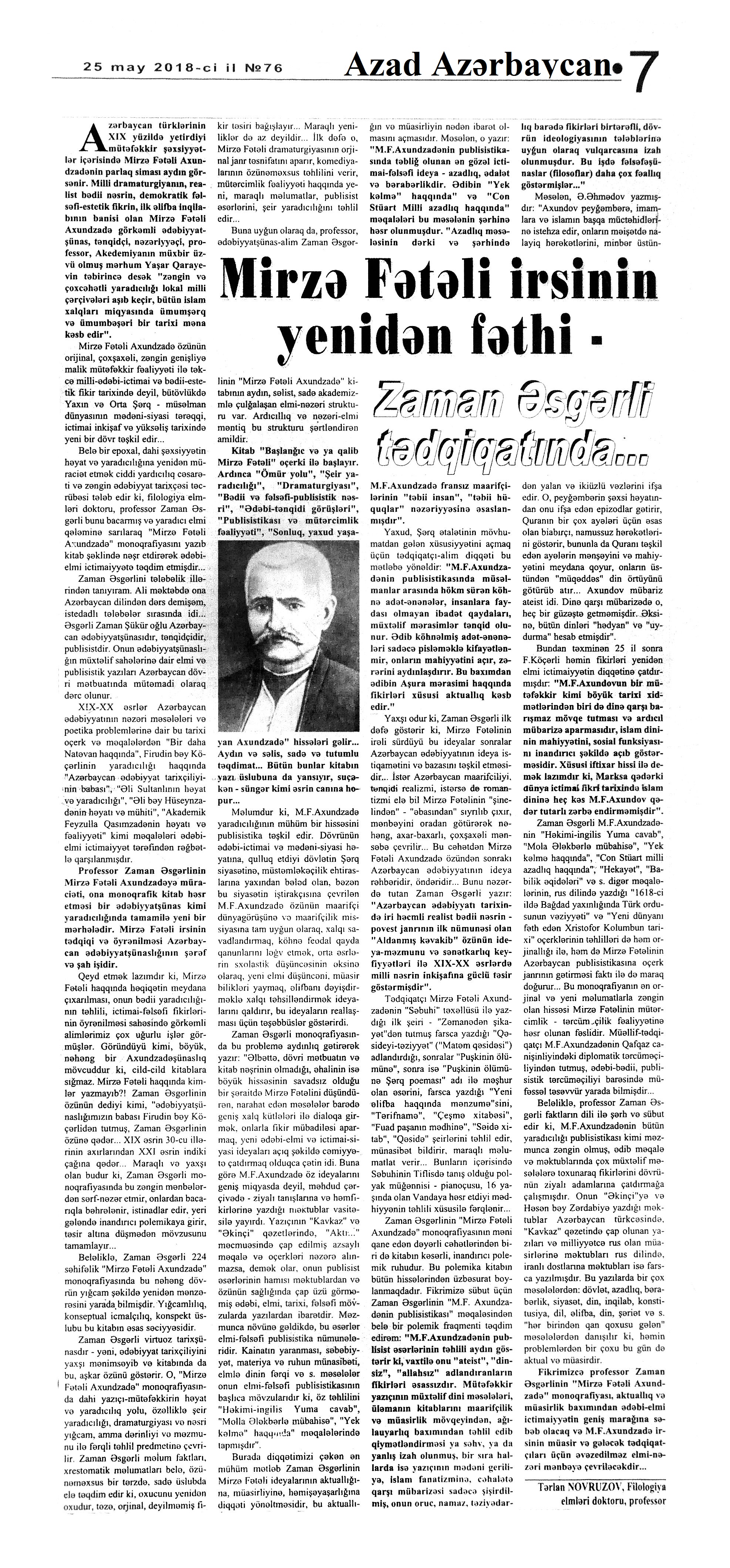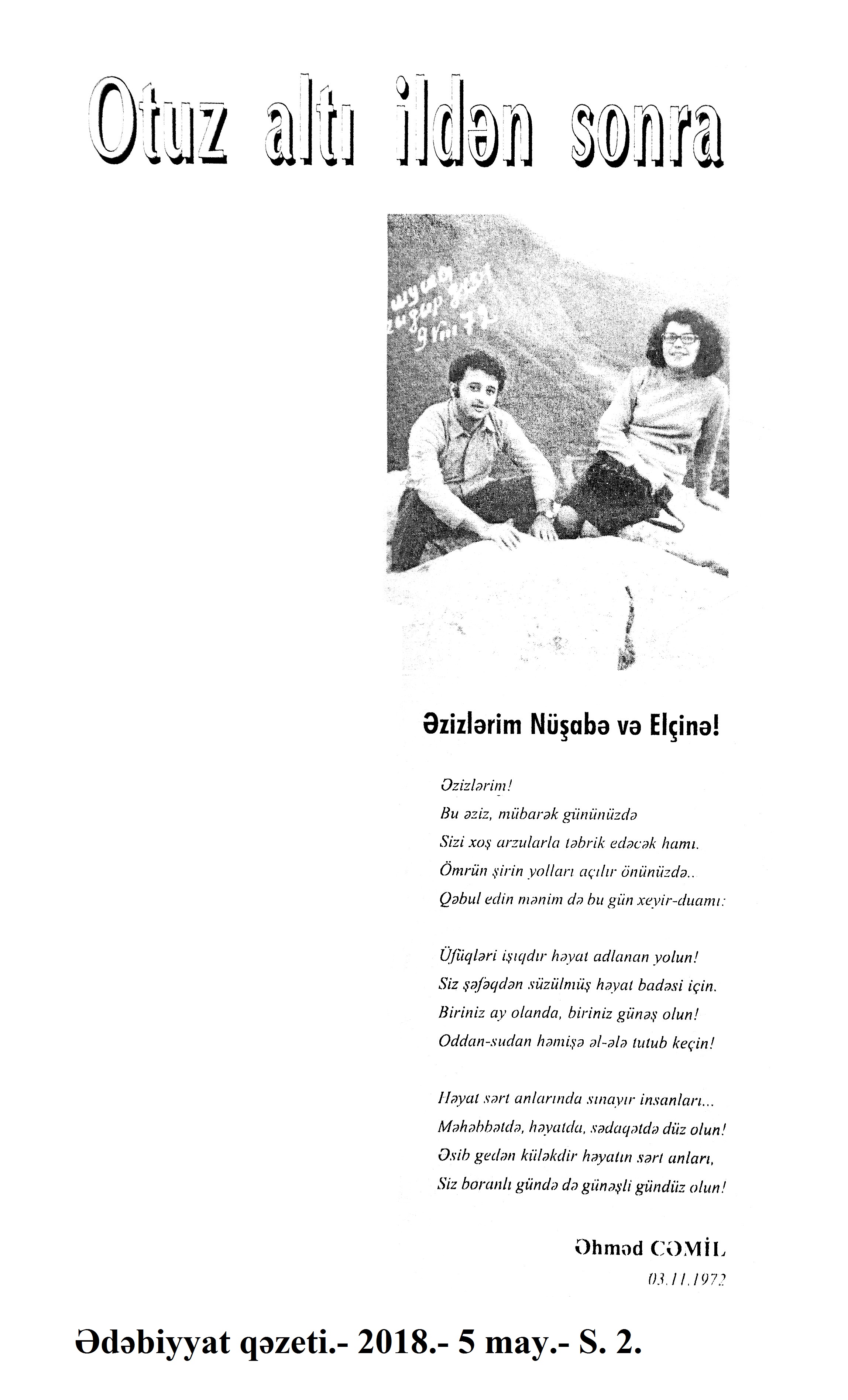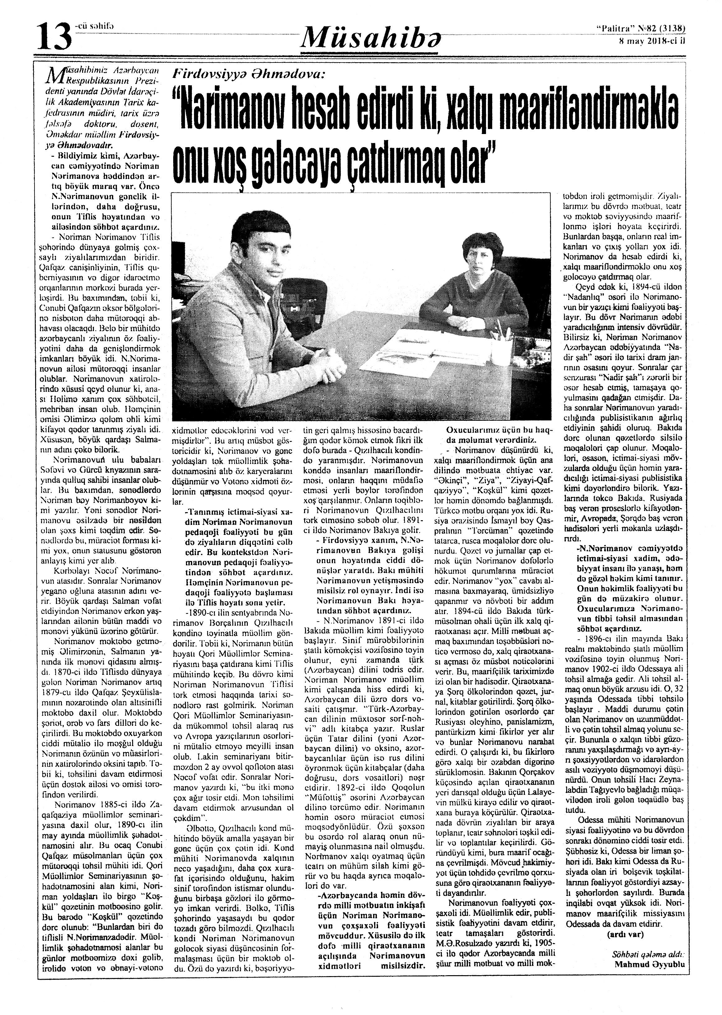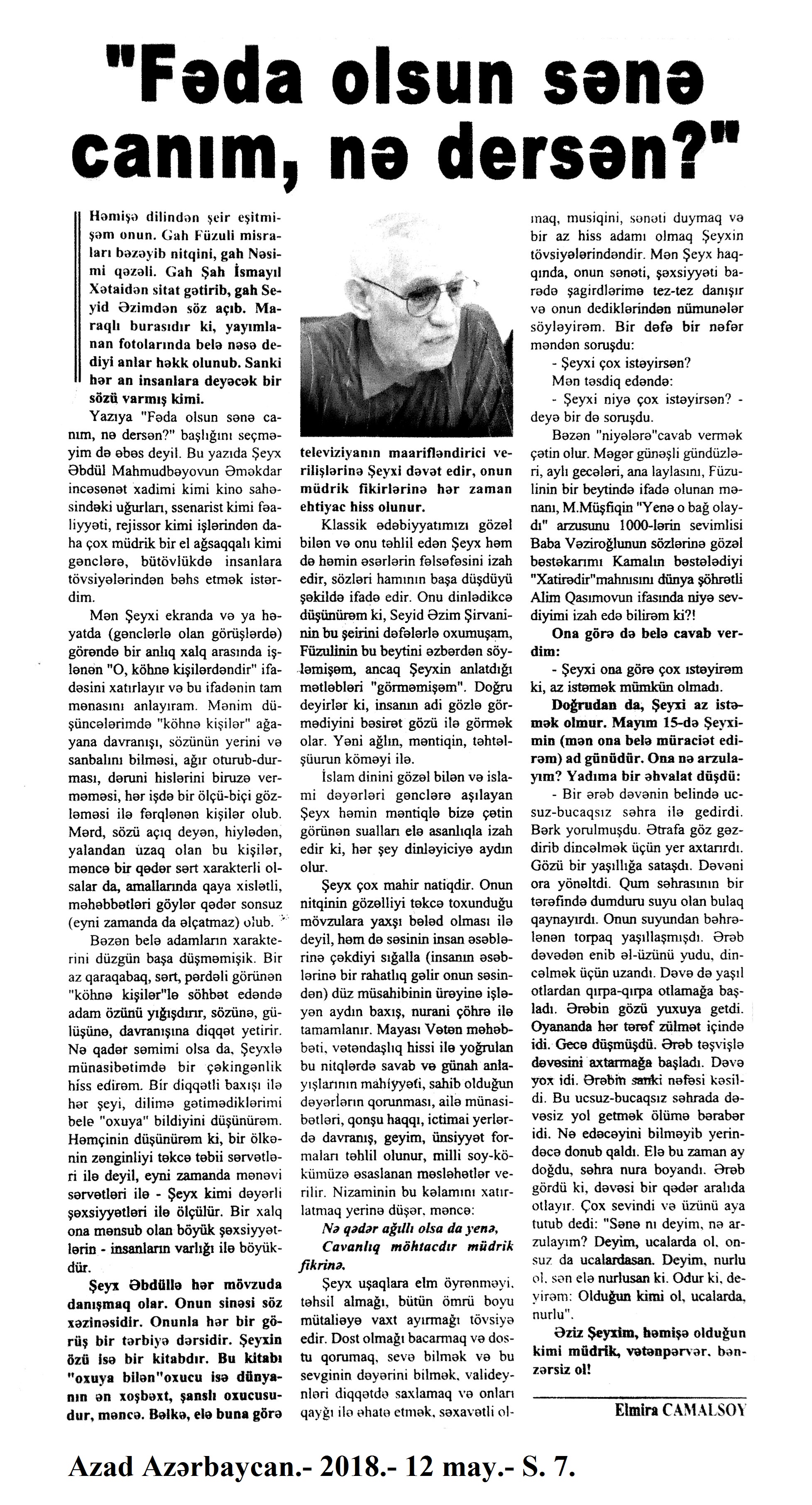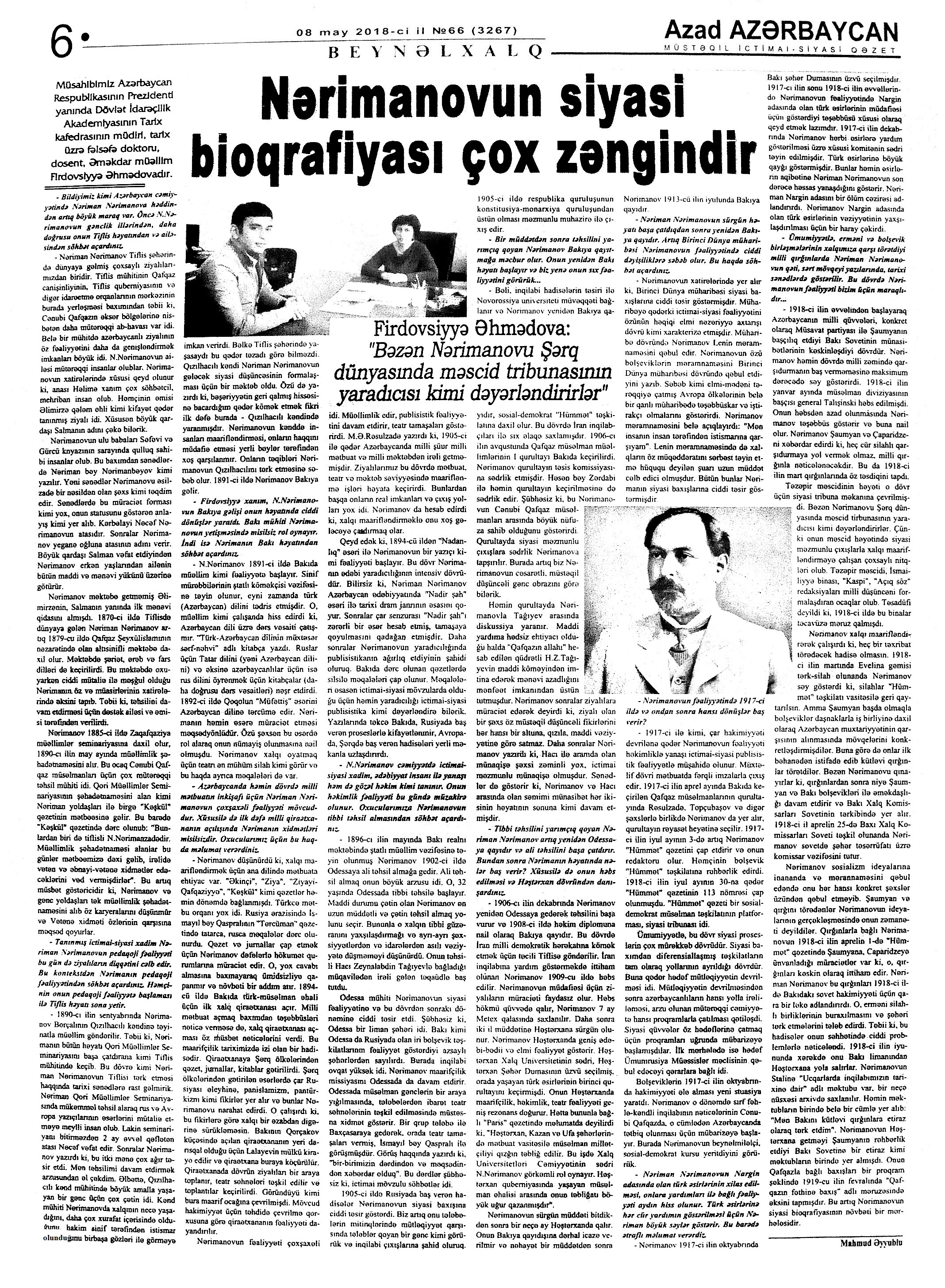 kitabı işıq üzü görüb] 1081. Mütəllimov, T. Klassik nəsrin plastika imkanları //Ədəbiyyat qəzeti.-2018.- 19 may.- S.14-15. 1082. Nasir, Ş. İftixar hissilə vərəqlənən sanballı nəşr: Unudulmaz tarixi şəxsiyyət Nəriman Nərimanovla bağlı albom-kitab haqqında düşüncələr //525-ci qəzet.-2018.- 31 may.- S.6. 1083. Nazimqızı, R. Məhəbbət mənim üçün ədəbi oyunlardan ibarətdir: [yazıçı Rəbiqə Nazimqızı ilə müsahibə] /müsahibəni apardı Günel Şamilqızı, Aysu Kərimova //Kaspi.- 2018.- 19-22 may.- S.12-13. 1084. Nəcəfova, R. “Cənubi Azərbaycana salam”: [Neftçaladakı Heydər Əliyev Mərkəzində Cənubi Azərbaycan ədəbiyyatı bölməsinin sədri Sayman Aruzun yaradıcılığına həsr olunmuş eyniadlı görüş haqqında] //525-ci qəzet.-2018.- 23 may.- S.8. 1085. Nəcəfzadə, Q. Vəliyulla Novruzun yaradıcılığı barədə //Kredo -2018.- 31 may.- S.16. 1086. Nəriman Əyyub – 80: [şairin yubileyi münasibətilə AYB-nin təbriki] //Ədəbiyyat qəzeti.- 2018.- 19 may.- S.32. 1087. Novruzoğlu, R. Əsrin imamı, yaxud ay işığında məktub: (romandan səhifələr): (dini tarixi araşdırmalar) //Kredo.- 2018.- 10 may.- S.12;14. 1088. Novruzoğlu, R. Əsrin imamı, yaxud ay işığında məktub: (romandan səhifələr): (dini tarixi araşdırmalar) //Kredo.- 2018.- 17 may.- S.12;14. 1089. Novruzov, T. Mirzə Fətəli irsinin yenidən fəthi: Zaman Əsgərli tədqiqatında //Azad Azərbaycan.-2018.- 25 may.- S.7. 1090. Orucoğlu, Z. Halal və səmimi söz adamı: [şair Mükafat Yaqub haqqında] //525-ci qəzet.- 2018.- 1 may.- S.8. 1091. Paşayev, Q. Yarımçıq qalmış arzular: [yazıçı Həqiqət xanımın 32 yaşında dünyasını dəyişən, ömür-gün yoldaşından bəhs edən əsəri haqqında] //Ədalət.- 2018.- 2 may.- S.6.; 525-ci qəzet.- 2018.- 2 may.- S.7. 1092. Piriyev, H. Öz əsərini danışdır: Həmid Piriyev- “Şanapipik haqqında mahnı”: [yazıçının eyniadlı əsəri haqqında müsahibəsi] /müsahibəni apardı Hədiyyə Şəfaqət //Ədəbiyyat qəzeti.-2018.- 12 may.- S.12-13. 1093. Piriyev, Q. Miskin Abdal ocağının söz xiridarları: Tofiq və Rafiq Hüseynzadələr //Xalq qəzeti.-2018.- 13 may.- S.7. 1094. Rzasoy, S. “Əli Rza Xələfli” fakturası milli nəsr təfəkkürünün “yazıçı-mətn-oxucu” qapalı dövriyyəsində: [şairin yaradıcılığı haqqında] //Kredo.- 2018.- 24 may.- S.6;10. 1095. Salamoğlu, T. Milli maarifçi nəsr estetikasında dini dünyagörüşün yeri: (Ə.Haqverdiyevin “Ata və oğul” hekayəsi əsasında) //Kredo.- 2018.- 10 may.- S.15. 1096. Salamoğlu, T. Milli maarifçi nəsr estetikasında dini dünyagörüşün yeri: (Ə.Haqverdiyevin “Ata və oğul” hekayəsi əsasında) //Kredo.-2018.- 17 may.- S.4-5. 1097. Salman, Ə. Sən kimsən, Vəliyulla Novruz?: [şair haqqında] //Kredo.- 2018.- 3 may.- S.13. 1098. Salmanlı, R. Hərbçi, şair və tarixçi: Unudulmazlar: [Əhməd bəy Cavanşir haqqında] //Azərbaycan.- 2018.- 6 may.- S.12. 1099. Seyidzadə, H. T. Abbasqulu Ağa Bakıxanovun yaradıcılığı araşdırılır: AMEA-nın Milli Azərbaycan Tarıxi Muzeyində tədbir keçirilib //Azad Azərbaycan.- 2018.- 15 may.- S.5. 1100. Səfərov, E. Düşündürən poeziya: İnqilab İsaqın 65 illiyinə //525-ci qəzet.-2018.- 15 may.- S. 8. 1101. Səma, G. Kəmaləddin Qədimin “Köç”ü: [roman haqqında] //Kaspi.- 2018.- 5-7 may.- S.16. 1102. Sübhan. Zəlimxan Yaqub Almatıda anılıb //Ədalət.-2018.- 8 may.- S.7. 1103. Şahanə. “Ədəbiyyat adamı” mükafatı sahiblərinə təqdim olundu: [Azərbaycan Yaradıcılıq Fondunun sədri, yazıçı Kamal Abdulla layihə haqqında geniş məlumat verib] //525-ci qəzet.-2018.- 30 may.- S.7. 1104. Şahanə. Yazıçı Kamran Nəzirli “Humay” milli mükafatına layiq görüldü //525-ci qəzet.-2018.- 16 may.- S.7. 1105. Şahnaz Şahin: Yazmağa tələbəlik illərindən başlamışdım, amma...: ... Yazdıqlarımı böyük auditoriya qarşısına çıxarmırdım: [Sabirabad rayonunda yaşayıb-yaradan şairlə müsahibə] /müsahibəni apardı Şahanə Müşfiq //525-ci qəzet.-2018.- 23 may.- S.7. 1106. Şəlalə Həsənova – 60: [ədəbiyyatşünas alimin yubileyi münasibətilə AYB-nin təbriki] //Ədəbiyyat qəzeti.-2018.- 6 may.- S.31.