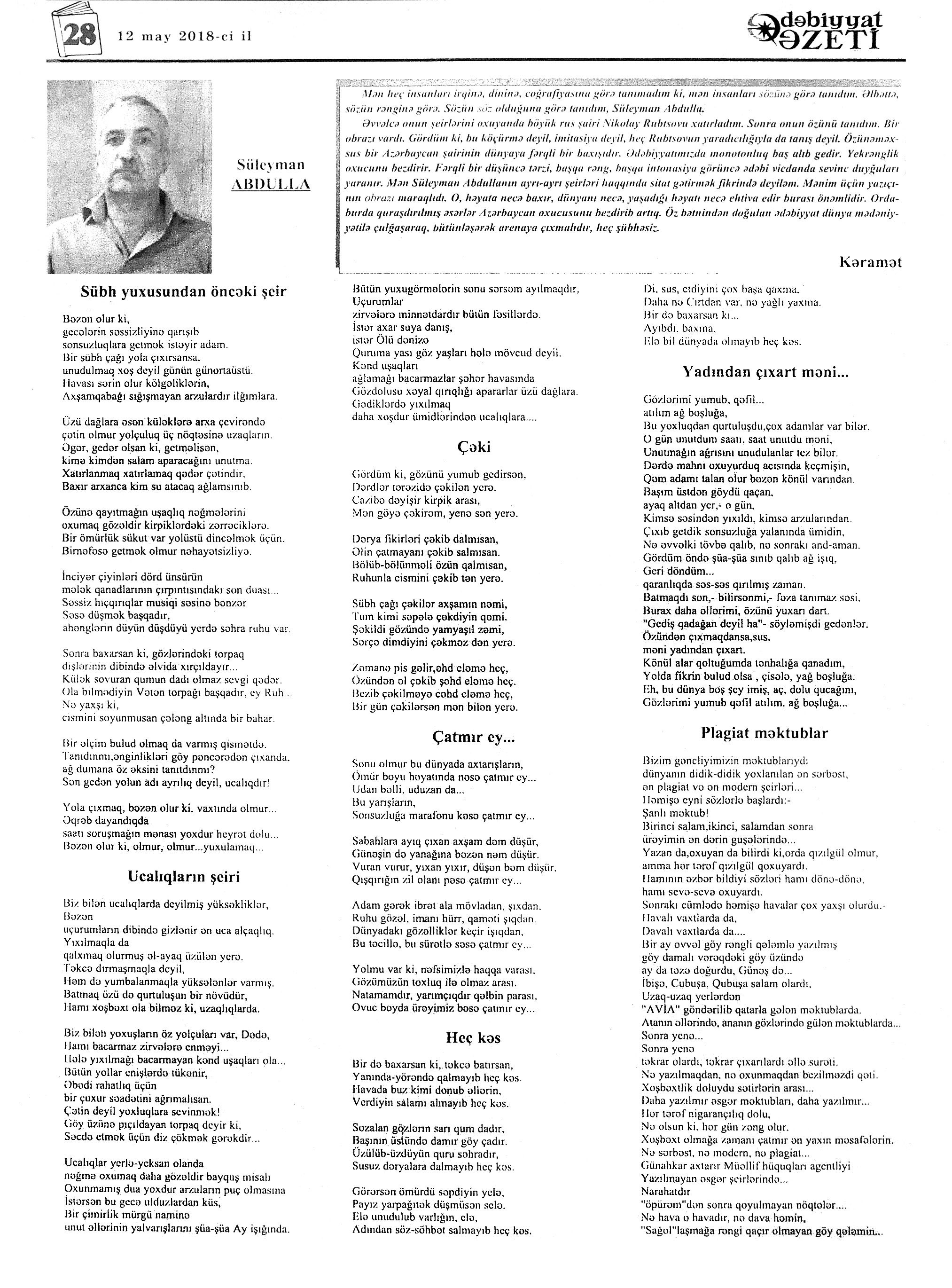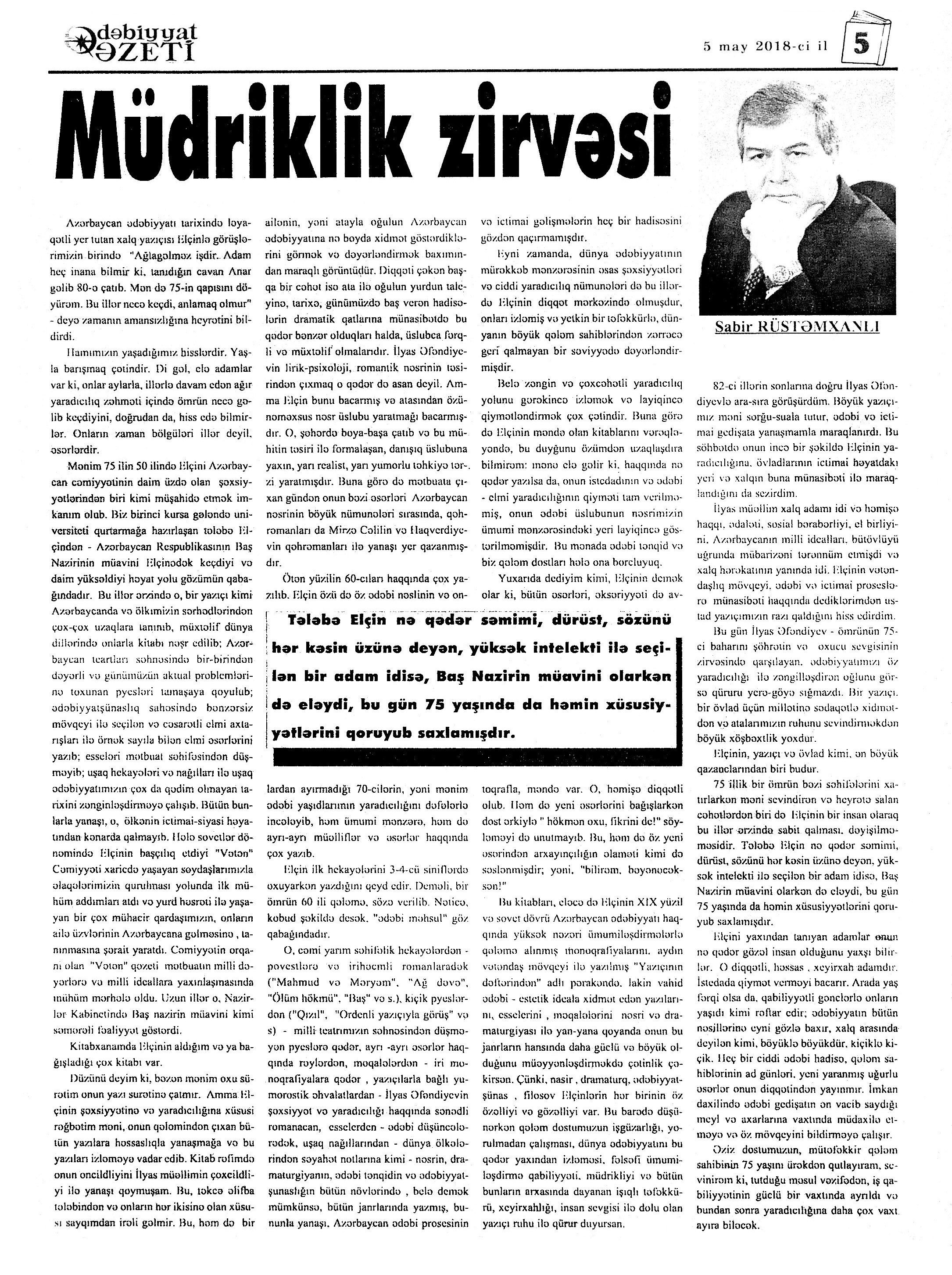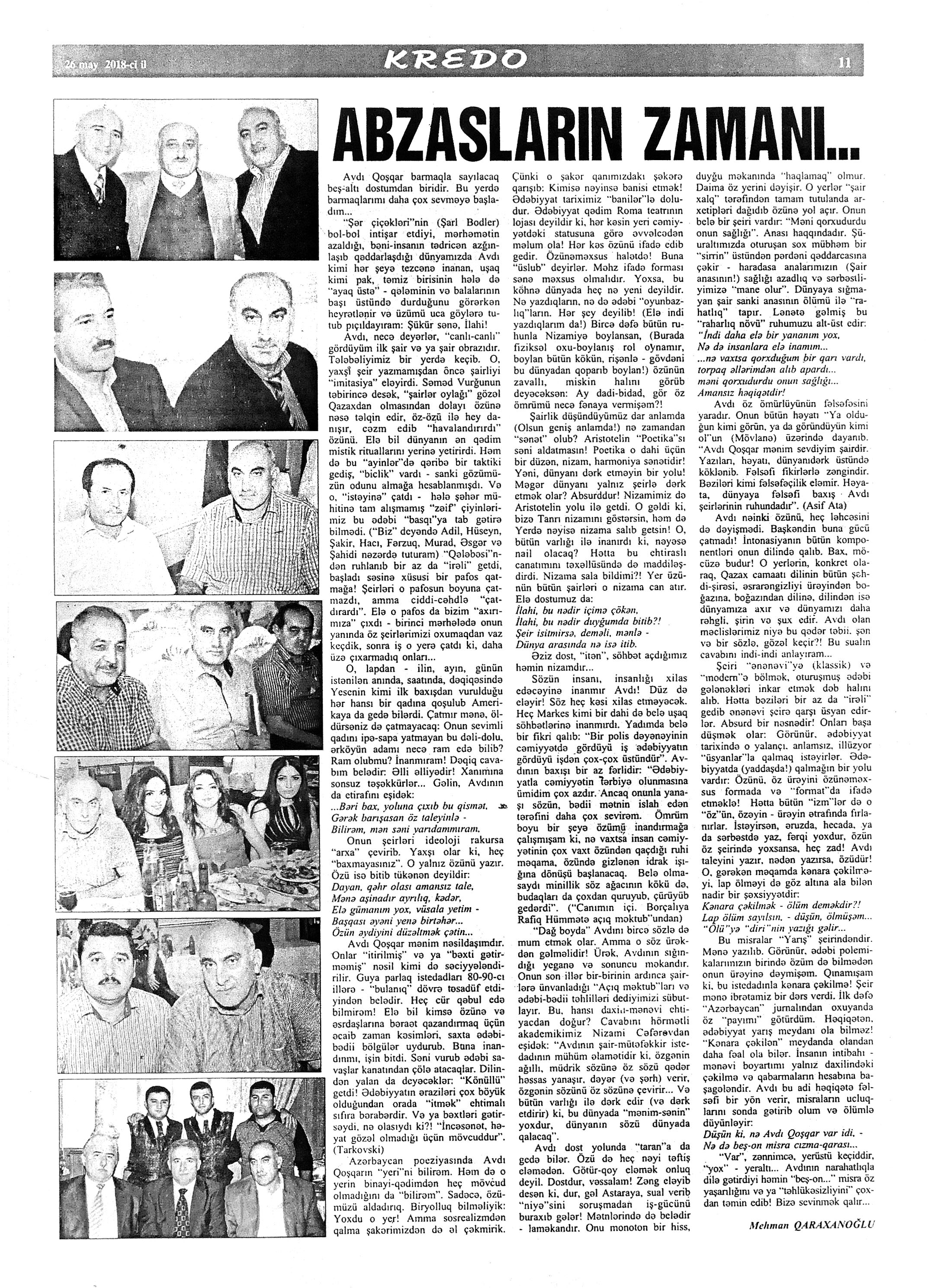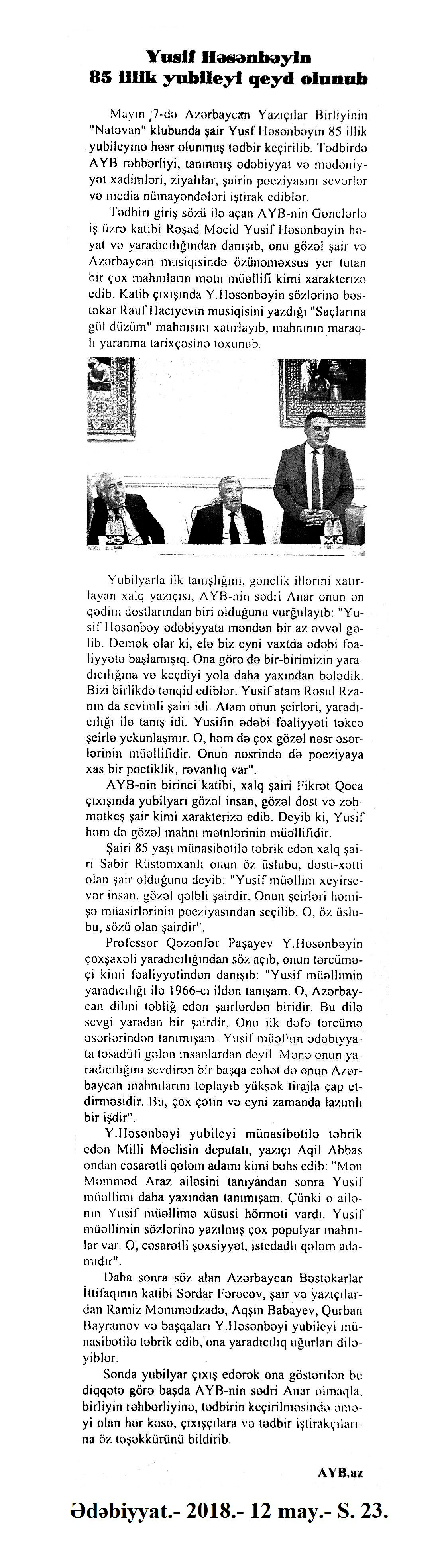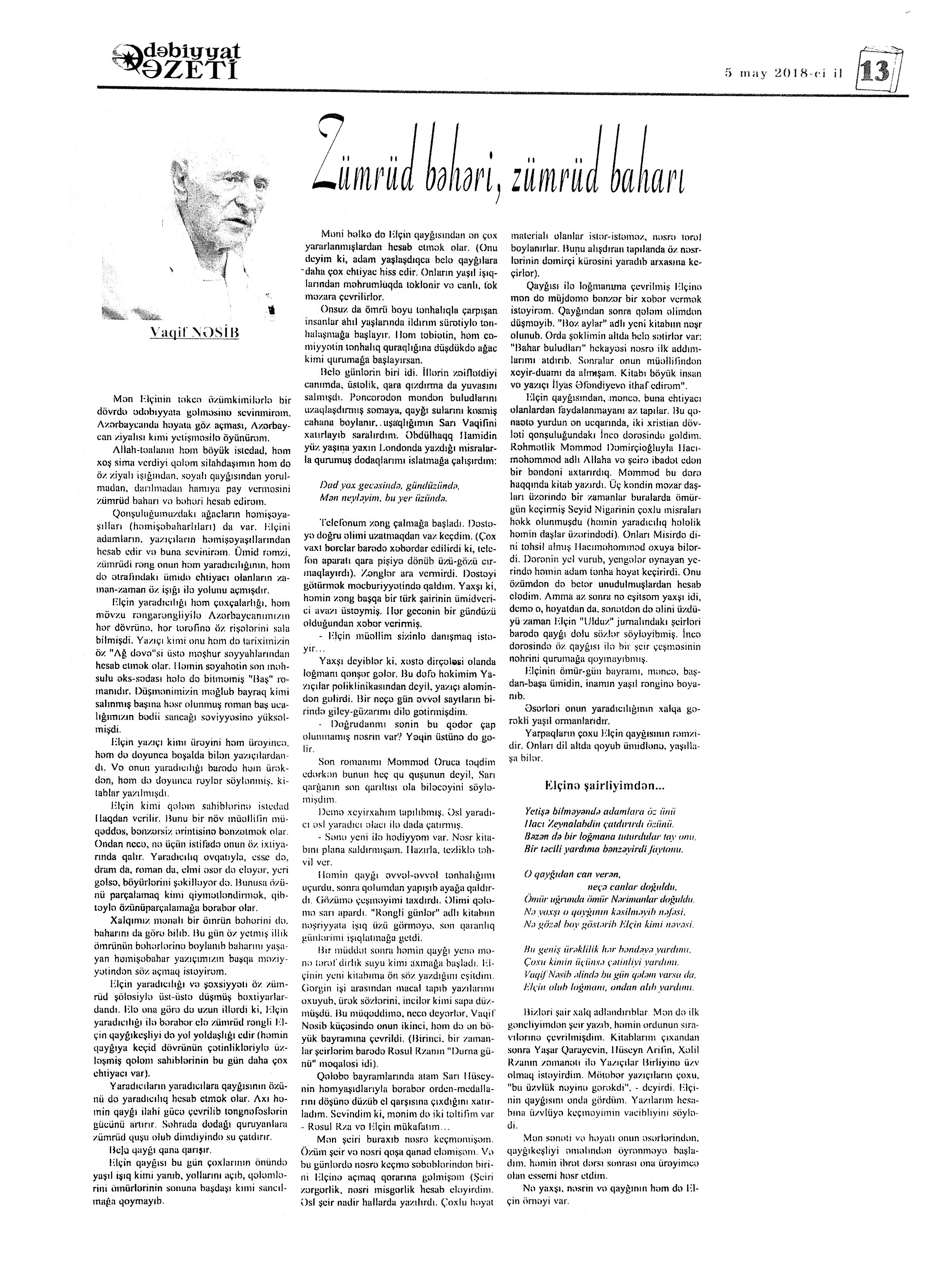 “Heyvanıstan” romanı haqqında] 1303. İsrailin tanınmış şairi Mətbuat Şurasında olub: [Pyotr Davıdov] //Səs.- 2018.-3 may.- S.9.; Mədəniyyət.-2018.- 4 may.- S.10. 1304. Karlyukeviç, A. Azərbaycan və Rıqor Borodulin – Ales Karlyukeviç: [müəlifin “Azərbaycan və Rıqor Borodulin” adlı məqaləsi haqqında] /tərc.etdi Kamran Nəzirli //Kaspi.-2018.- 12-14 may.- S.19. 1305. Kekelidze, G. Sənə məktublar: [gürcü ədəbiyyatı] /tərc etdi Neli Məmmədova //Ədəbiyyat qəzeti.-2018.- 19 may.- S.13. 1306. Qazaxıstanda Zəlimxan Yaqubun xatirəsi anılıb //Mədəniyyət.- 2018.- 9 may.- S.15. 1307. Məmmədzadə, S. Körpü: [Məmməd Orucun Rusiya ədəbiyyatından tərcümələri haqqında] //Ədəbiyyat qəzeti.-2018.- 19 may.- S.5. 1308. Müşfiq, Ş. “Kardeş kalemler”in may sayı: [Avrasiya Yazarlar Birliyinin mətbu orqanı böyük qazax şairi Ğalim Jaylıbaya həsr olunub] //525-ci qəzet.-2018.- 31 may.- S.6. 1309. Özer, A. Şeir bütün mədəniyyətlərin dinidir: Türkiyəli şair Adnan Özer: “İndiyə qədər intihar etməmişəmsə, bu, möcüzədir” /müsahibəni apardı Fərid Hüseyn //Kaspi.-2018.- 12-14 may.- S.13. 1310. Seyidli, P. Yaşamağı öyrədən roman: İqor Volnitskinin “Mənə ölməyi öyrət” romanındakı irfani şifrələr //Ədəbiyyat qəzeti. -2018.- 12 may.- S.26-27. 1311. Tahirli, A. Prof.dr. Okan Yeşilotun Azərbaycan sevgisi: [türk alimin araşdırmaları haqqında] //Ədəbiyyat qəzeti.- 2018.- 6 may.- S.15. 1312. Tanınmış qazax şairinin şeirləri Azərbaycan dilində: [Mağcan Cumabayın 125 illiyi ilə bağlı] //Mədəniyyət.- 2018.- 2 may.- S.15. 1313. Tanınmış Ukrayna ədibinin əsərləri ana dilimizdə: [Vladimir Danilenkonun “Qürub çağının işığında” kitabı] //Mədəniyyət.- 2018.- 9 may.- S.10. 1314. Türk dünyasının böyük yazıçısı Çingiz Aytmatov Bakıda yad olunub: [Türkdilli Ölkələrin Parlament Assambleyasının (TÜRKPA) Bakı ofisində] //Ədəbiyyat qəzeti.-2018.- 19 may.- S.3.; Mədəniyyət.- 2018.- 16 may. - S.2.