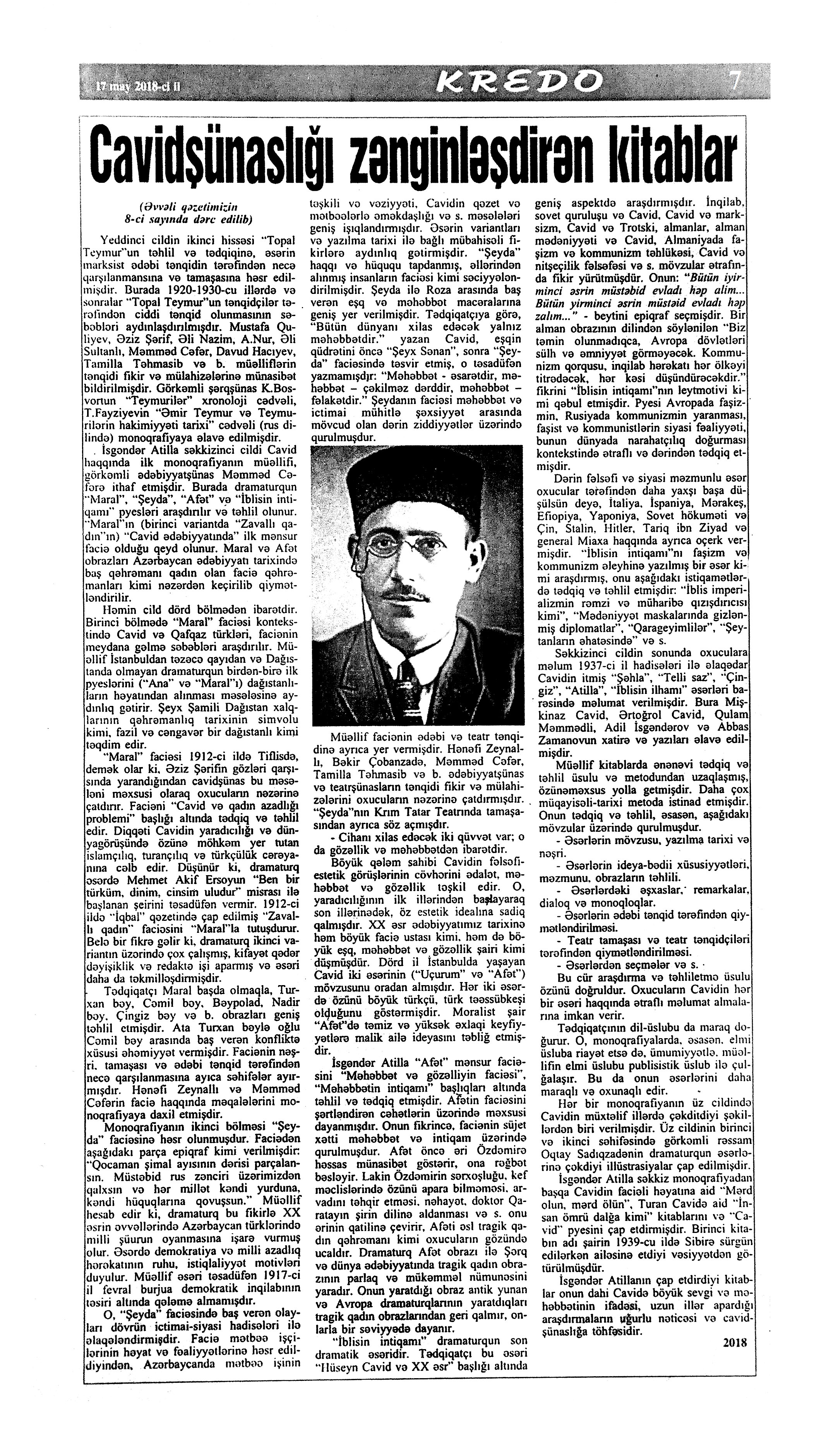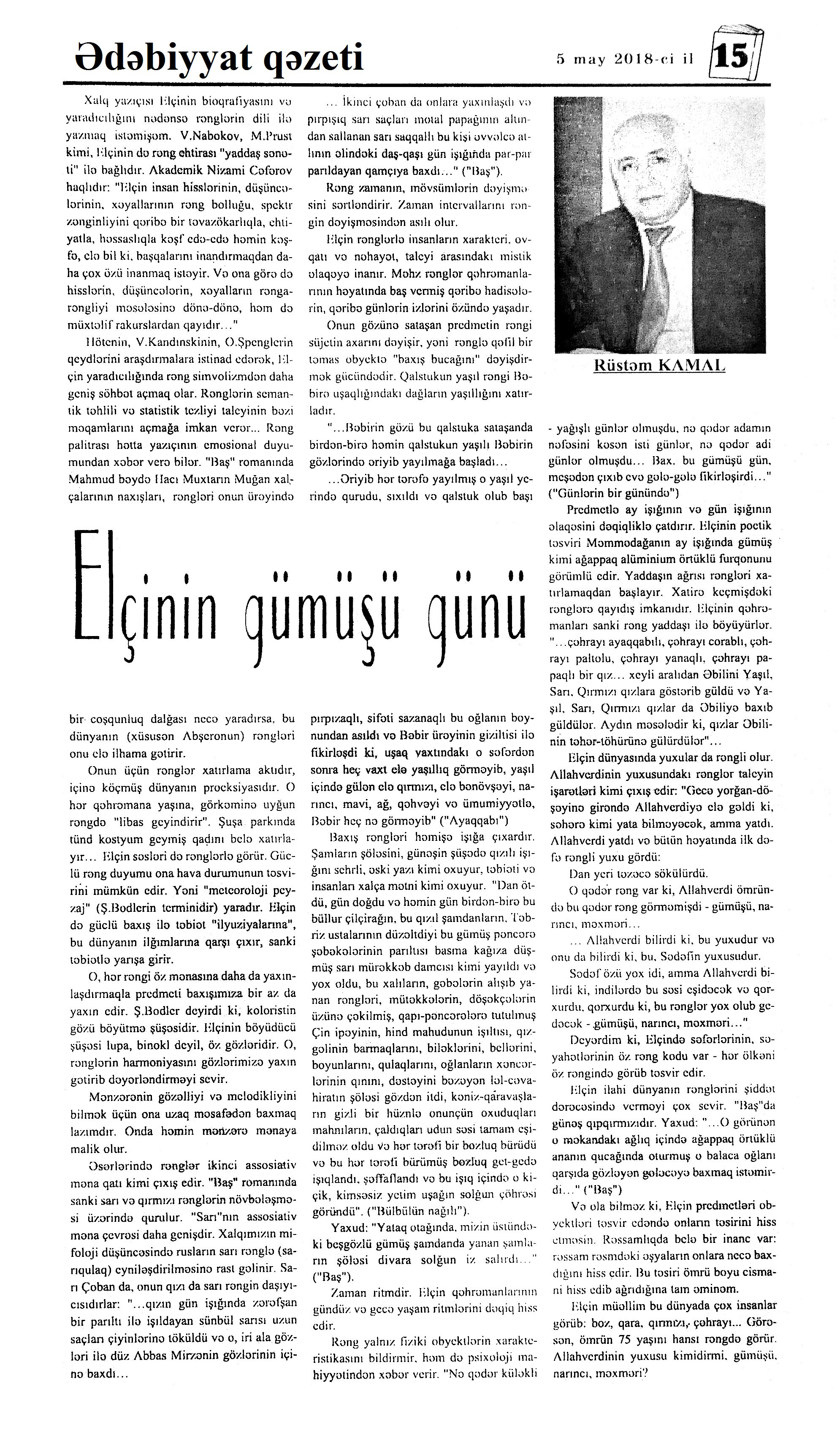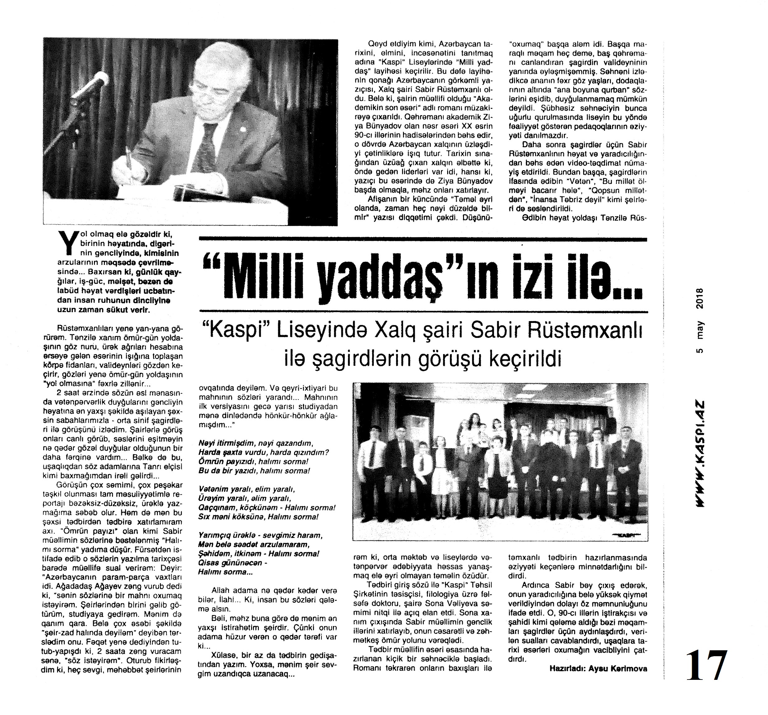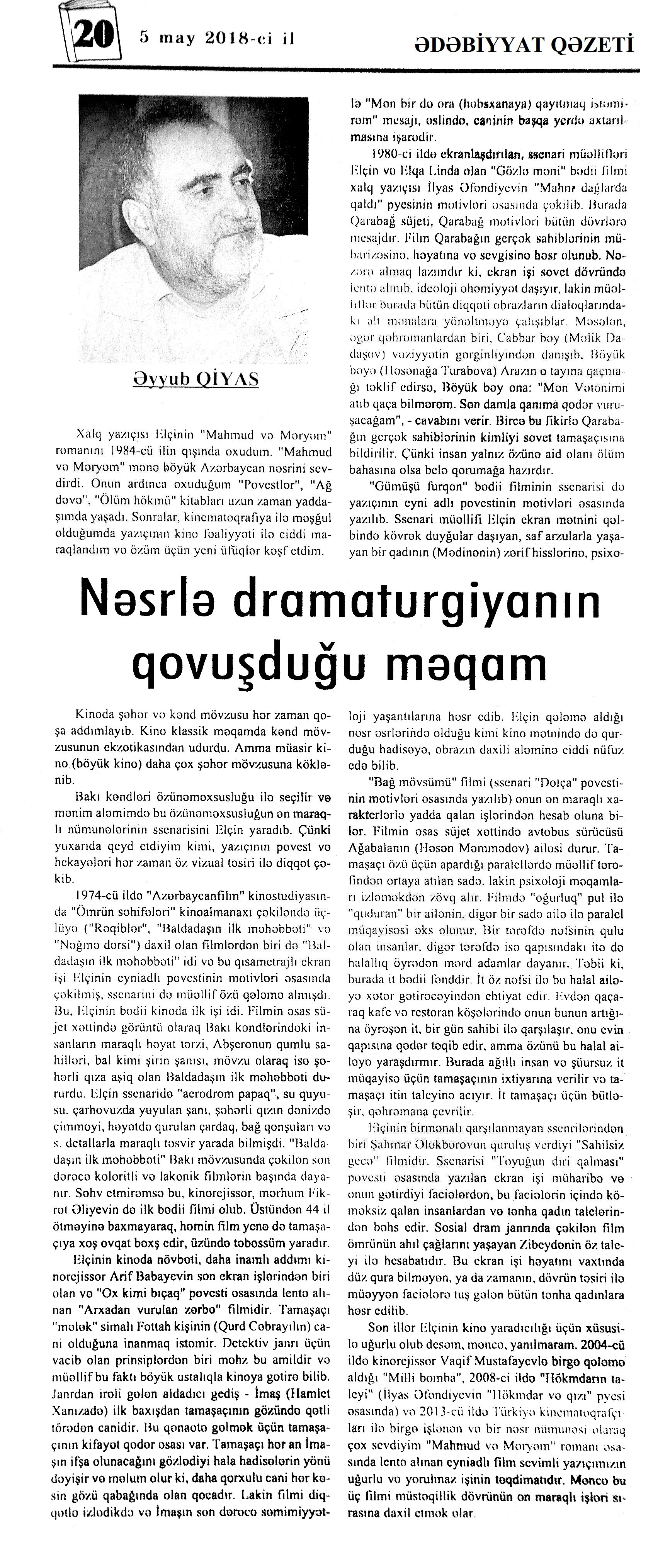 “Heyvanıstan” romanı haqqında] 1303. İsrailin tanınmış şairi Mətbuat Şurasında olub: [Pyotr Davıdov] //Səs.- 2018.-3 may.- S.9.; Mədəniyyət.-2018.- 4 may.- S.10. 1304. Karlyukeviç, A. Azərbaycan və Rıqor Borodulin – Ales Karlyukeviç: [müəlifin “Azərbaycan və Rıqor Borodulin” adlı məqaləsi haqqında] /tərc.etdi Kamran Nəzirli //Kaspi.-2018.- 12-14 may.- S.19. 1305. Kekelidze, G. Sənə məktublar: [gürcü ədəbiyyatı] /tərc etdi Neli Məmmədova //Ədəbiyyat qəzeti.-2018.- 19 may.- S.13. 1306. Qazaxıstanda Zəlimxan Yaqubun xatirəsi anılıb //Mədəniyyət.- 2018.- 9 may.- S.15. 1307. Məmmədzadə, S. Körpü: [Məmməd Orucun Rusiya ədəbiyyatından tərcümələri haqqında] //Ədəbiyyat qəzeti.-2018.- 19 may.- S.5. 1308. Müşfiq, Ş. “Kardeş kalemler”in may sayı: [Avrasiya Yazarlar Birliyinin mətbu orqanı böyük qazax şairi Ğalim Jaylıbaya həsr olunub] //525-ci qəzet.-2018.- 31 may.- S.6. 1309. Özer, A. Şeir bütün mədəniyyətlərin dinidir: Türkiyəli şair Adnan Özer: “İndiyə qədər intihar etməmişəmsə, bu, möcüzədir” /müsahibəni apardı Fərid Hüseyn //Kaspi.-2018.- 12-14 may.- S.13. 1310. Seyidli, P. Yaşamağı öyrədən roman: İqor Volnitskinin “Mənə ölməyi öyrət” romanındakı irfani şifrələr //Ədəbiyyat qəzeti. -2018.- 12 may.- S.26-27. 1311. Tahirli, A. Prof.dr. Okan Yeşilotun Azərbaycan sevgisi: [türk alimin araşdırmaları haqqında] //Ədəbiyyat qəzeti.- 2018.- 6 may.- S.15. 1312. Tanınmış qazax şairinin şeirləri Azərbaycan dilində: [Mağcan Cumabayın 125 illiyi ilə bağlı] //Mədəniyyət.- 2018.- 2 may.- S.15. 1313. Tanınmış Ukrayna ədibinin əsərləri ana dilimizdə: [Vladimir Danilenkonun “Qürub çağının işığında” kitabı] //Mədəniyyət.- 2018.- 9 may.- S.10. 1314. Türk dünyasının böyük yazıçısı Çingiz Aytmatov Bakıda yad olunub: [Türkdilli Ölkələrin Parlament Assambleyasının (TÜRKPA) Bakı ofisində] //Ədəbiyyat qəzeti.-2018.- 19 may.- S.3.; Mədəniyyət.- 2018.- 16 may. - S.2.