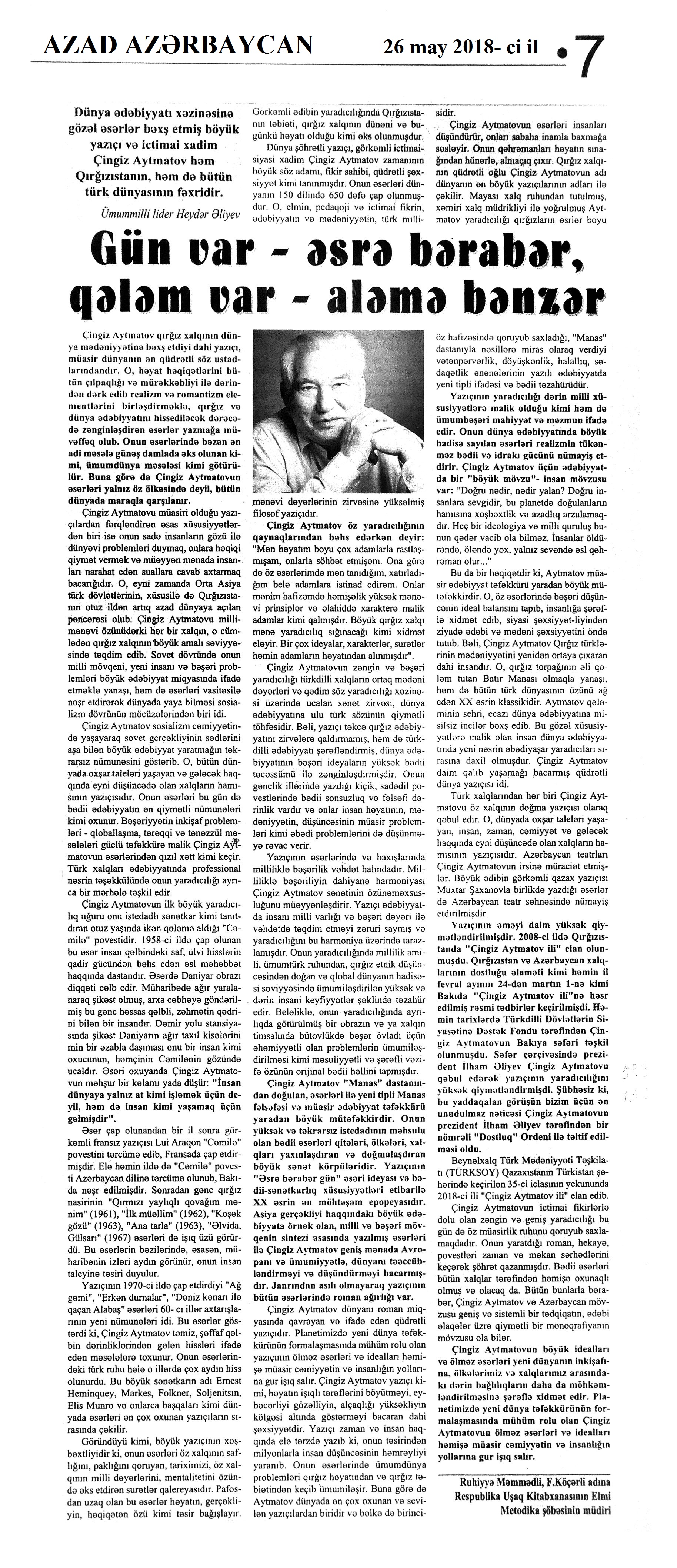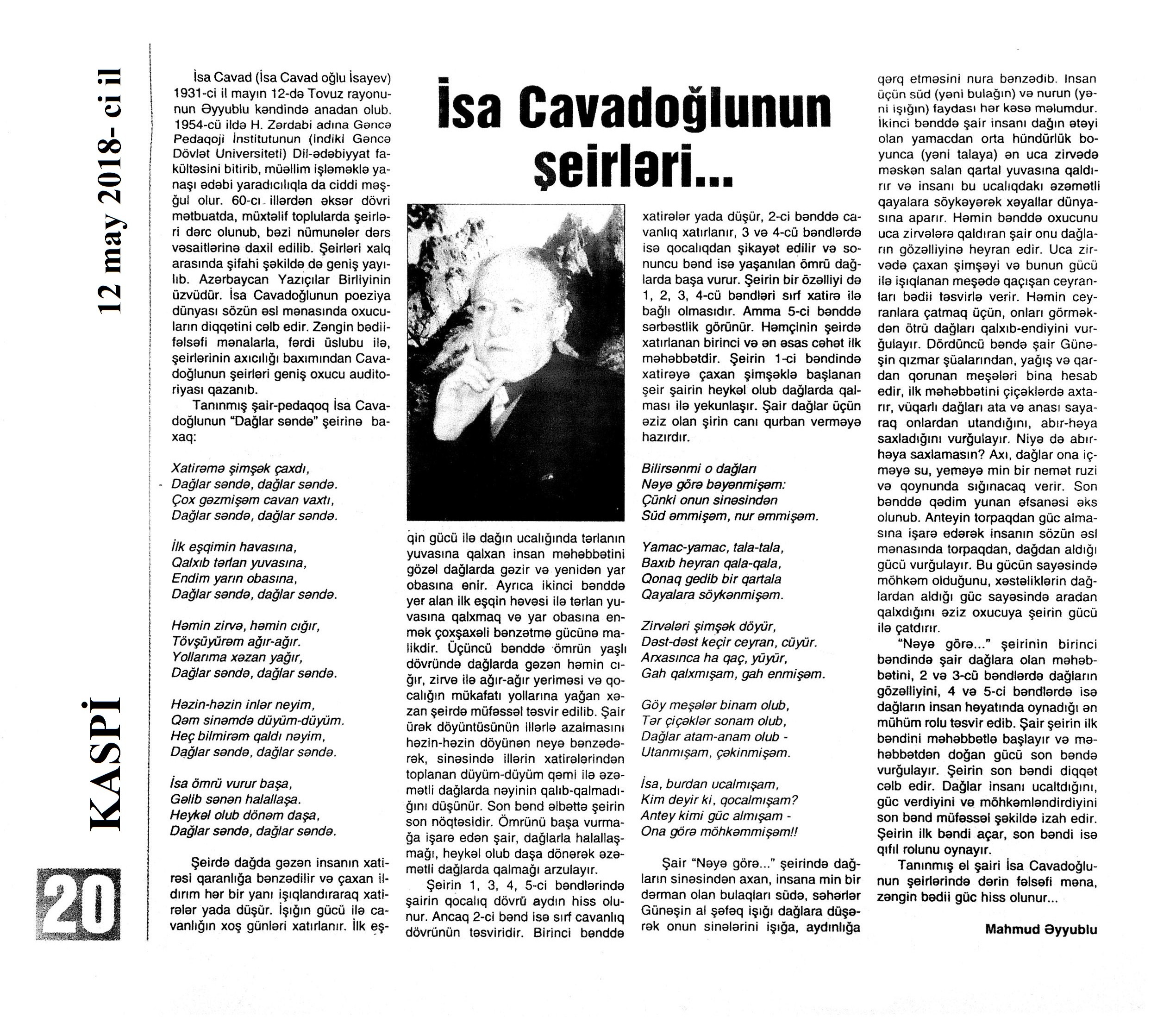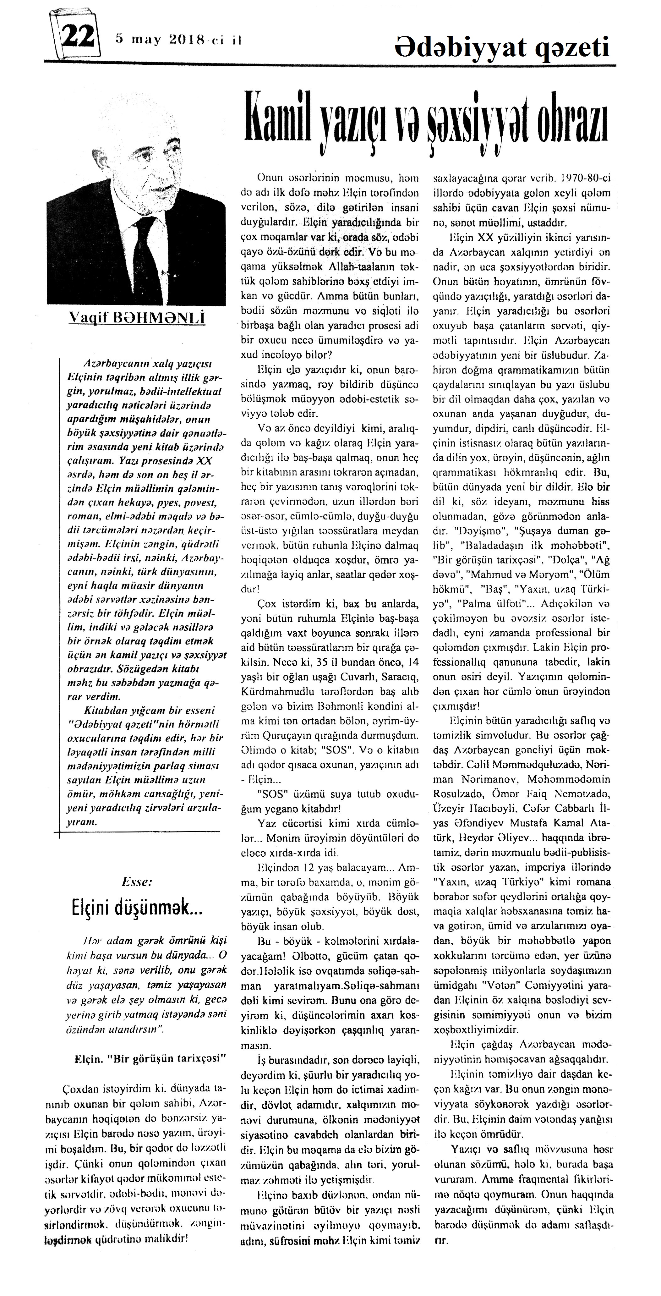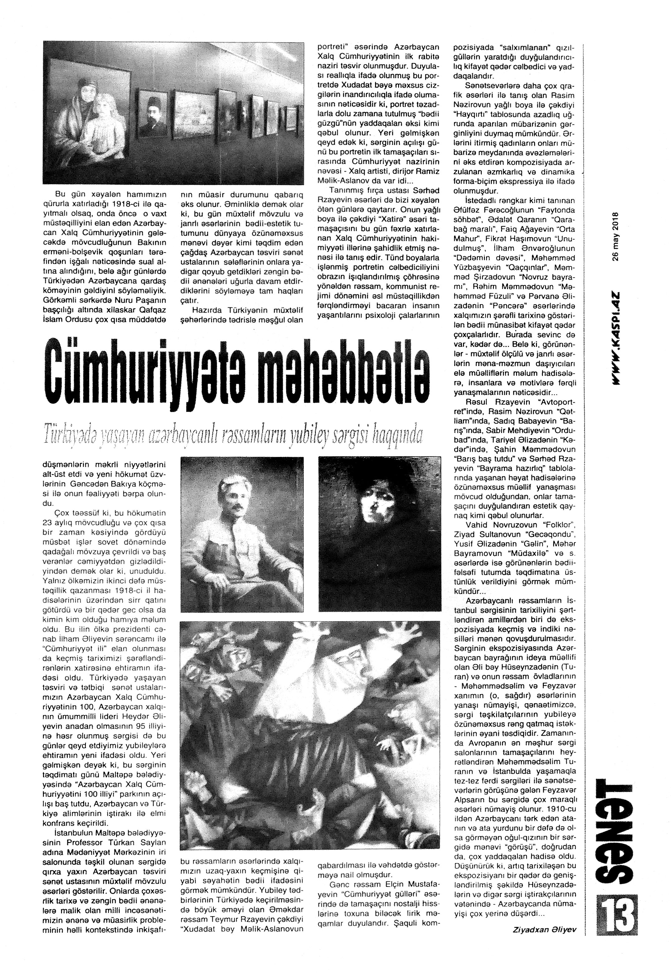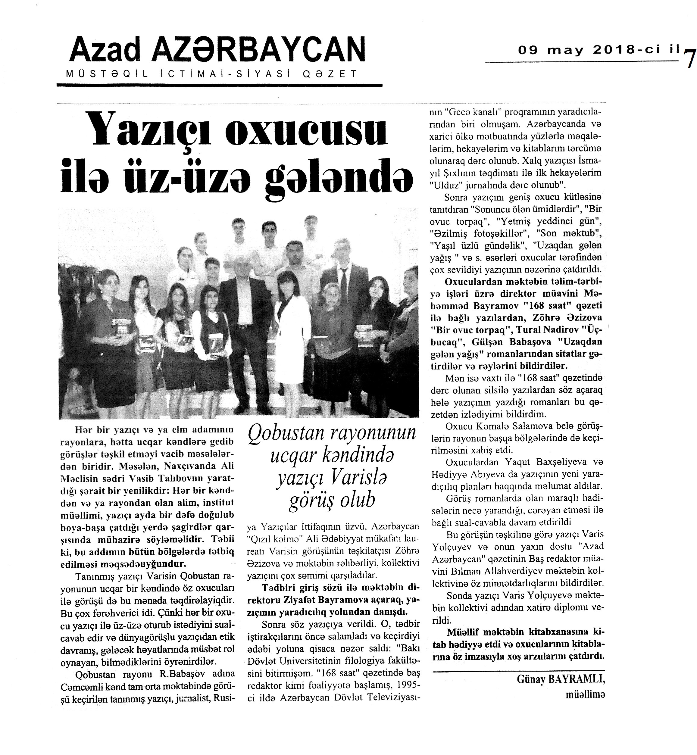 “Heyvanıstan” romanı haqqında] 1303. İsrailin tanınmış şairi Mətbuat Şurasında olub: [Pyotr Davıdov] //Səs.- 2018.-3 may.- S.9.; Mədəniyyət.-2018.- 4 may.- S.10. 1304. Karlyukeviç, A. Azərbaycan və Rıqor Borodulin – Ales Karlyukeviç: [müəlifin “Azərbaycan və Rıqor Borodulin” adlı məqaləsi haqqında] /tərc.etdi Kamran Nəzirli //Kaspi.-2018.- 12-14 may.- S.19. 1305. Kekelidze, G. Sənə məktublar: [gürcü ədəbiyyatı] /tərc etdi Neli Məmmədova //Ədəbiyyat qəzeti.-2018.- 19 may.- S.13. 1306. Qazaxıstanda Zəlimxan Yaqubun xatirəsi anılıb //Mədəniyyət.- 2018.- 9 may.- S.15. 1307. Məmmədzadə, S. Körpü: [Məmməd Orucun Rusiya ədəbiyyatından tərcümələri haqqında] //Ədəbiyyat qəzeti.-2018.- 19 may.- S.5. 1308. Müşfiq, Ş. “Kardeş kalemler”in may sayı: [Avrasiya Yazarlar Birliyinin mətbu orqanı böyük qazax şairi Ğalim Jaylıbaya həsr olunub] //525-ci qəzet.-2018.- 31 may.- S.6. 1309. Özer, A. Şeir bütün mədəniyyətlərin dinidir: Türkiyəli şair Adnan Özer: “İndiyə qədər intihar etməmişəmsə, bu, möcüzədir” /müsahibəni apardı Fərid Hüseyn //Kaspi.-2018.- 12-14 may.- S.13. 1310. Seyidli, P. Yaşamağı öyrədən roman: İqor Volnitskinin “Mənə ölməyi öyrət” romanındakı irfani şifrələr //Ədəbiyyat qəzeti. -2018.- 12 may.- S.26-27. 1311. Tahirli, A. Prof.dr. Okan Yeşilotun Azərbaycan sevgisi: [türk alimin araşdırmaları haqqında] //Ədəbiyyat qəzeti.- 2018.- 6 may.- S.15. 1312. Tanınmış qazax şairinin şeirləri Azərbaycan dilində: [Mağcan Cumabayın 125 illiyi ilə bağlı] //Mədəniyyət.- 2018.- 2 may.- S.15. 1313. Tanınmış Ukrayna ədibinin əsərləri ana dilimizdə: [Vladimir Danilenkonun “Qürub çağının işığında” kitabı] //Mədəniyyət.- 2018.- 9 may.- S.10. 1314. Türk dünyasının böyük yazıçısı Çingiz Aytmatov Bakıda yad olunub: [Türkdilli Ölkələrin Parlament Assambleyasının (TÜRKPA) Bakı ofisində] //Ədəbiyyat qəzeti.-2018.- 19 may.- S.3.; Mədəniyyət.- 2018.- 16 may. - S.2.