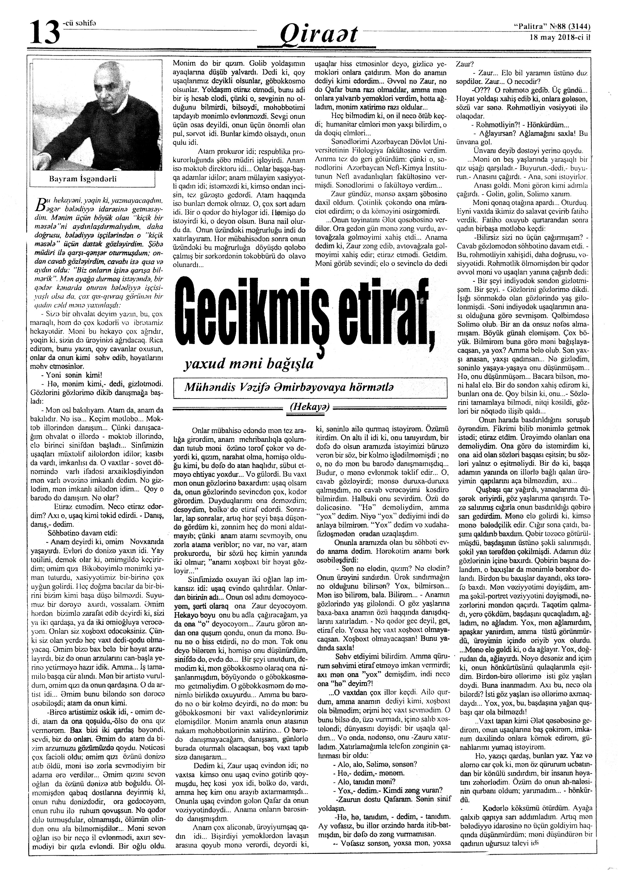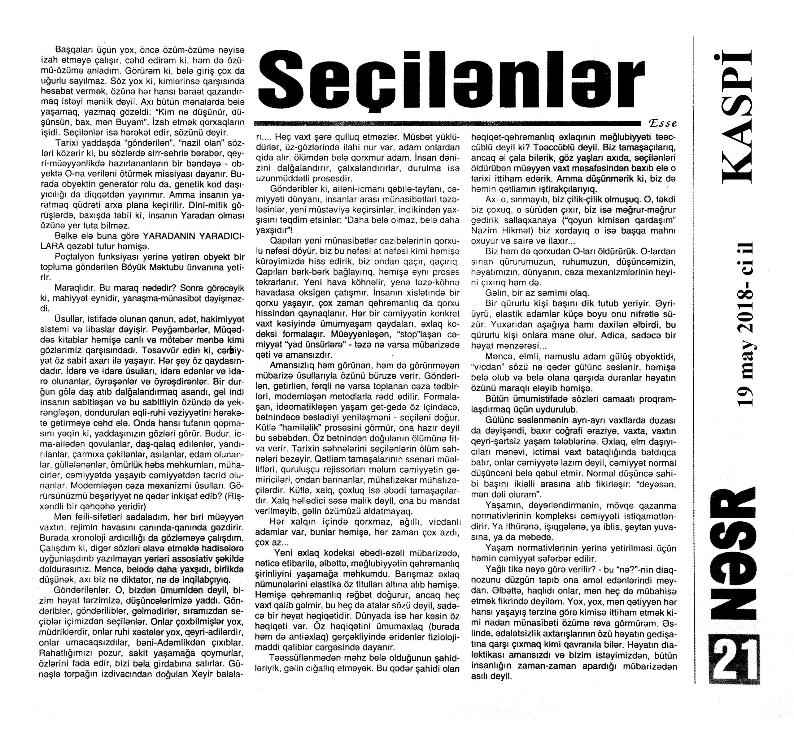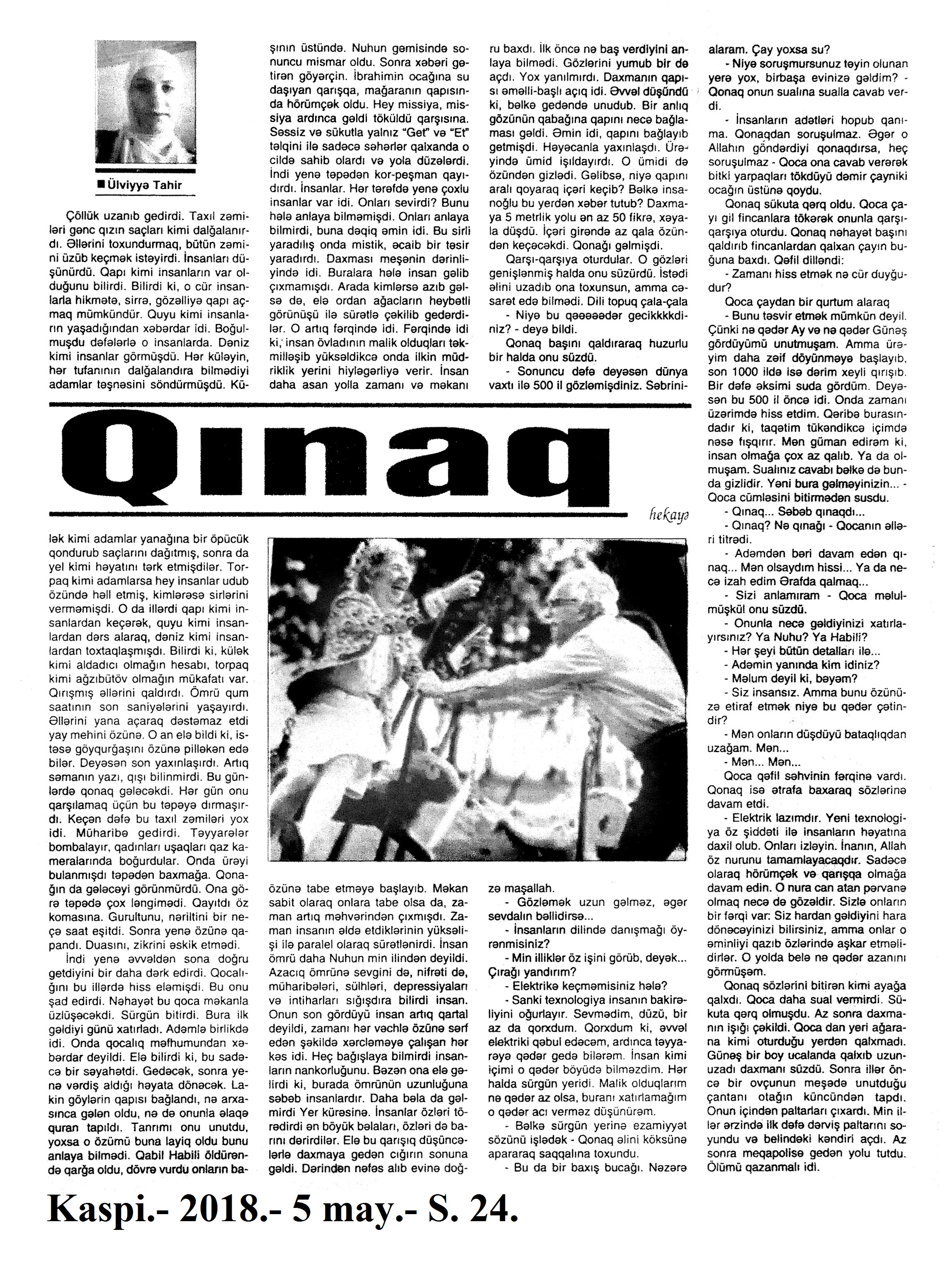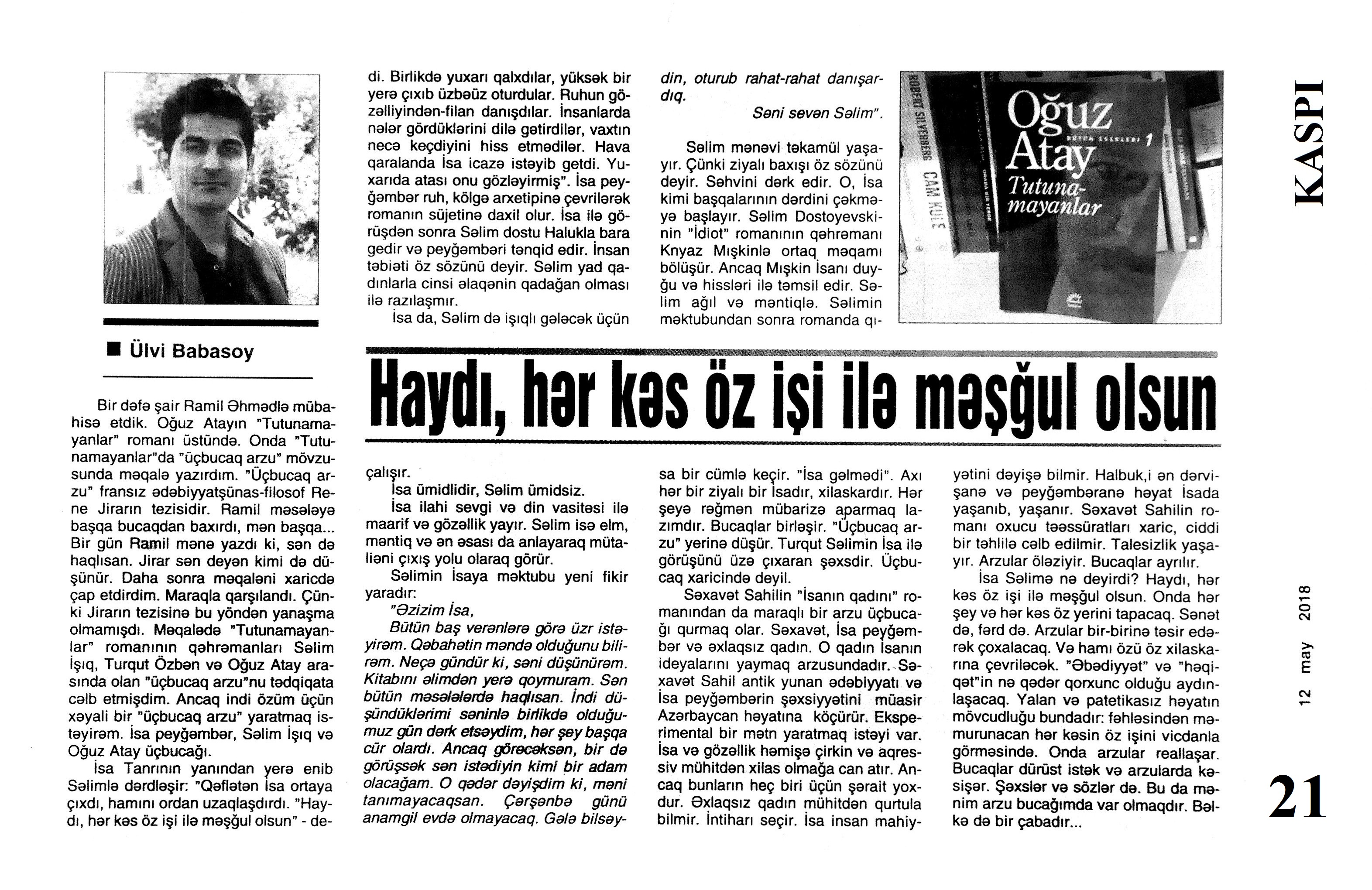 “Heyvanıstan” romanı haqqında] 1303. İsrailin tanınmış şairi Mətbuat Şurasında olub: [Pyotr Davıdov] //Səs.- 2018.-3 may.- S.9.; Mədəniyyət.-2018.- 4 may.- S.10. 1304. Karlyukeviç, A. Azərbaycan və Rıqor Borodulin – Ales Karlyukeviç: [müəlifin “Azərbaycan və Rıqor Borodulin” adlı məqaləsi haqqında] /tərc.etdi Kamran Nəzirli //Kaspi.-2018.- 12-14 may.- S.19. 1305. Kekelidze, G. Sənə məktublar: [gürcü ədəbiyyatı] /tərc etdi Neli Məmmədova //Ədəbiyyat qəzeti.-2018.- 19 may.- S.13. 1306. Qazaxıstanda Zəlimxan Yaqubun xatirəsi anılıb //Mədəniyyət.- 2018.- 9 may.- S.15. 1307. Məmmədzadə, S. Körpü: [Məmməd Orucun Rusiya ədəbiyyatından tərcümələri haqqında] //Ədəbiyyat qəzeti.-2018.- 19 may.- S.5. 1308. Müşfiq, Ş. “Kardeş kalemler”in may sayı: [Avrasiya Yazarlar Birliyinin mətbu orqanı böyük qazax şairi Ğalim Jaylıbaya həsr olunub] //525-ci qəzet.-2018.- 31 may.- S.6. 1309. Özer, A. Şeir bütün mədəniyyətlərin dinidir: Türkiyəli şair Adnan Özer: “İndiyə qədər intihar etməmişəmsə, bu, möcüzədir” /müsahibəni apardı Fərid Hüseyn //Kaspi.-2018.- 12-14 may.- S.13. 1310. Seyidli, P. Yaşamağı öyrədən roman: İqor Volnitskinin “Mənə ölməyi öyrət” romanındakı irfani şifrələr //Ədəbiyyat qəzeti. -2018.- 12 may.- S.26-27. 1311. Tahirli, A. Prof.dr. Okan Yeşilotun Azərbaycan sevgisi: [türk alimin araşdırmaları haqqında] //Ədəbiyyat qəzeti.- 2018.- 6 may.- S.15. 1312. Tanınmış qazax şairinin şeirləri Azərbaycan dilində: [Mağcan Cumabayın 125 illiyi ilə bağlı] //Mədəniyyət.- 2018.- 2 may.- S.15. 1313. Tanınmış Ukrayna ədibinin əsərləri ana dilimizdə: [Vladimir Danilenkonun “Qürub çağının işığında” kitabı] //Mədəniyyət.- 2018.- 9 may.- S.10. 1314. Türk dünyasının böyük yazıçısı Çingiz Aytmatov Bakıda yad olunub: [Türkdilli Ölkələrin Parlament Assambleyasının (TÜRKPA) Bakı ofisində] //Ədəbiyyat qəzeti.-2018.- 19 may.- S.3.; Mədəniyyət.- 2018.- 16 may. - S.2.