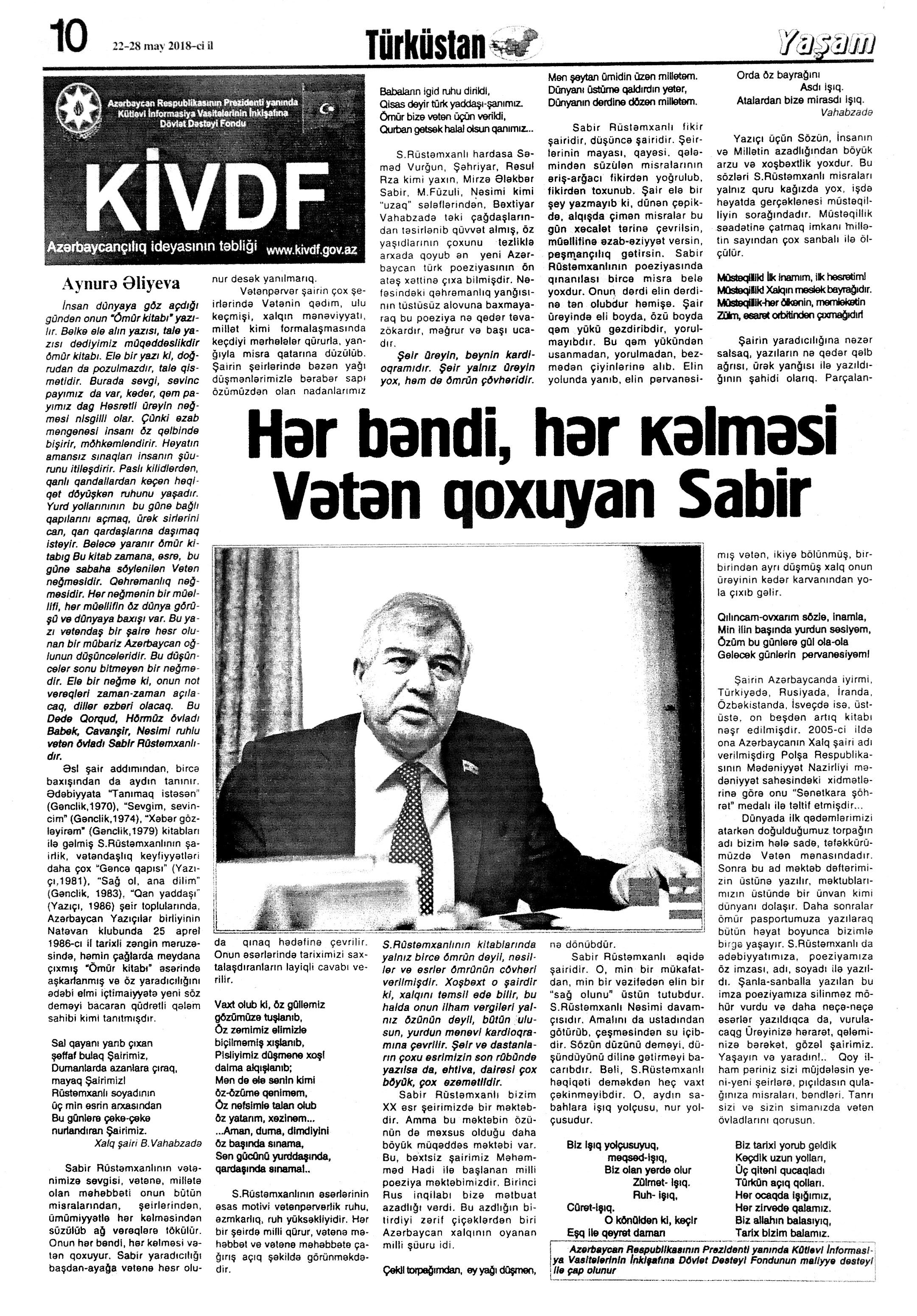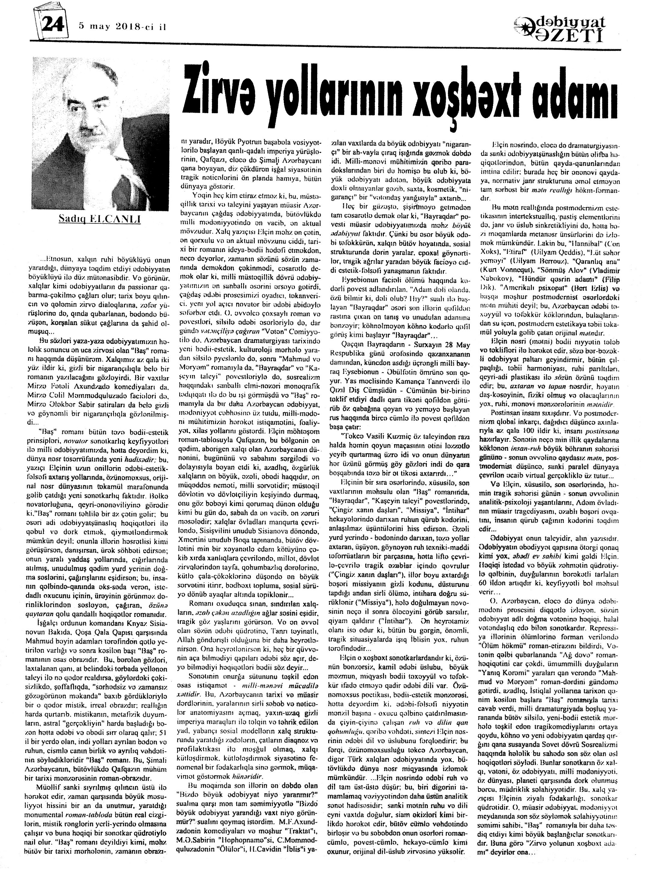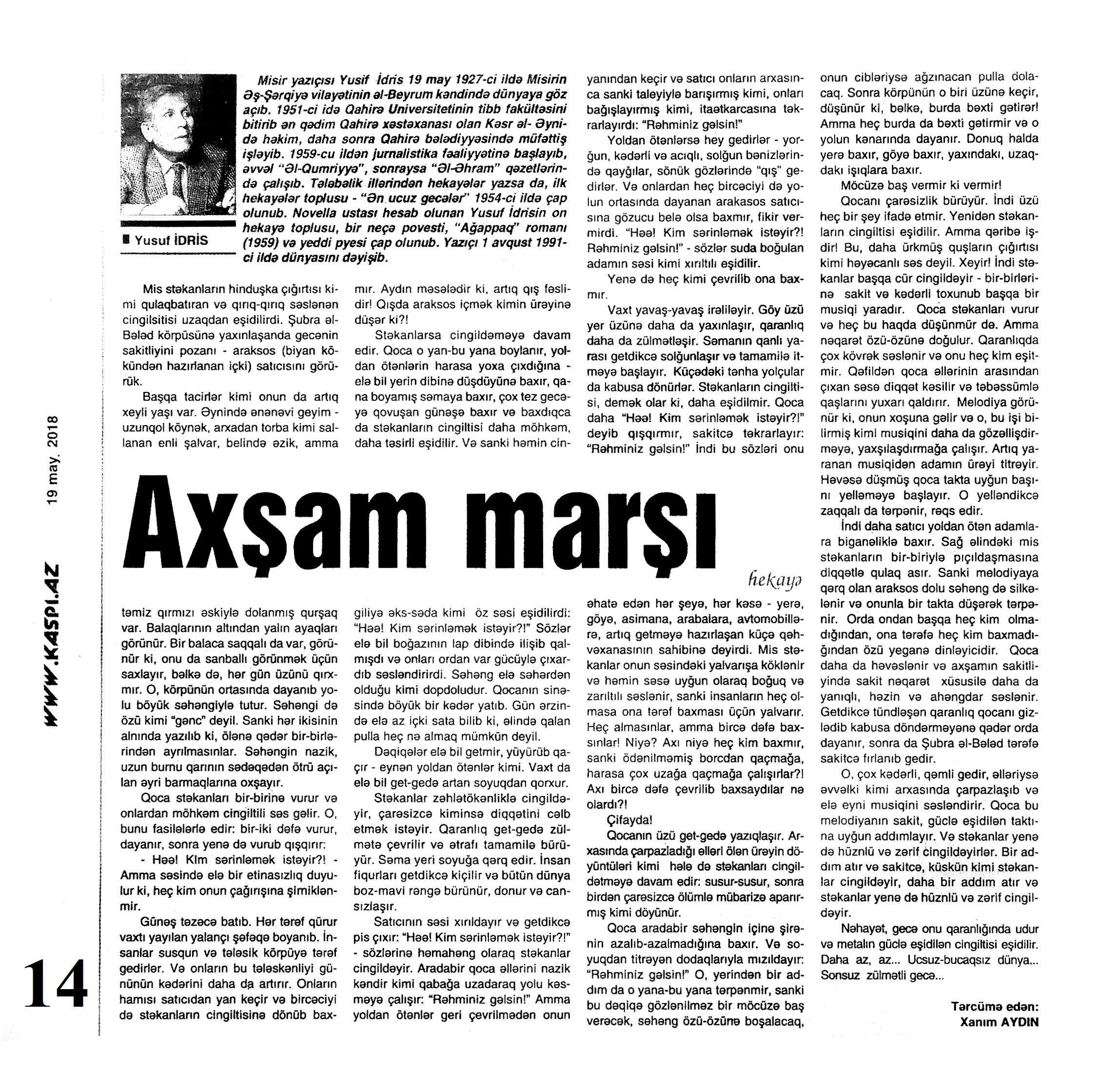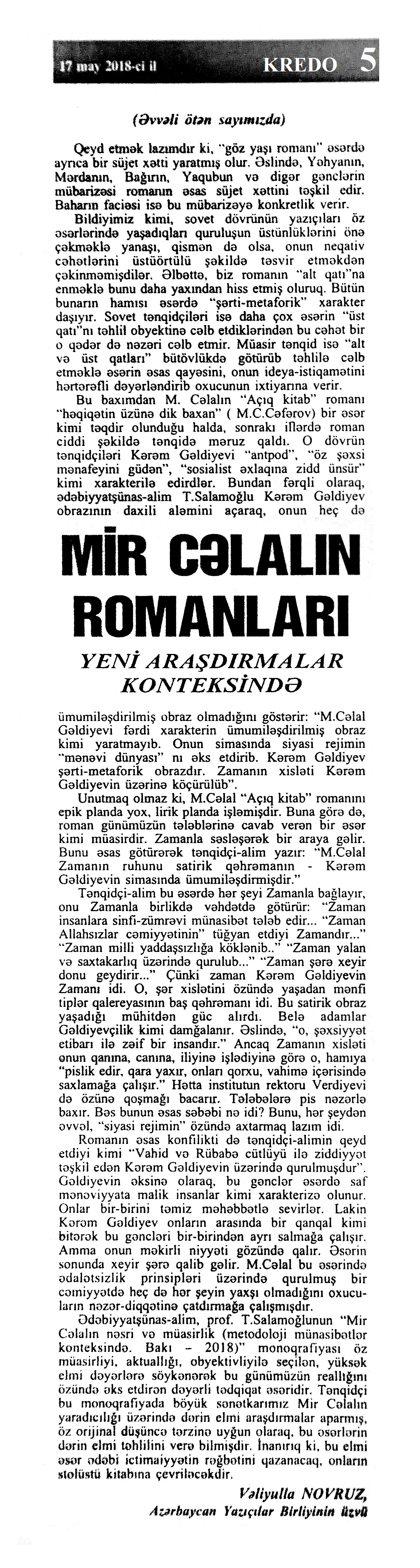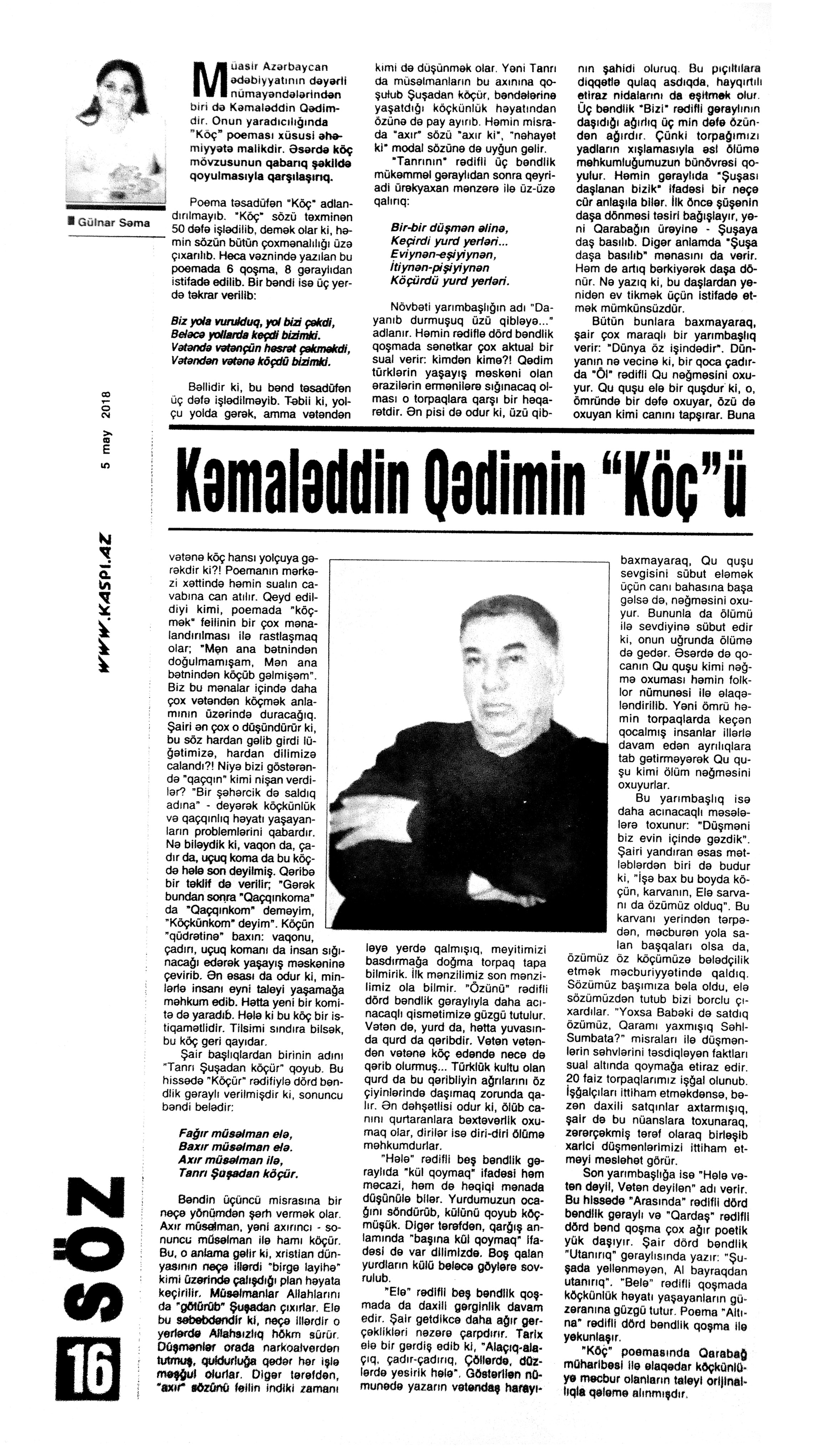 “Heyvanıstan” romanı haqqında] 1303. İsrailin tanınmış şairi Mətbuat Şurasında olub: [Pyotr Davıdov] //Səs.- 2018.-3 may.- S.9.; Mədəniyyət.-2018.- 4 may.- S.10. 1304. Karlyukeviç, A. Azərbaycan və Rıqor Borodulin – Ales Karlyukeviç: [müəlifin “Azərbaycan və Rıqor Borodulin” adlı məqaləsi haqqında] /tərc.etdi Kamran Nəzirli //Kaspi.-2018.- 12-14 may.- S.19. 1305. Kekelidze, G. Sənə məktublar: [gürcü ədəbiyyatı] /tərc etdi Neli Məmmədova //Ədəbiyyat qəzeti.-2018.- 19 may.- S.13. 1306. Qazaxıstanda Zəlimxan Yaqubun xatirəsi anılıb //Mədəniyyət.- 2018.- 9 may.- S.15. 1307. Məmmədzadə, S. Körpü: [Məmməd Orucun Rusiya ədəbiyyatından tərcümələri haqqında] //Ədəbiyyat qəzeti.-2018.- 19 may.- S.5. 1308. Müşfiq, Ş. “Kardeş kalemler”in may sayı: [Avrasiya Yazarlar Birliyinin mətbu orqanı böyük qazax şairi Ğalim Jaylıbaya həsr olunub] //525-ci qəzet.-2018.- 31 may.- S.6. 1309. Özer, A. Şeir bütün mədəniyyətlərin dinidir: Türkiyəli şair Adnan Özer: “İndiyə qədər intihar etməmişəmsə, bu, möcüzədir” /müsahibəni apardı Fərid Hüseyn //Kaspi.-2018.- 12-14 may.- S.13. 1310. Seyidli, P. Yaşamağı öyrədən roman: İqor Volnitskinin “Mənə ölməyi öyrət” romanındakı irfani şifrələr //Ədəbiyyat qəzeti. -2018.- 12 may.- S.26-27. 1311. Tahirli, A. Prof.dr. Okan Yeşilotun Azərbaycan sevgisi: [türk alimin araşdırmaları haqqında] //Ədəbiyyat qəzeti.- 2018.- 6 may.- S.15. 1312. Tanınmış qazax şairinin şeirləri Azərbaycan dilində: [Mağcan Cumabayın 125 illiyi ilə bağlı] //Mədəniyyət.- 2018.- 2 may.- S.15. 1313. Tanınmış Ukrayna ədibinin əsərləri ana dilimizdə: [Vladimir Danilenkonun “Qürub çağının işığında” kitabı] //Mədəniyyət.- 2018.- 9 may.- S.10. 1314. Türk dünyasının böyük yazıçısı Çingiz Aytmatov Bakıda yad olunub: [Türkdilli Ölkələrin Parlament Assambleyasının (TÜRKPA) Bakı ofisində] //Ədəbiyyat qəzeti.-2018.- 19 may.- S.3.; Mədəniyyət.- 2018.- 16 may. - S.2.
